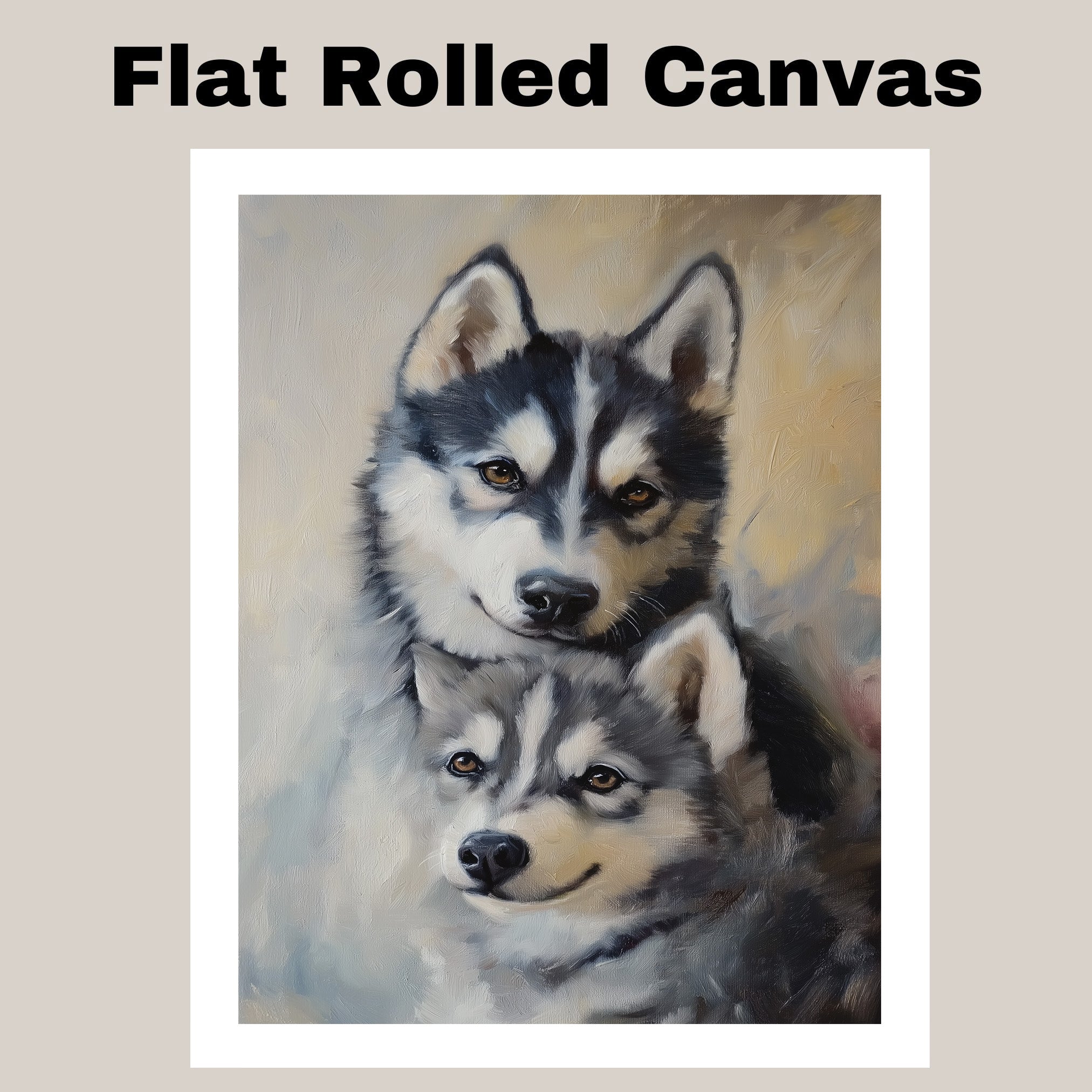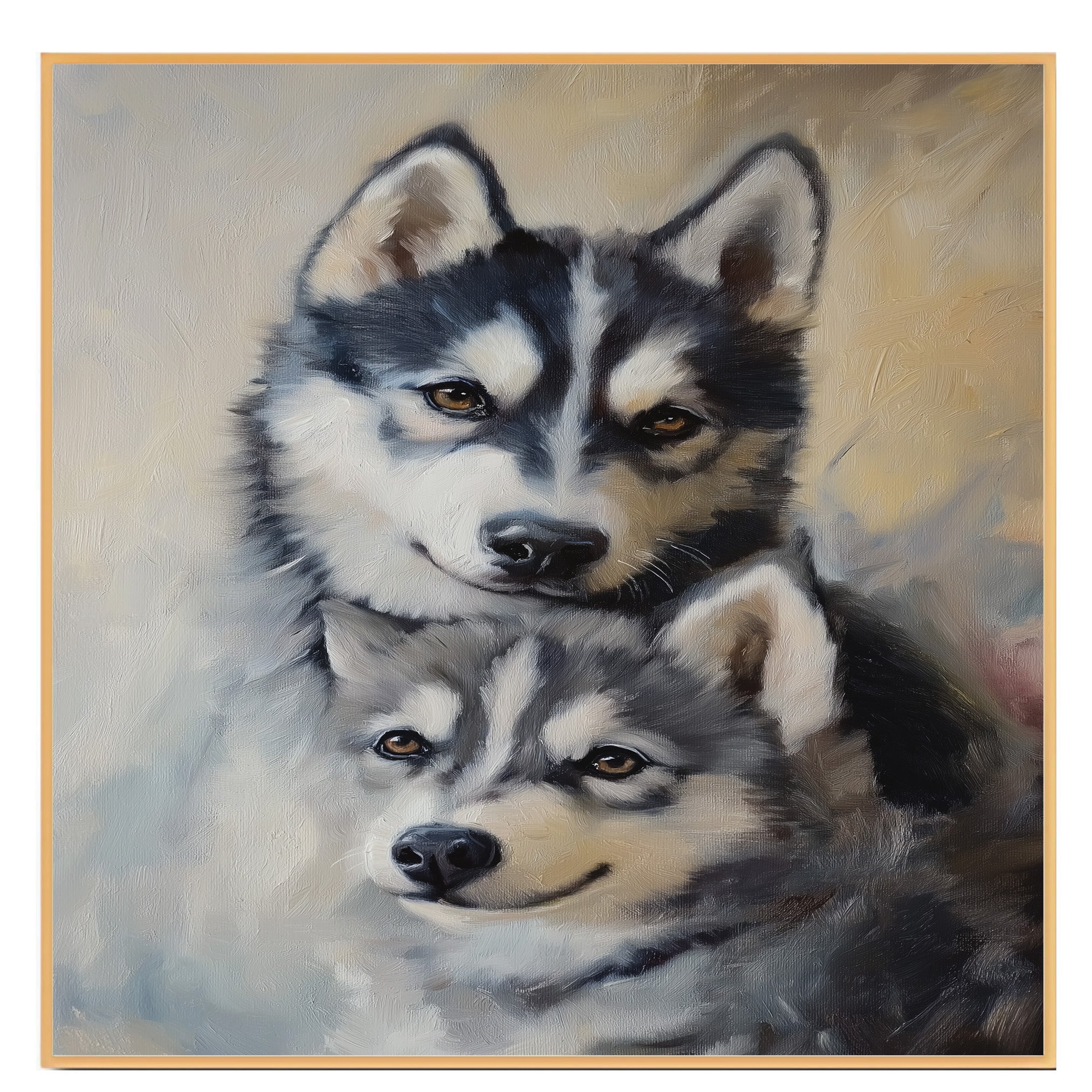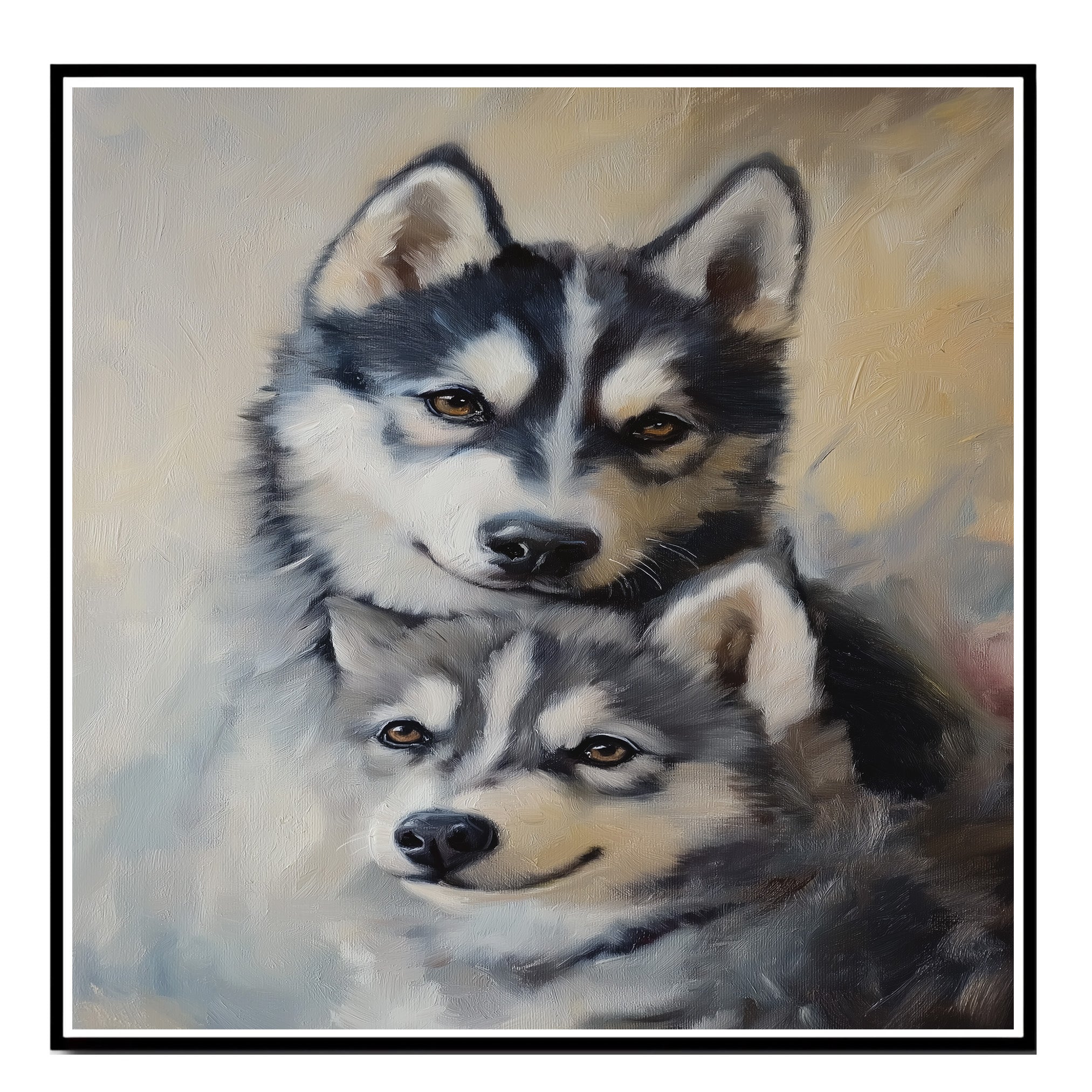 Capture the quiet loyalty and beauty of the Siberian Husky with this elegant painting featuring a loving dog couple. The soft color palette and detailed brushwork bring out the affectionate bond between these majestic animals, making this artwork perfect for rustic homes, pet lovers, and heartfelt gift ideas.
