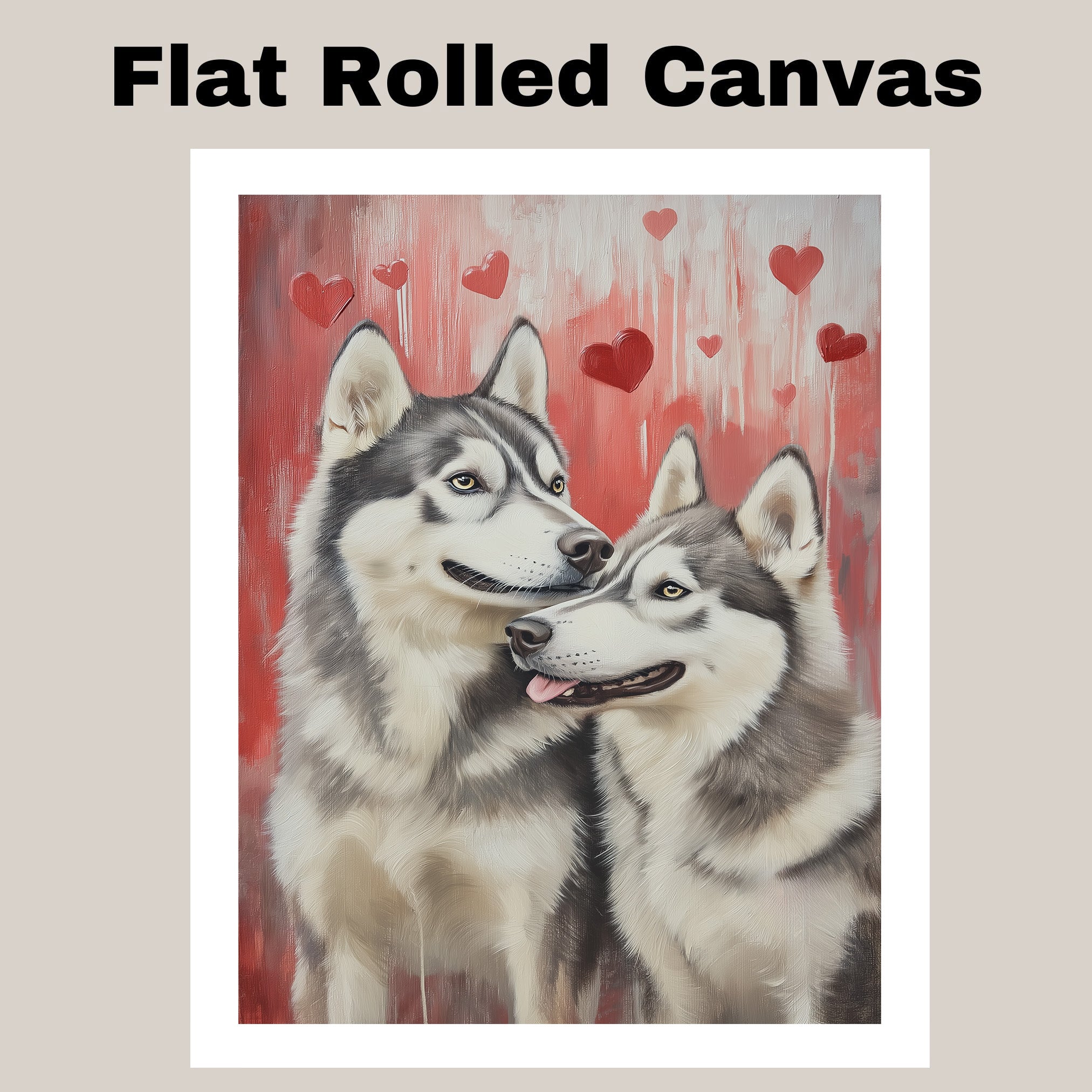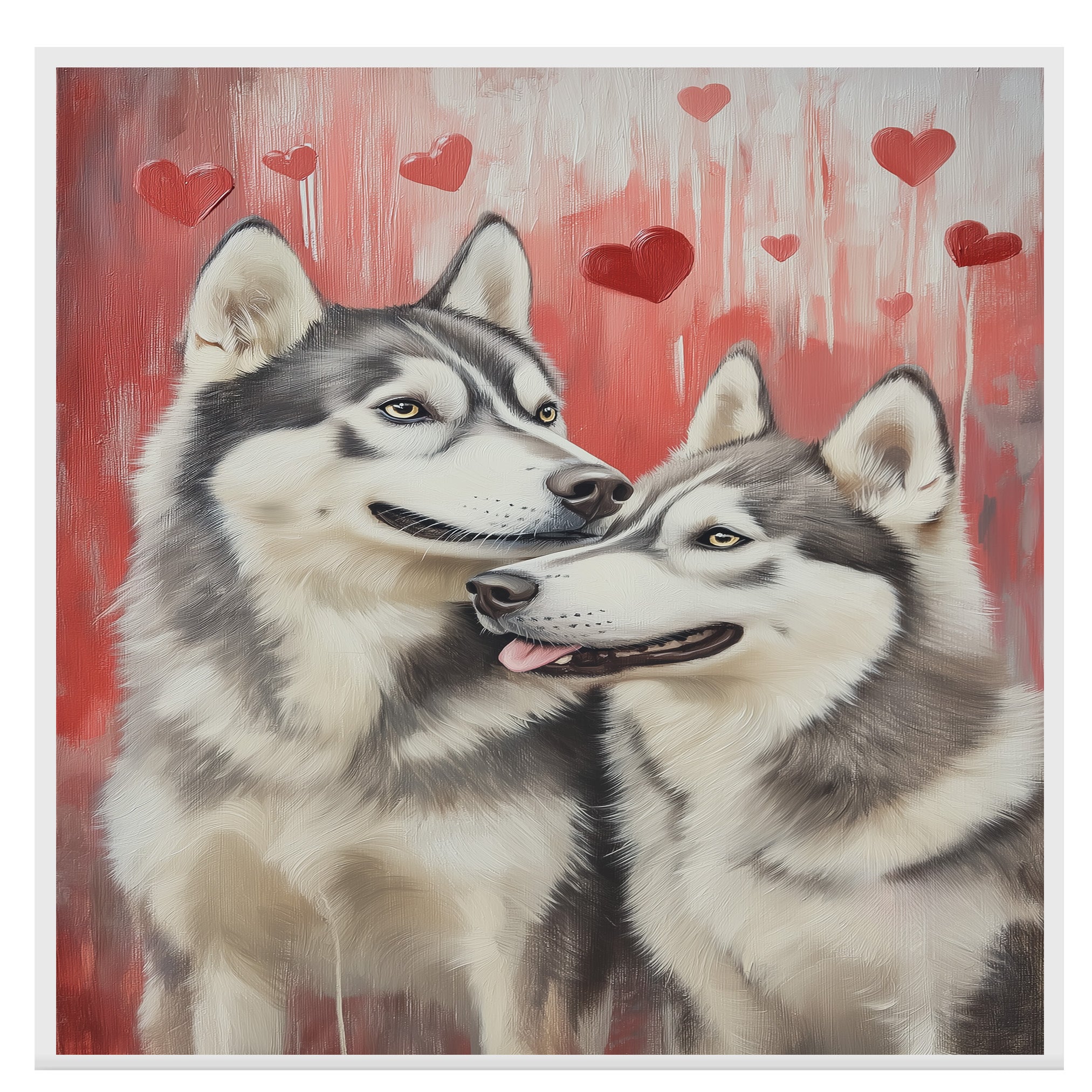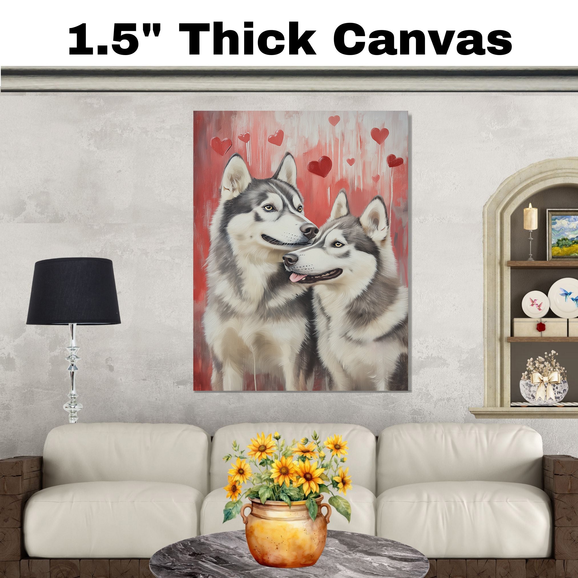 Siberian Husky Dog Couple with Hearts Romantic Pet Artwork for Dog Lovers and Cozy Rustic Home Decor on Ready to Hang 1.5" Thick Canvas Wrap, Floating Framed Canvas, Flat Rolled Canvas