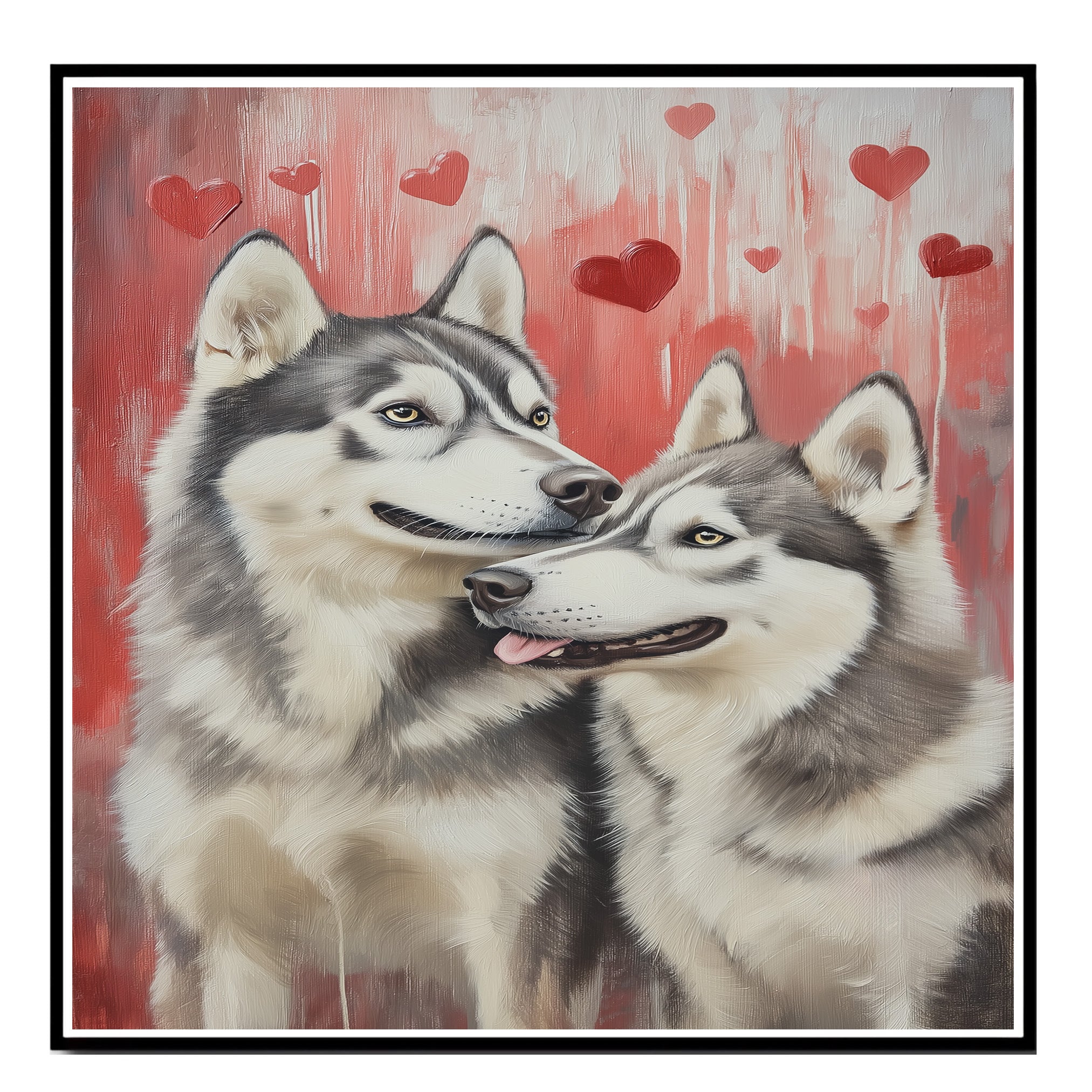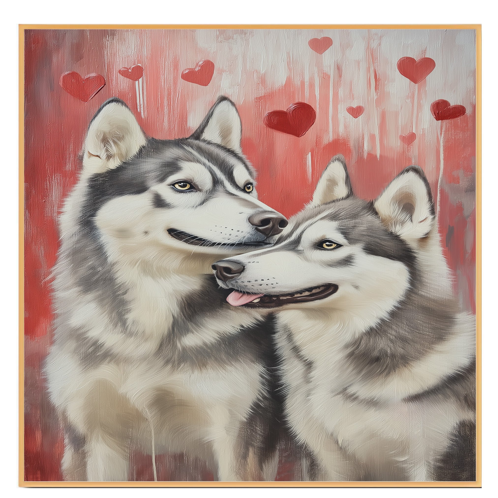 Celebrate loyalty, companionship, and affection with this heartwarming painting featuring a Siberian Husky couple against a playful background filled with red hearts. With detailed brushwork, soft textures, and vibrant tones, this artwork brings warmth and joy to any rustic home, country setting, or dog lover’s space.