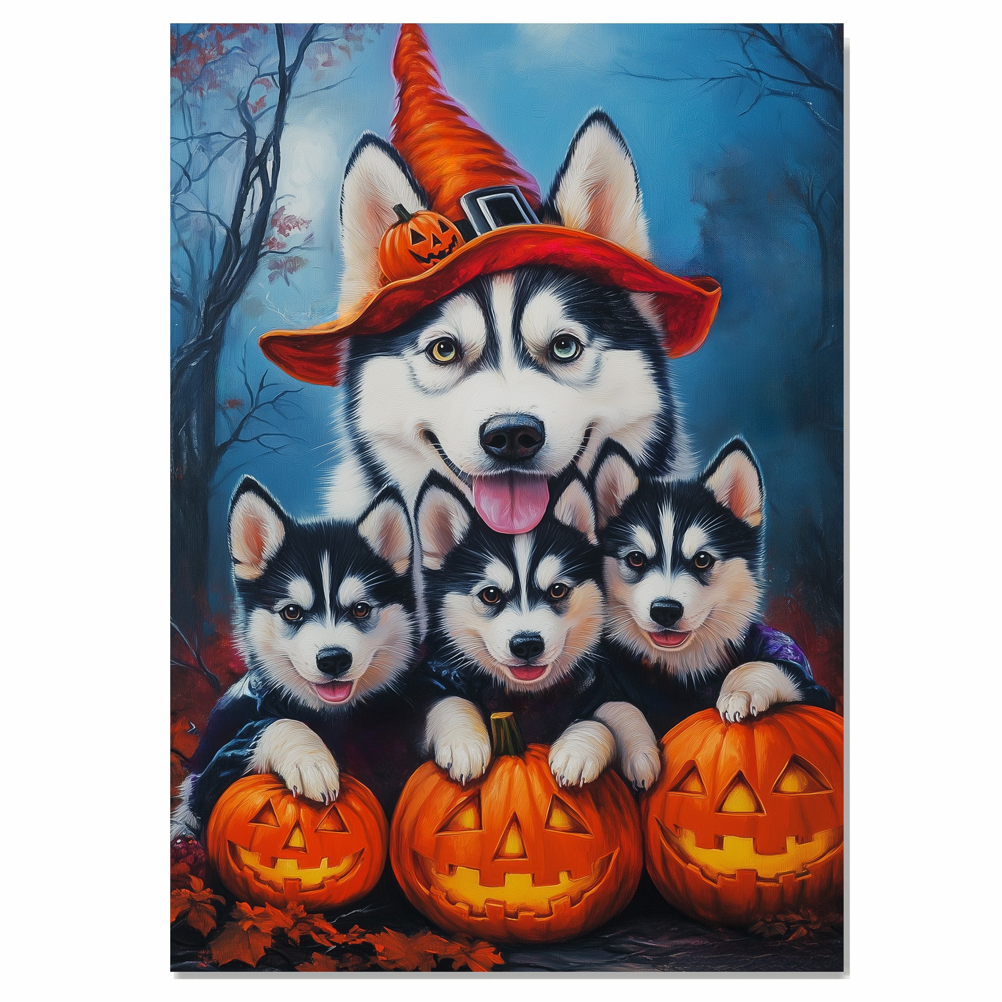 Siberian Husky Dog Halloween Wall Art Rustic Fall Canvas with Pumpkins Witch Hat and Autumn Leaves Farmhouse Pet Decor for Home on Ready to Hang 1.5" Thick Canvas Wrap, Floating Framed Canvas, Flat Rolled Canvas