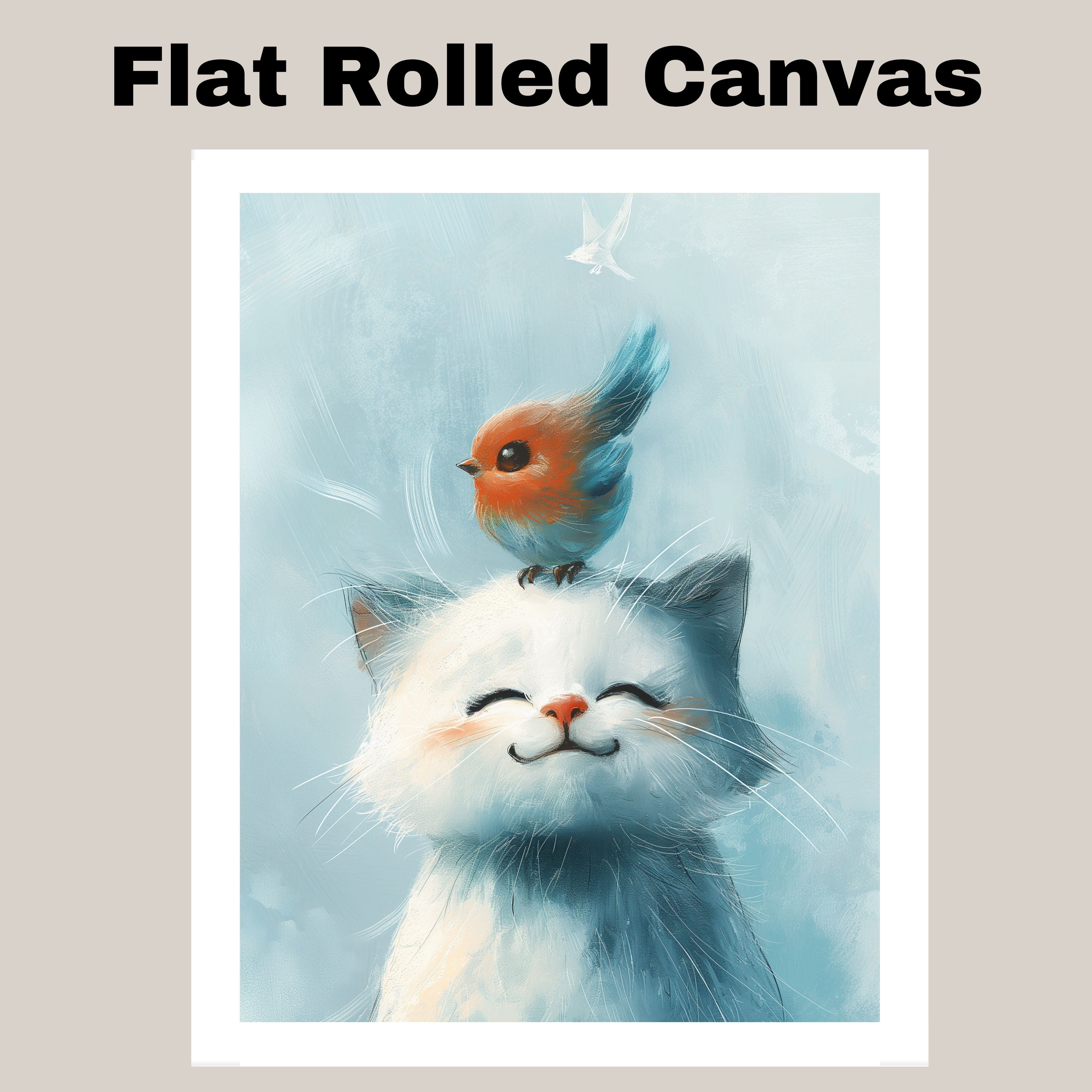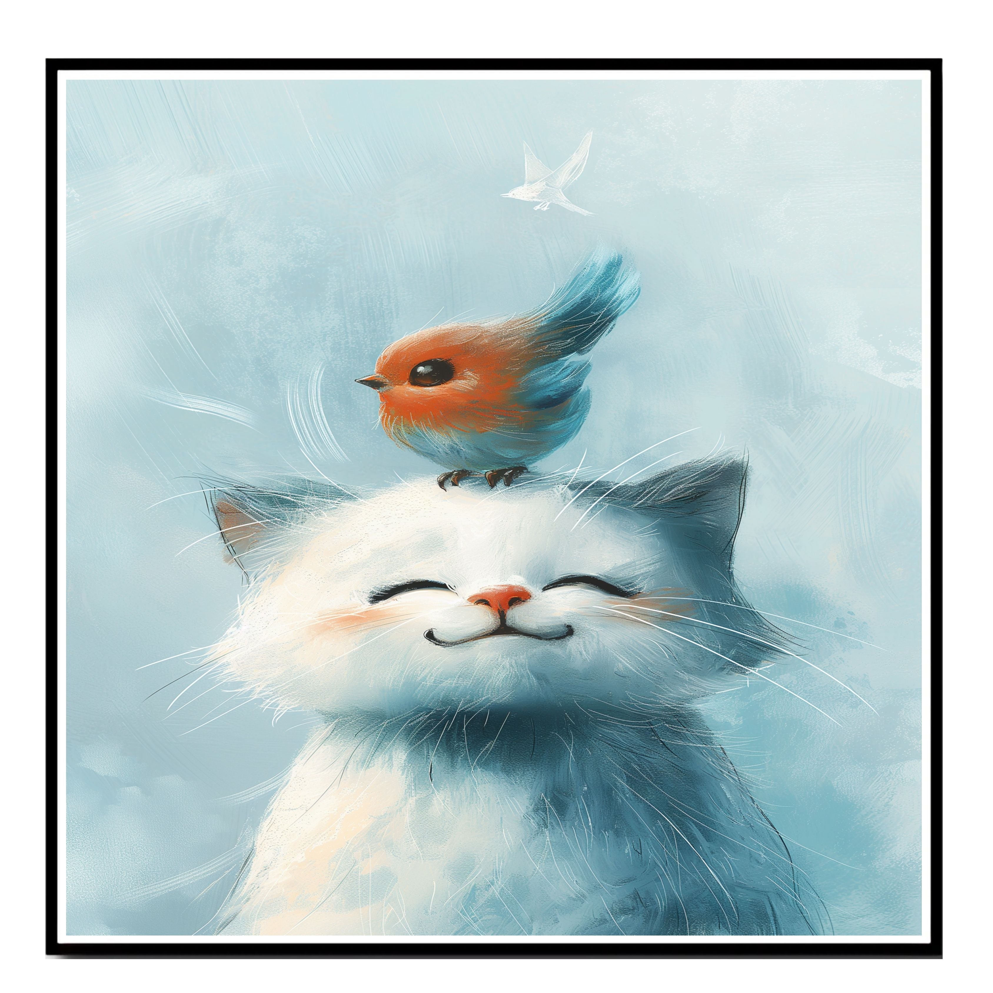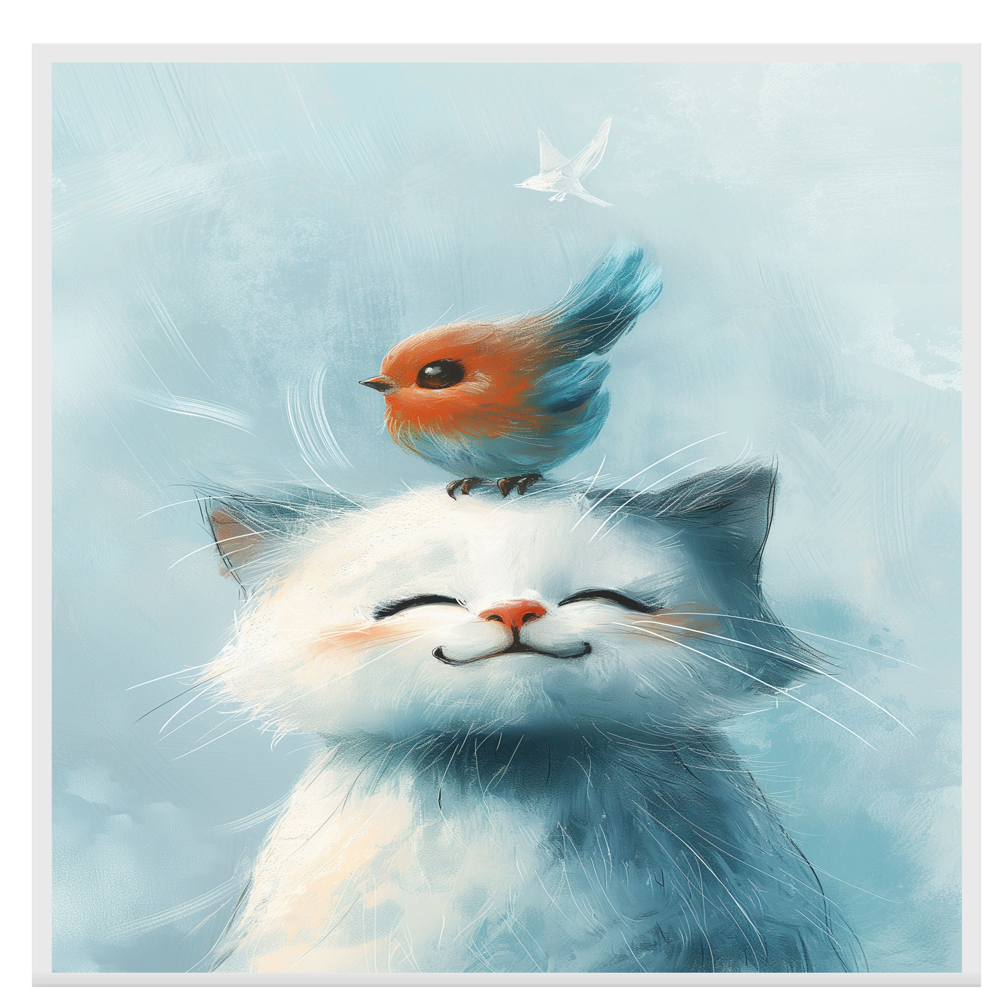 This cheerful artwork features a joyful white cat with a heartwarming smile as a vibrant red-orange bird perches gently on its head. The soft pastel background and charming expressions radiate warmth, making this piece a lovely addition to nurseries, children's rooms, or pet-themed decor. A whimsical and uplifting gift idea for cat lovers, bird enthusiasts, or anyone who enjoys lighthearted animal illustrations.