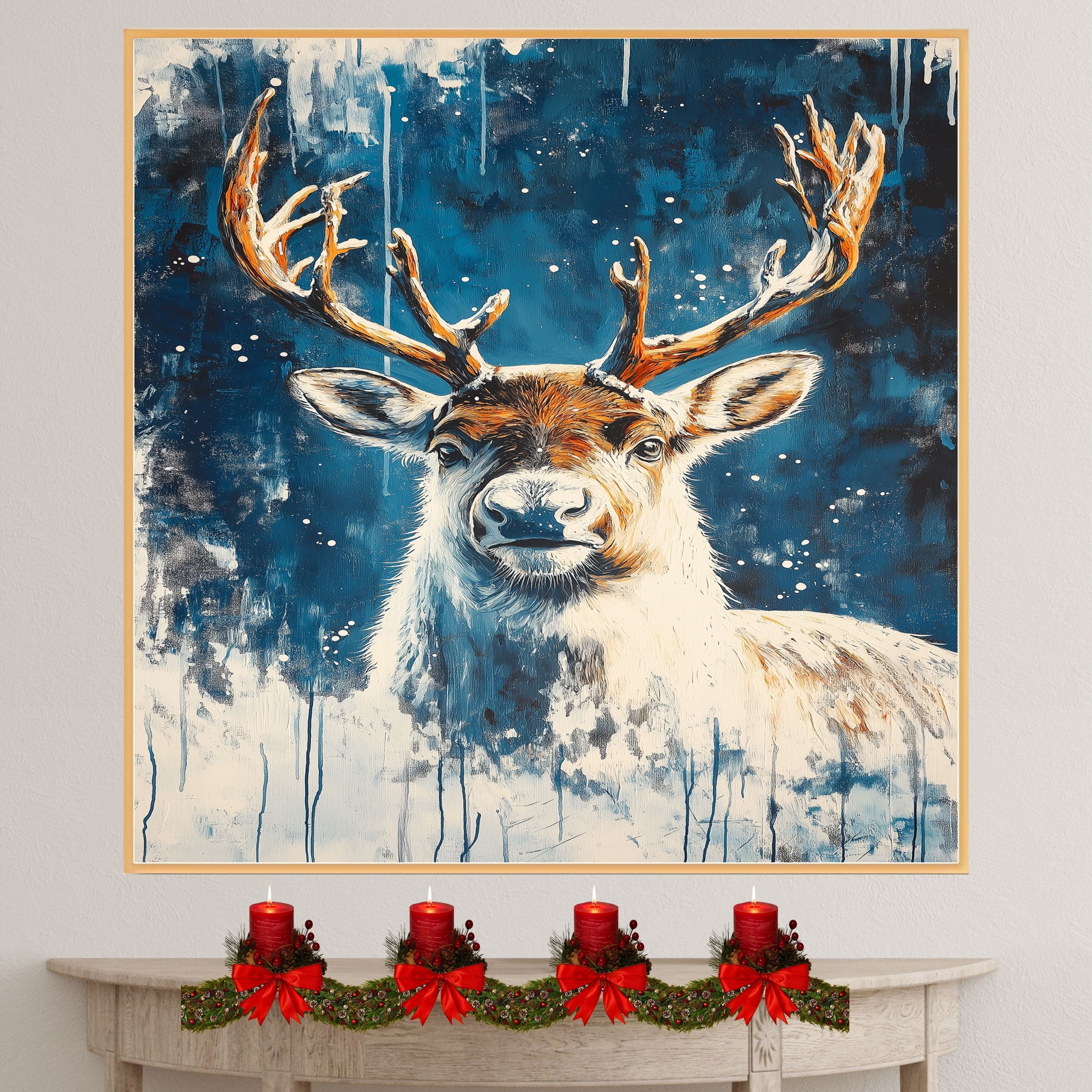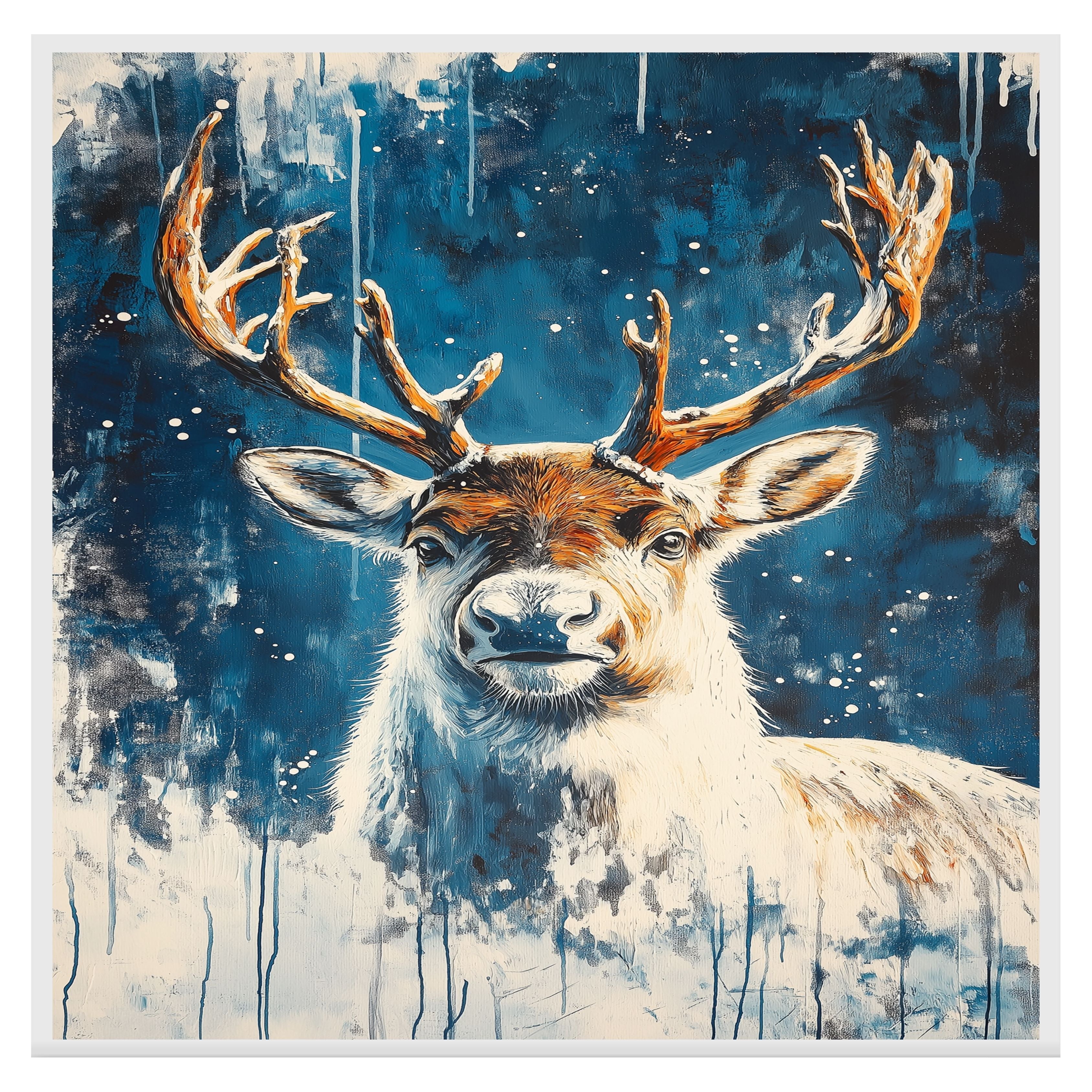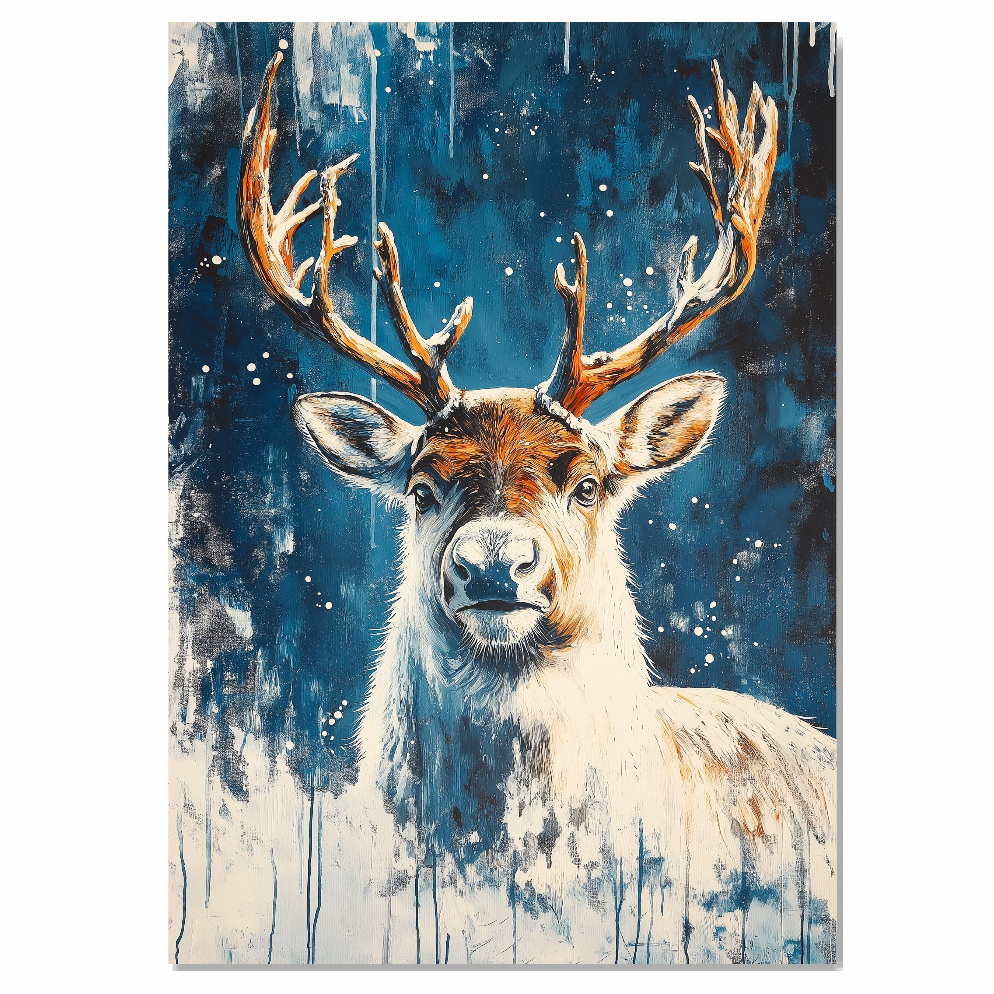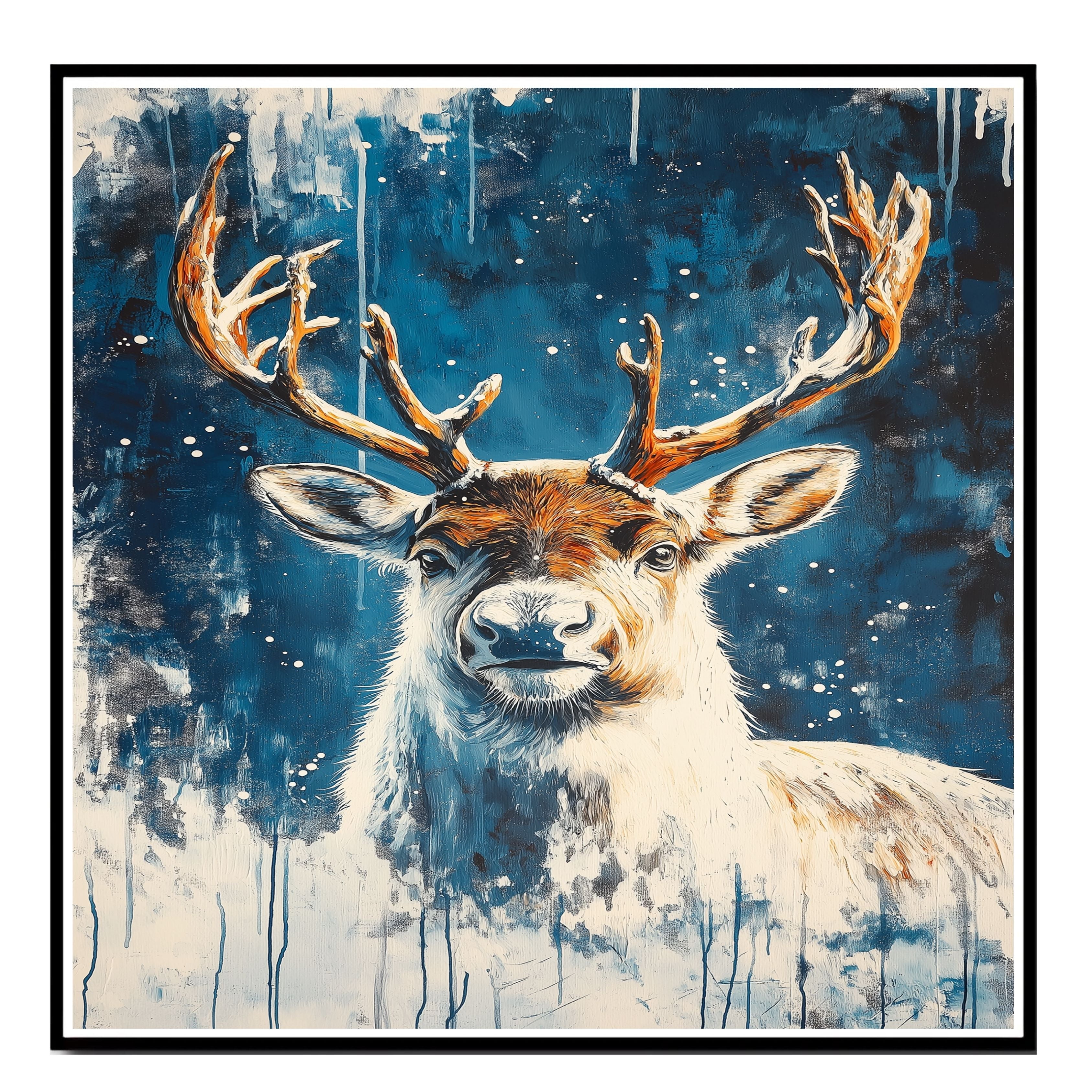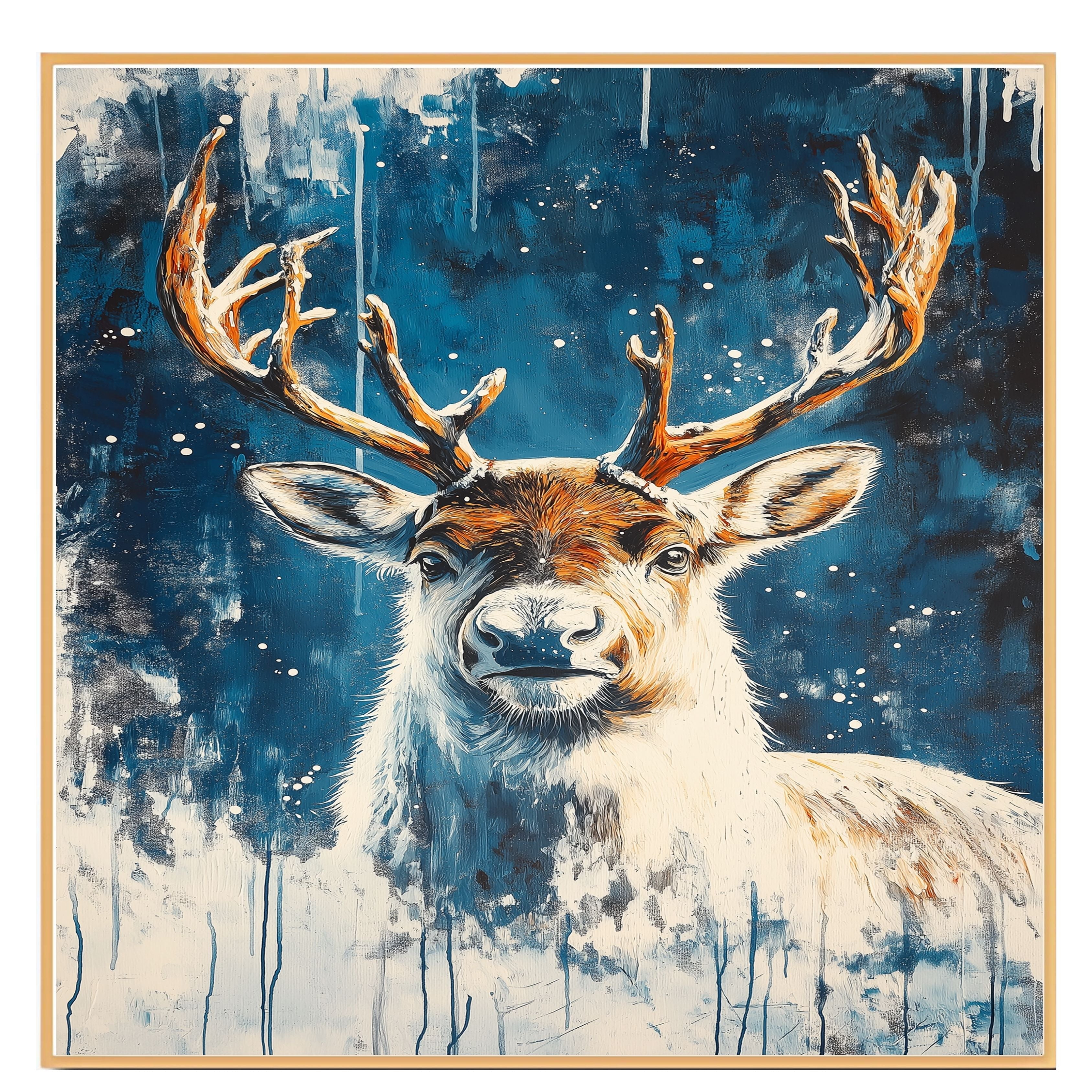 Capture the serene beauty of winter with this Snowy Reindeer Portrait. Featuring a majestic reindeer against a dreamy blue snowy background in an abstract style, this artwork brings the peaceful spirit of the holidays into your home. Ideal for seasonal decor, holiday displays, or rustic winter interiors, it also makes a perfect gift for art lovers and nature enthusiasts. A striking addition to any home or office space, adding elegance and warmth.