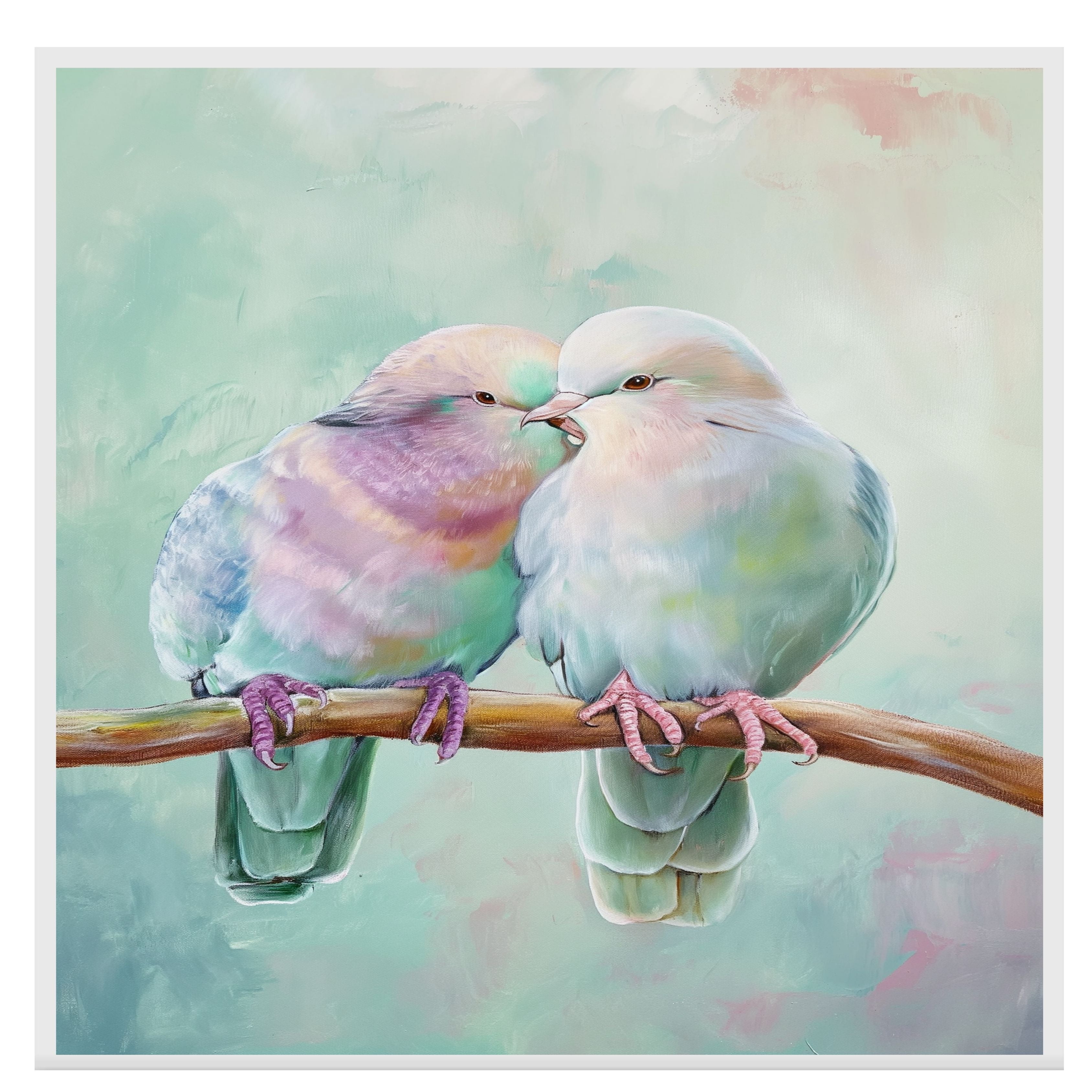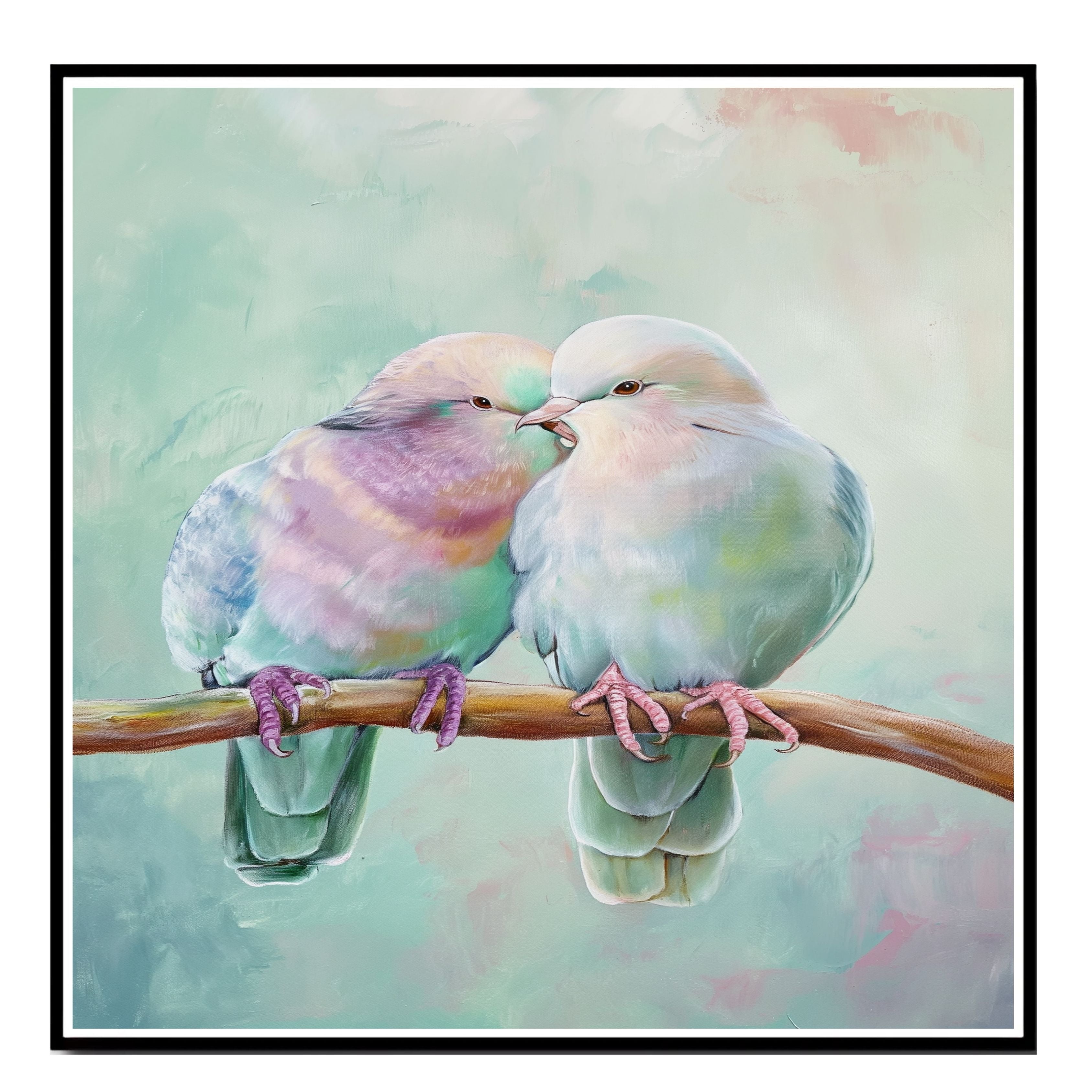 Celebrate love and tranquility with this beautifully painted pair of pastel doves. Set against a soft mint background, the artwork radiates peace, tenderness, and connection. The delicate brushwork and serene tones make it a thoughtful piece for weddings, anniversaries, nurseries, or meditation spaces. Let this symbolic artwork bring warmth and affection to your environment.