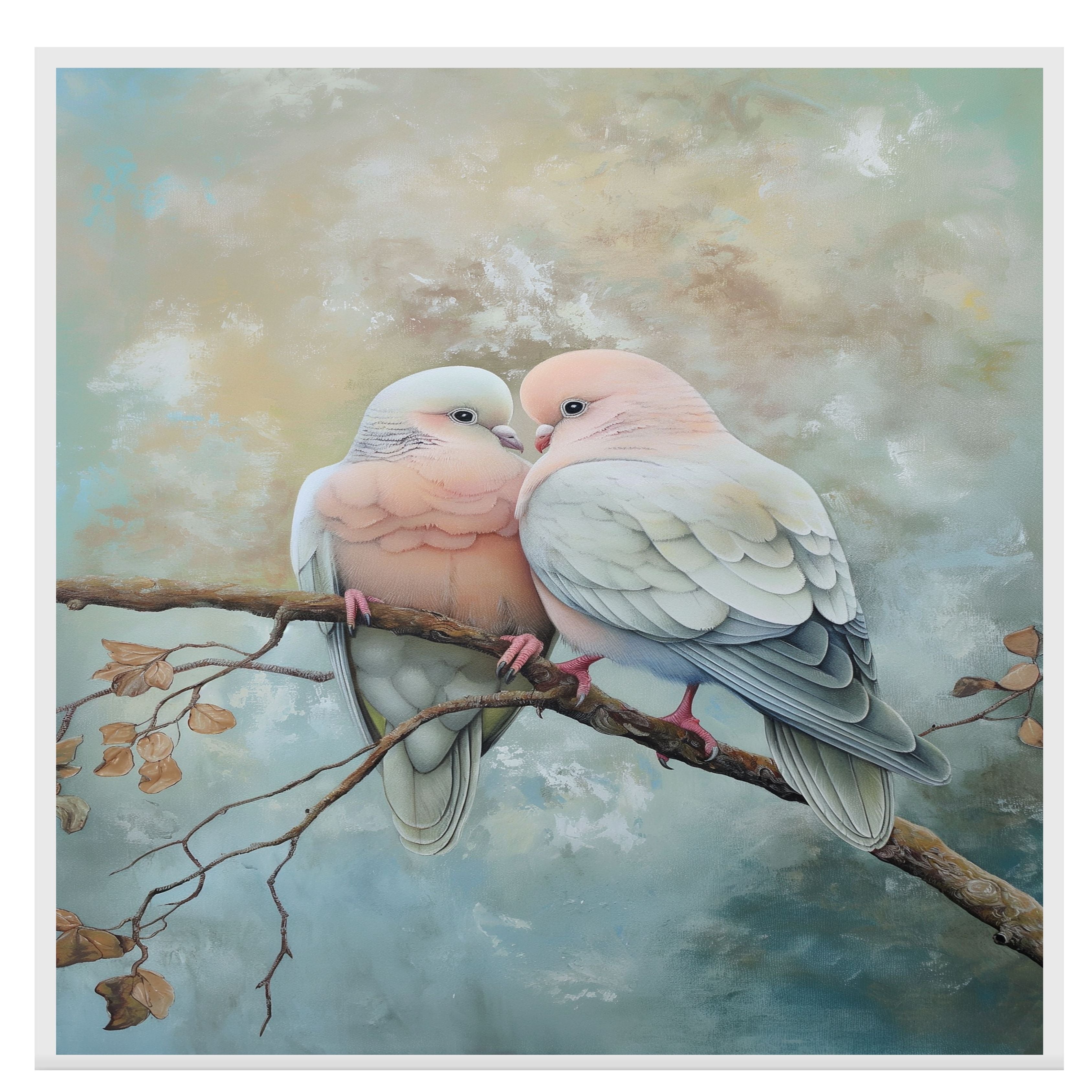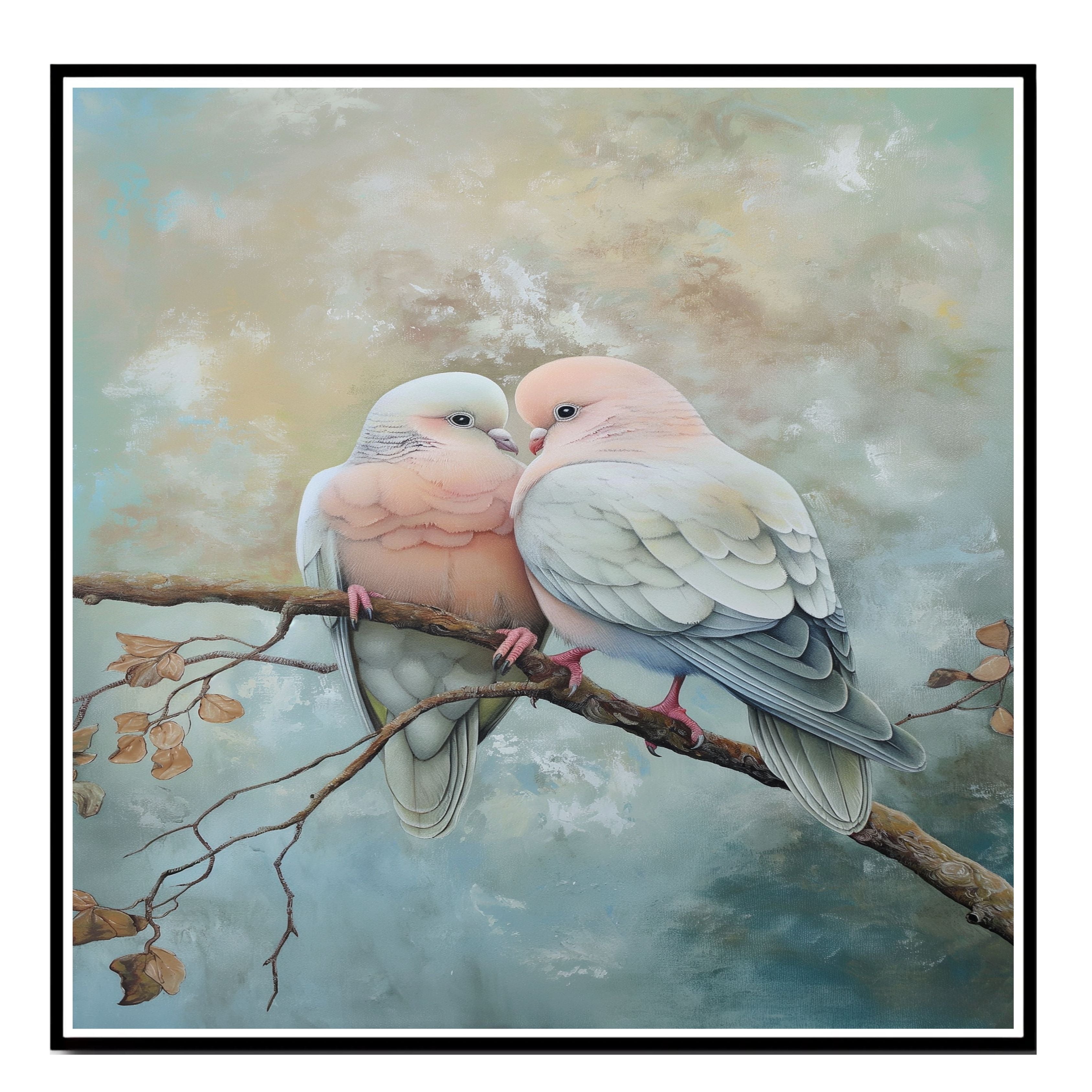 This gentle and beautifully detailed painting showcases two lovebirds sharing a quiet moment on a branch. Surrounded by calming earth tones and soft pastels, this artwork brings a serene, romantic atmosphere to any room and is perfect for bird lovers.
