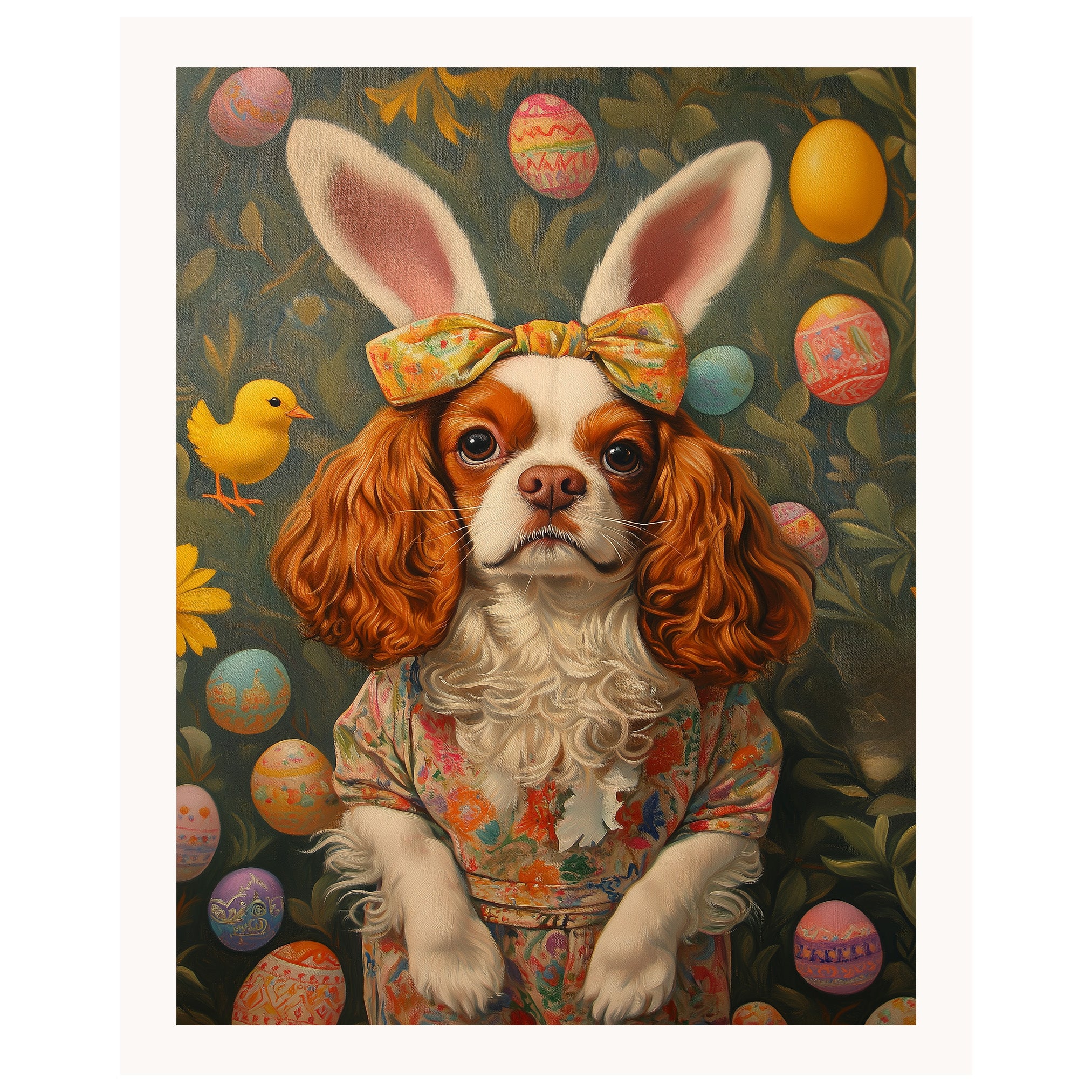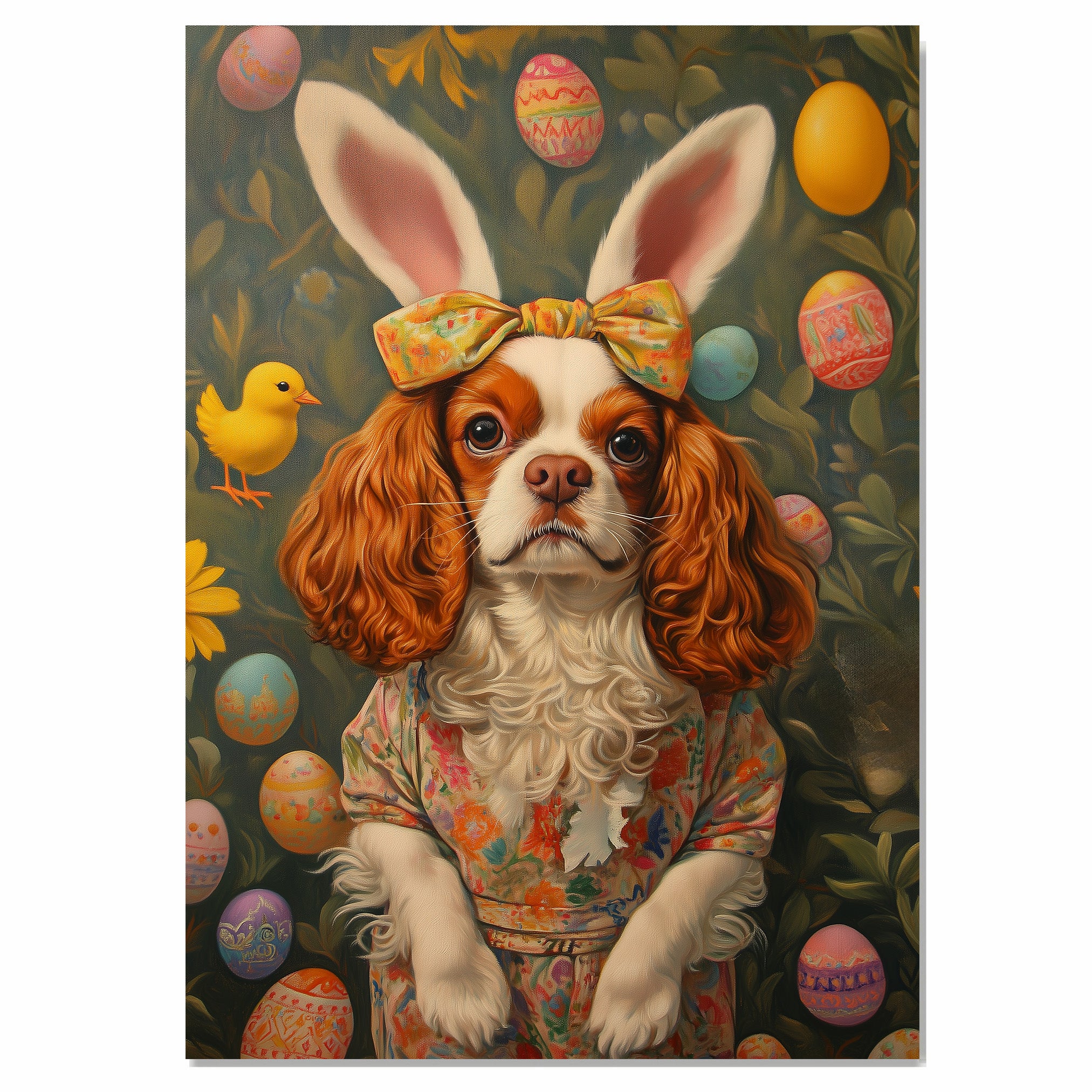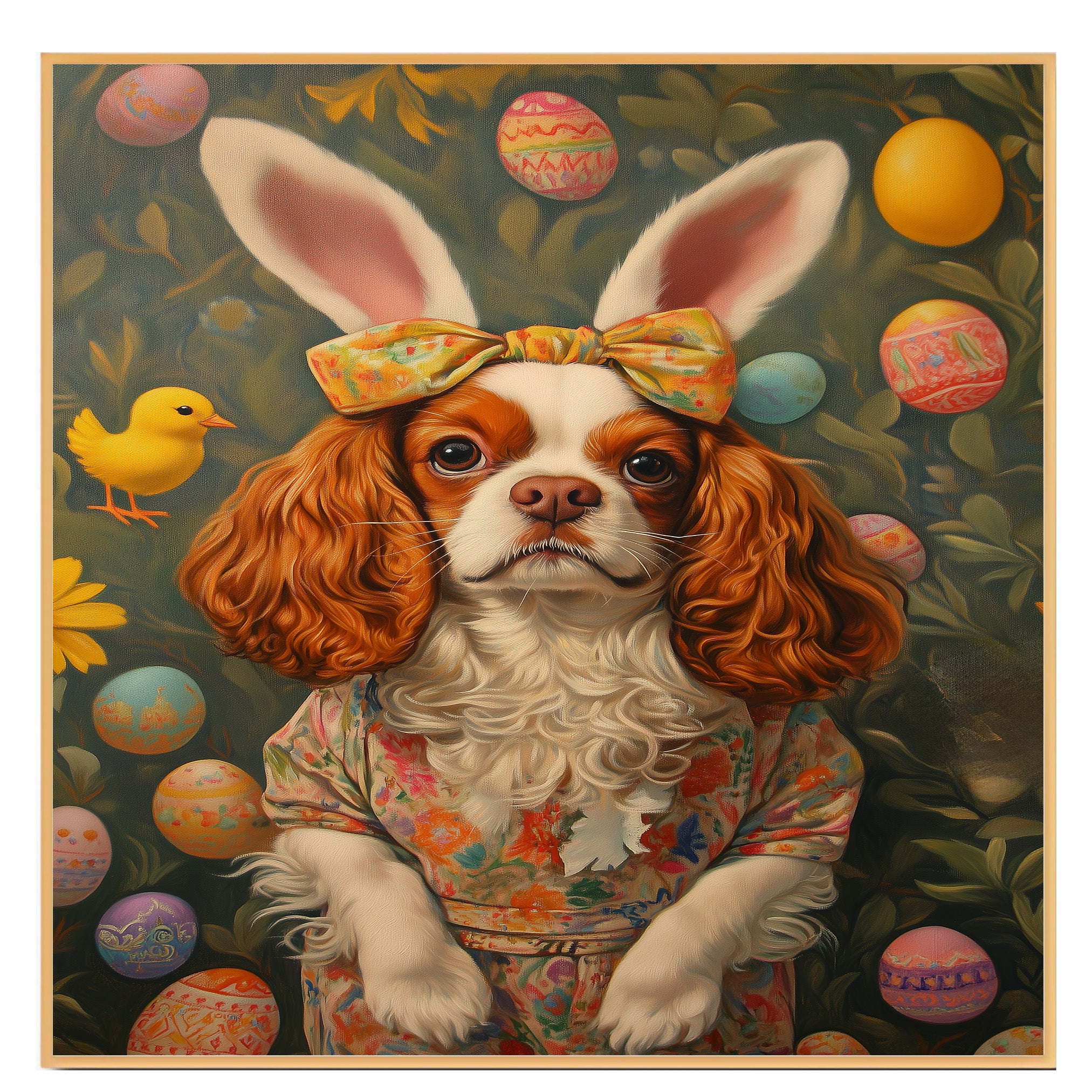 Our Spring Charm artwork showcases a Cavalier King Charles Spaniel dressed in an adorable seasonal outfit, capturing the essence of spring with elegance and warmth. This heartwarming piece is perfect for celebrating the season and adding a cheerful touch to your home. Available as a premium canvas wrap, framed print, or rolled artwork, it's a must-have for dog lovers and festive decor enthusiasts alike!
