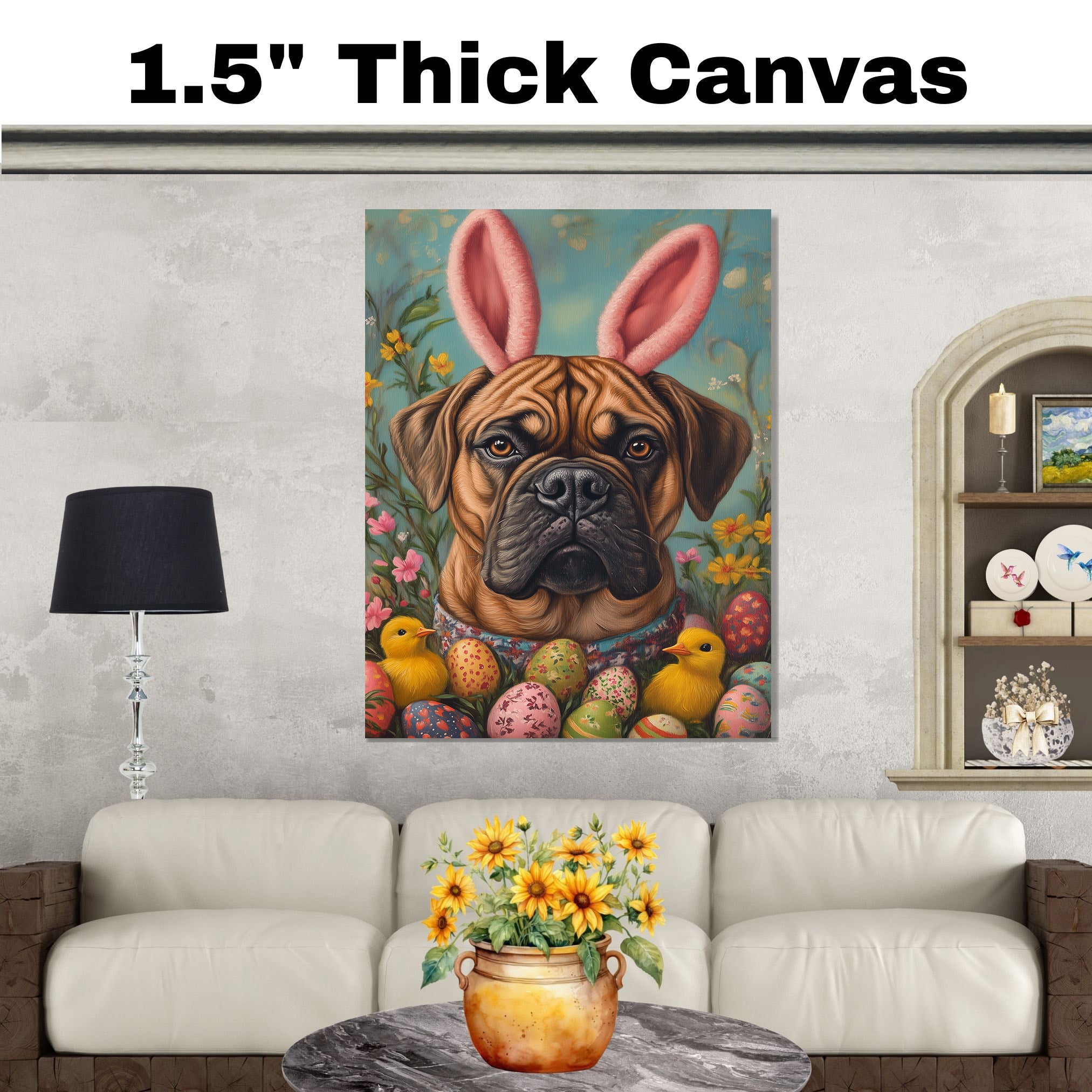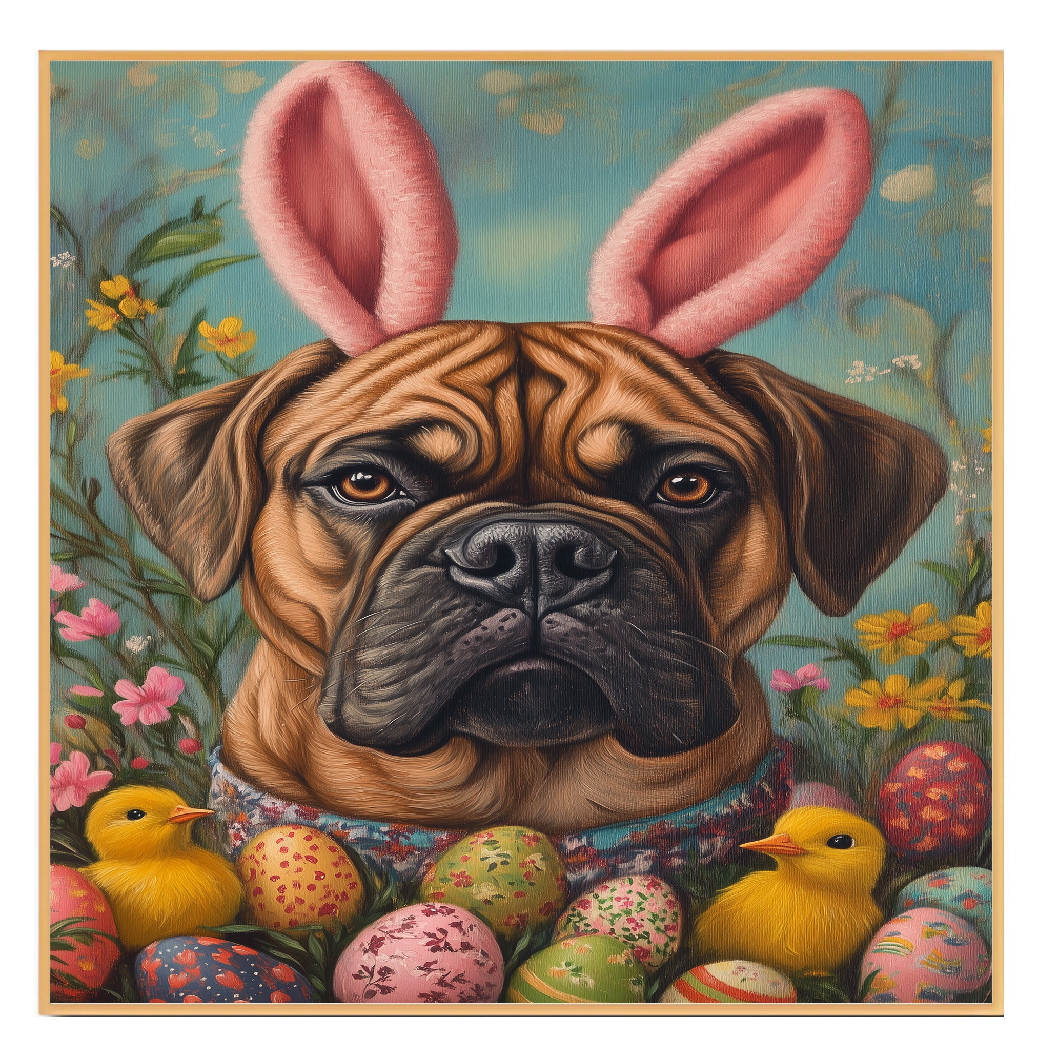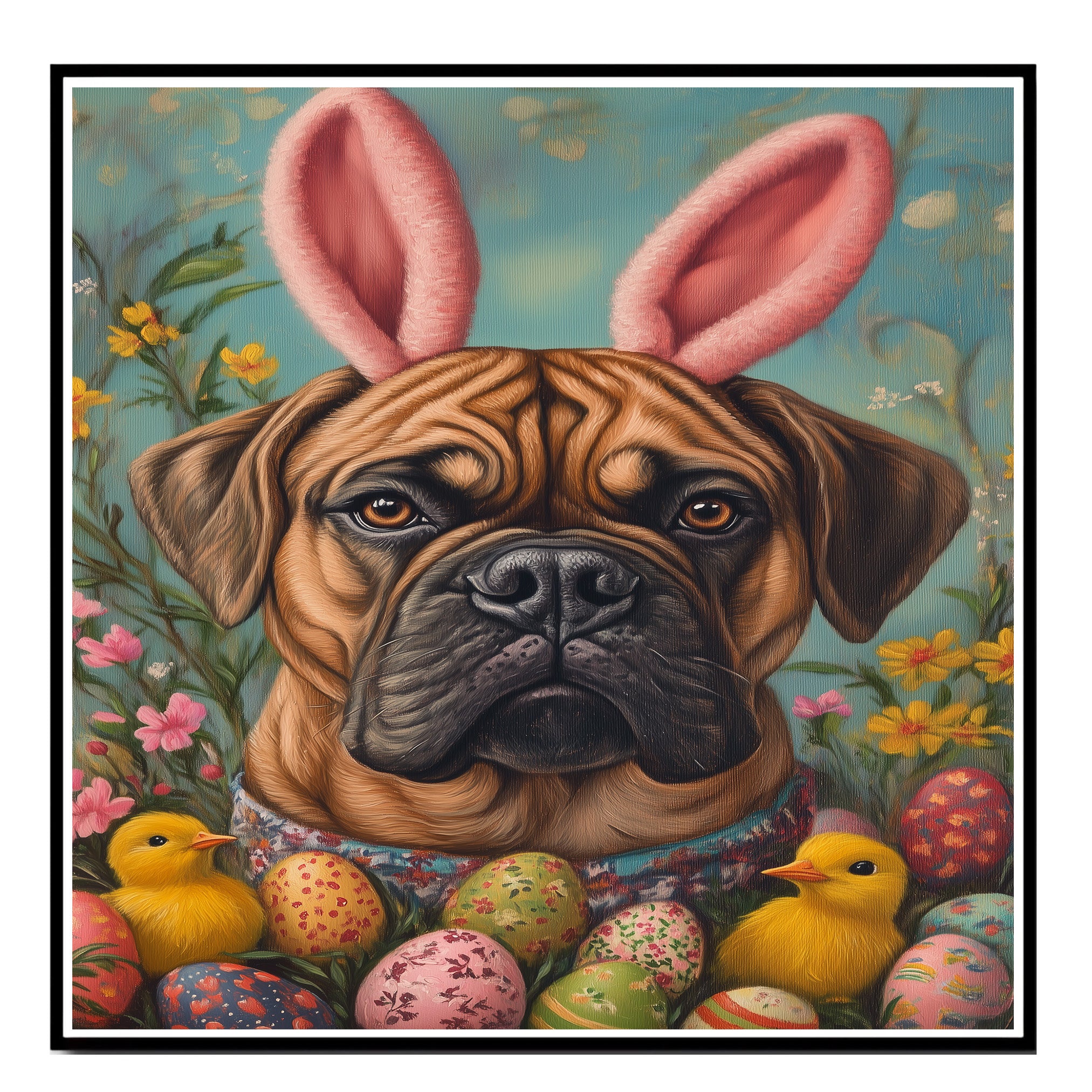 Our Spring Spirit Canvas captures the joy of the season, featuring a lovable Bullmastiff posing in a charming Easter costume. Adorned in festive spring colors with delightful holiday details, this heartwarming artwork radiates warmth and celebration, making it a perfect addition to your Easter decor. The whimsical scene brings a touch of seasonal magic to any space, filling your home with charm and cheer. Available as an artistic canvas wrap, framed print, or rolled artwork, this enchanting piece is a wonderful gift for dog lovers and Easter enthusiasts alike.