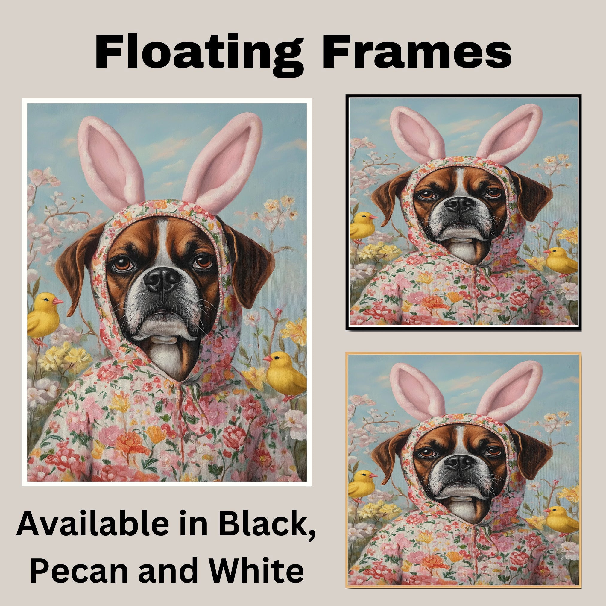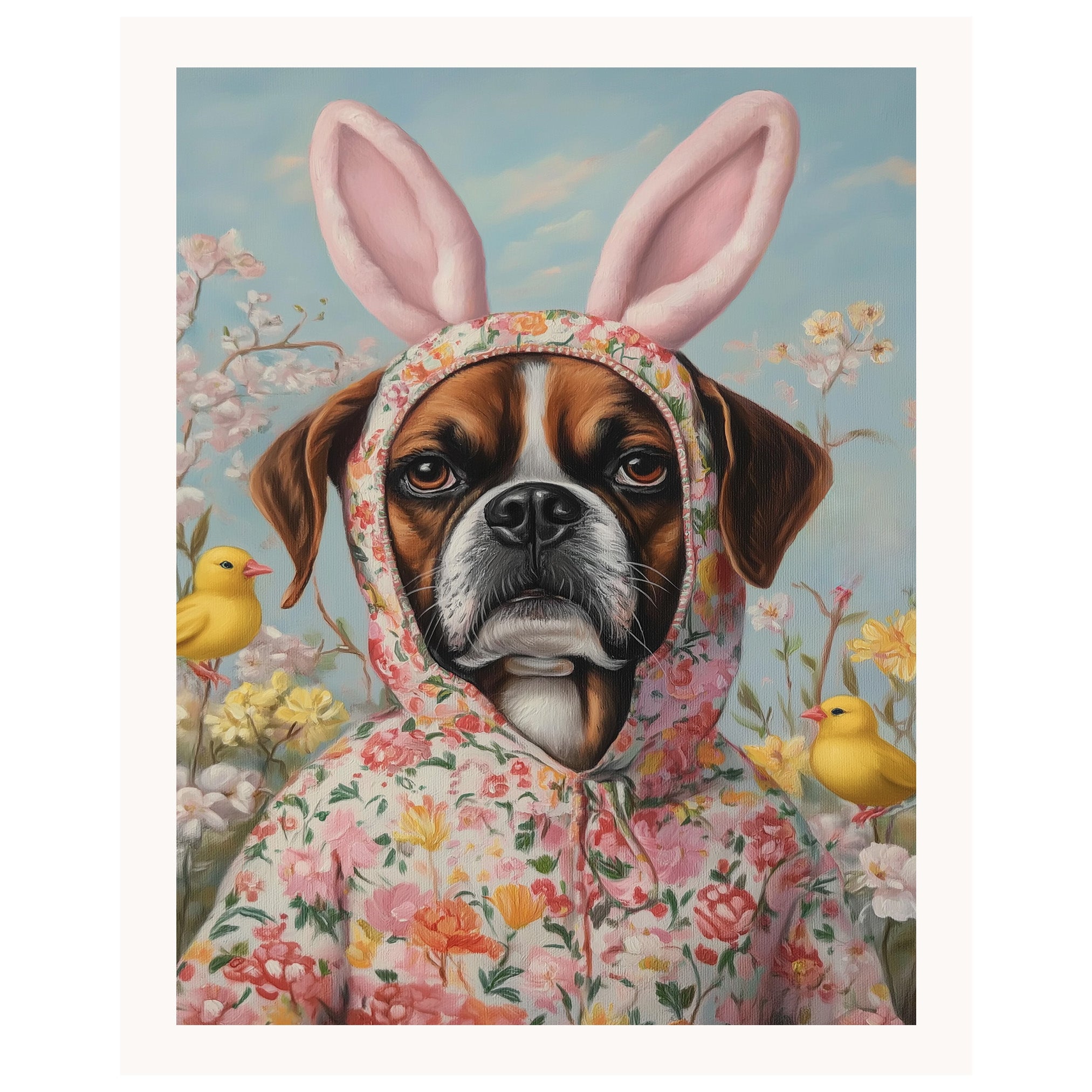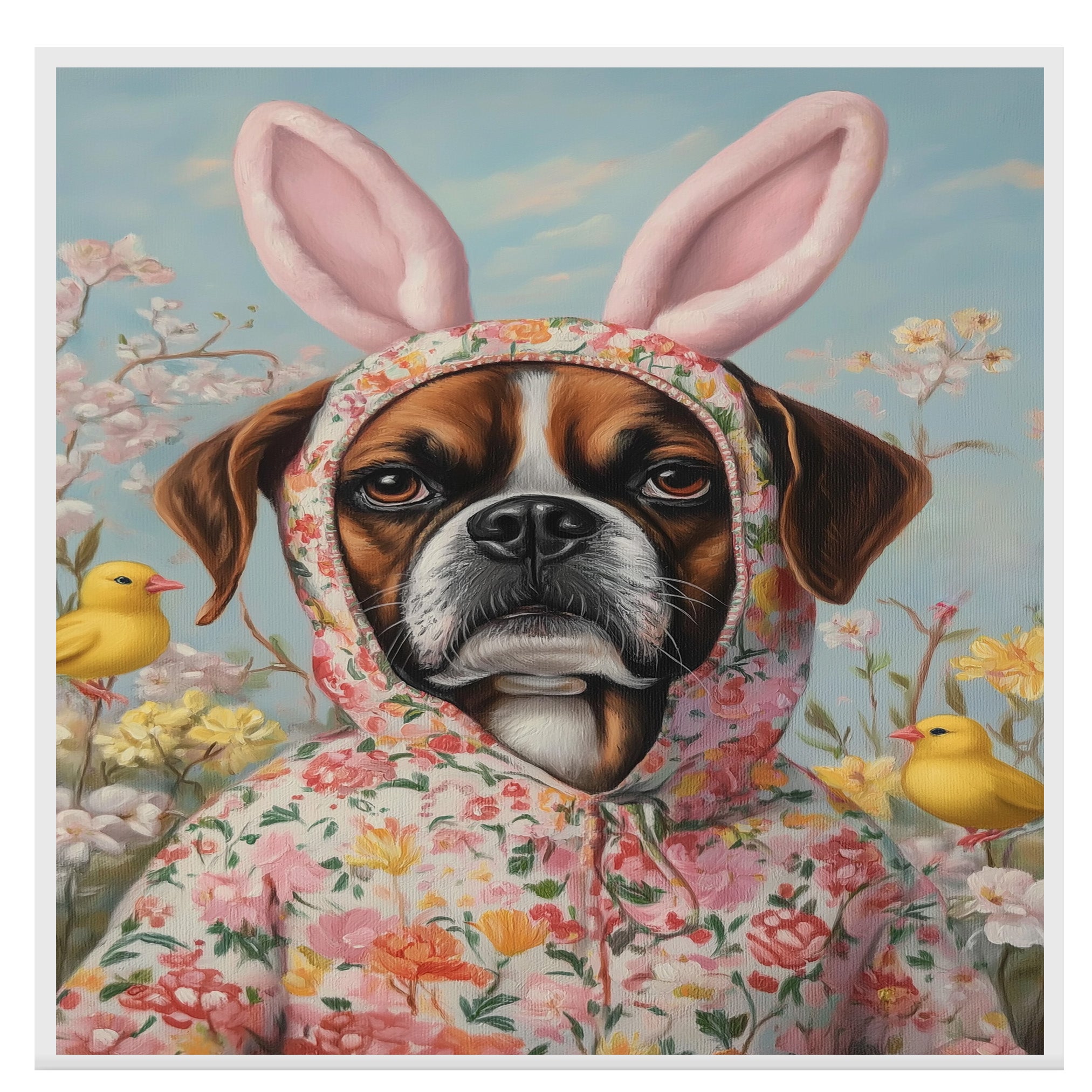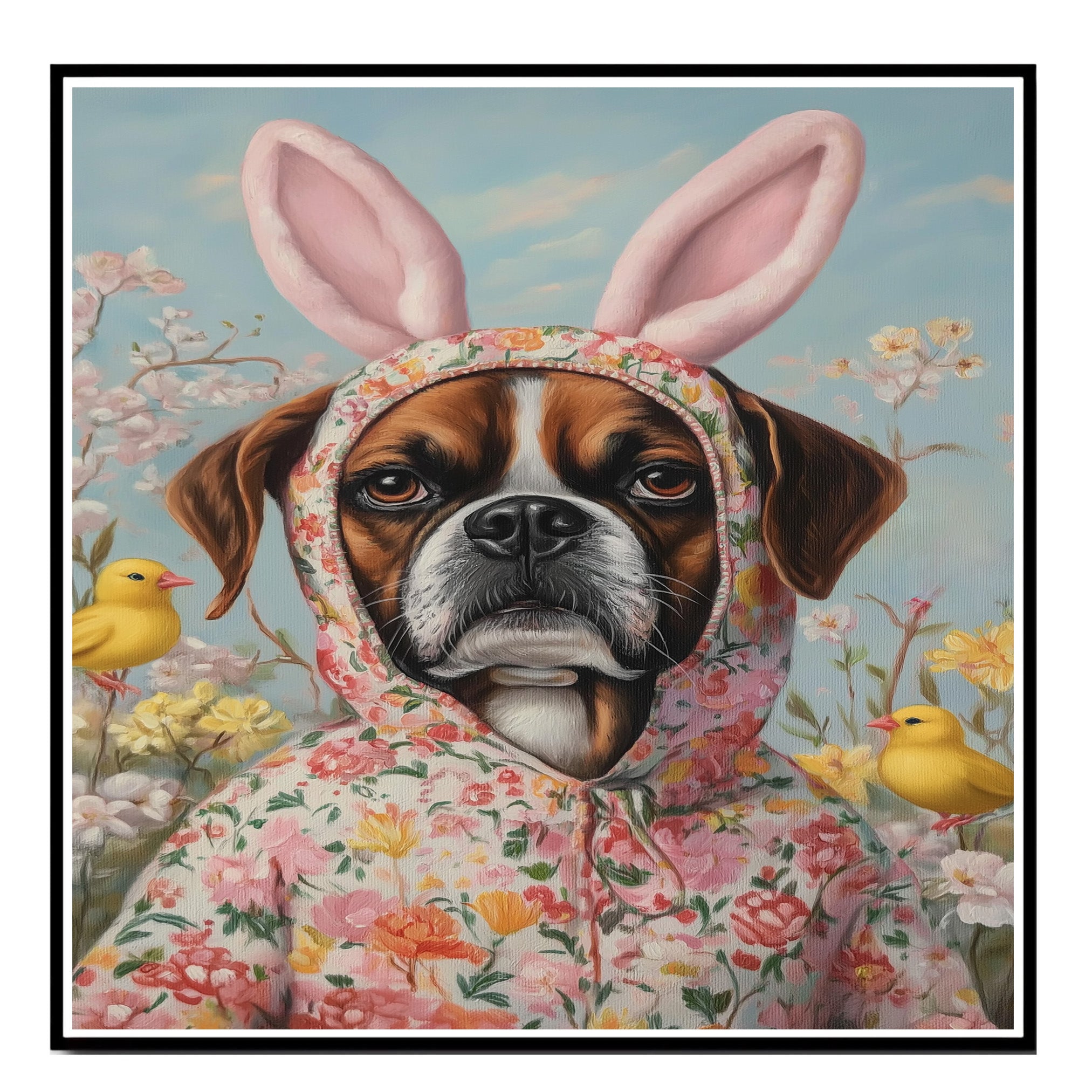Our Spring Whimsy Canvas captures the playful charm of the season, featuring an adorable Boxer dog dressed in a cheerful Easter costume. With bright spring colors and festive details, this delightful artwork radiates warmth and celebration, making it a perfect addition to your holiday decor. The whimsical scene brings a touch of seasonal magic to any space, filling your home with joy and charm. Available as a premium canvas wrap, framed print, or rolled artwork, this enchanting piece is a wonderful gift for dog lovers and Easter enthusiasts alike.