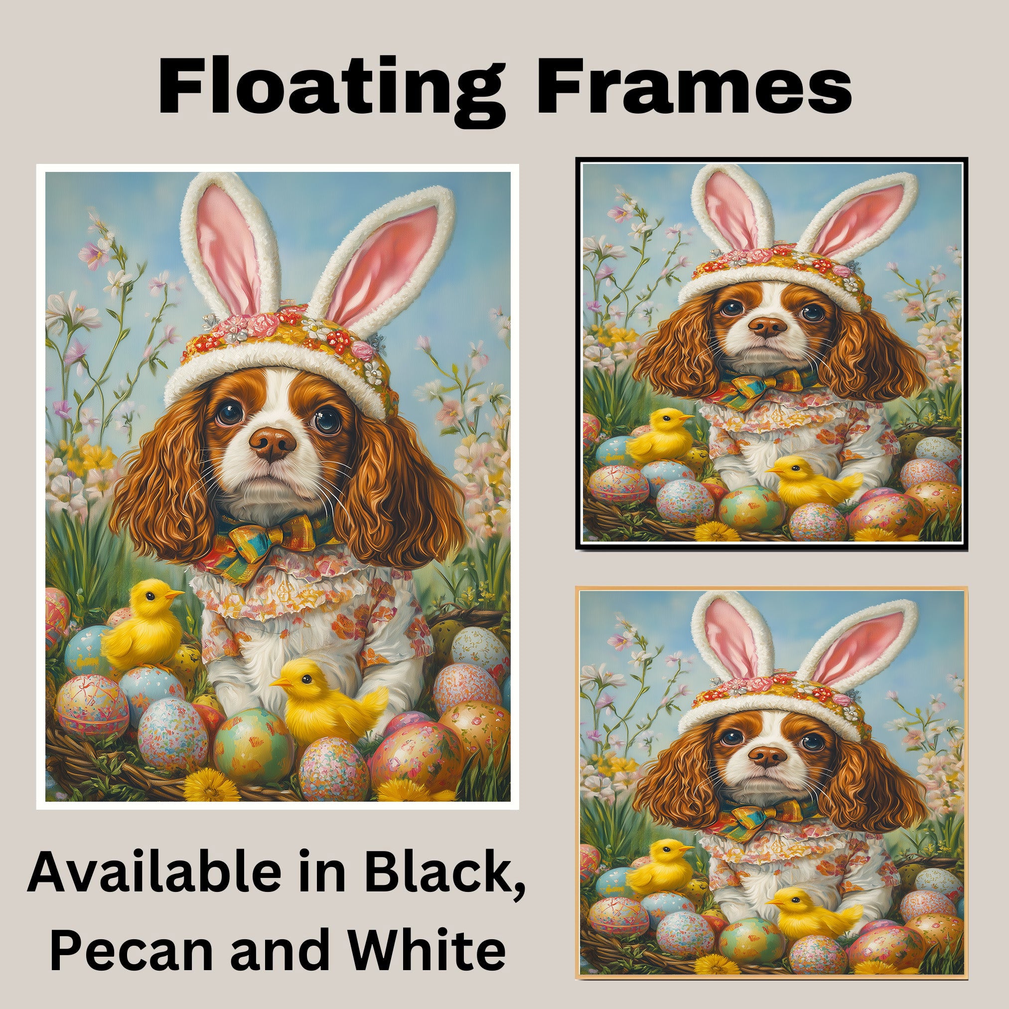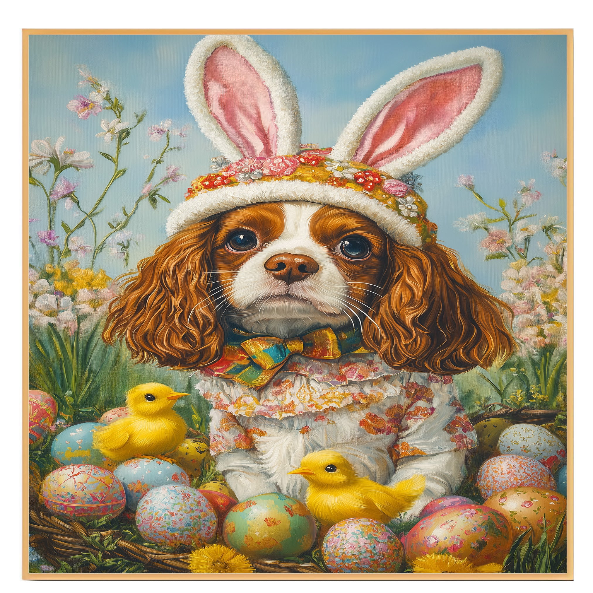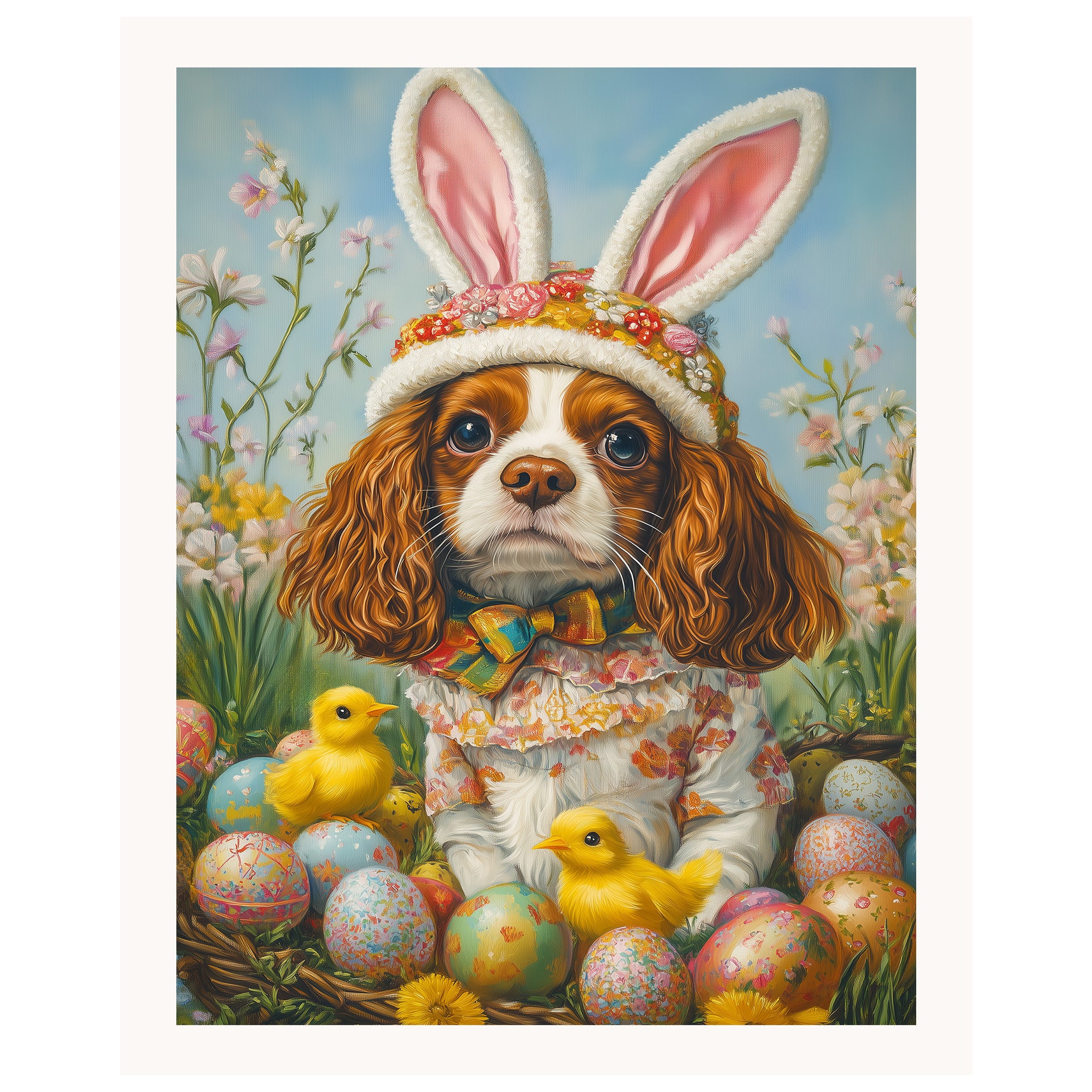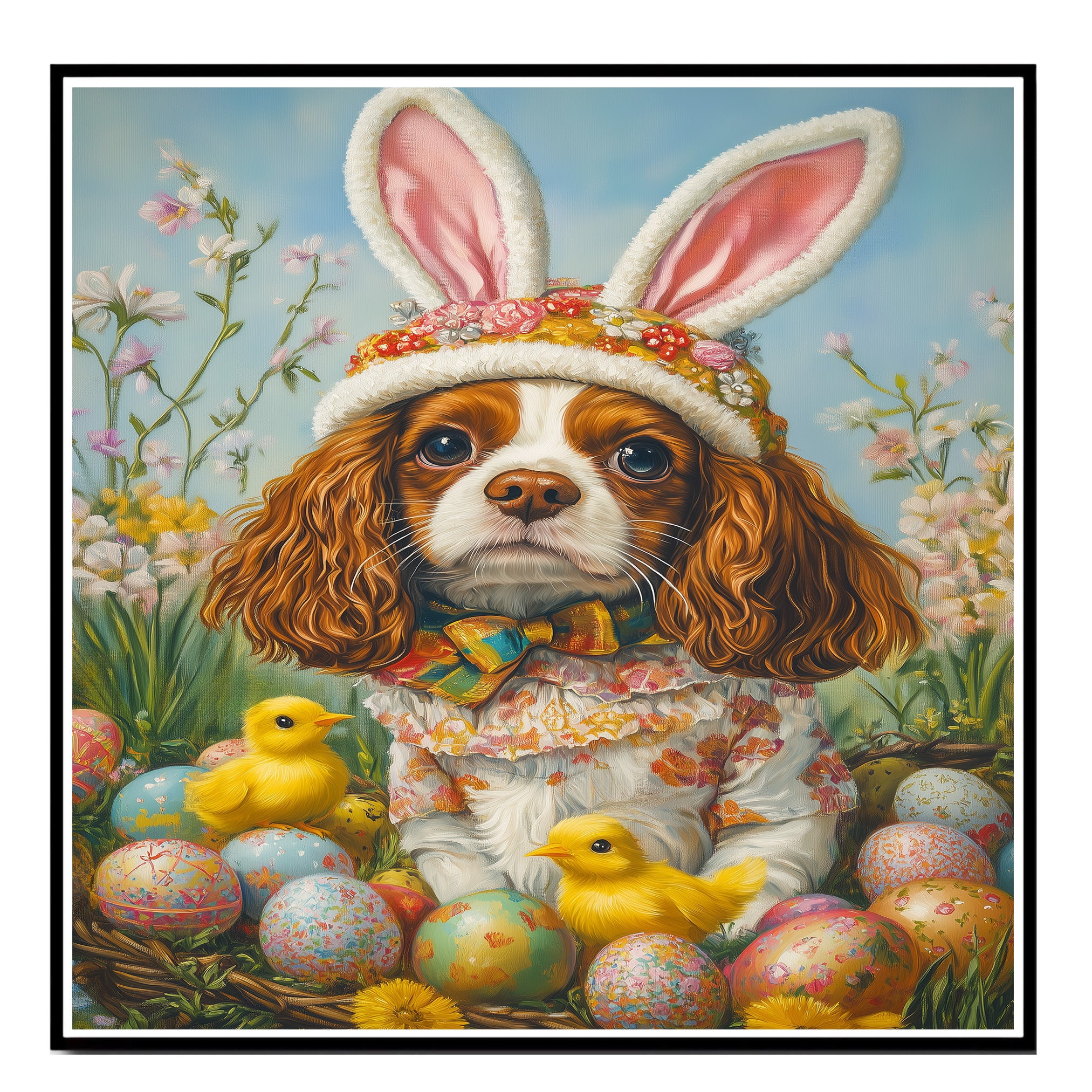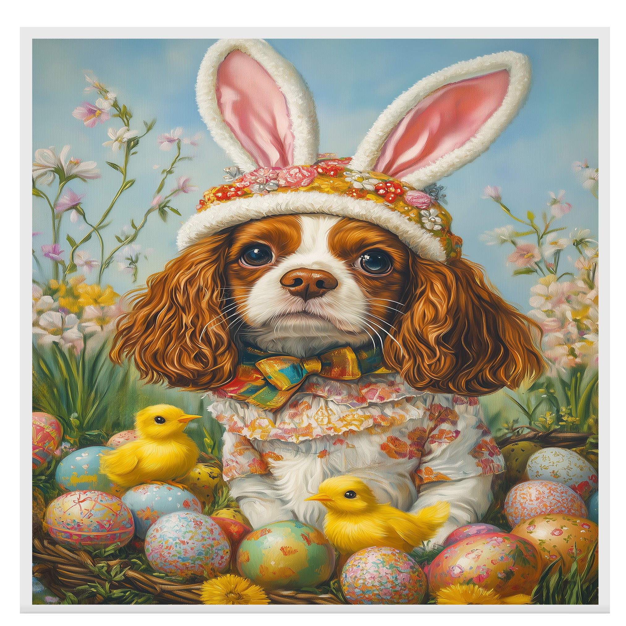 Springtime Charm: Cavalier King Charles Spaniel in a Festive Holiday Attire on Canvas, Framed Print, or Rolled Art