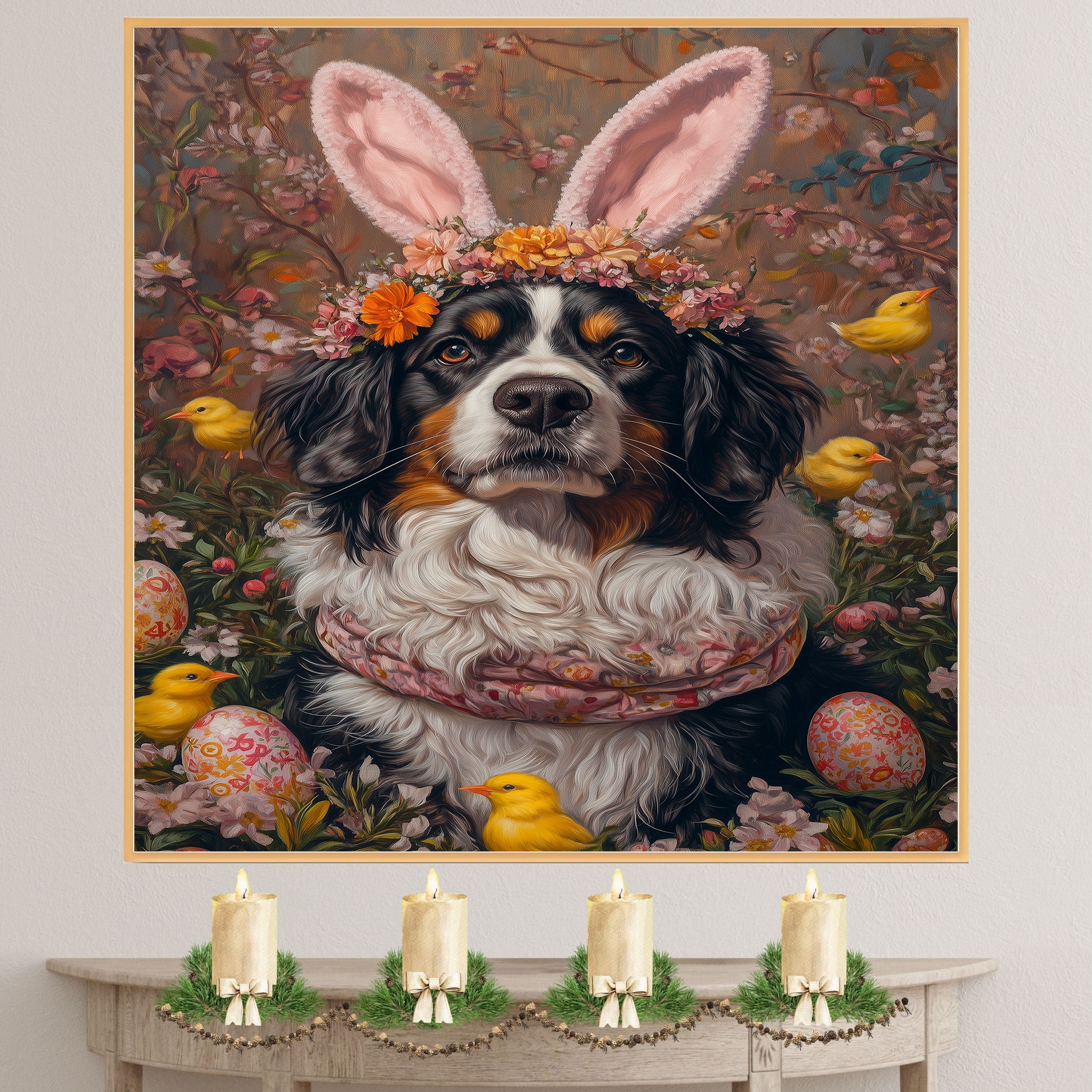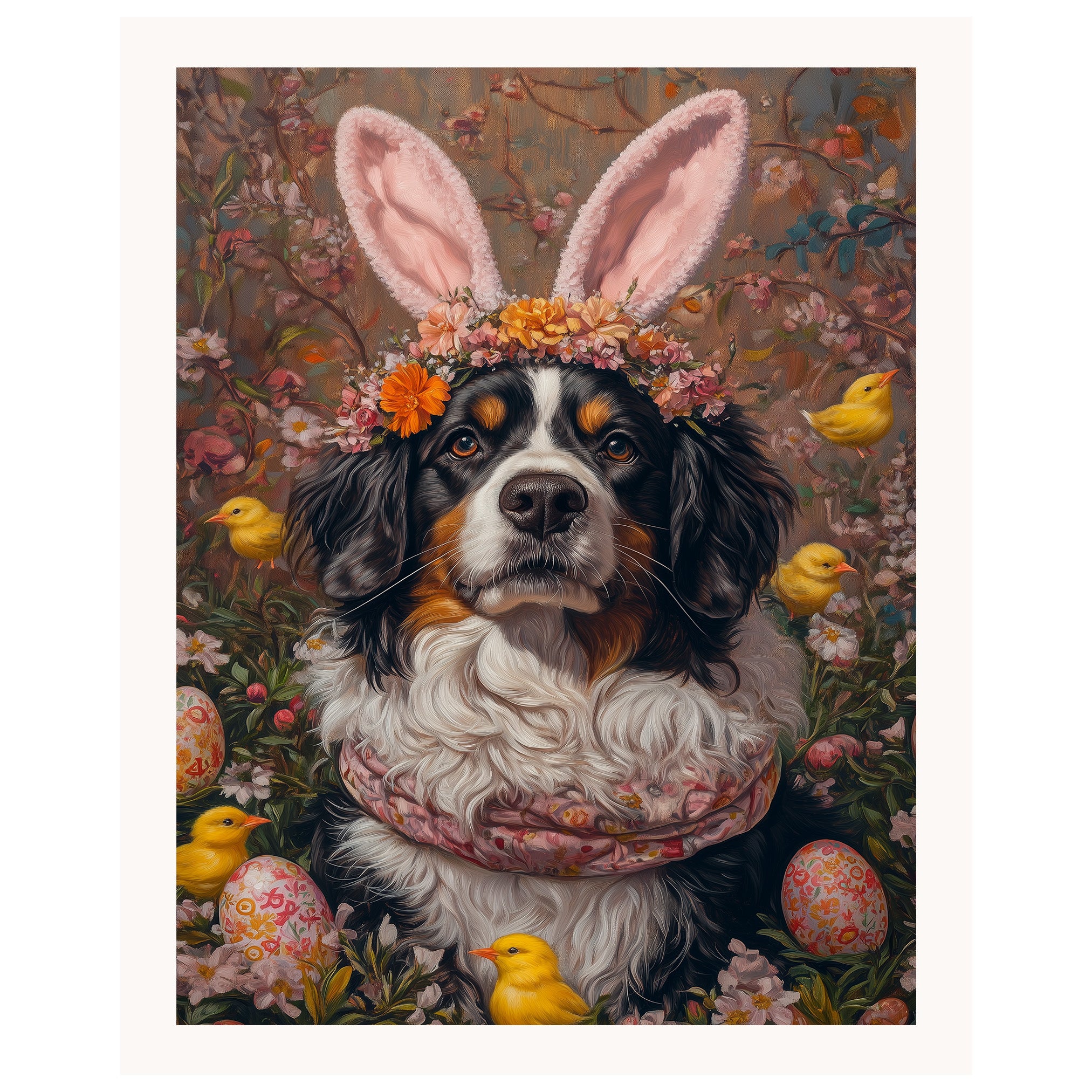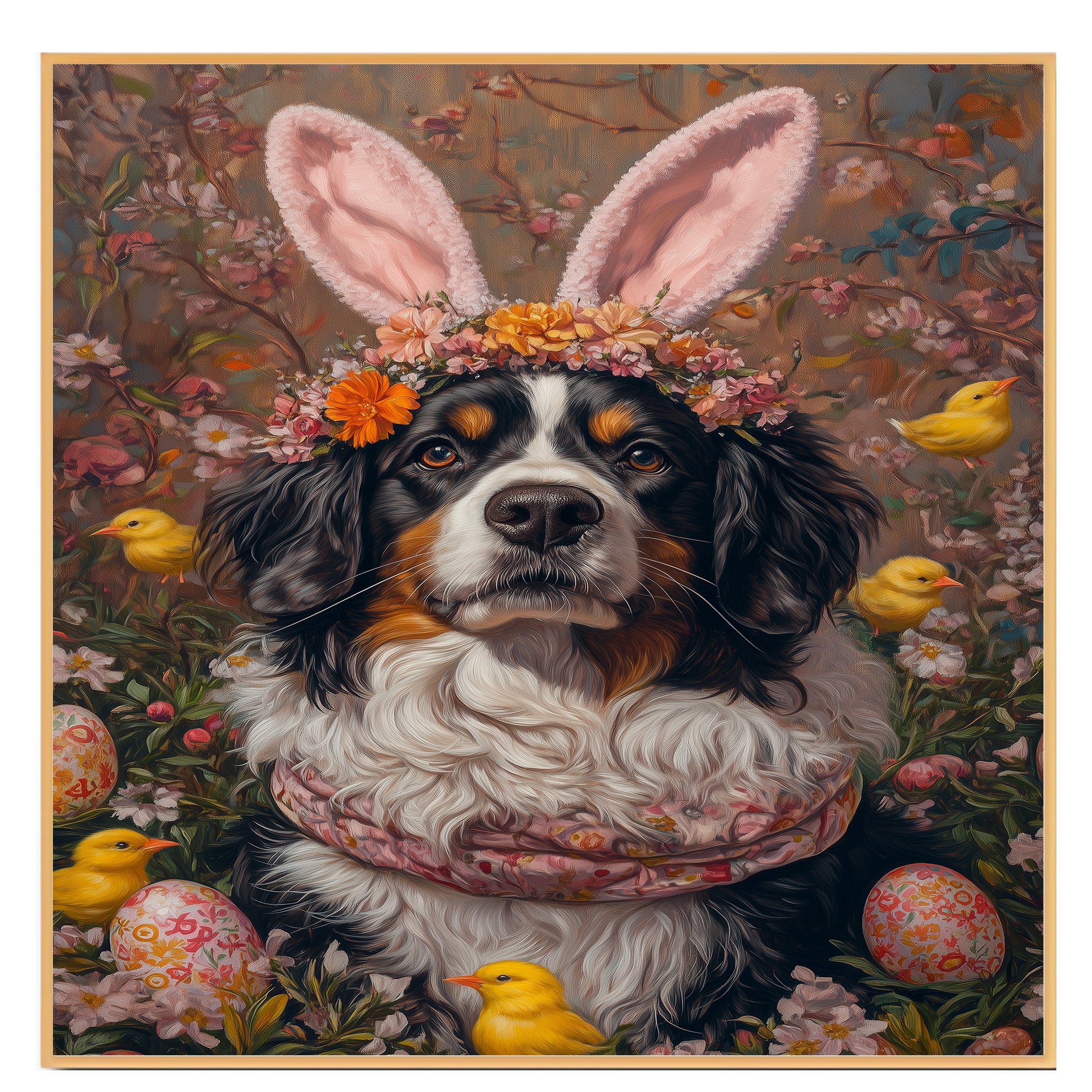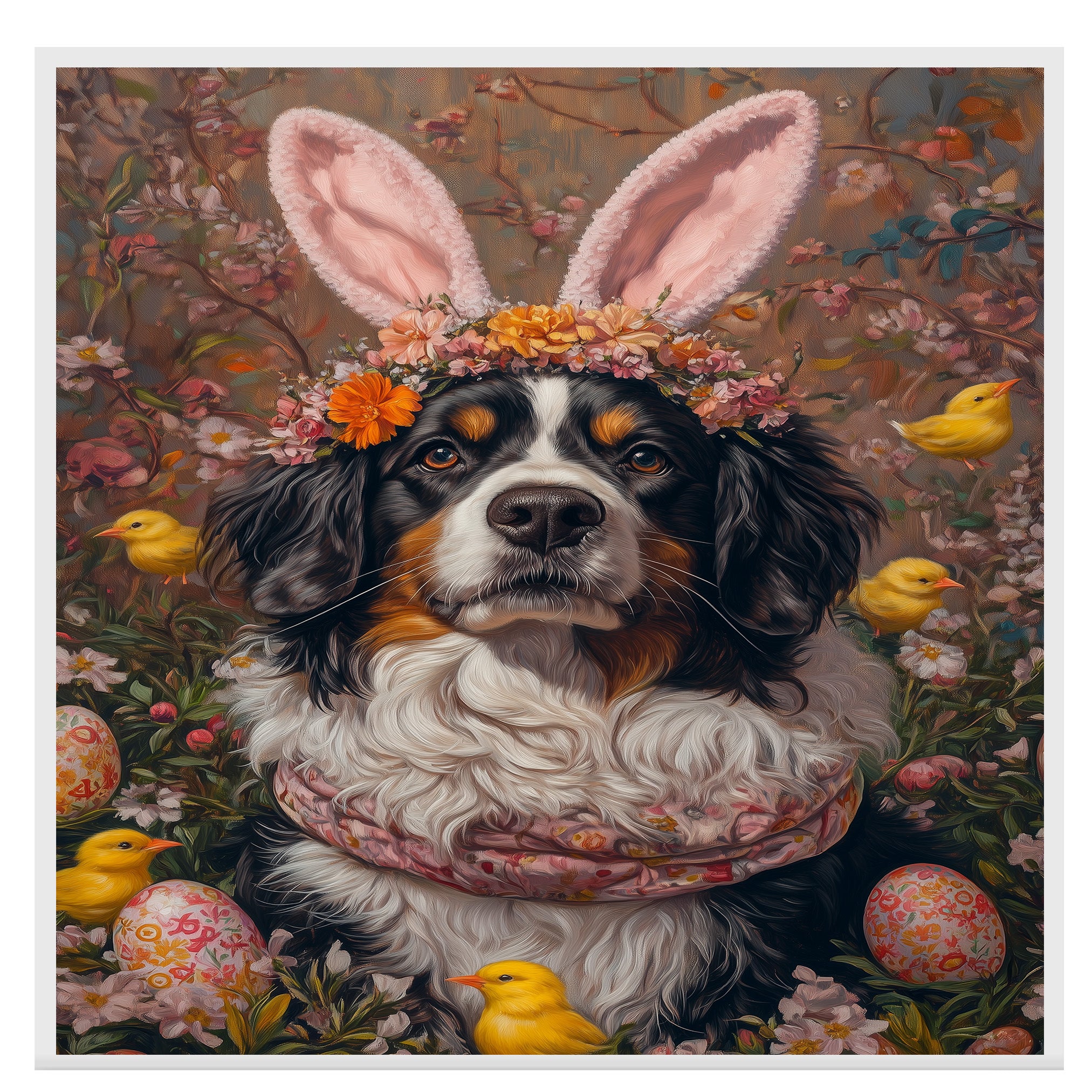 Our Springtime Festivities Canvas captures the joy of the season, featuring a Bernese Mountain Dog proudly showcasing a cheerful Easter costume. Surrounded by vibrant spring colors and festive details, this heartwarming artwork embodies the playful spirit of Easter. The lively scene brings warmth and charm to your seasonal decor, making it a delightful addition to any space. Available on a 1.5" thick canvas wrap, floating framed canvas, or as a flat rolled canvas, this enchanting piece is a perfect gift for dog lovers and holiday enthusiasts alike.