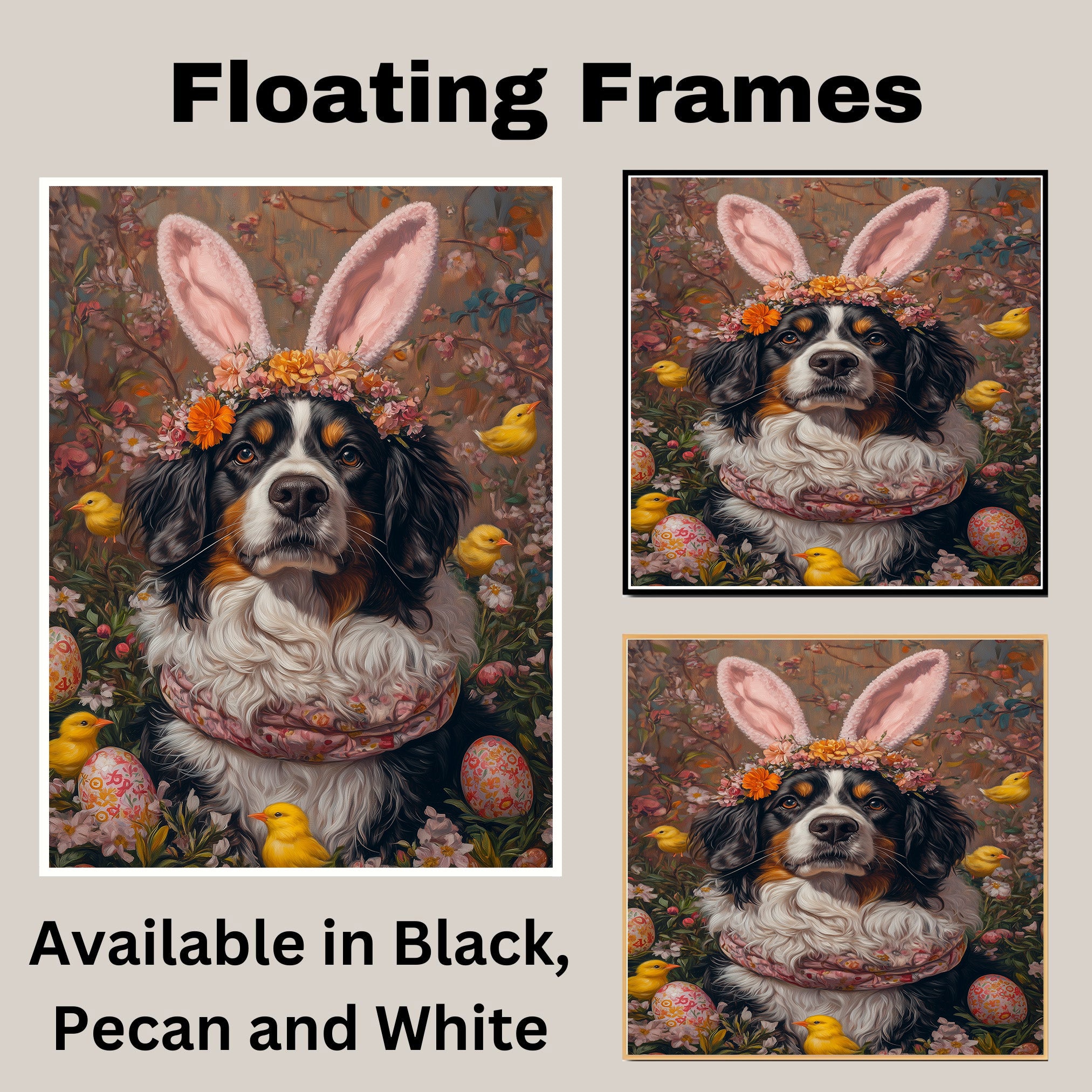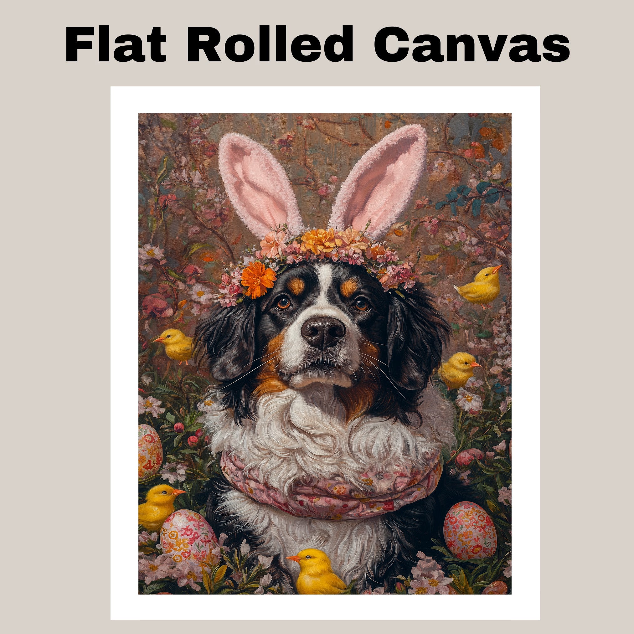 Springtime Festivities: Bernese Mountain Dog Showcasing a Cheerful Easter Costume on Ready to Hang 1.5" Thick Canvas Wrap, Floating Framed Canvas, Flat Rolled Canvas