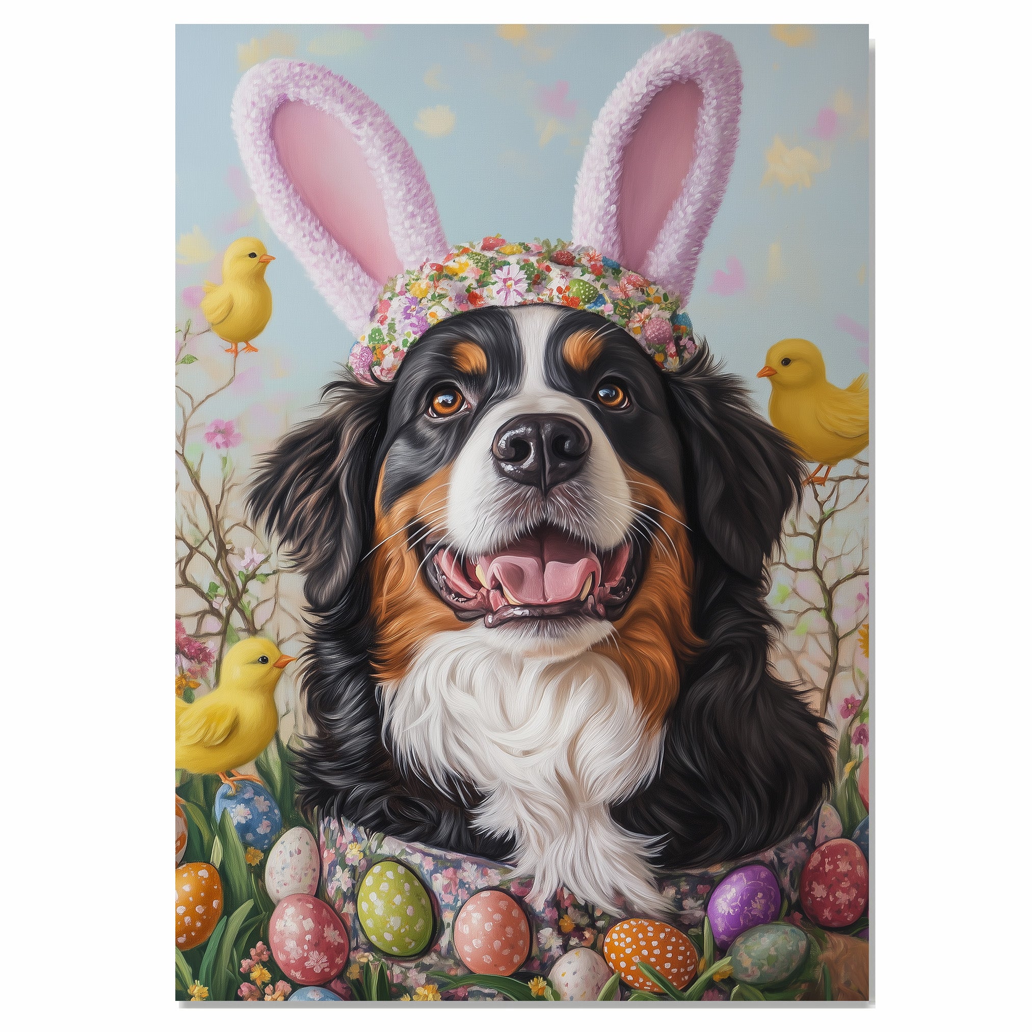 Our Springtime Whimsy Canvas brings Easter joy to life, featuring a Bernese Mountain Dog posing proudly in a delightful holiday costume. Bursting with cheerful spring colors and festive charm, this heartwarming artwork captures the playful spirit of the season. The vibrant scene radiates warmth and celebration, making it a perfect addition to your Easter decor. Available on a 1.5" thick canvas wrap, floating framed canvas, or as a flat rolled canvas, this enchanting piece is a wonderful gift for dog lovers and holiday enthusiasts alike.