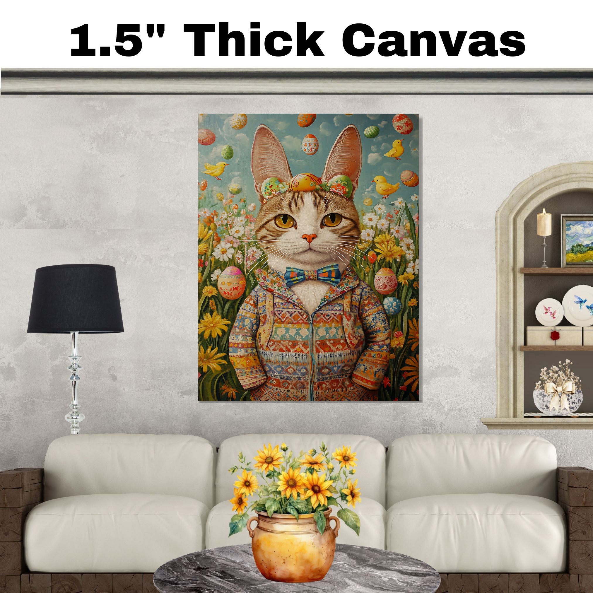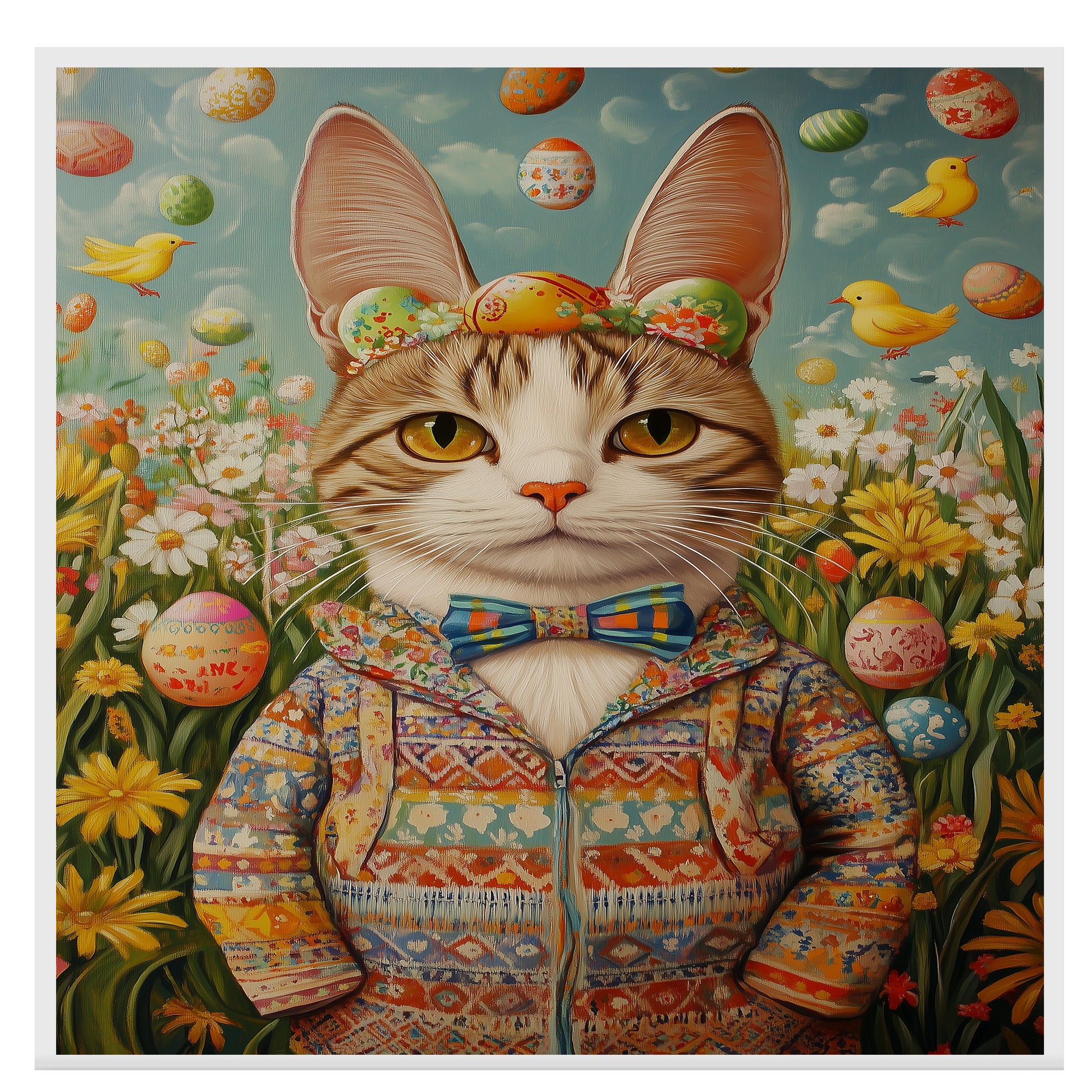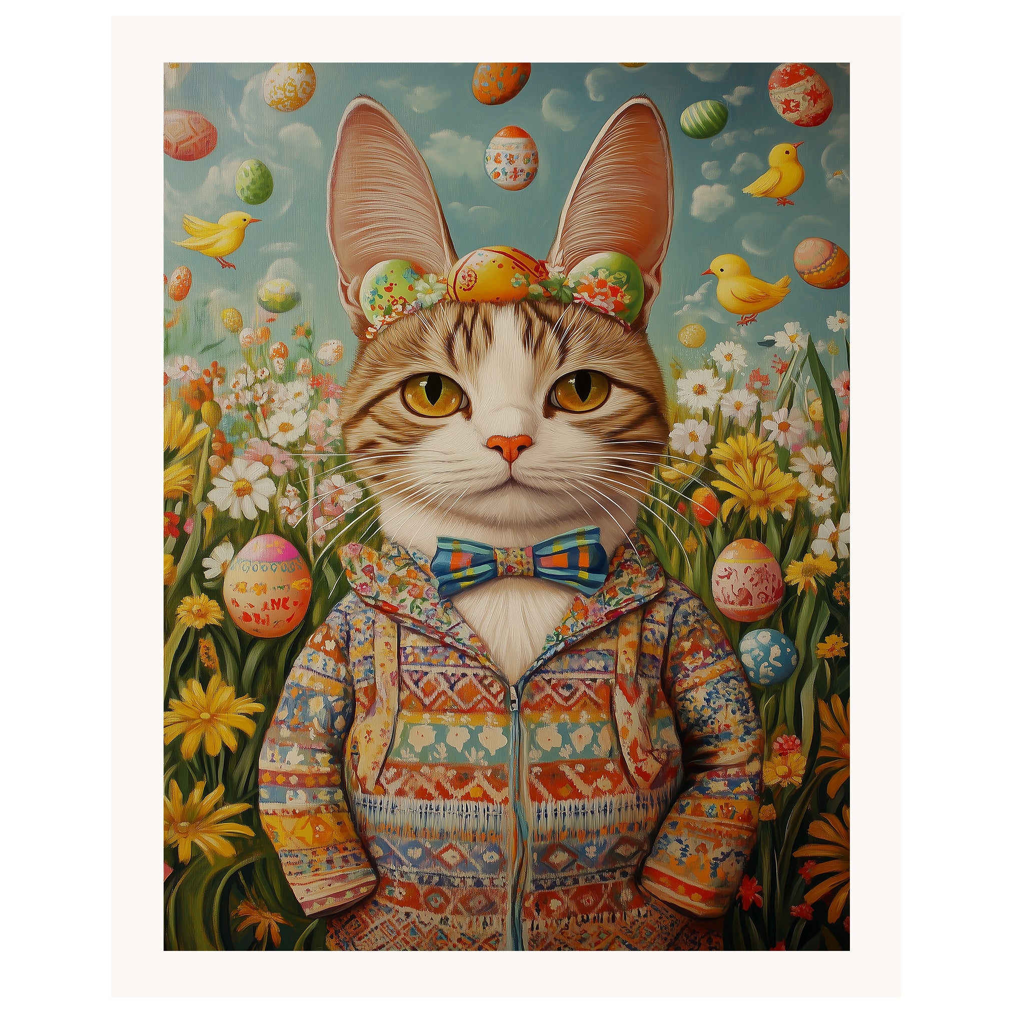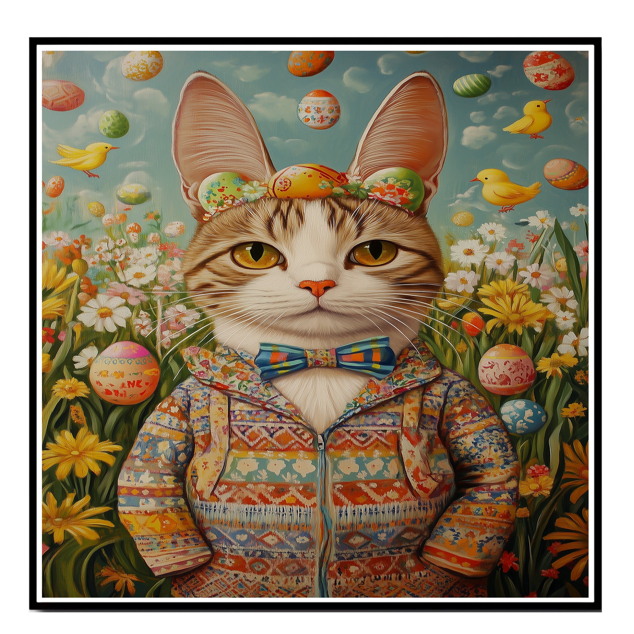 Our Springtime Whiskers Canvas captures the joy of the season, featuring a playful cat dressed in a cheerful holiday costume. Set against a backdrop of soft spring hues, this delightful artwork radiates warmth and charm, making it a perfect addition to your festive decor. Available as a canvas wrap, framed print, or rolled artwork, this whimsical piece is ideal for cat lovers and those who celebrate the beauty of spring. A purr-fect gift for Easter and beyond!