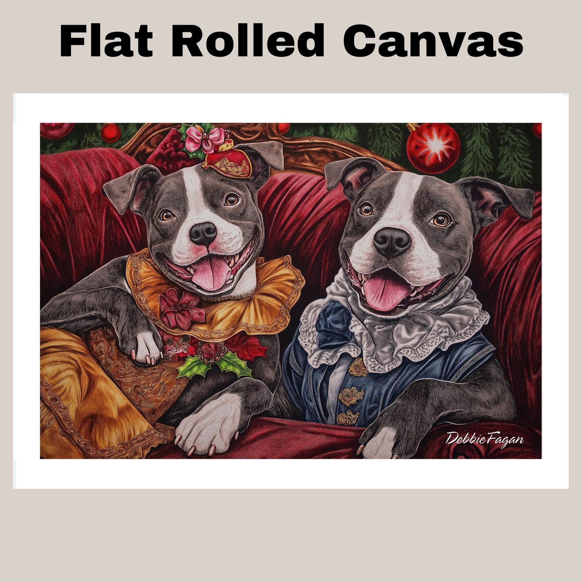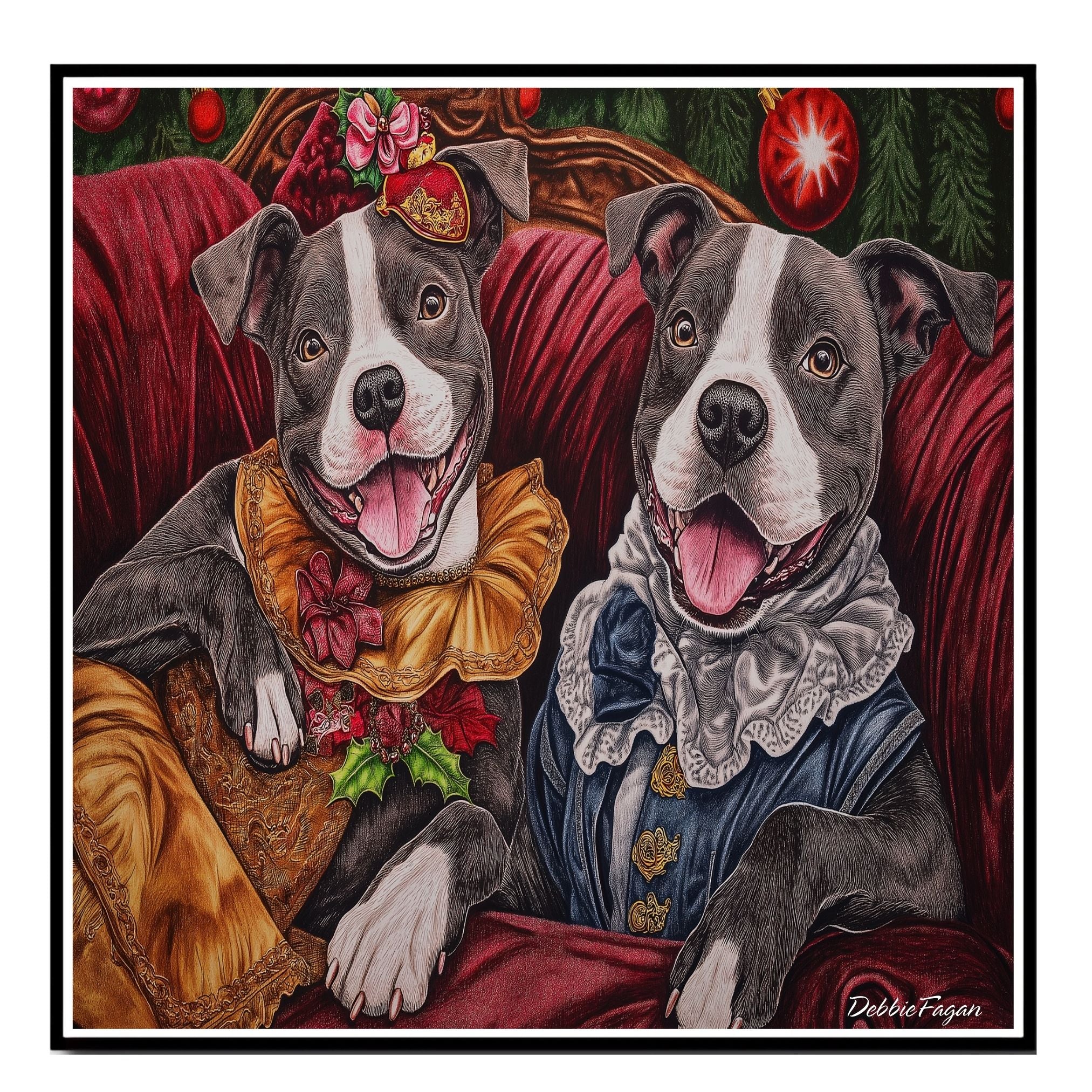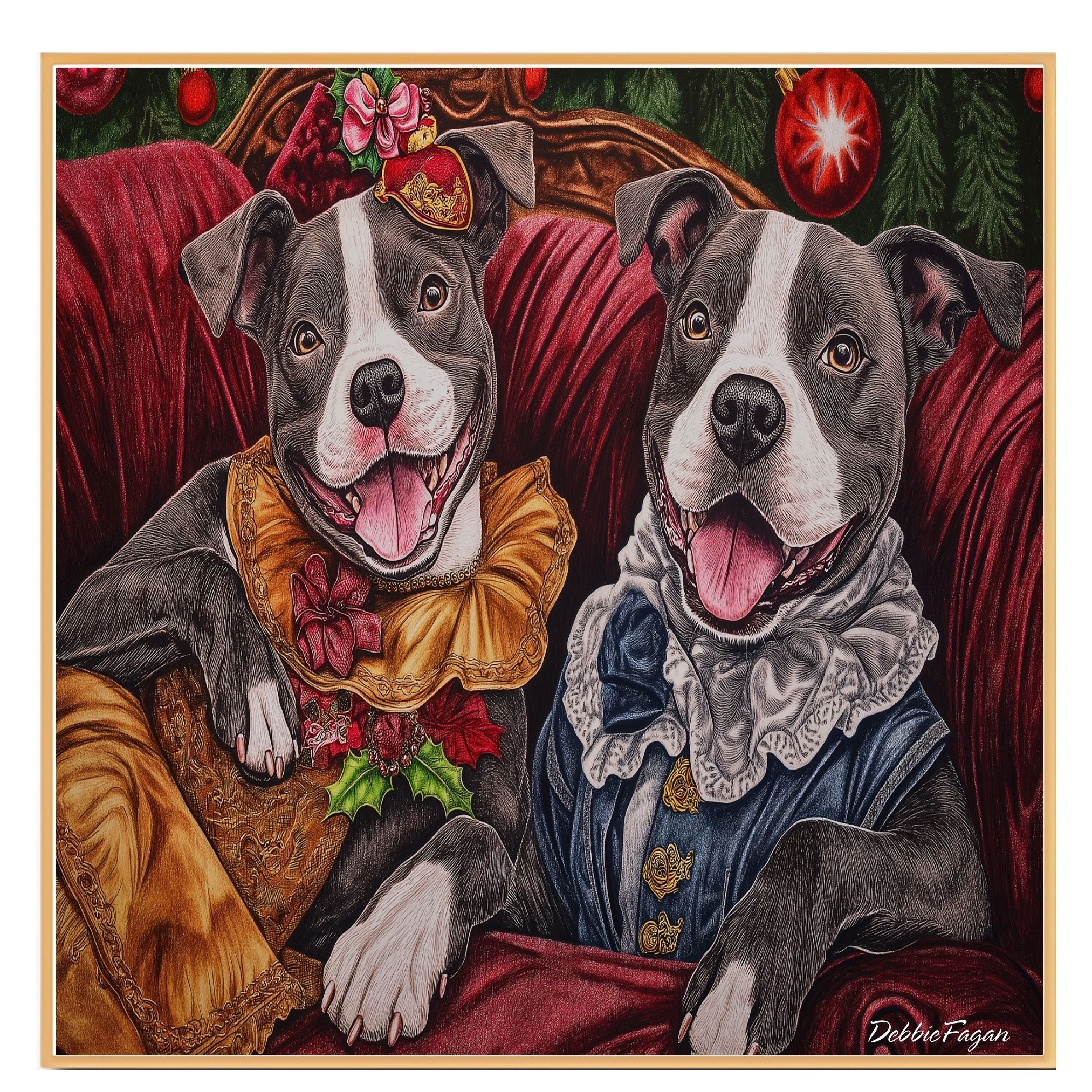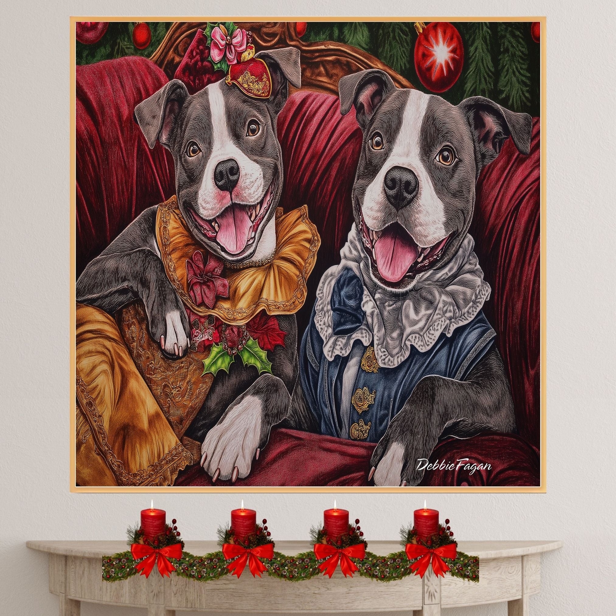 American Staffordshire Bull Terriers in Elegant Attire Painting Our Staffie Christmas Canvas adds a touch of Victorian...