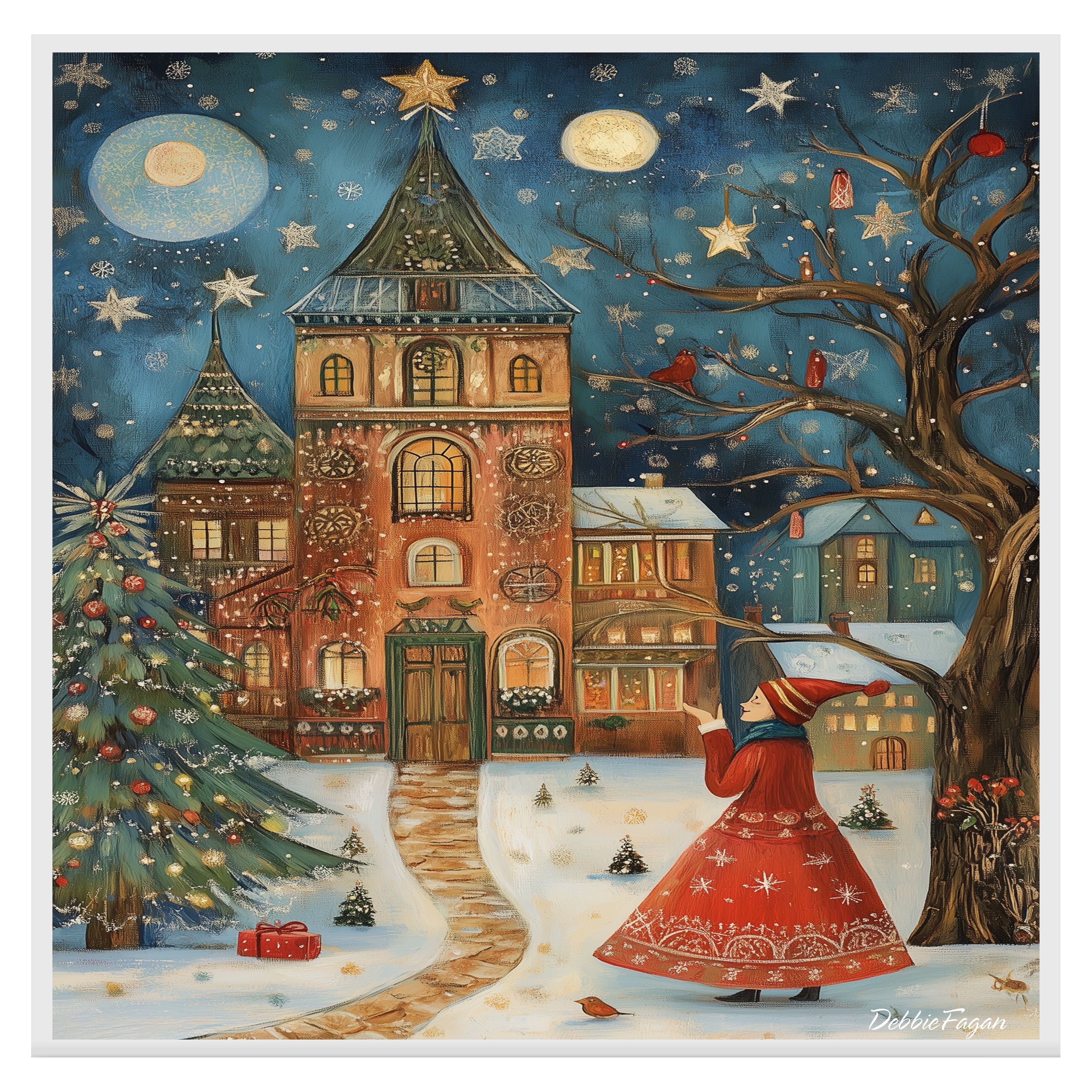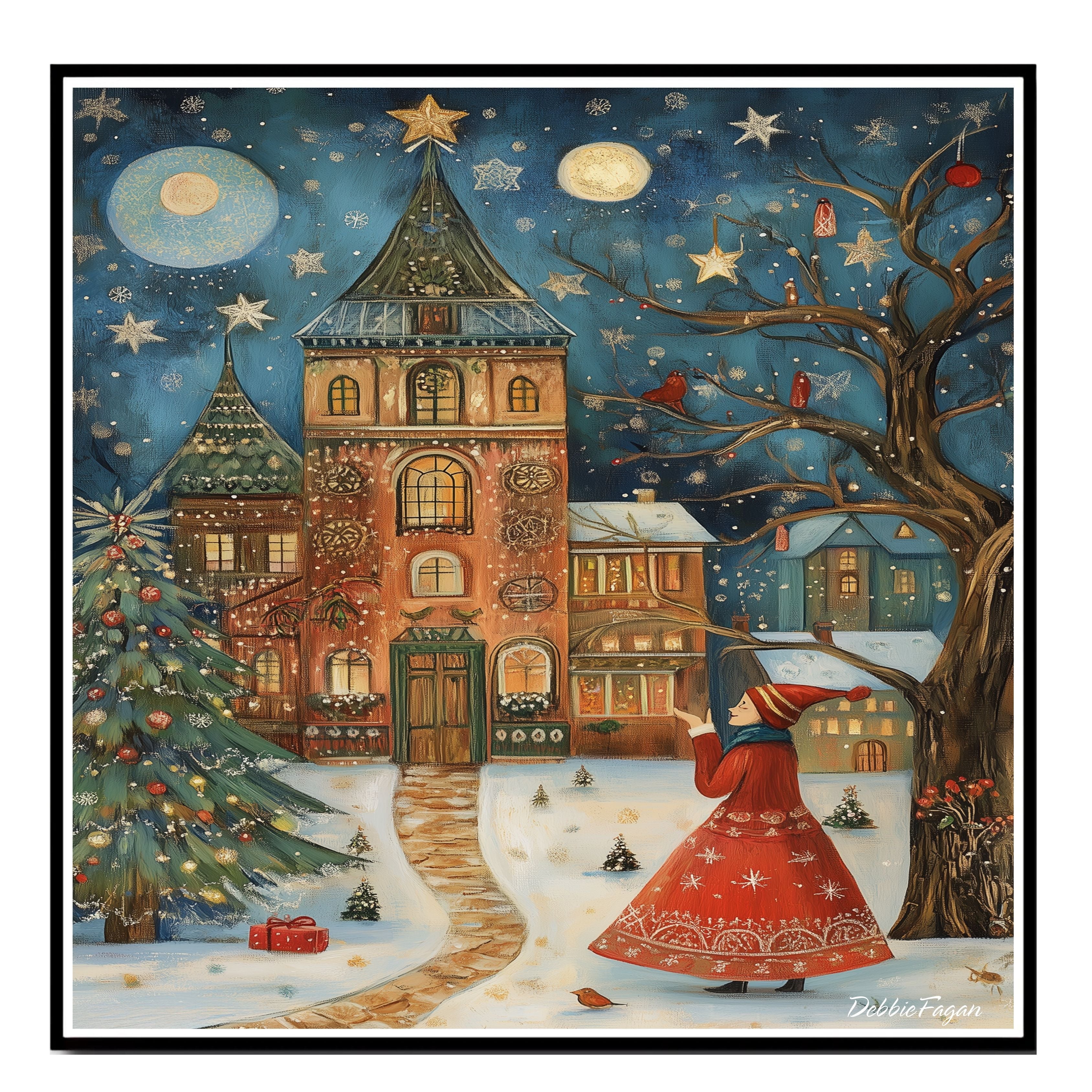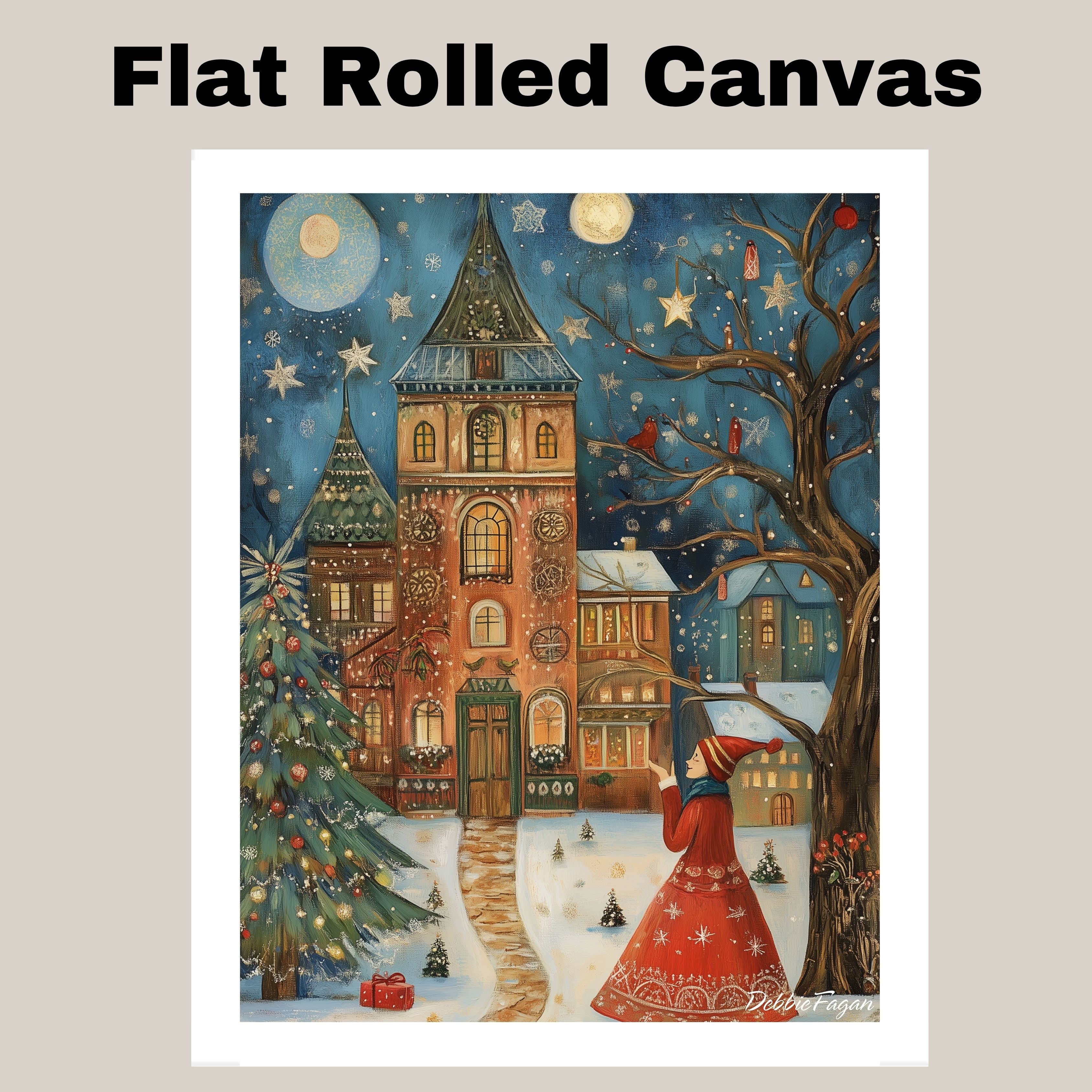 Starry Christmas Night – Folk Art Girl and Village in Snow on Ready to Hang 1.5" Thick Canvas Wrap, Floating Framed Canvas, Flat Rolled Canvas