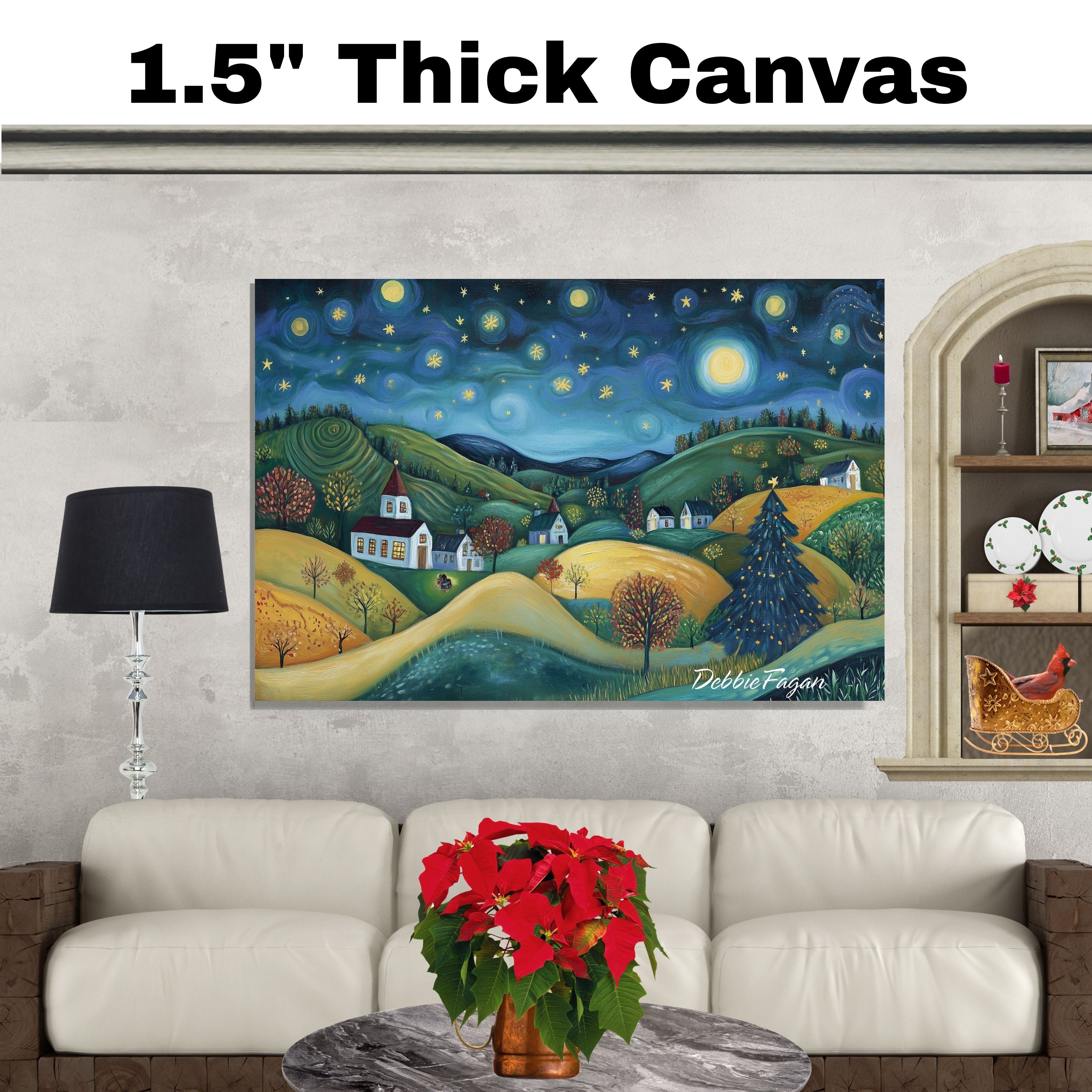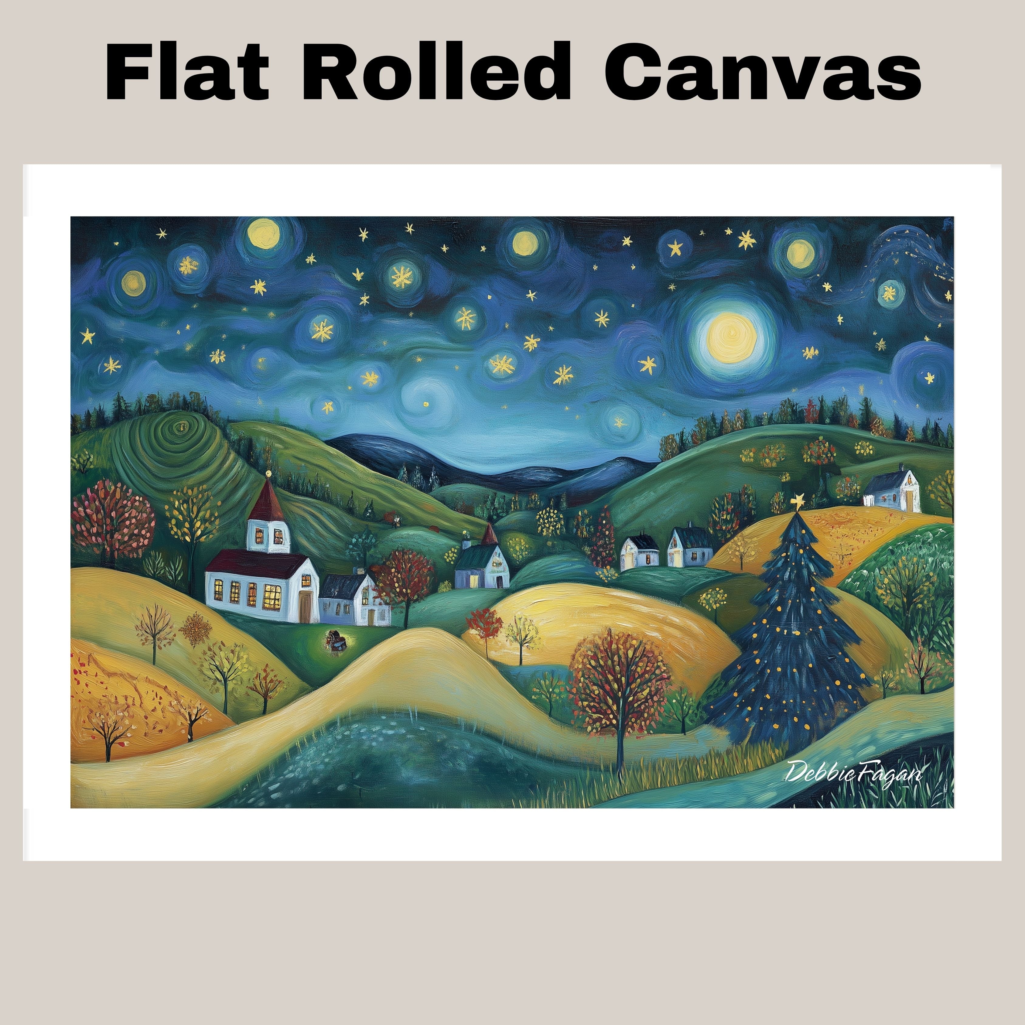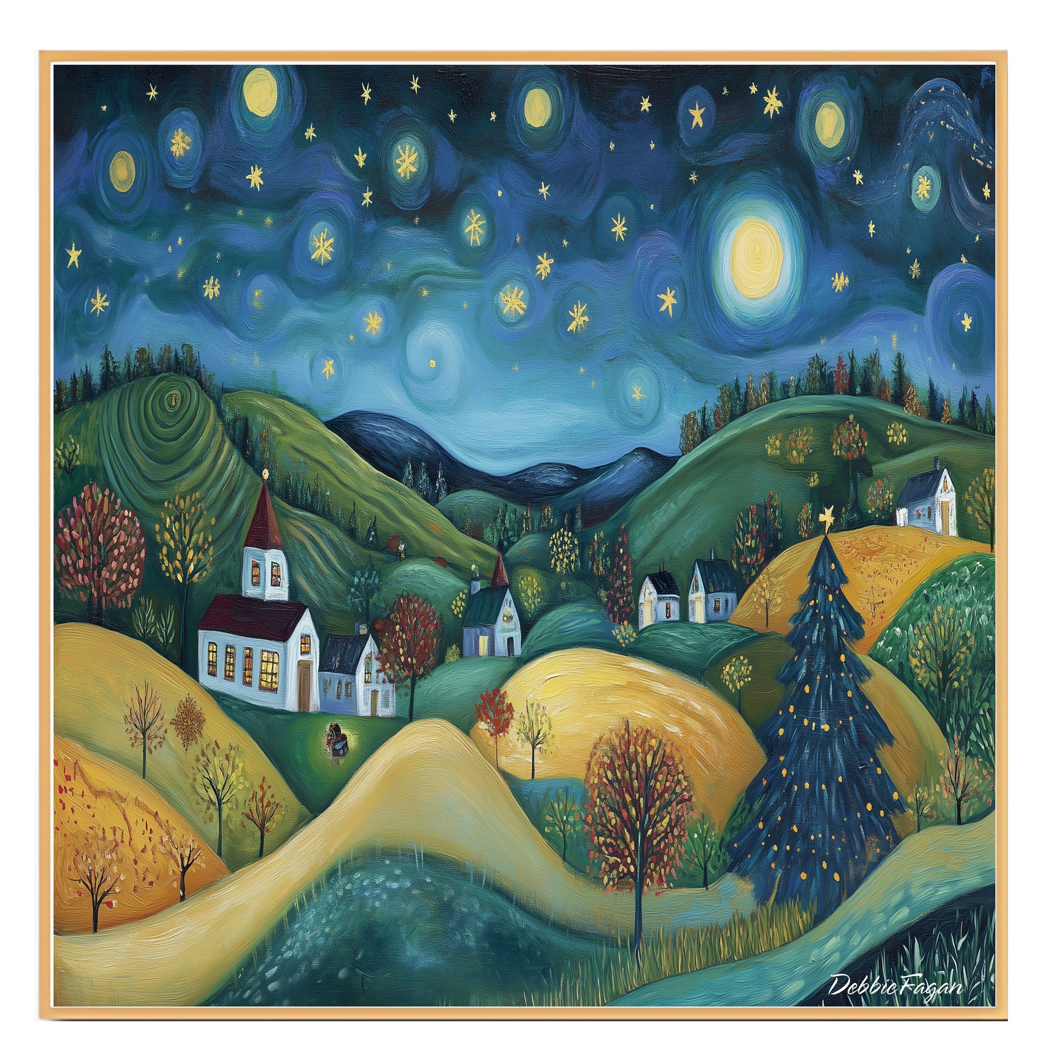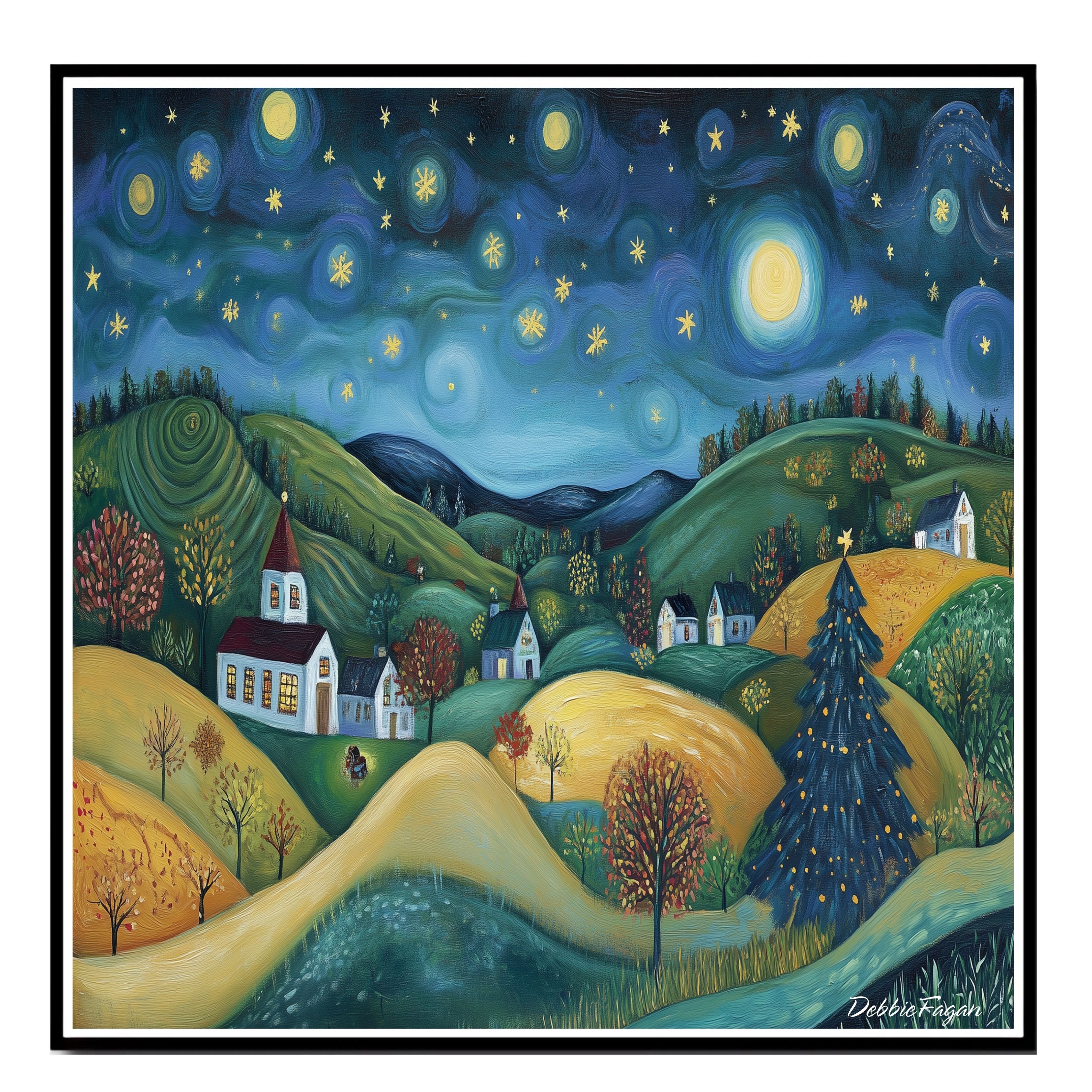 This dreamy folk art painting captures a peaceful Christmas village under a swirling star-filled night sky. Rolling hills, glowing homes, and a decorated tree evoke warmth and serenity. The Van Gogh-inspired stars add a magical touch to this festive countryside scene, perfect for holiday charm and nostalgic joy.