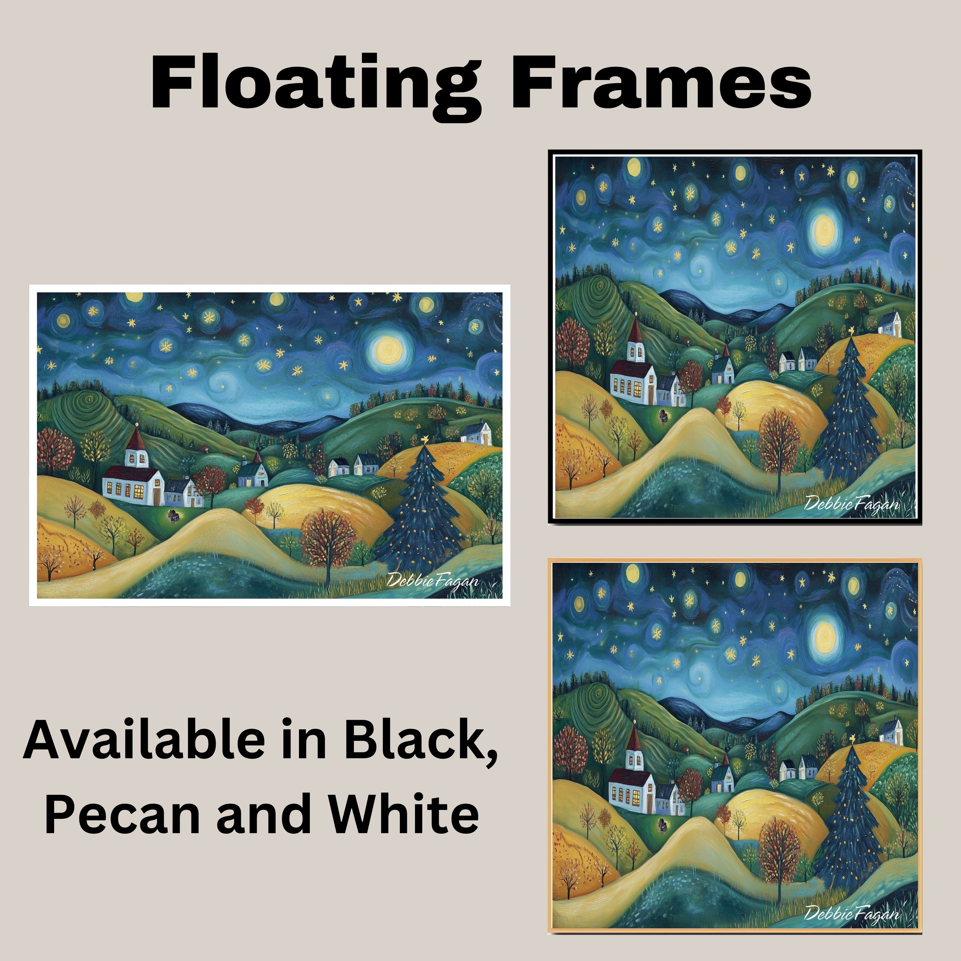 1.5" Thick Floating Framed Canvas: Available in Black, Pecan, and White Grain. Durable shrink-resistant frame. Comes with easy-to-install hanging kits, ready for immediate display.