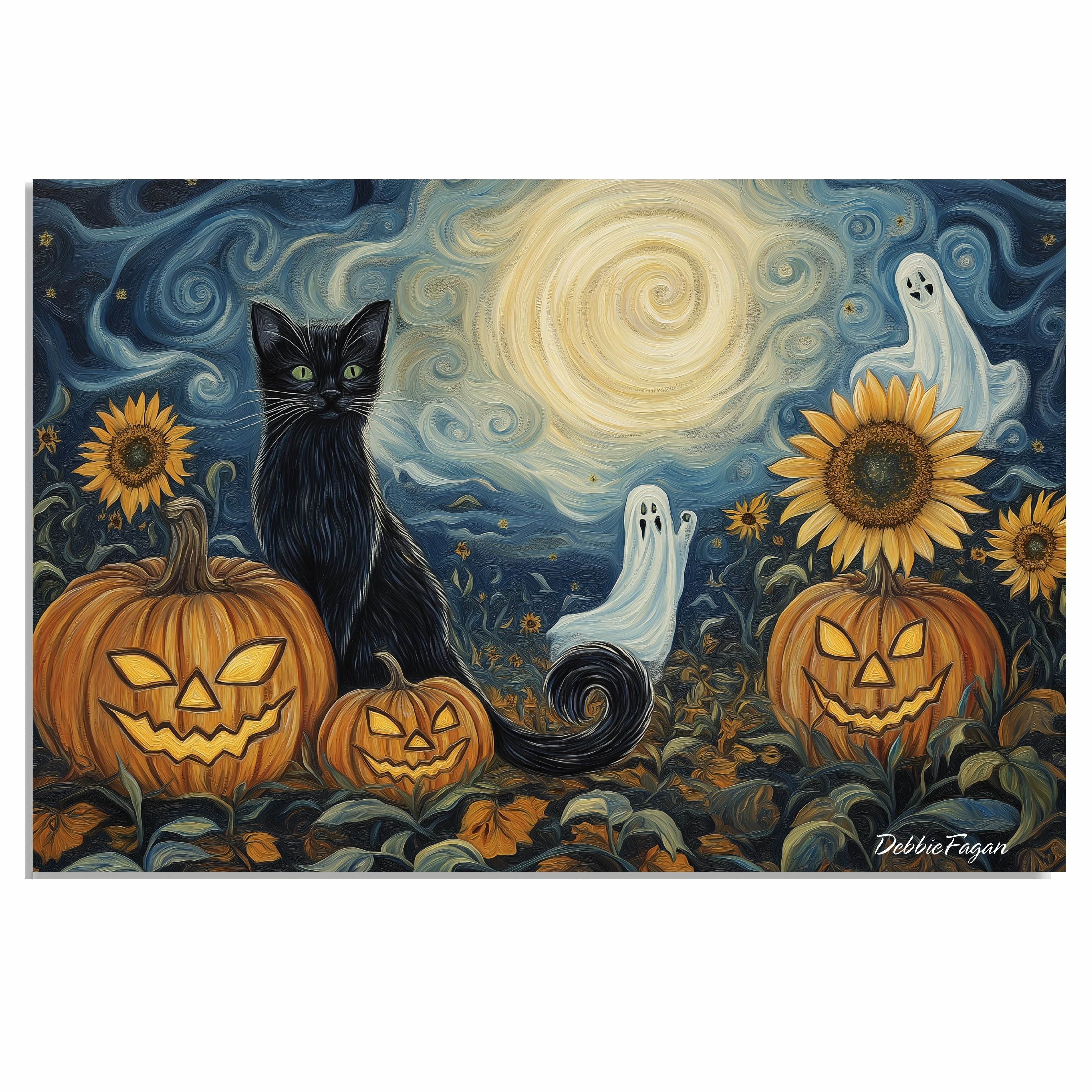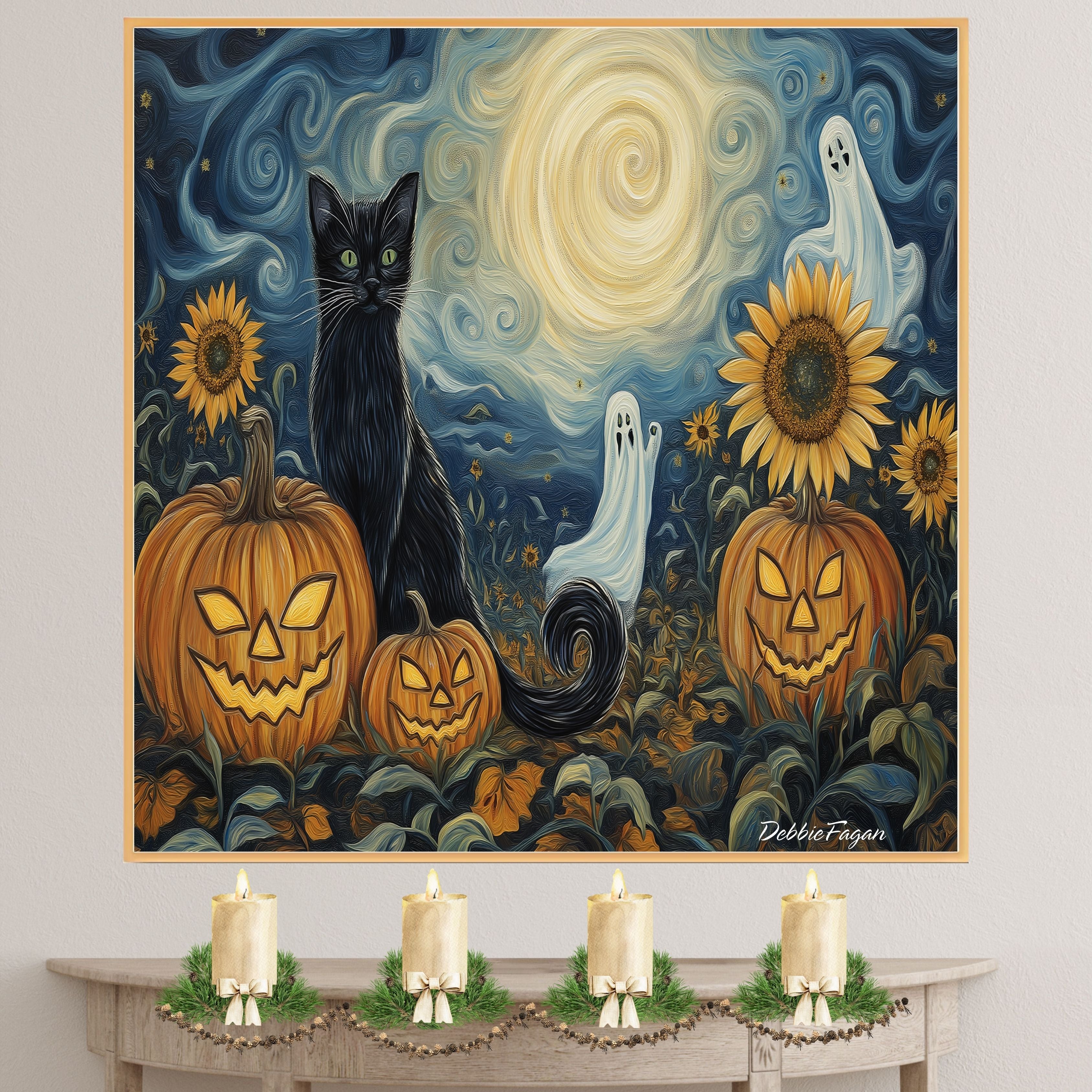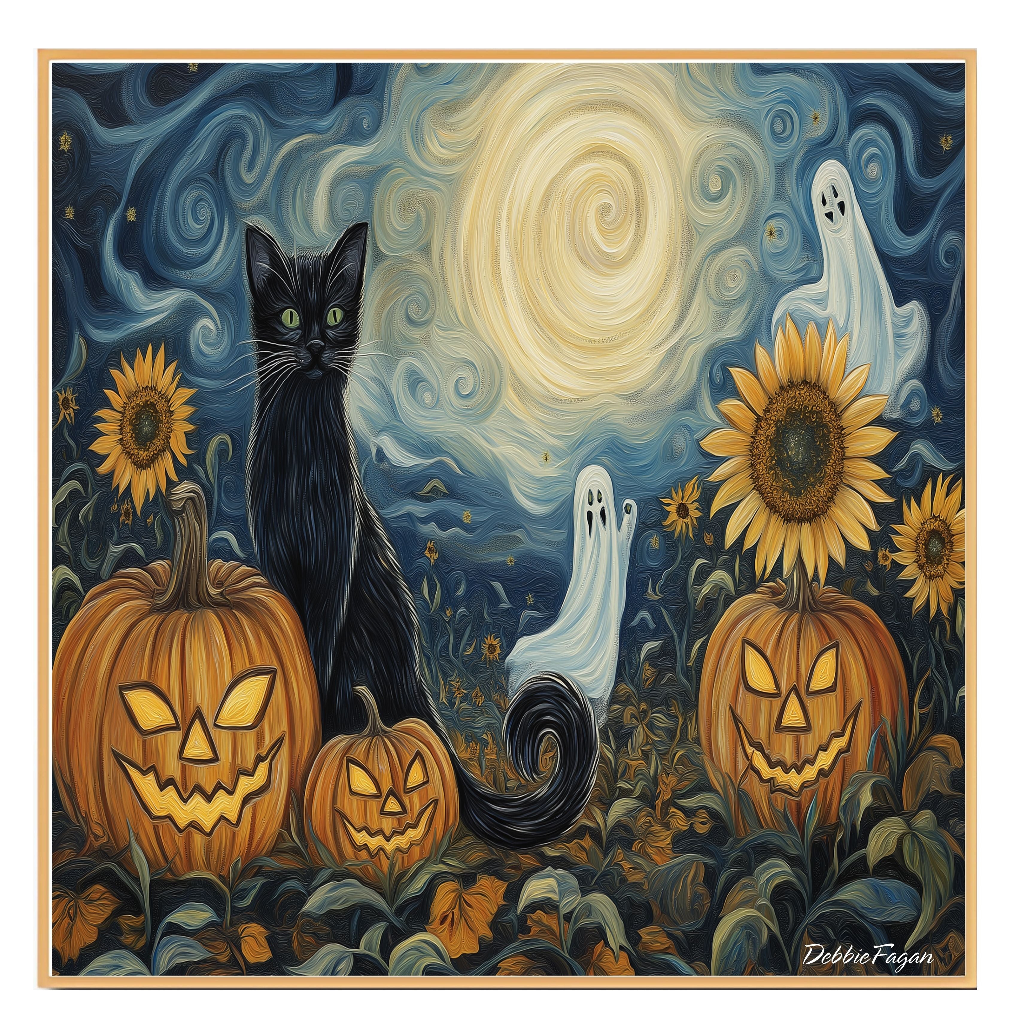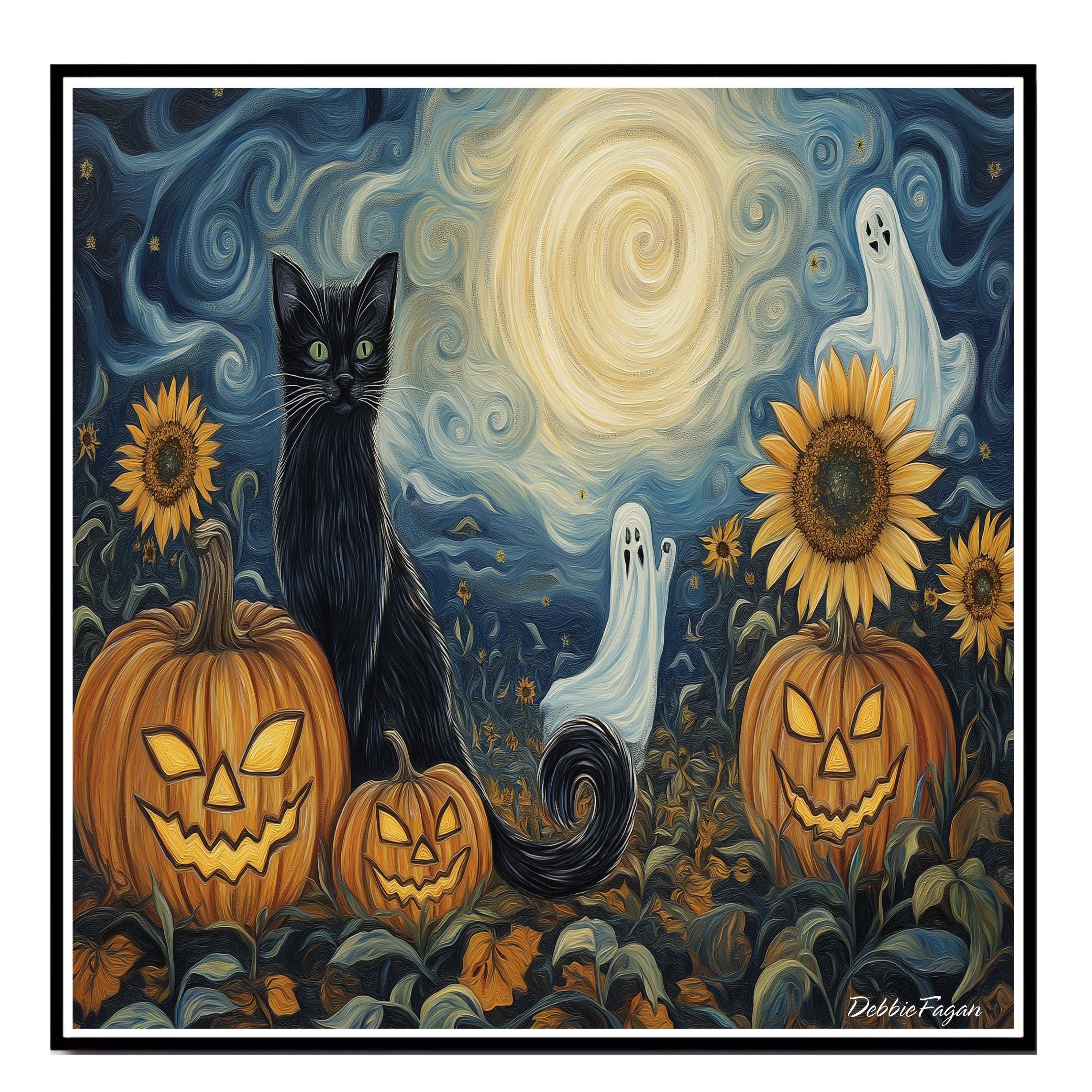 A whimsical Halloween scene featuring a black cat, jack-o'-lantern, sunflowers, and friendly ghosts under swirling Van Gogh-inspired...