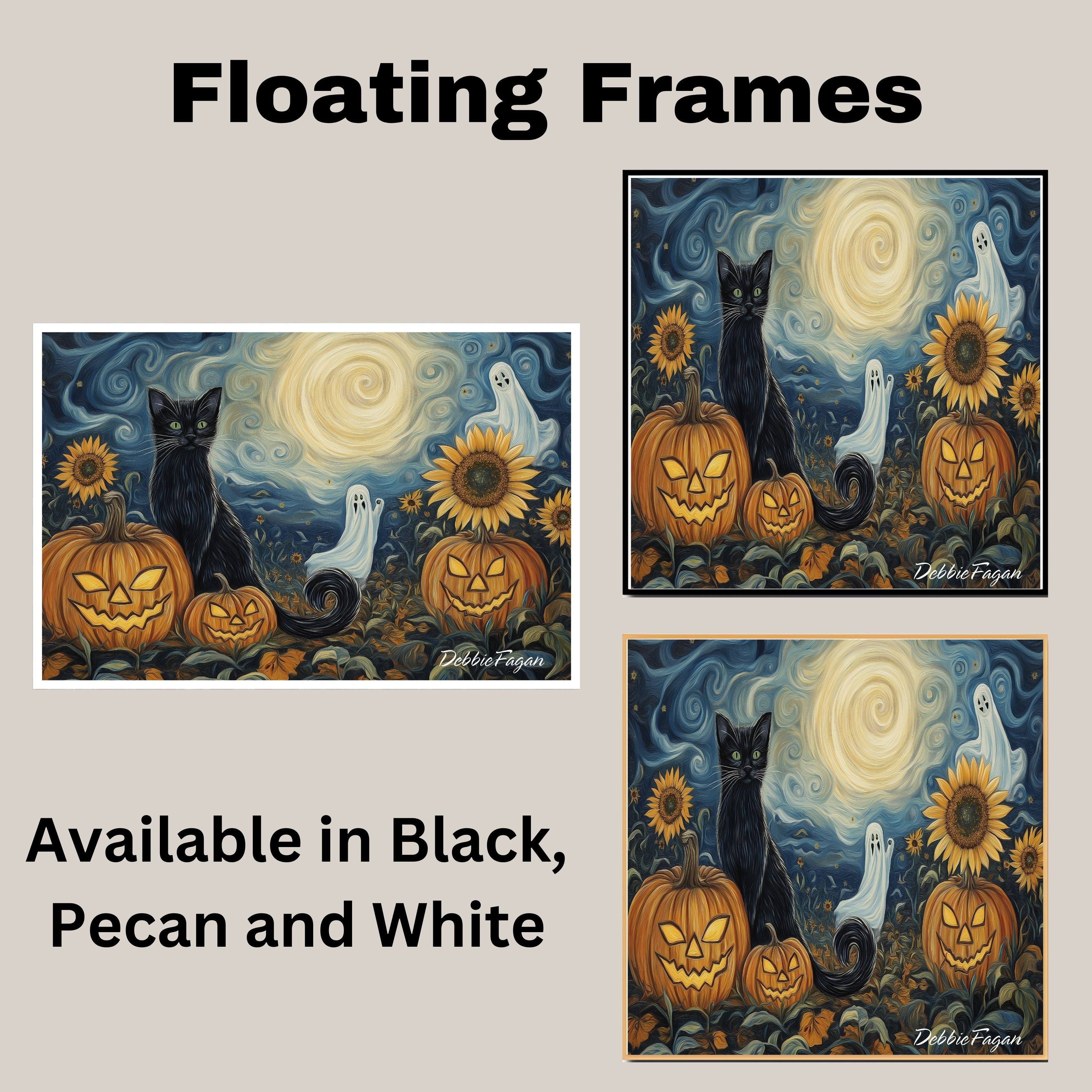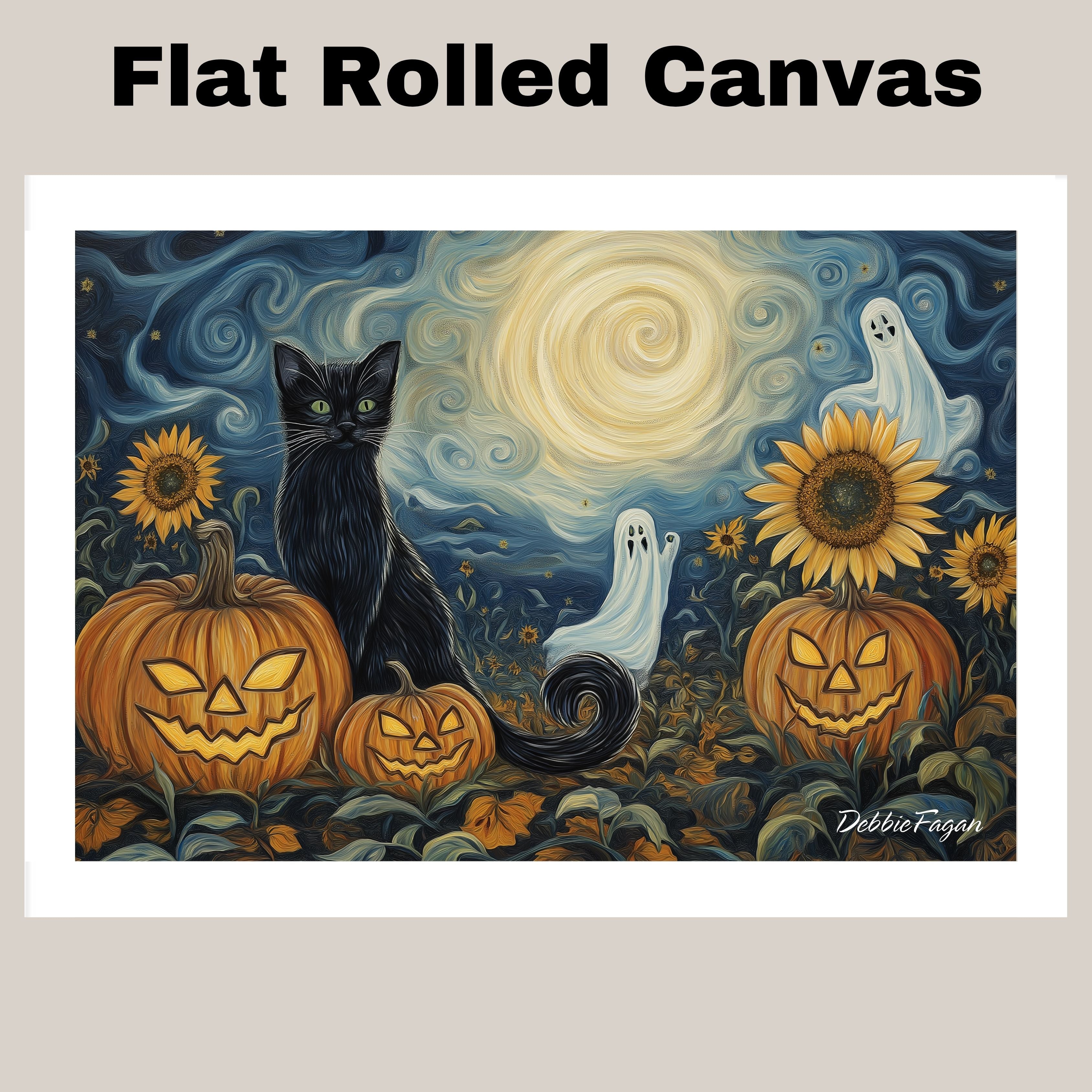 Starry Halloween Night – Black Cat, Pumpkin, and Ghosts Wall Art in Van Gogh Style on Ready to Hang 1.5" Thick Canvas Wrap, Floating Framed Canvas, Flat Rolled Canvas