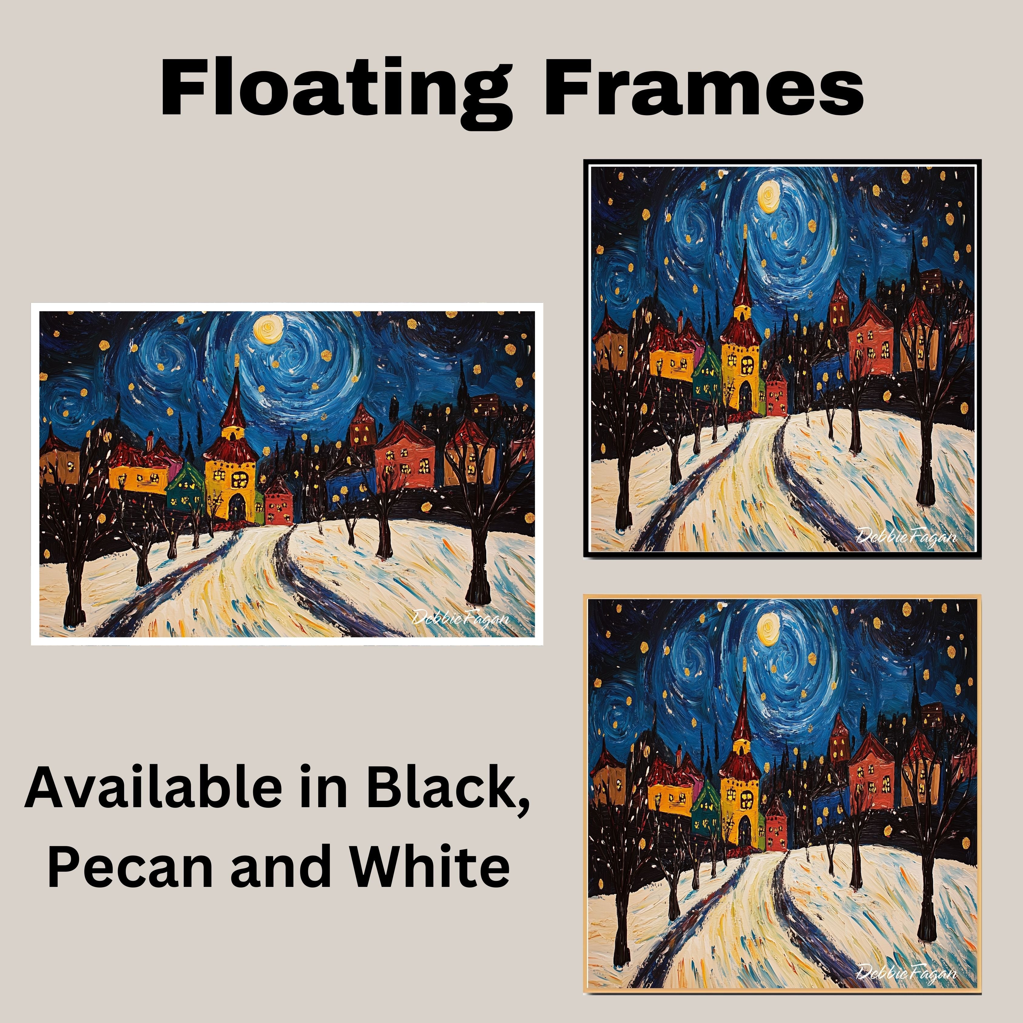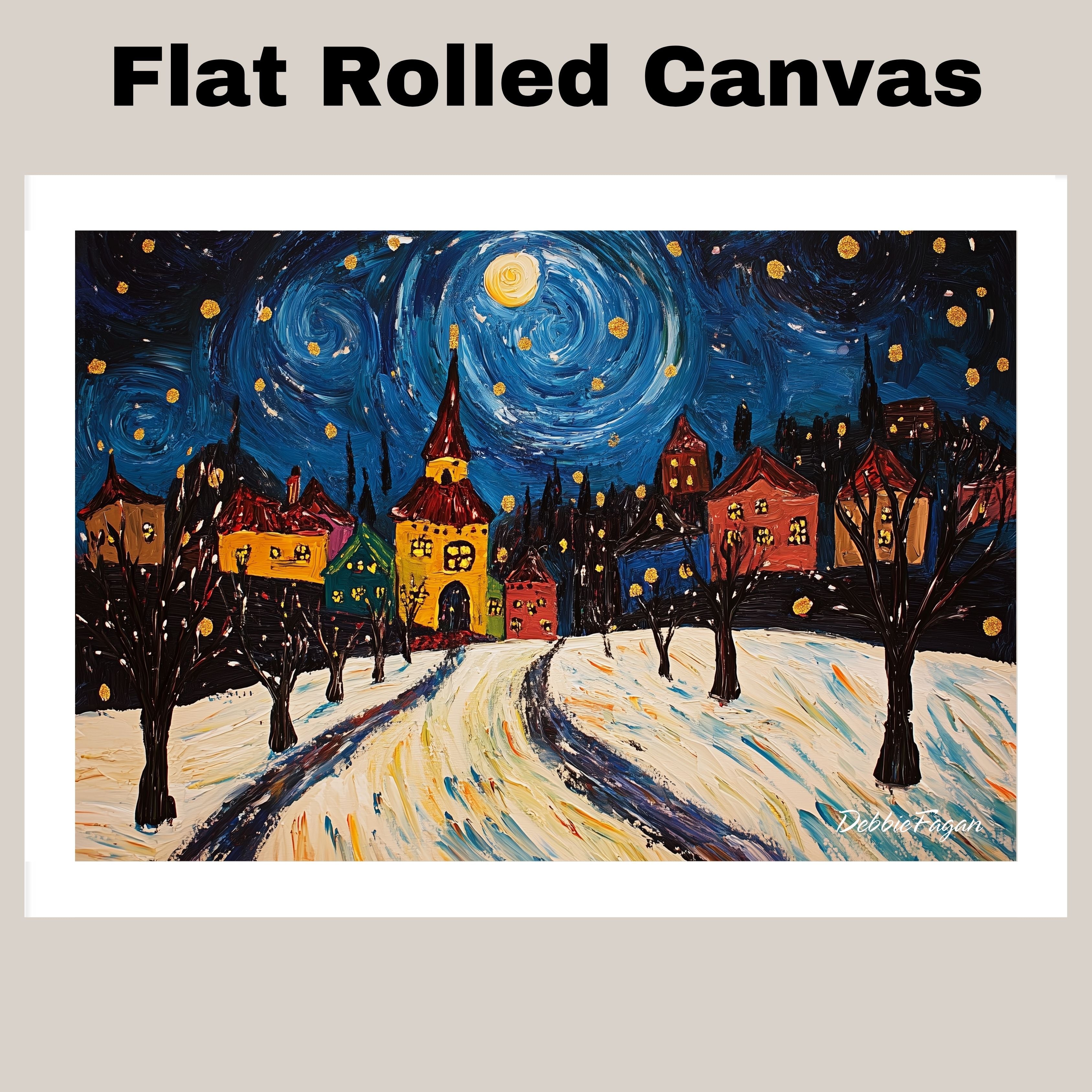 Starry Night Village Scene in Van Gogh Style – Whimsical Folk Art of Snowy Streets and Colorful Holiday Homes on Ready to Hang 1.5" Thick Canvas Wrap, Floating Framed Canvas, Flat Rolled Canvas