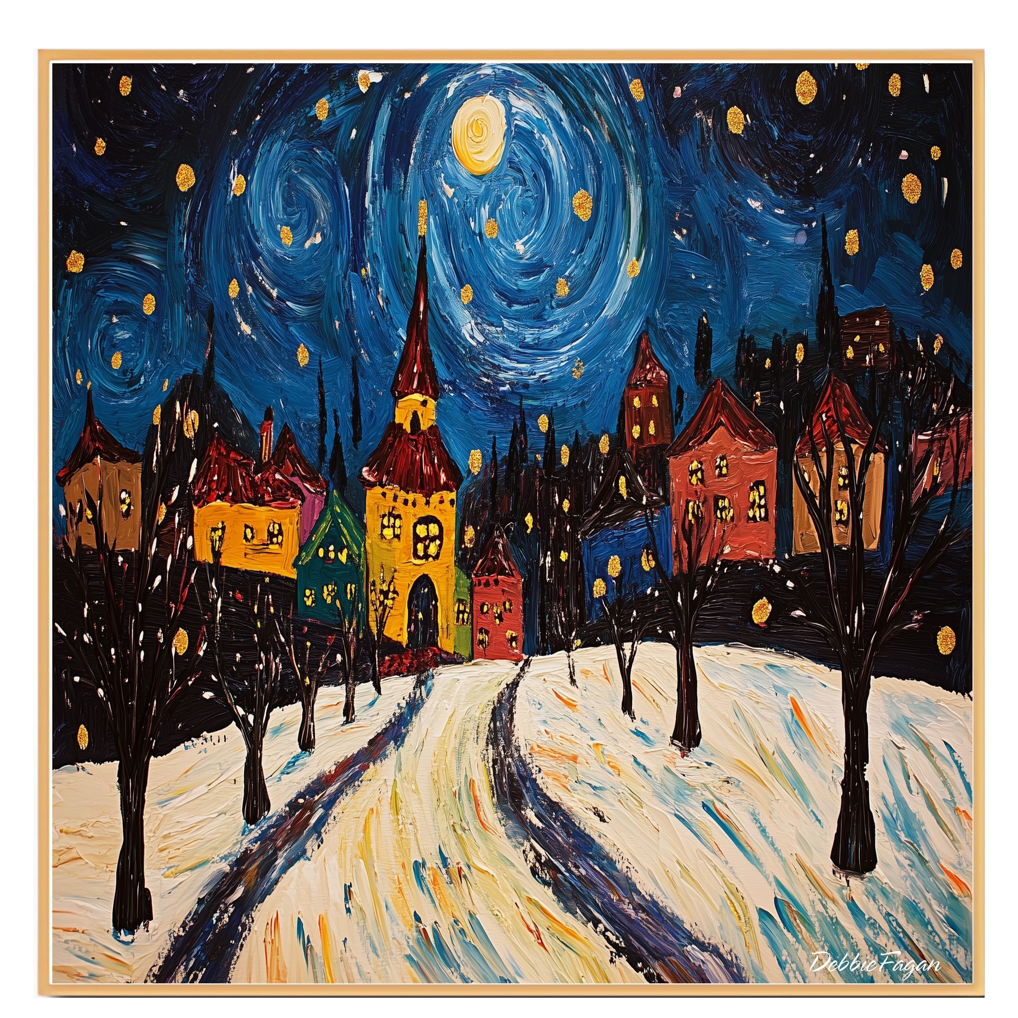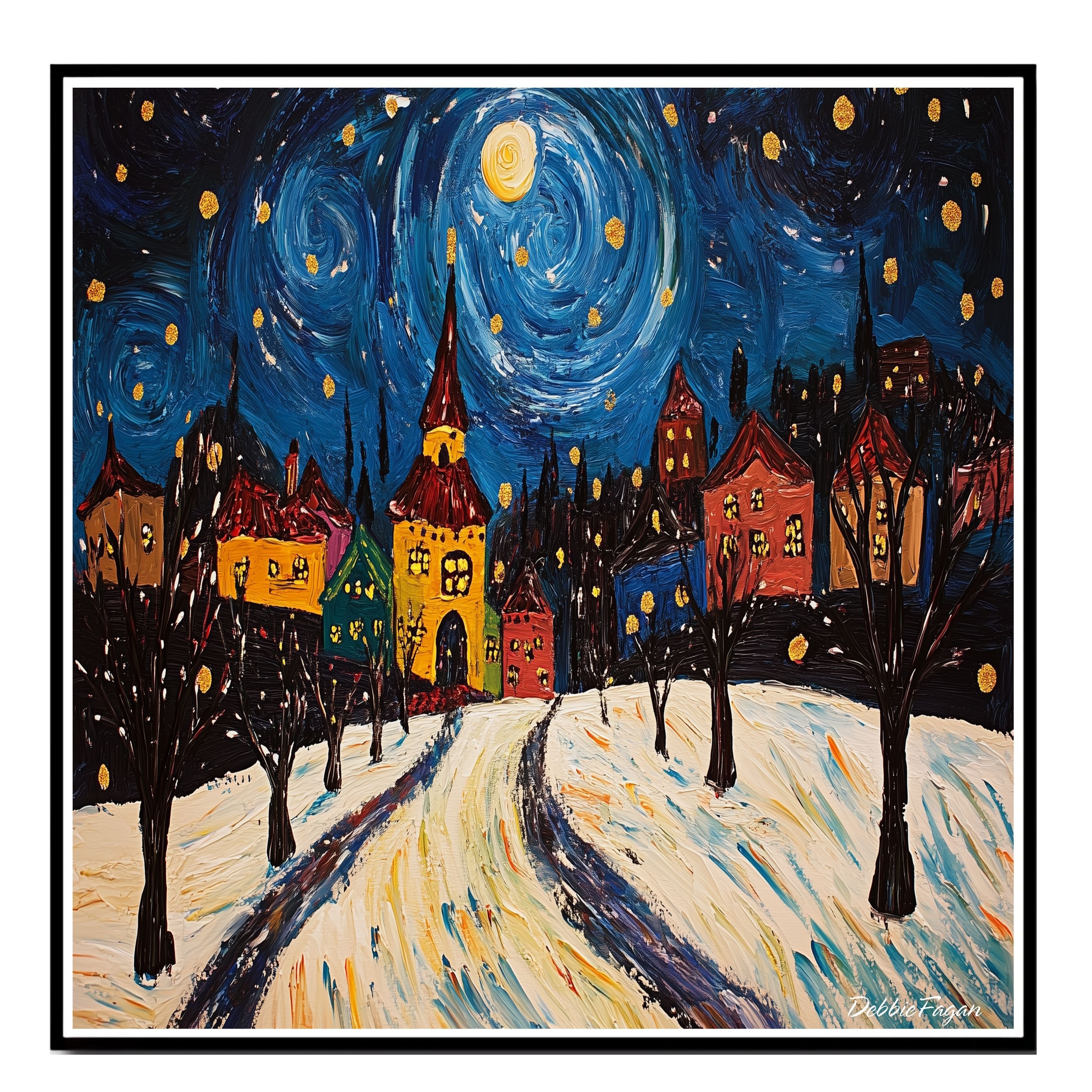 A magical winter village painted in the swirling, star-filled style of Van Gogh, with colorful buildings glowing...