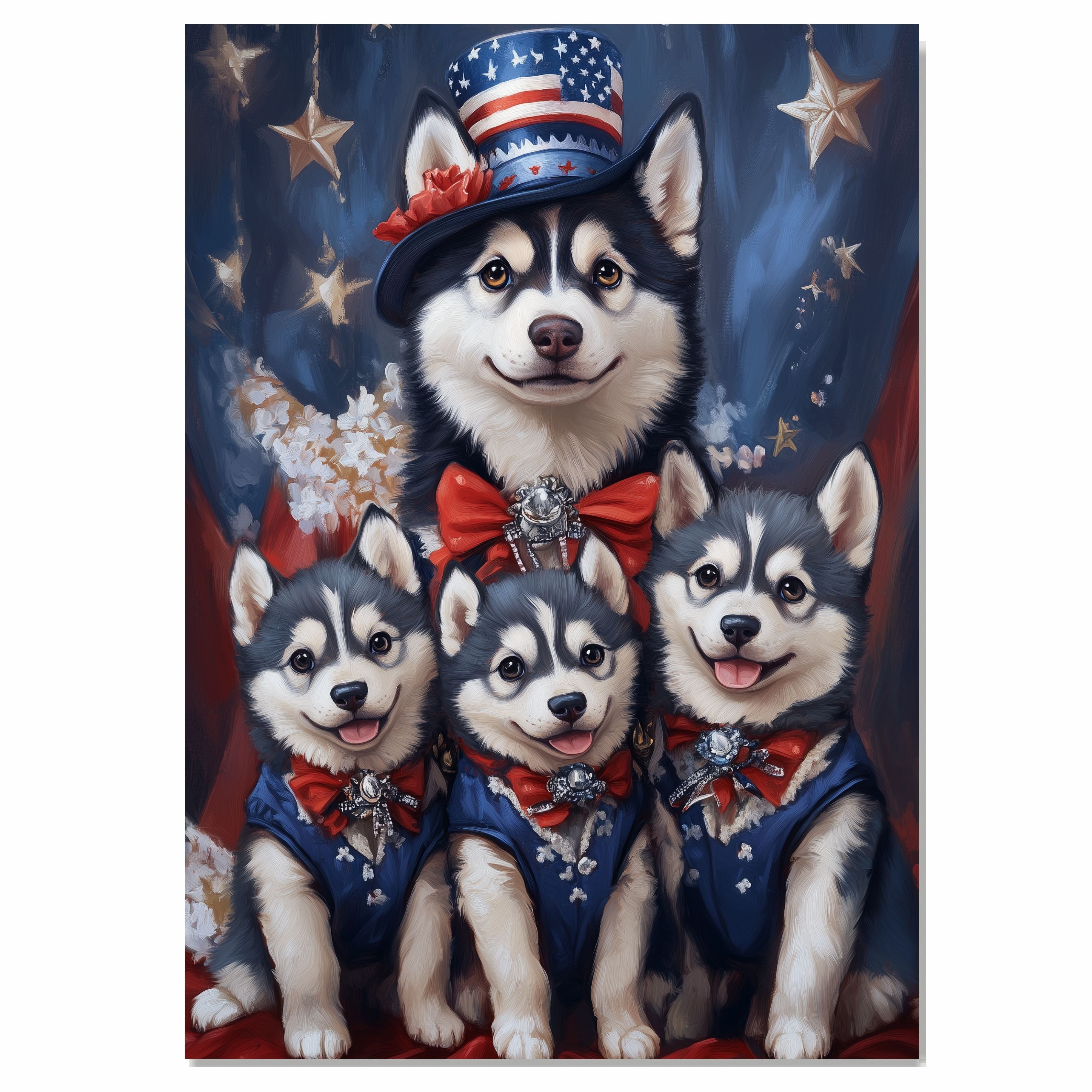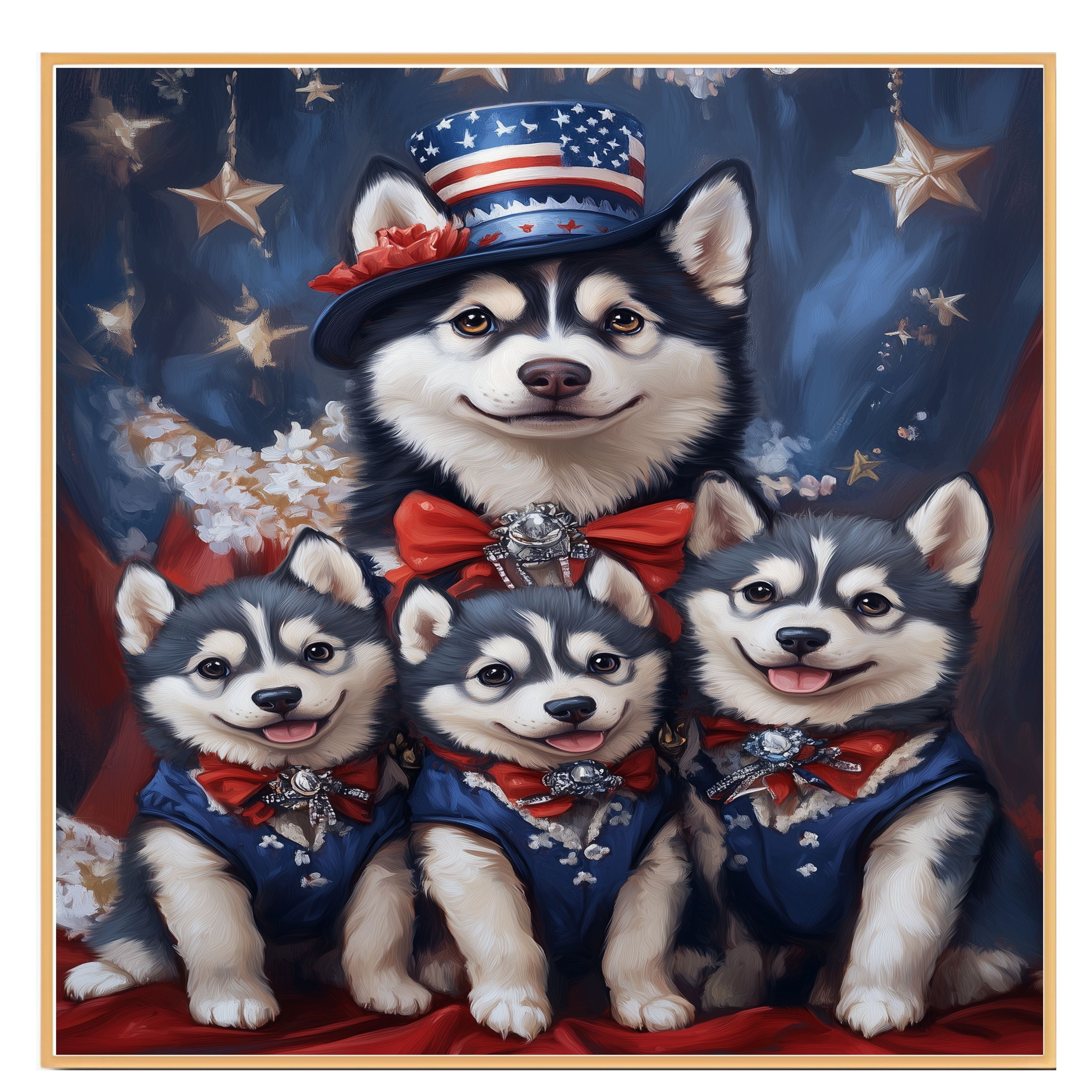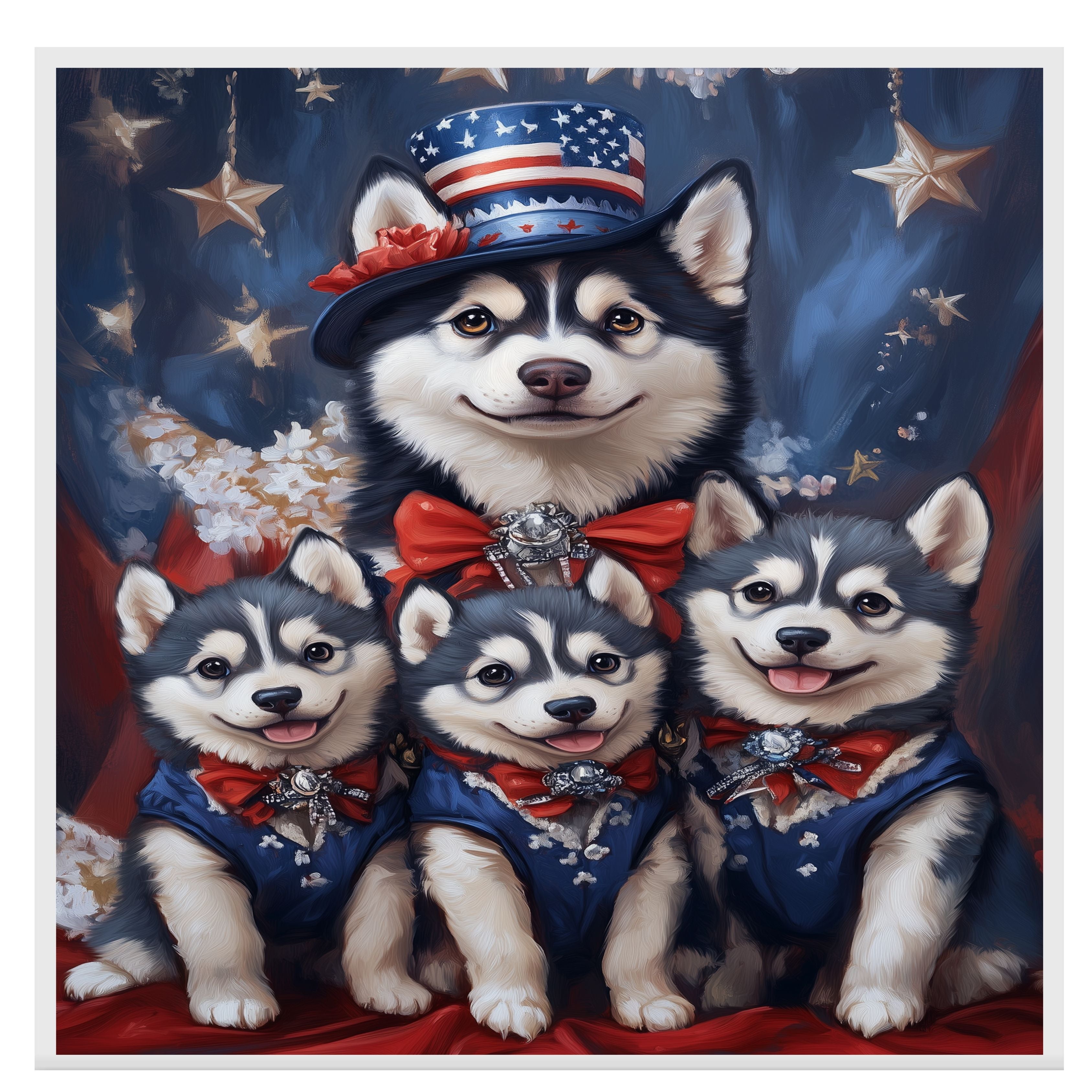Stars & Paws: Siberian Husky Mom with Three Puppies in a Patriotic Scene - Heartfelt American-Themed Painting on Ready to Hang 1.5" Thick Canvas Wrap, Floating Framed Canvas, Flat Rolled Canvas