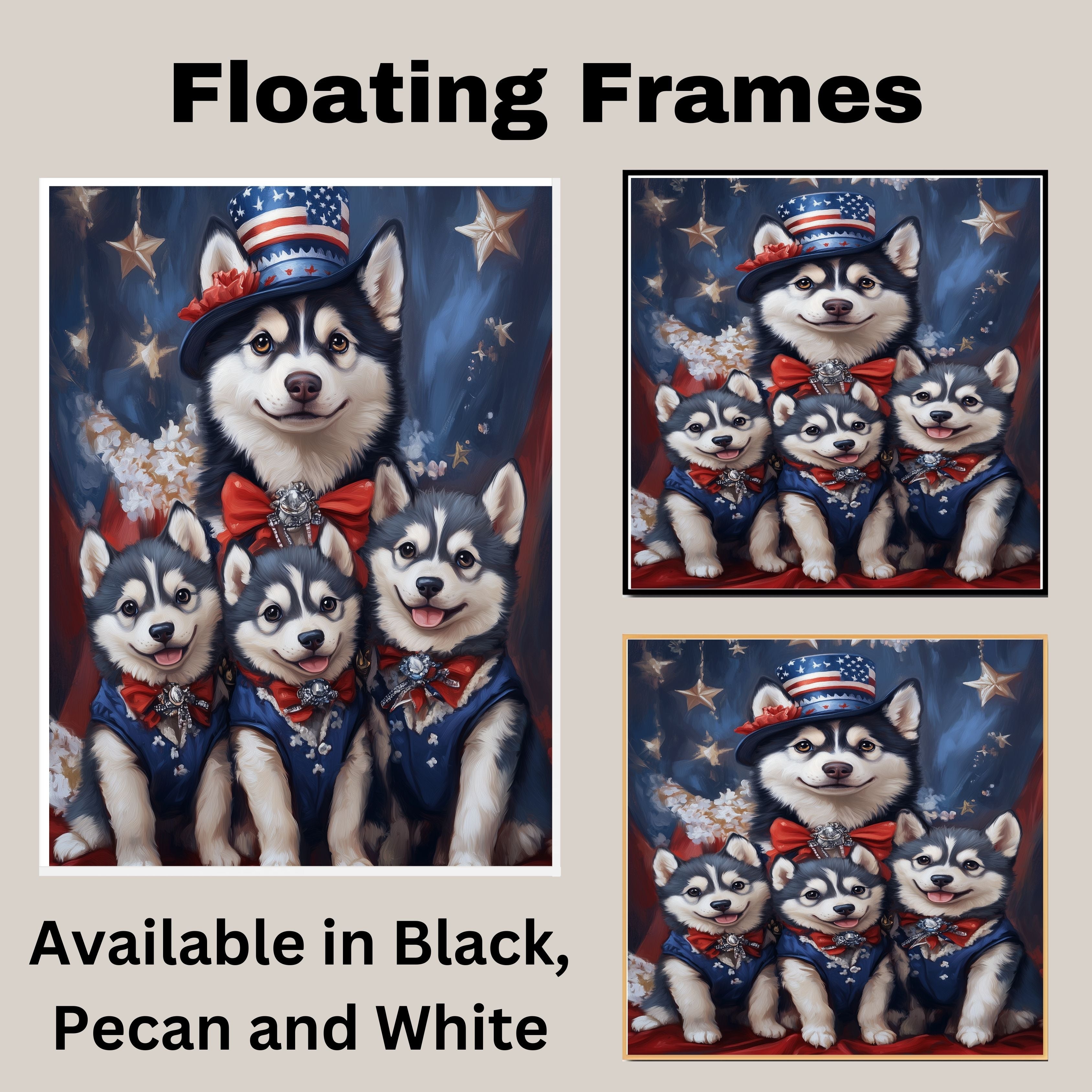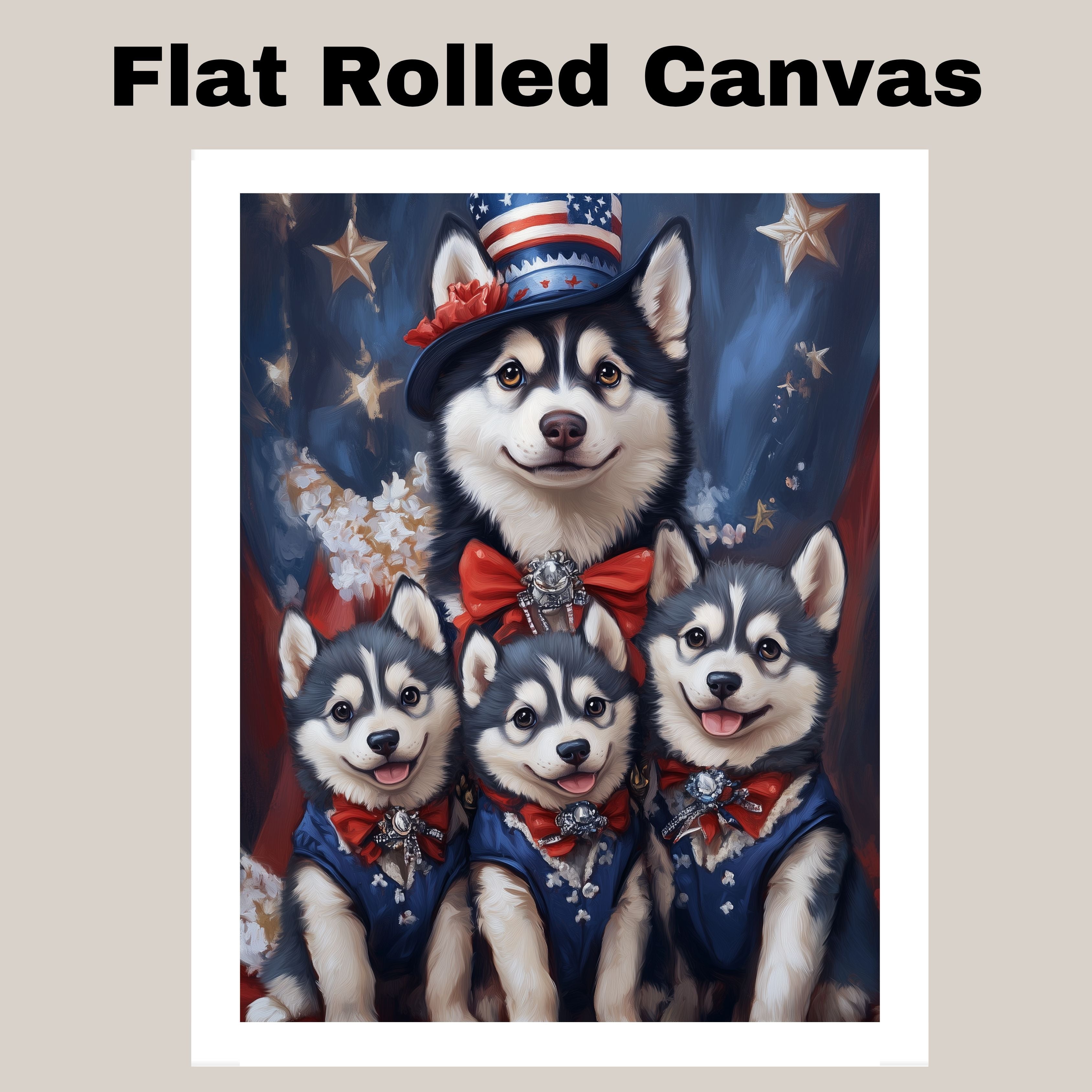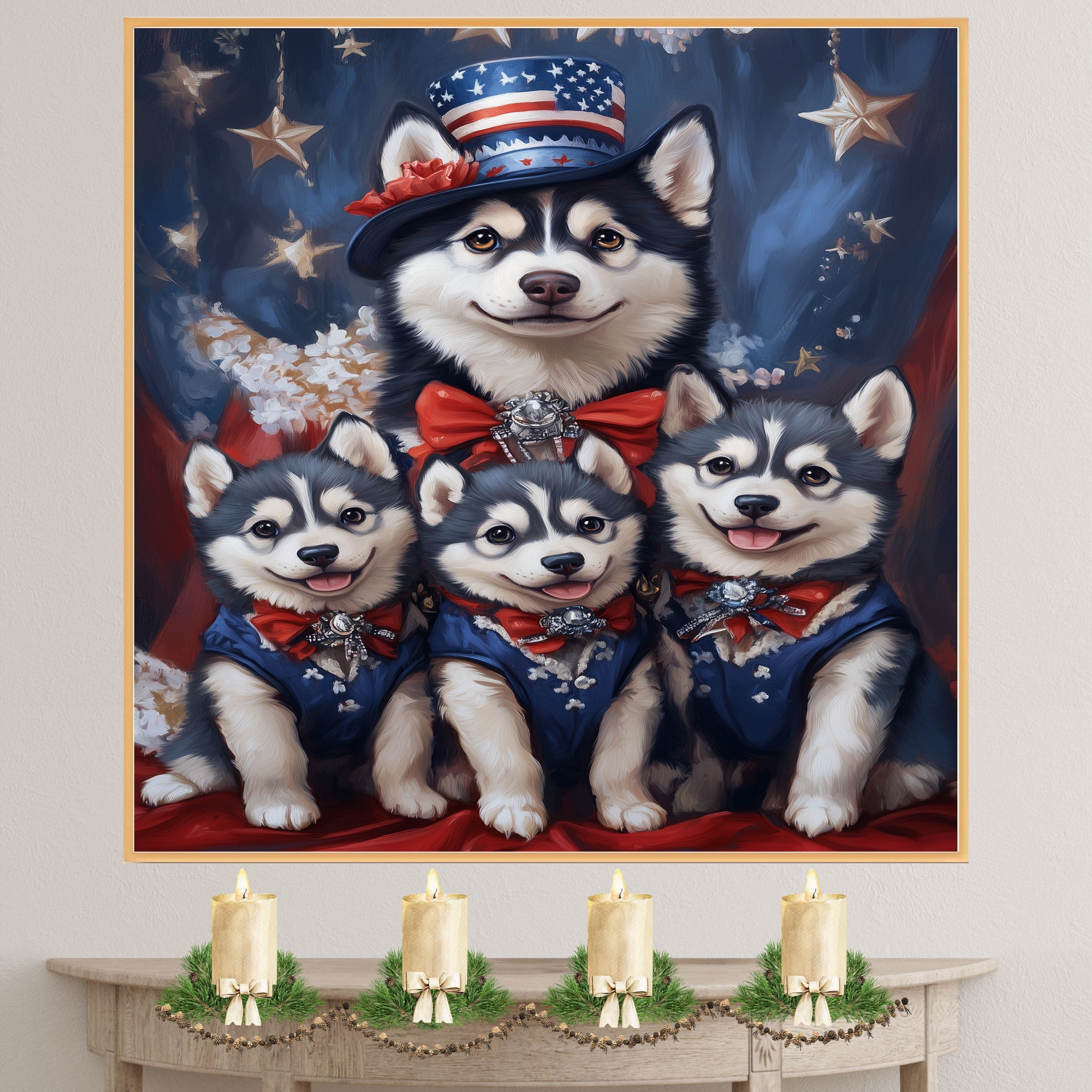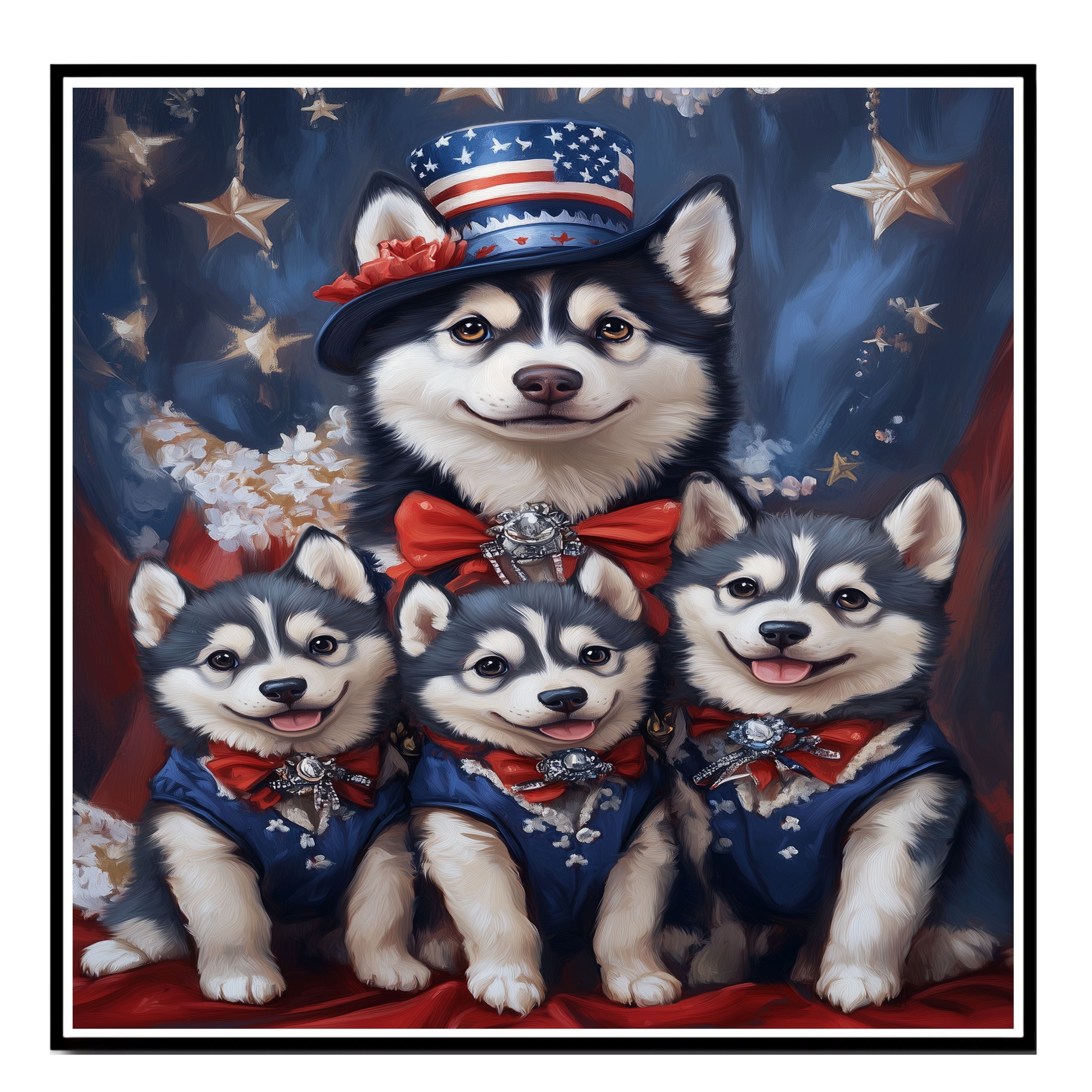 Stars & Paws: Siberian Husky Mom with Three Puppies in a Patriotic Scene - Heartfelt American-Themed Painting on Ready to Hang 1.5" Thick Canvas Wrap, Floating Framed Canvas, Flat Rolled Canvas