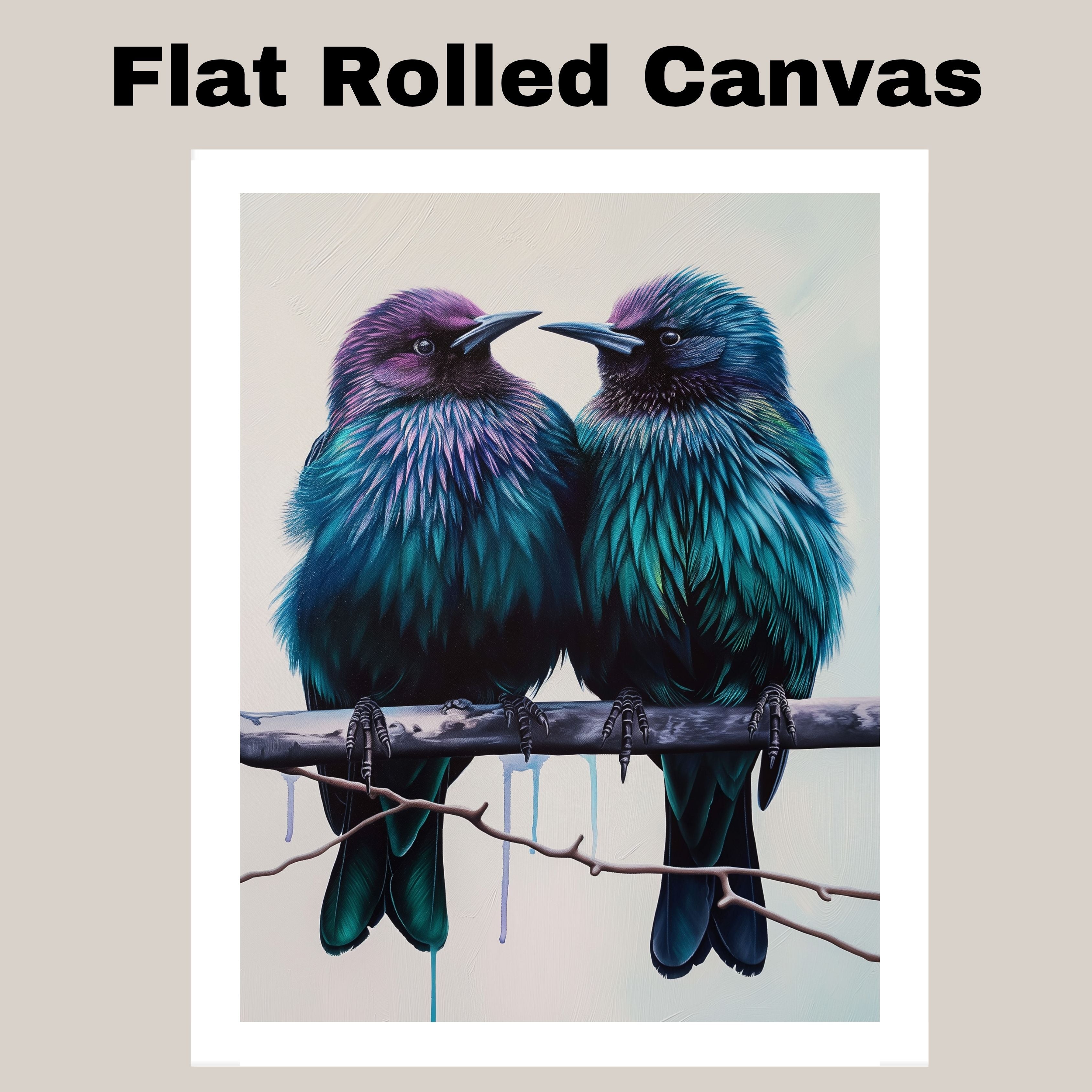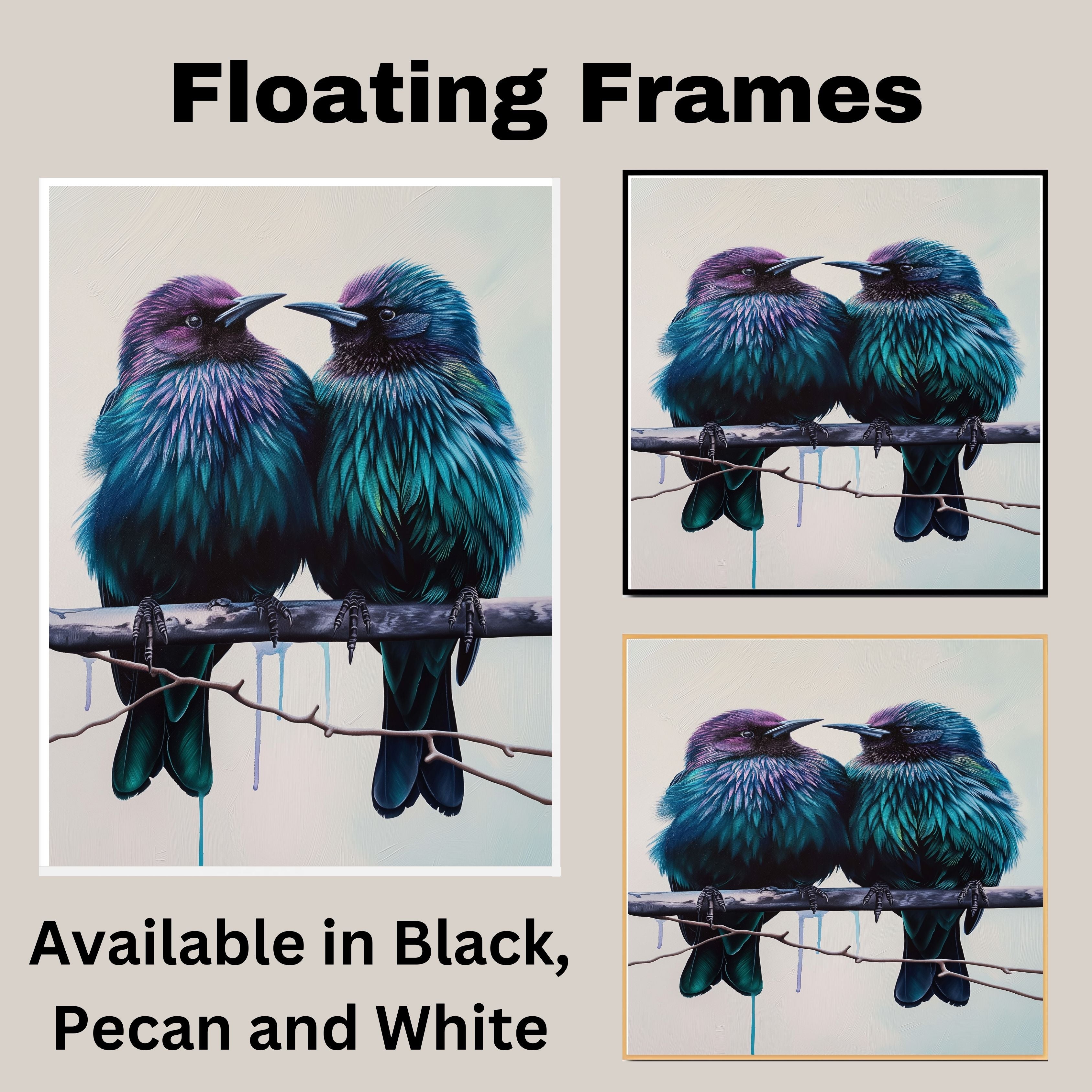 Striking Bird Pair Artwork Featuring Iridescent Teal and Purple Feathers on a Perch with Minimalist Light Background and Subtle Dripping Paint Detail on Ready to Hang 1.5" Thick Canvas Wrap, Floating Framed Canvas, Flat Rolled Canvas