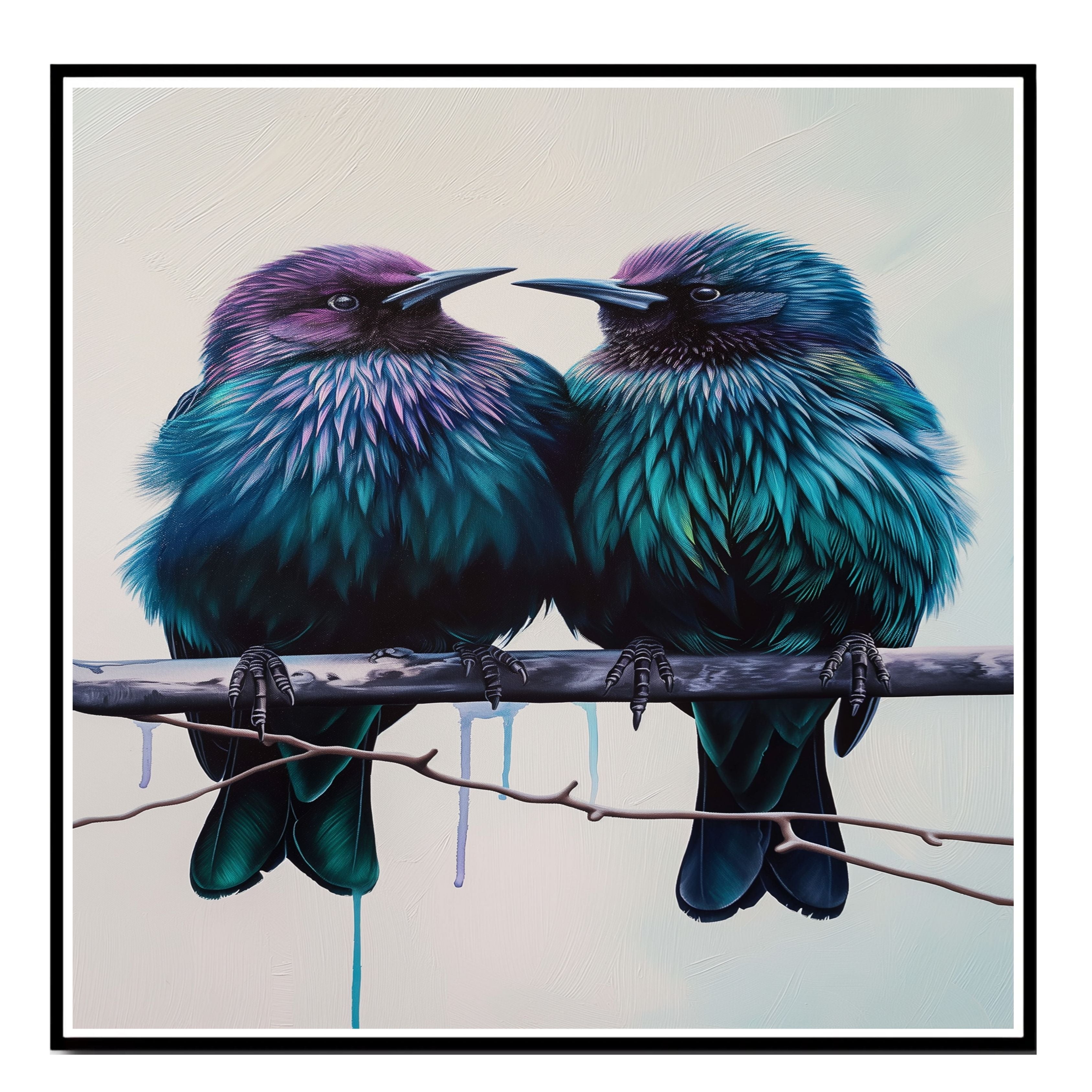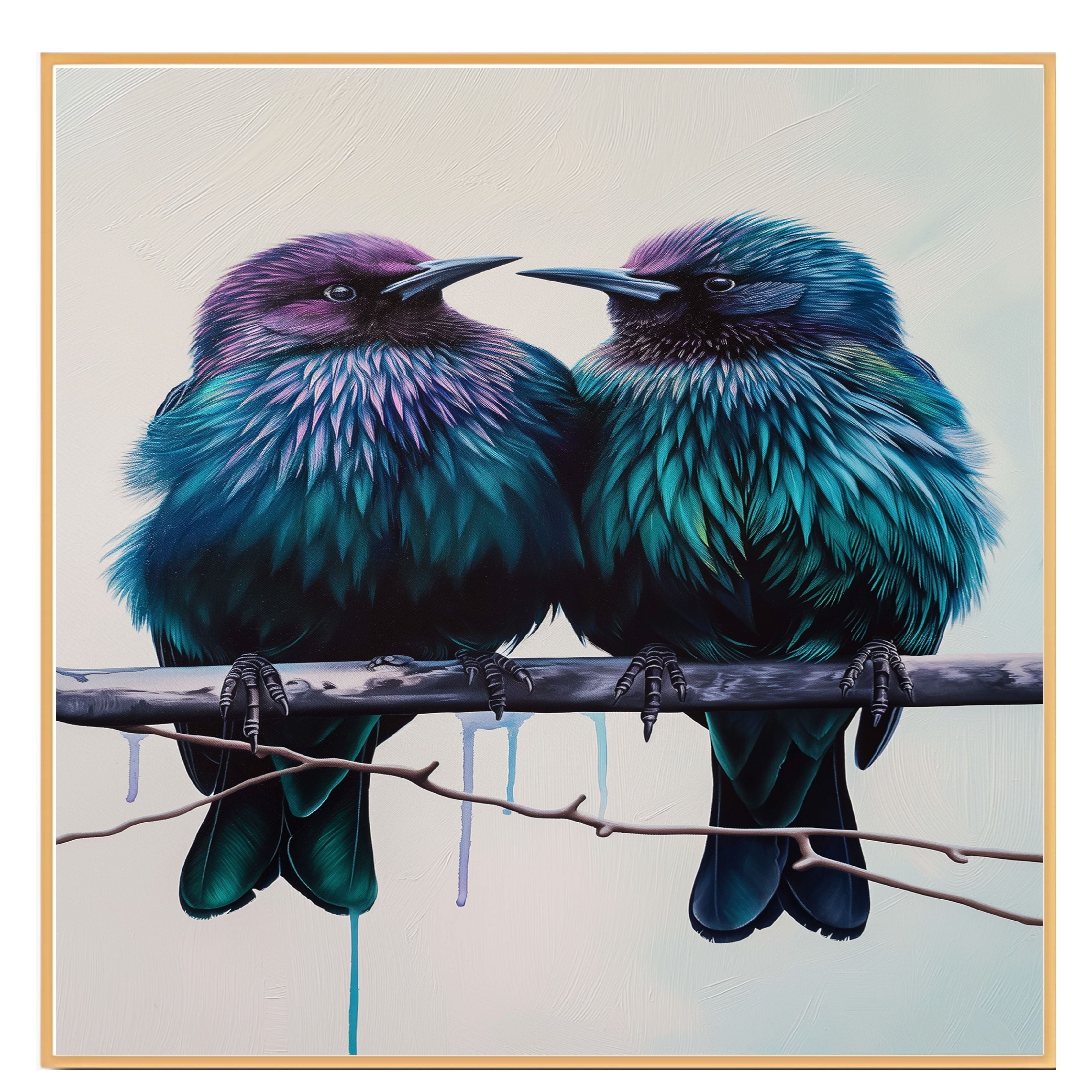 This mesmerizing artwork showcases a pair of birds adorned in shimmering teal and violet plumage, perched closely on a branch. Set against a minimalist pale backdrop with delicate dripping paint details, the piece offers a modern blend of elegance, intimacy, and style for bird and art lovers.