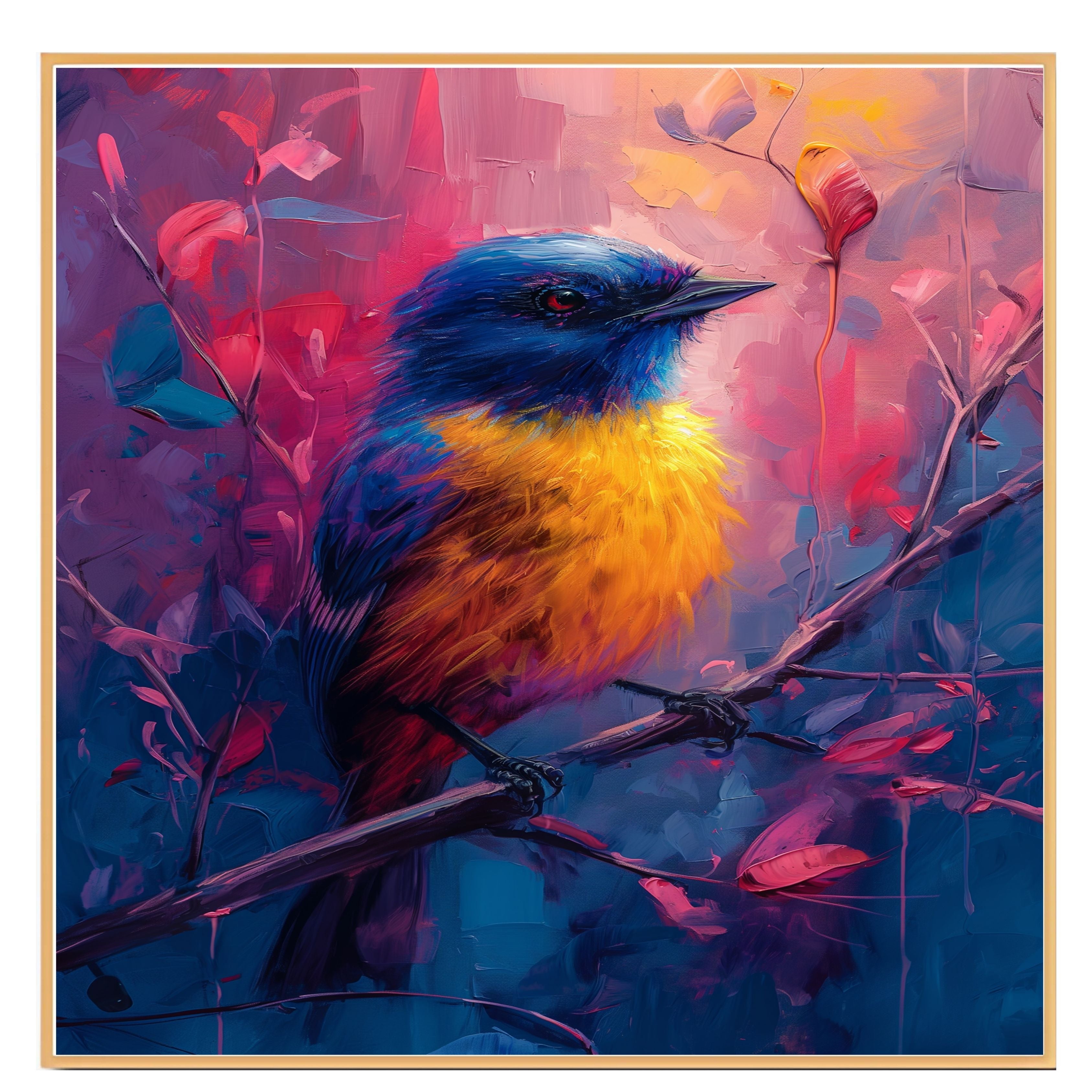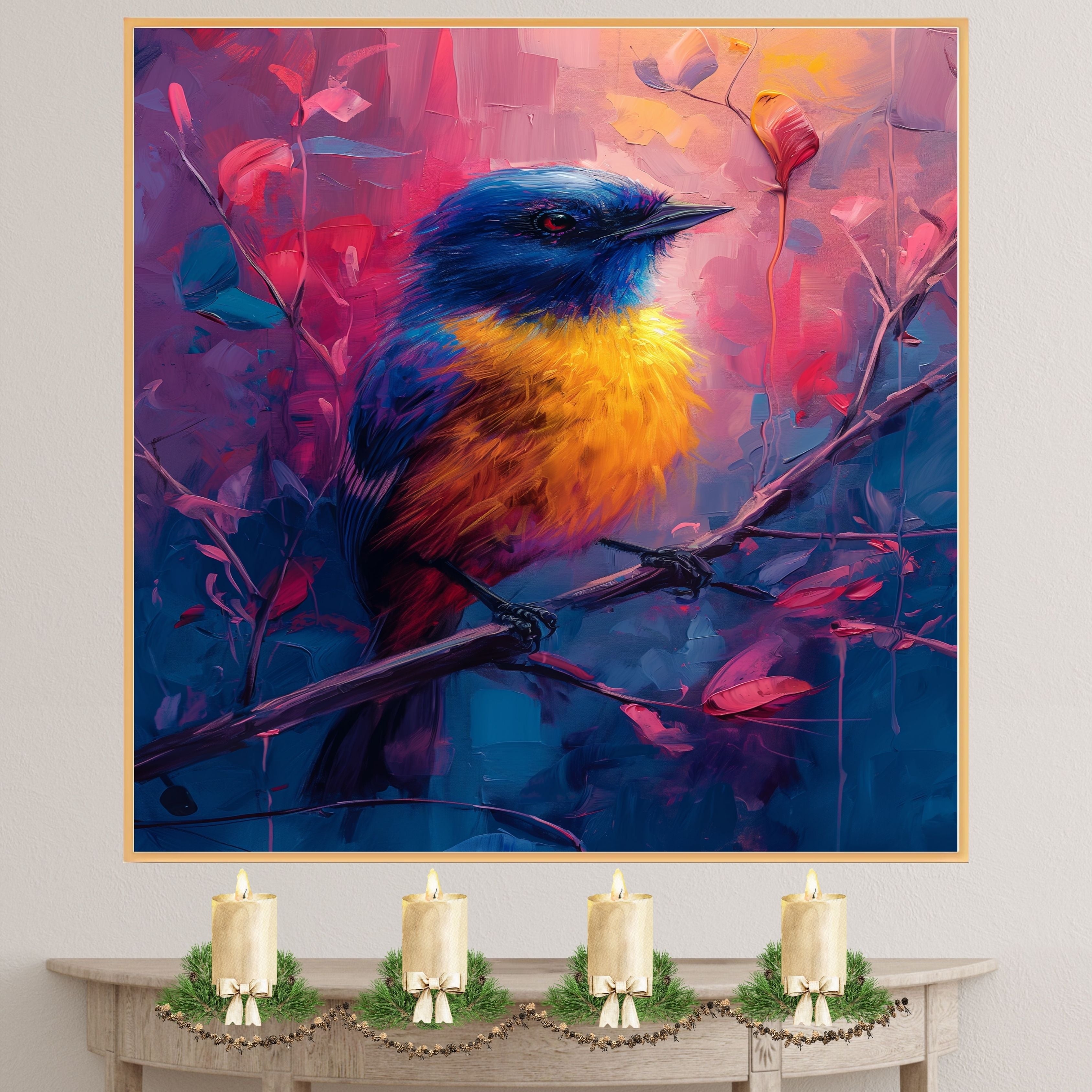Striking Yellow and Blue Bird on Branch with Deep Red and Purple Abstract Background on Ready to Hang 1.5" Thick Canvas Wrap, Floating Framed Canvas, Flat Rolled Canvas