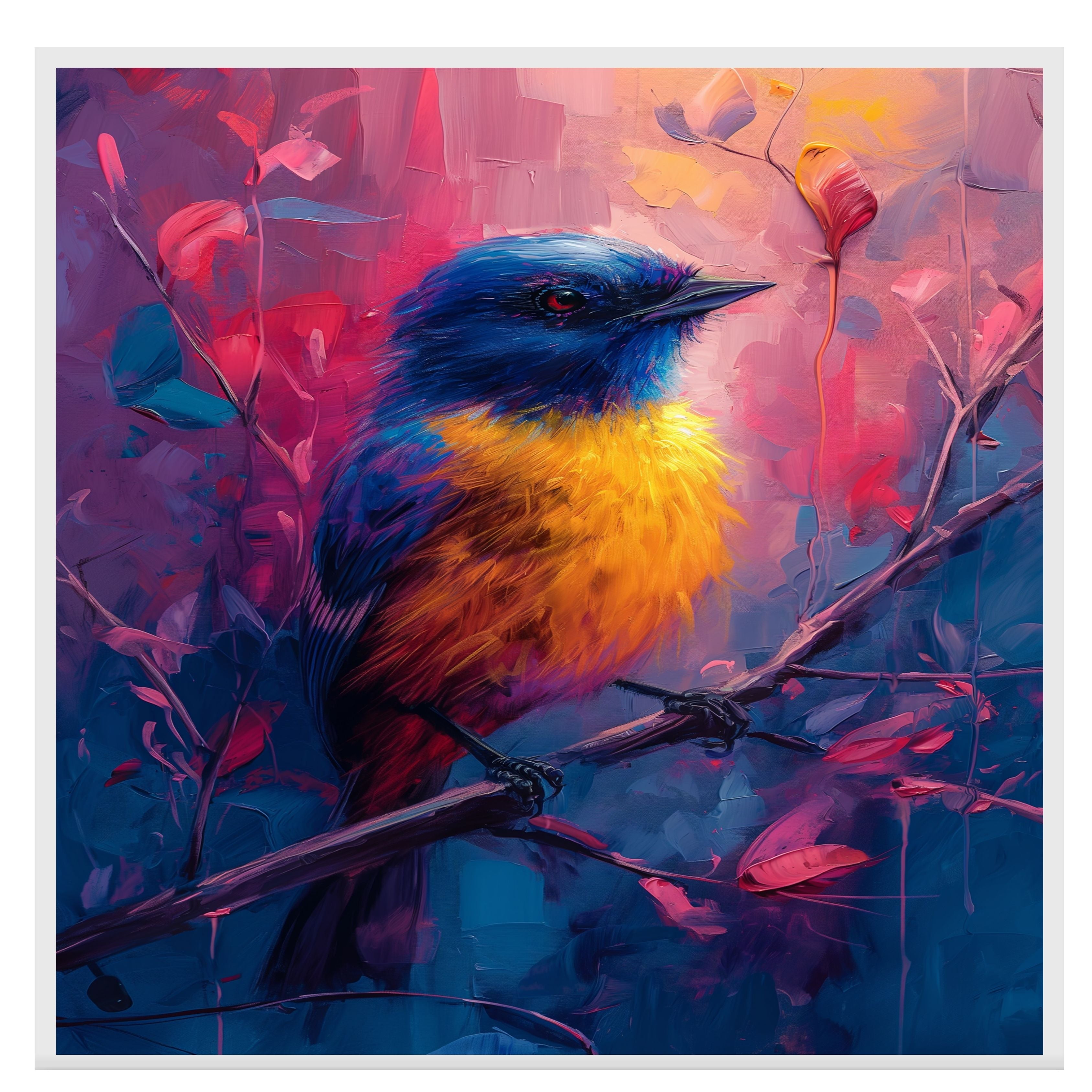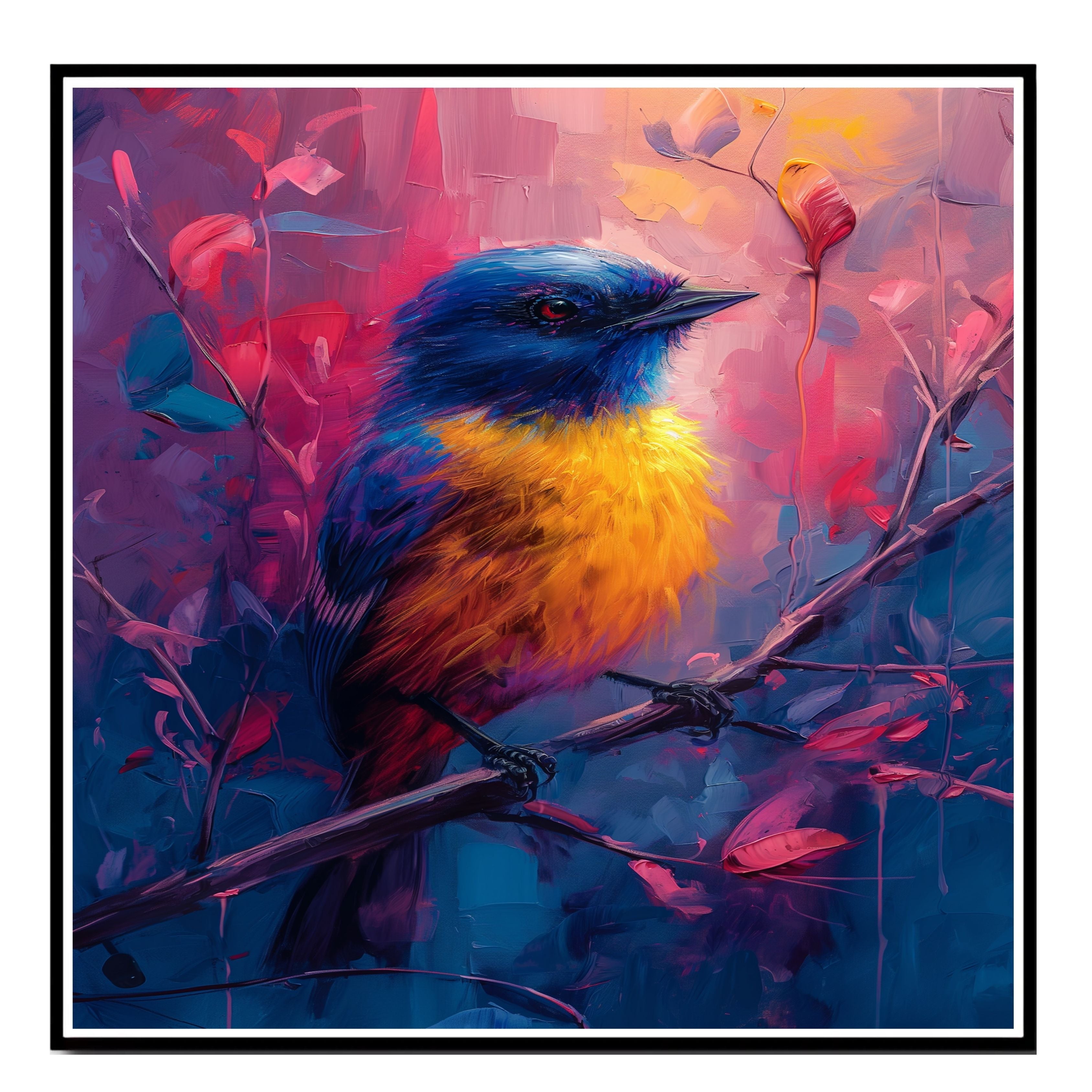 This dramatic and expressive artwork presents a vibrant bird with electric blue and golden yellow feathers perched on a branch. Set against a richly textured abstract background in hues of red, purple, and turquoise, this piece radiates intensity and bold beauty.
