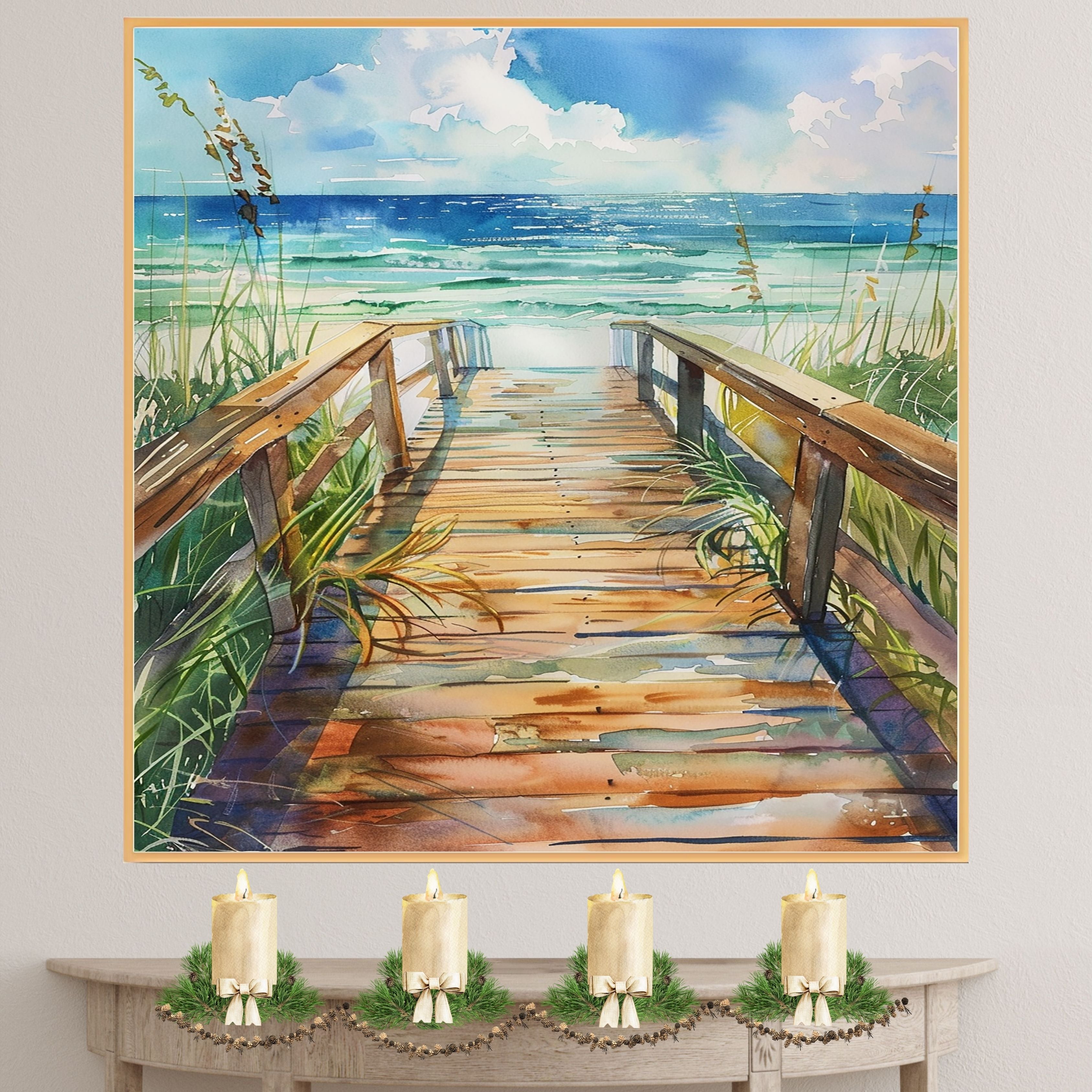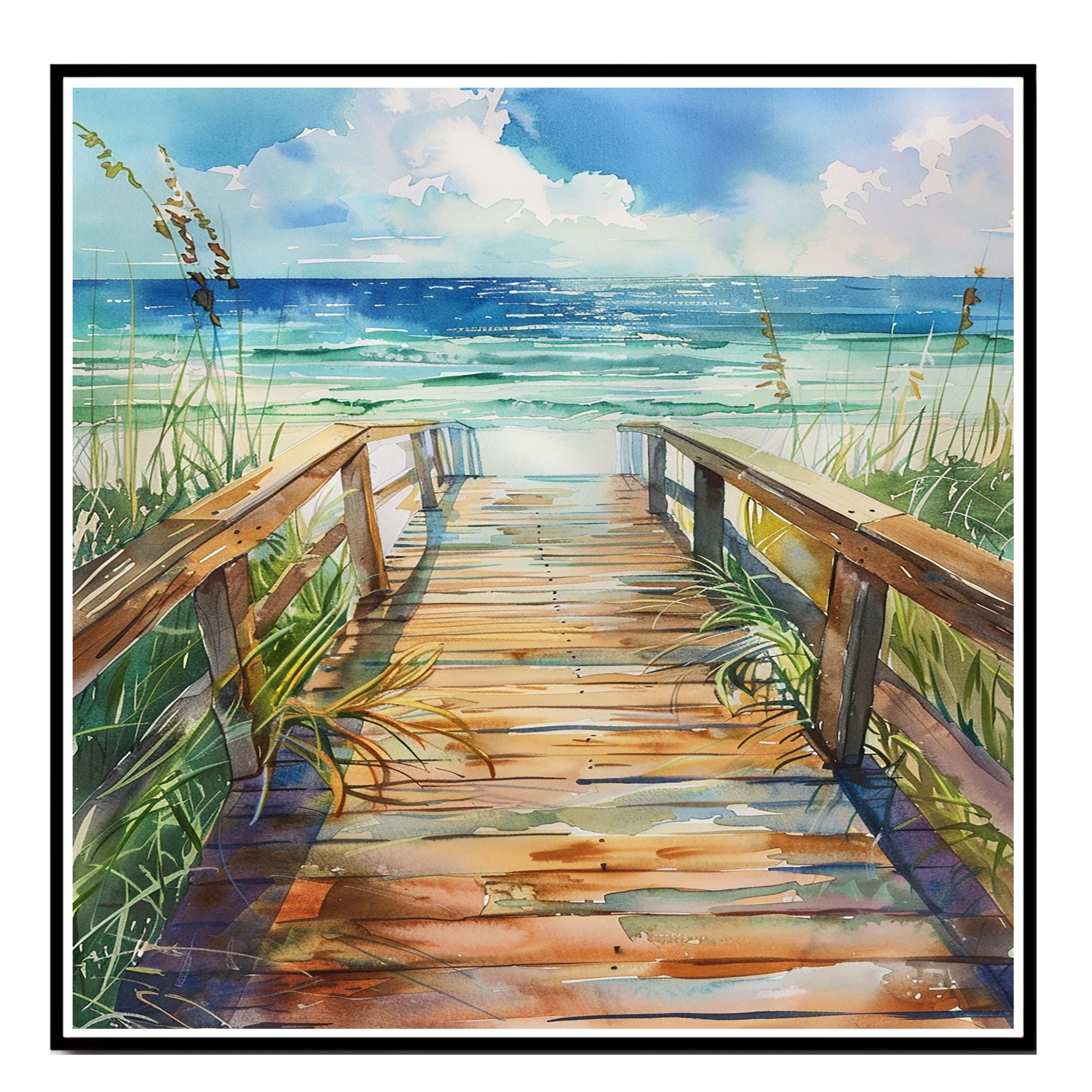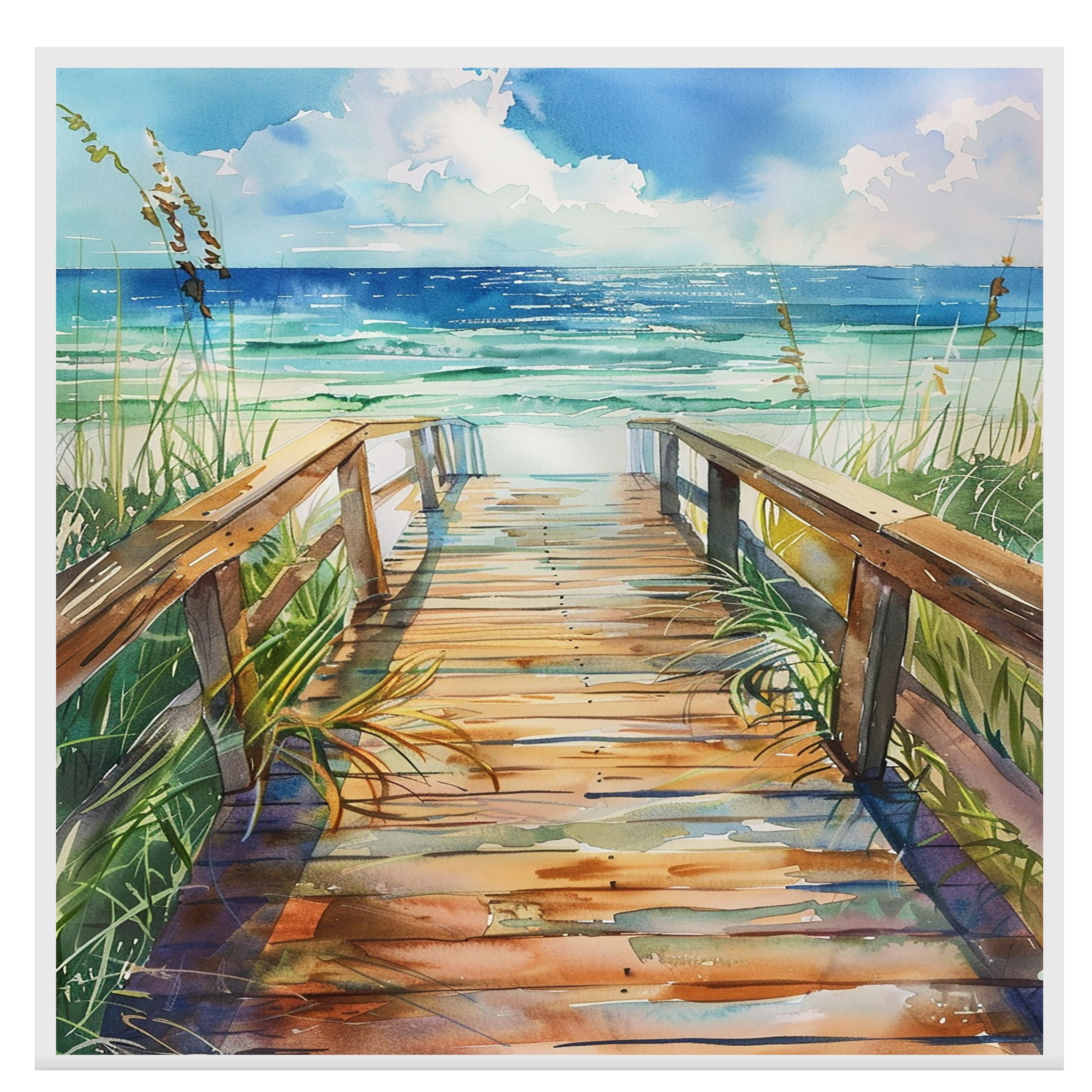This uplifting watercolor painting features a sun-drenched boardwalk path lined with seagrass, leading to brilliant blue waves...