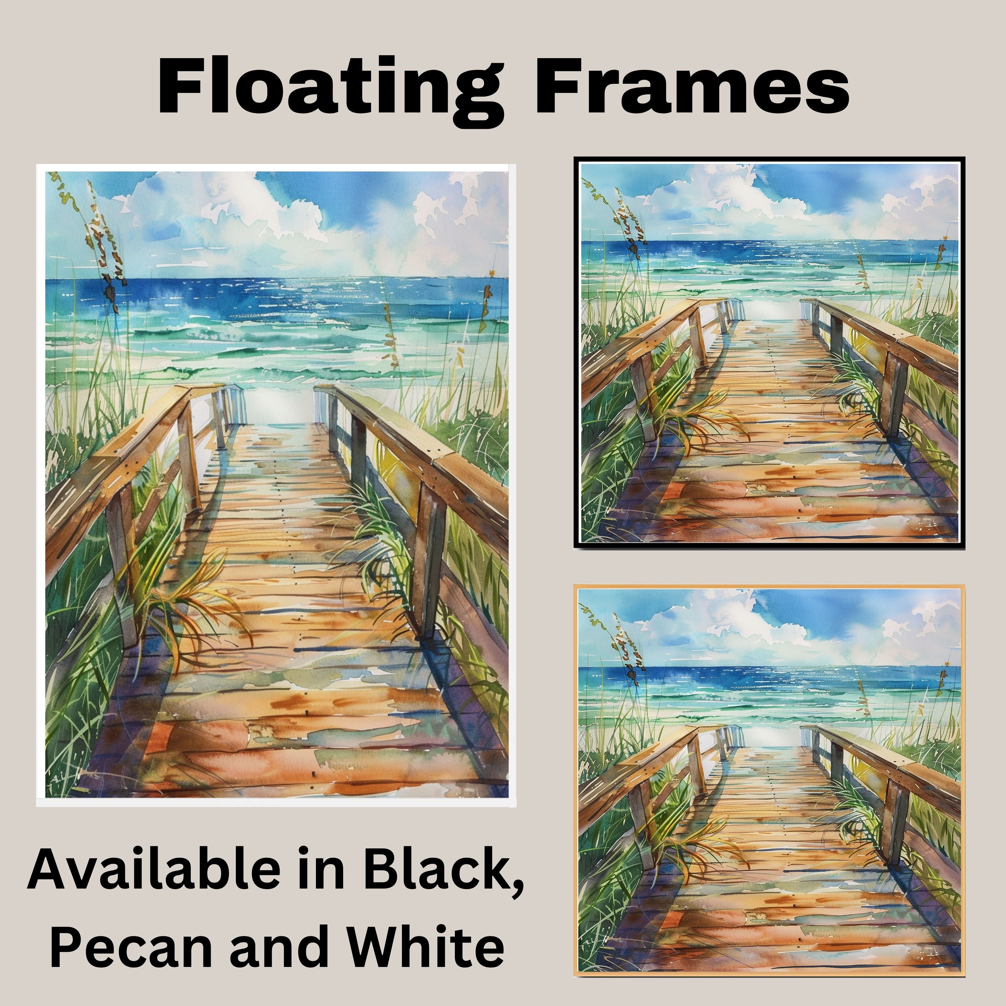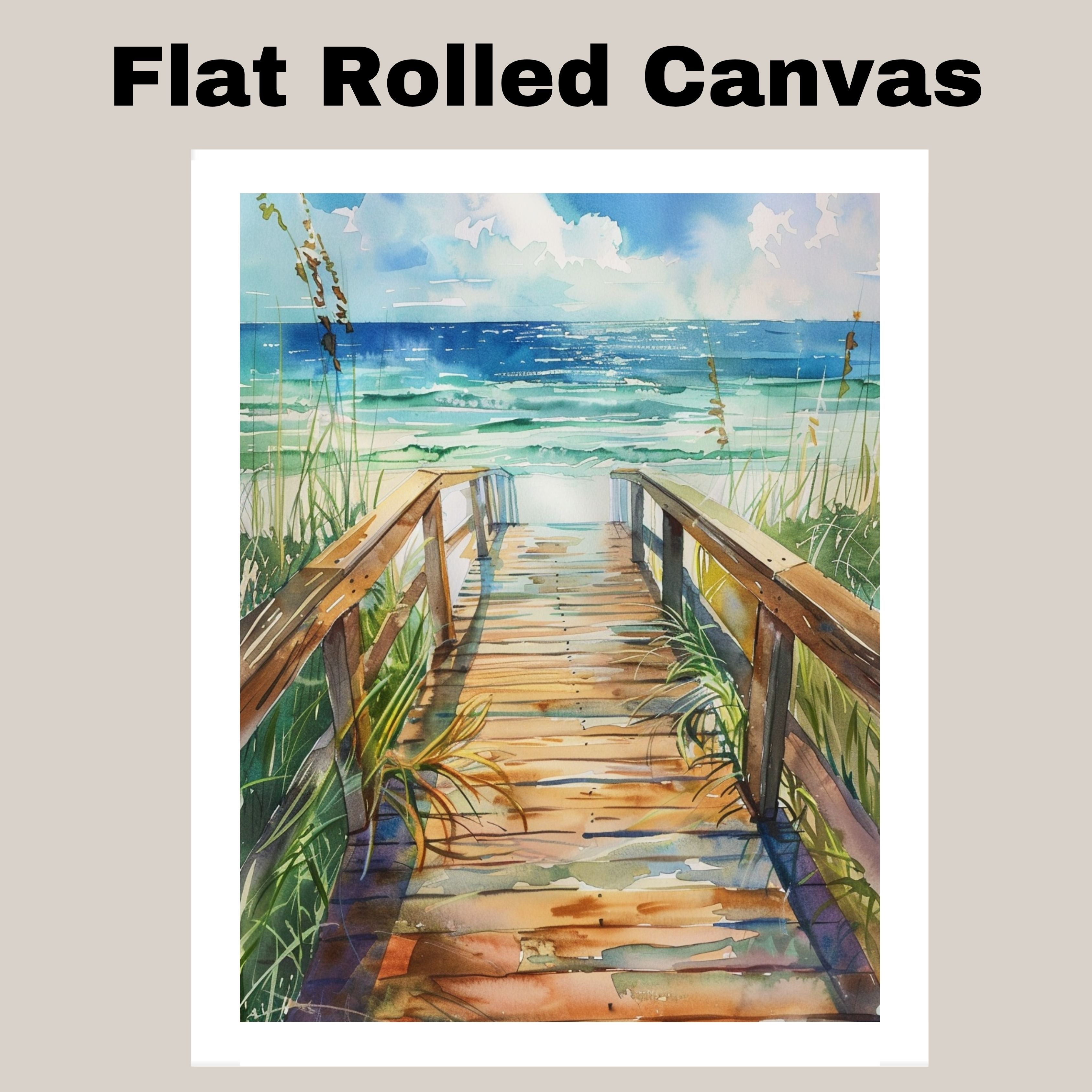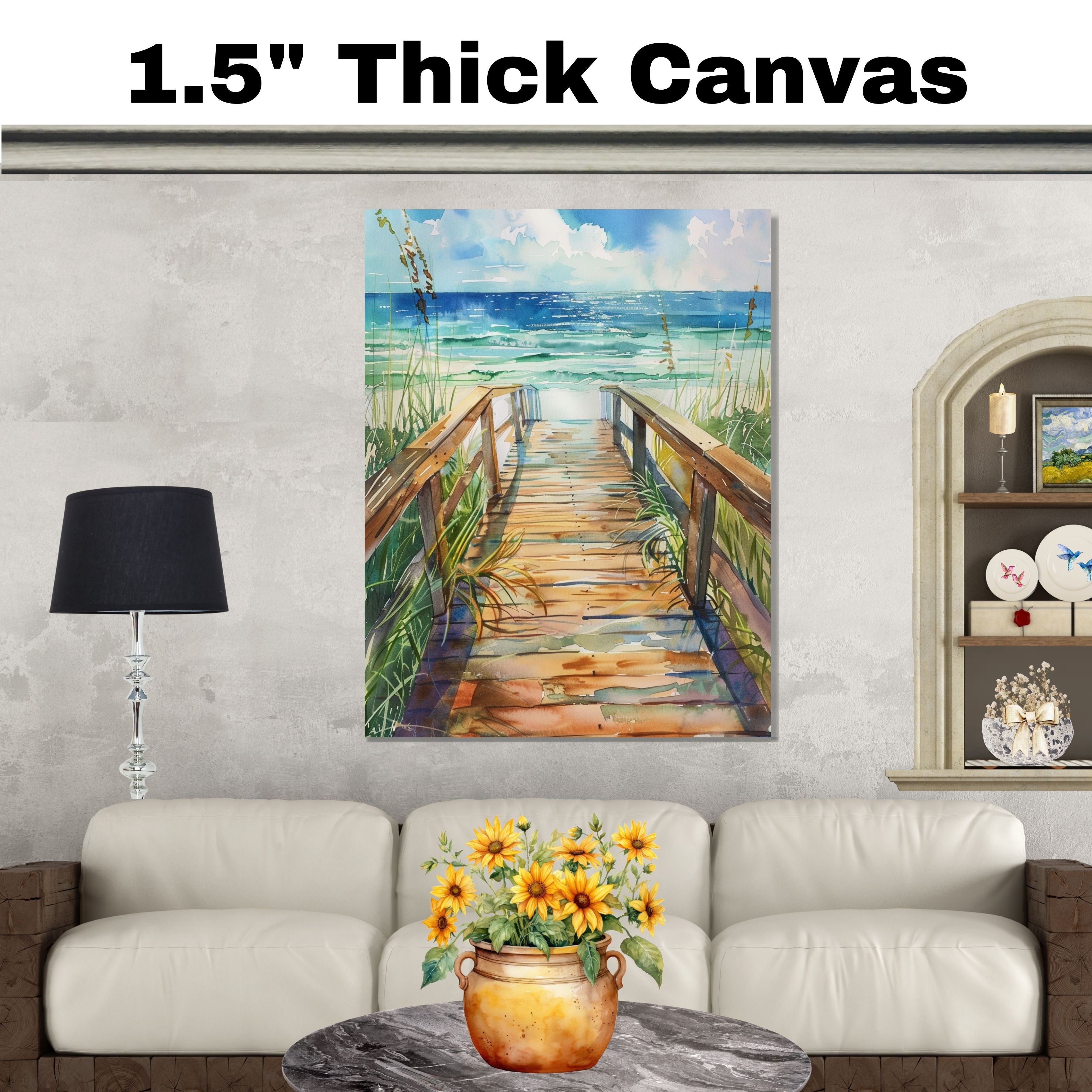 Sunlit Coastal Boardwalk Watercolor Painting – Beach Walkway to Turquoise Ocean with Seagrass on Ready to Hang 1.5" Thick Canvas Wrap, Floating Framed Canvas, Flat Rolled Canvas