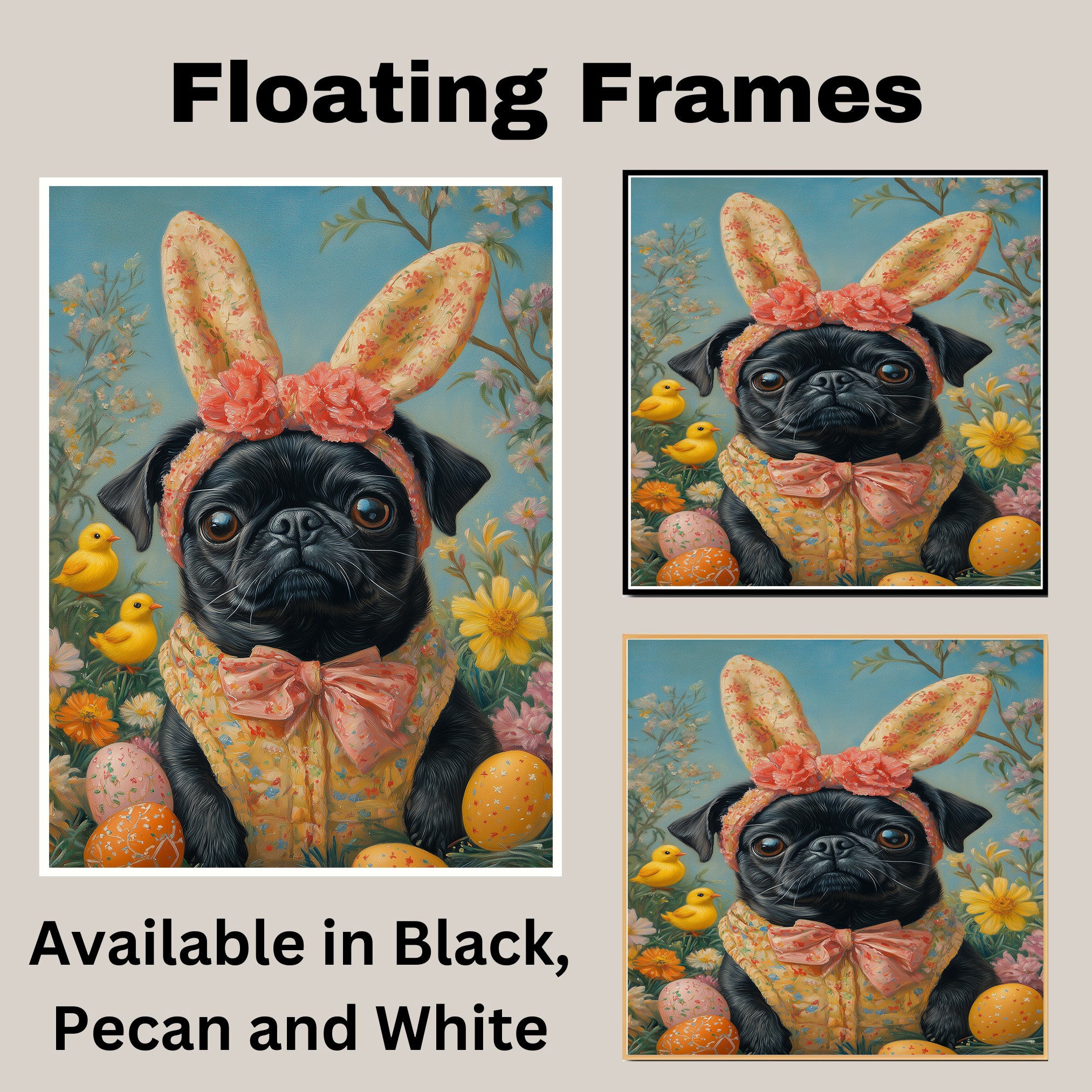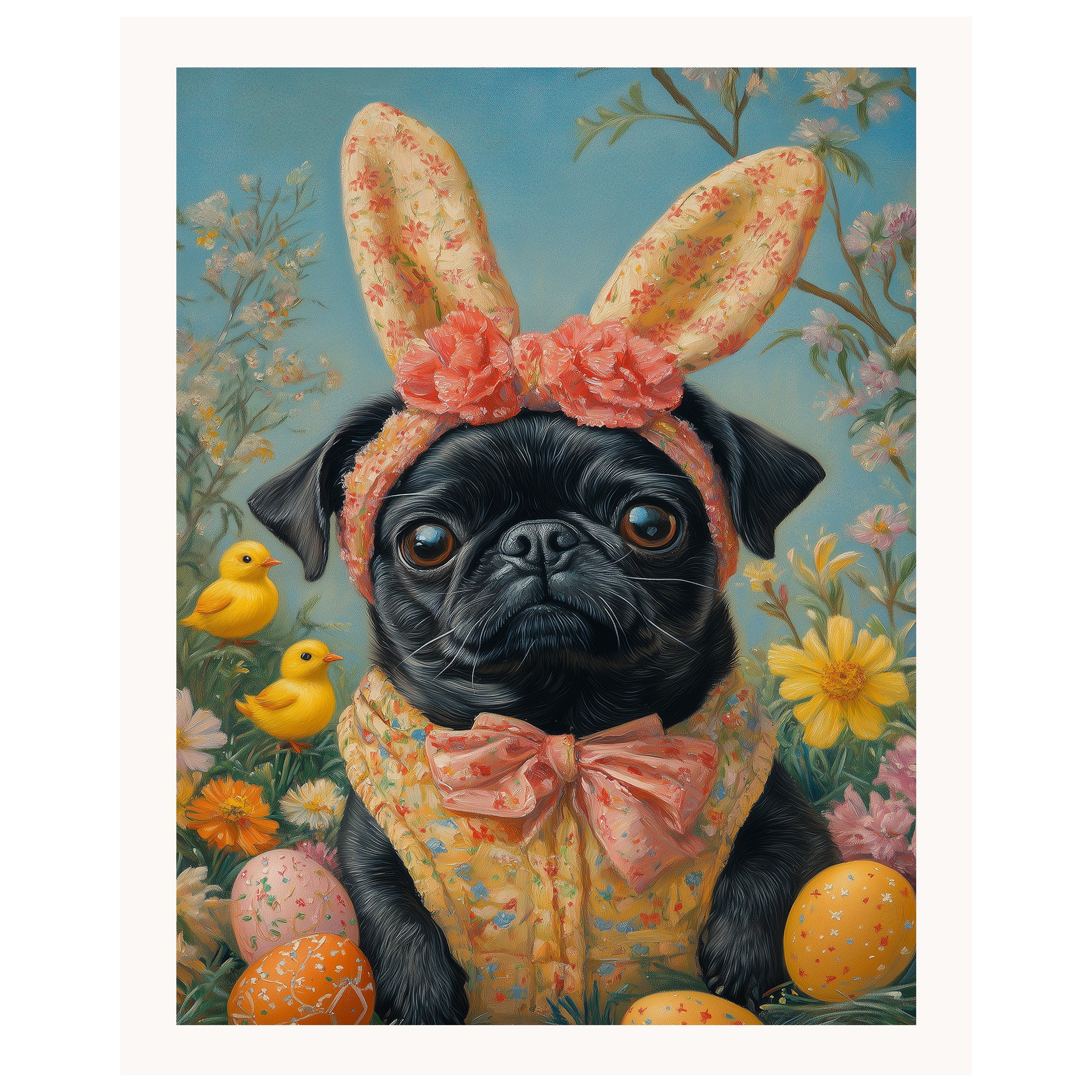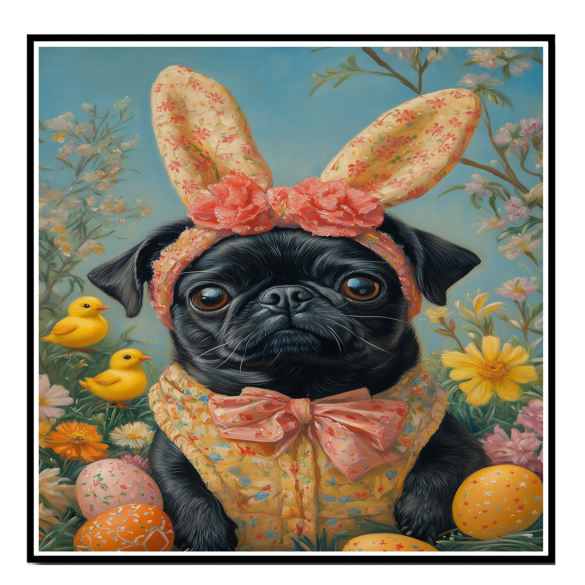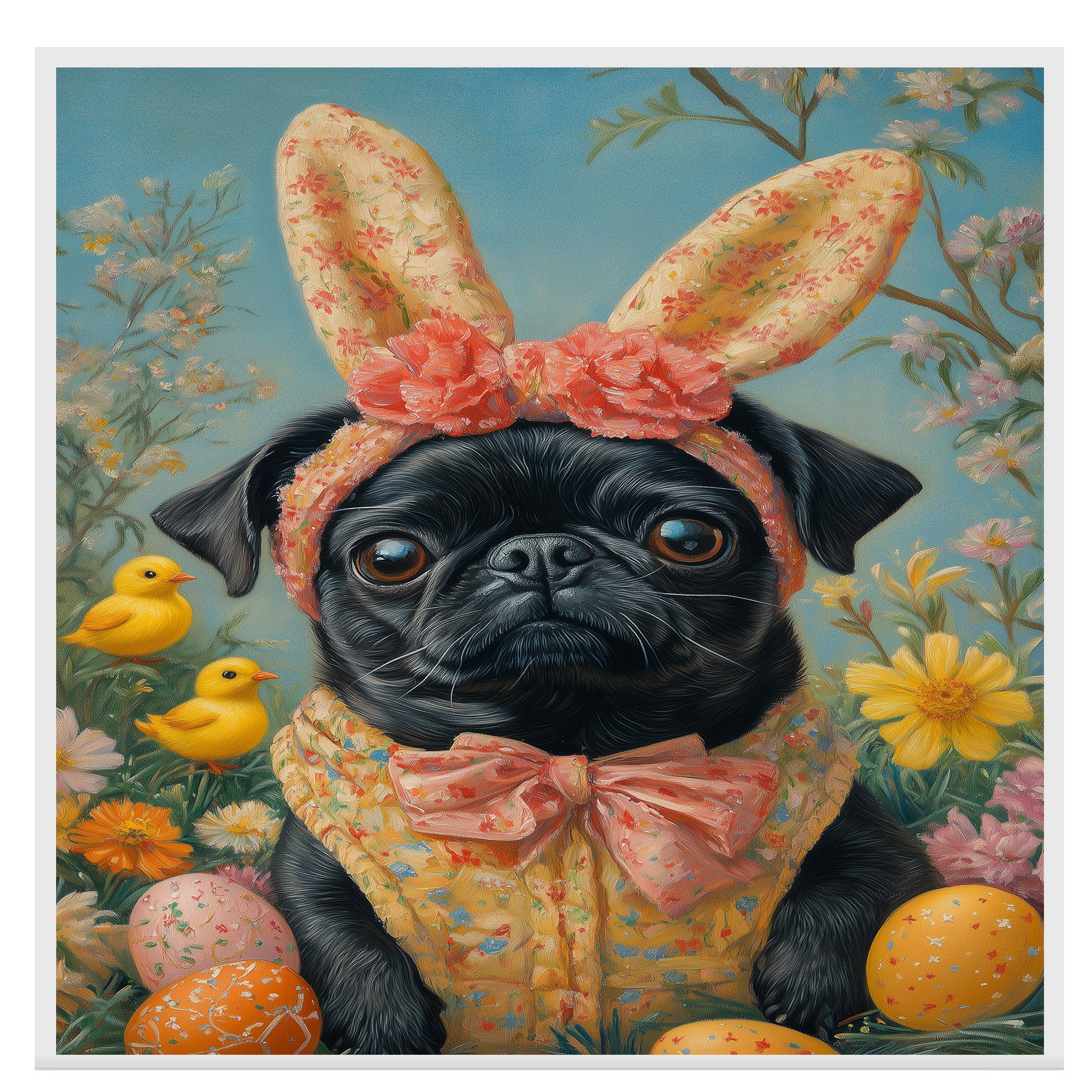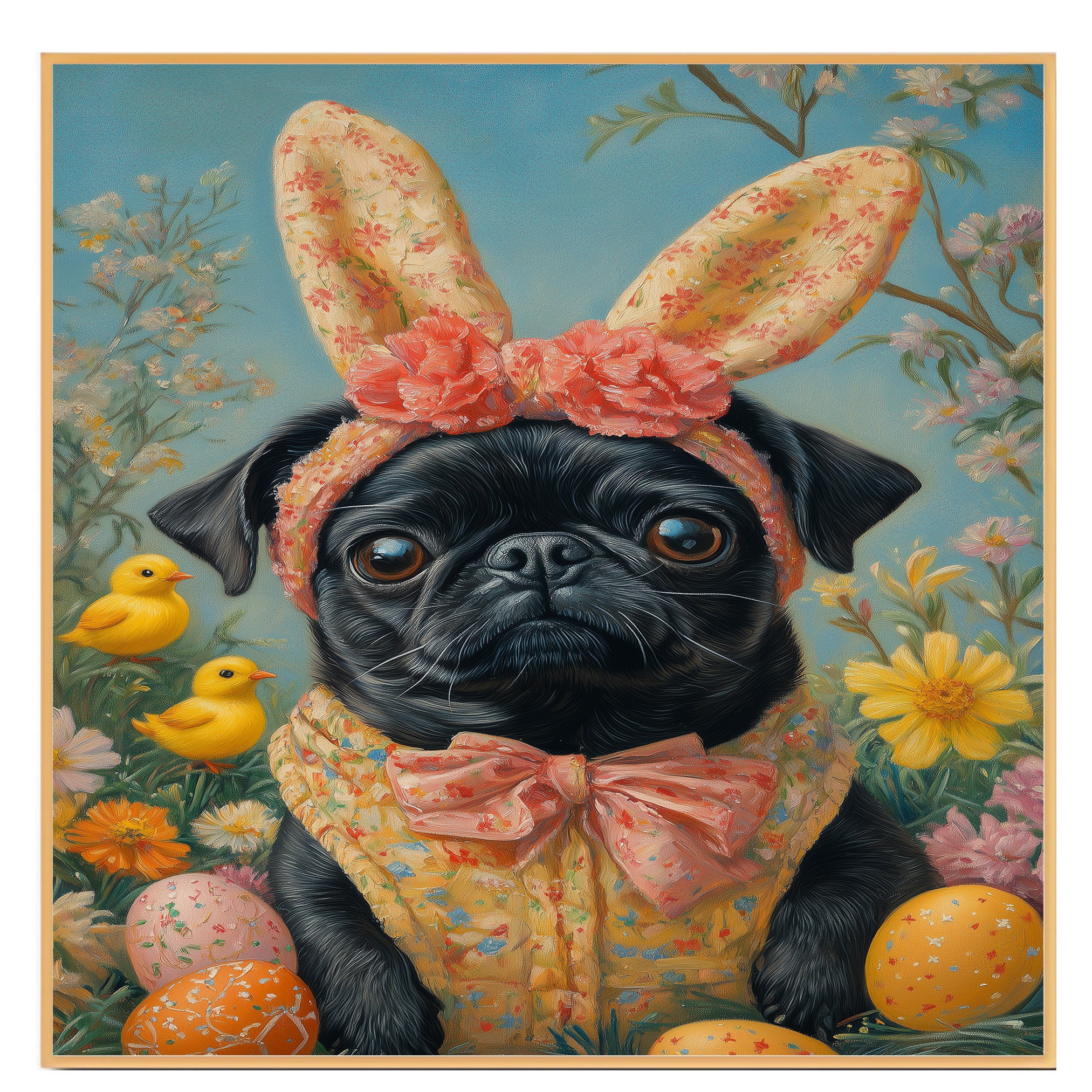 Sunny Celebrations: Black Pug Dressed in a Delightful Easter Costume on Decorative Canvas Wrap, Framed Print, or Rolled Artwork