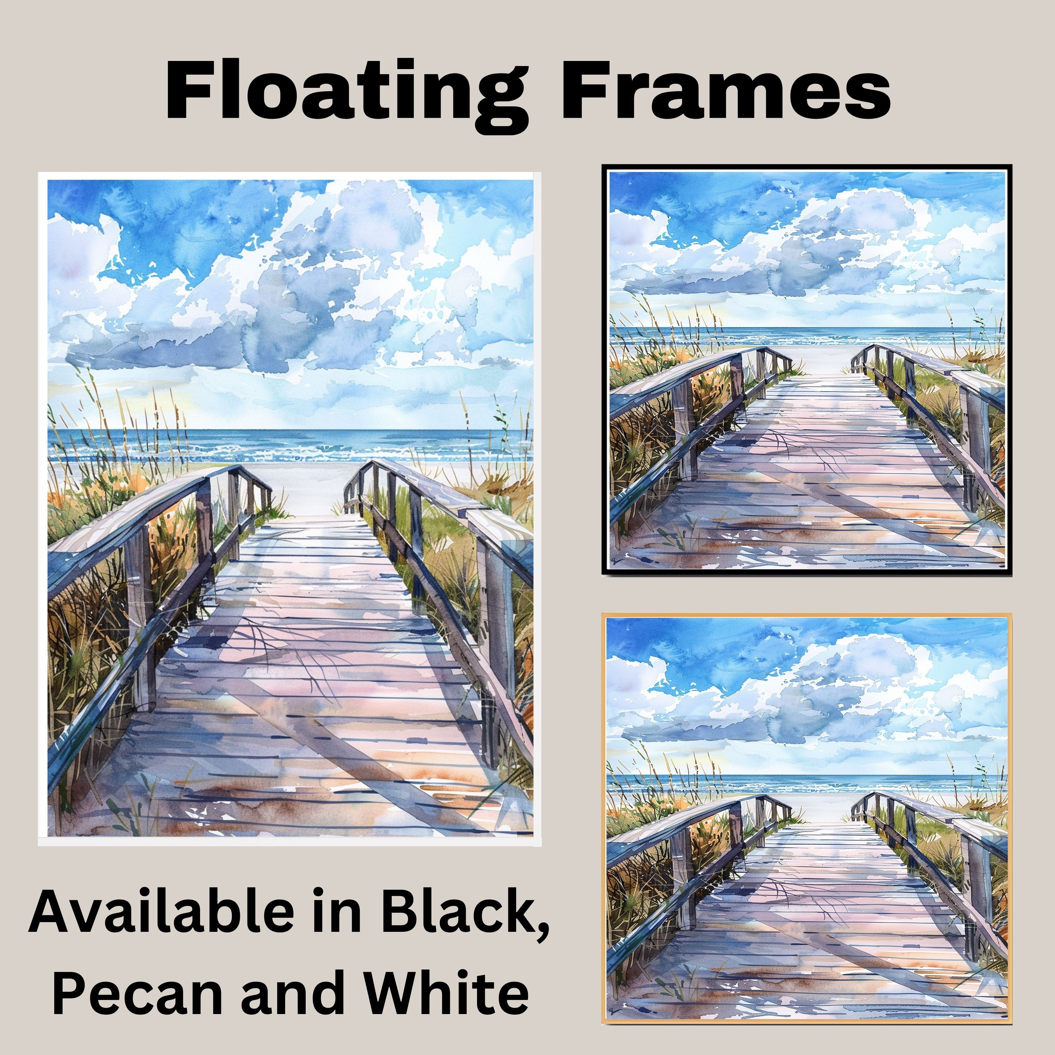 1.5" Thick Floating Framed Canvas: Available in Black, Pecan, and White Grain. Durable shrink-resistant frame. Comes with easy-to-install hanging kits, ready for immediate display.
