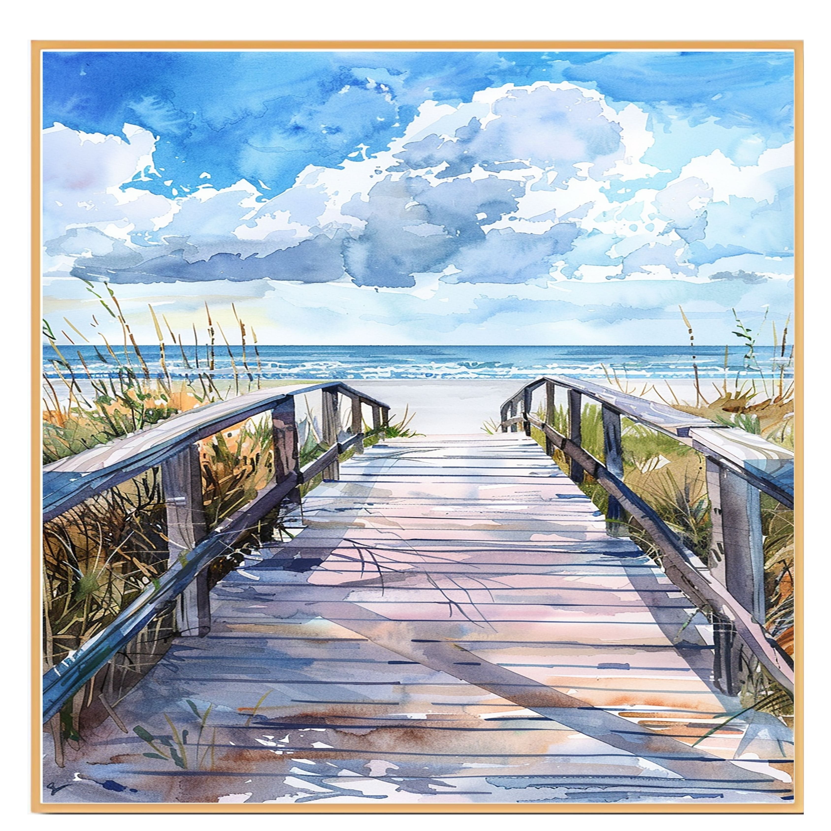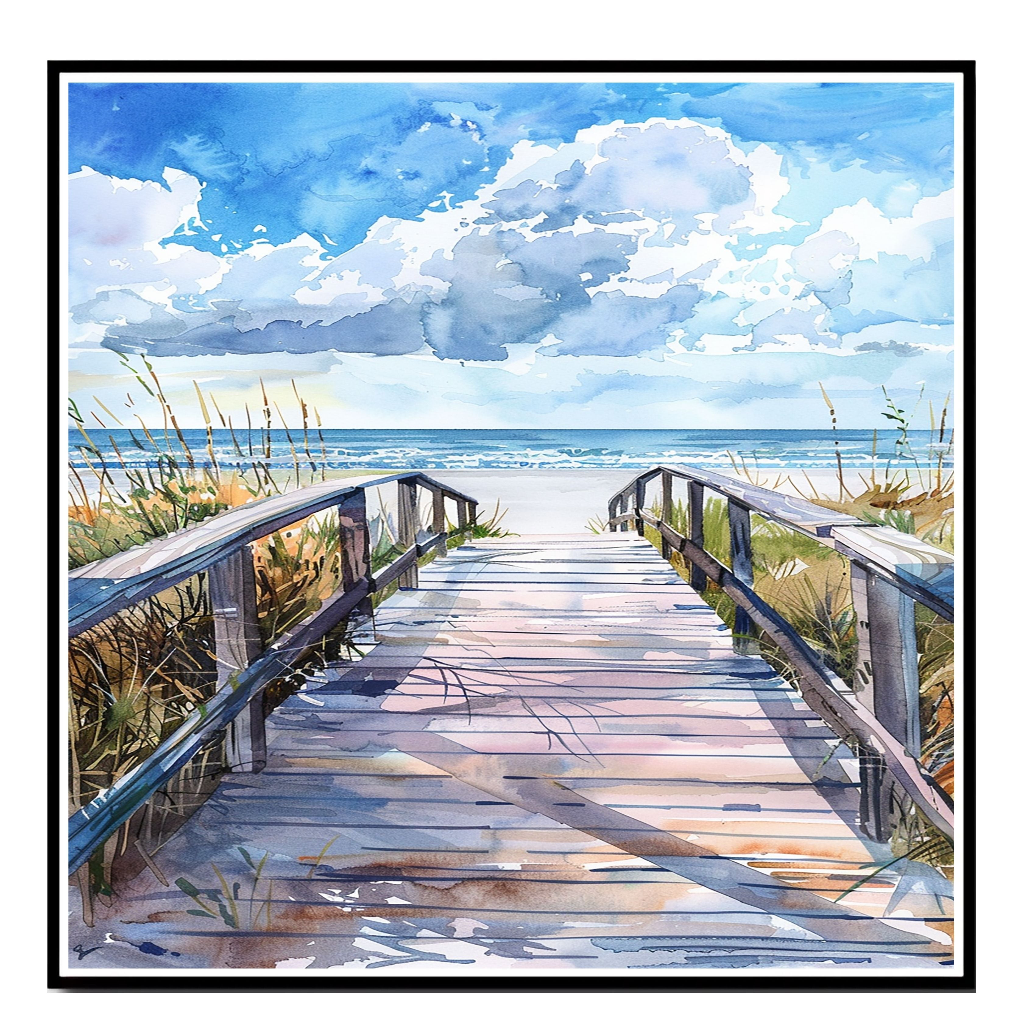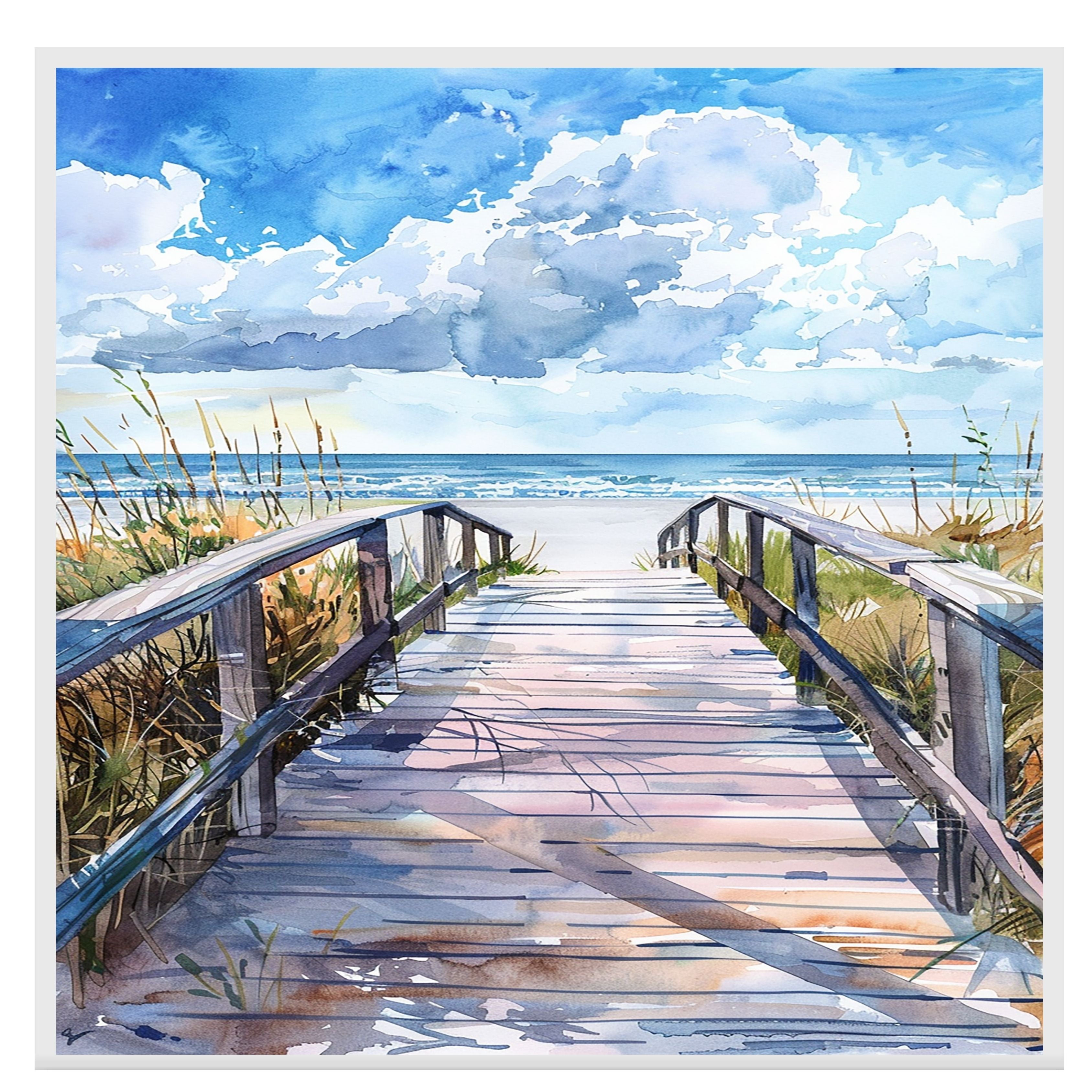 Step onto the sand with this cheerful watercolor painting of a sunlit boardwalk leading to the sea. The vivid shadows, soft waves, and windswept grass capture the relaxed rhythm of a peaceful beach day. Ideal for coastal or beach-inspired home decor.