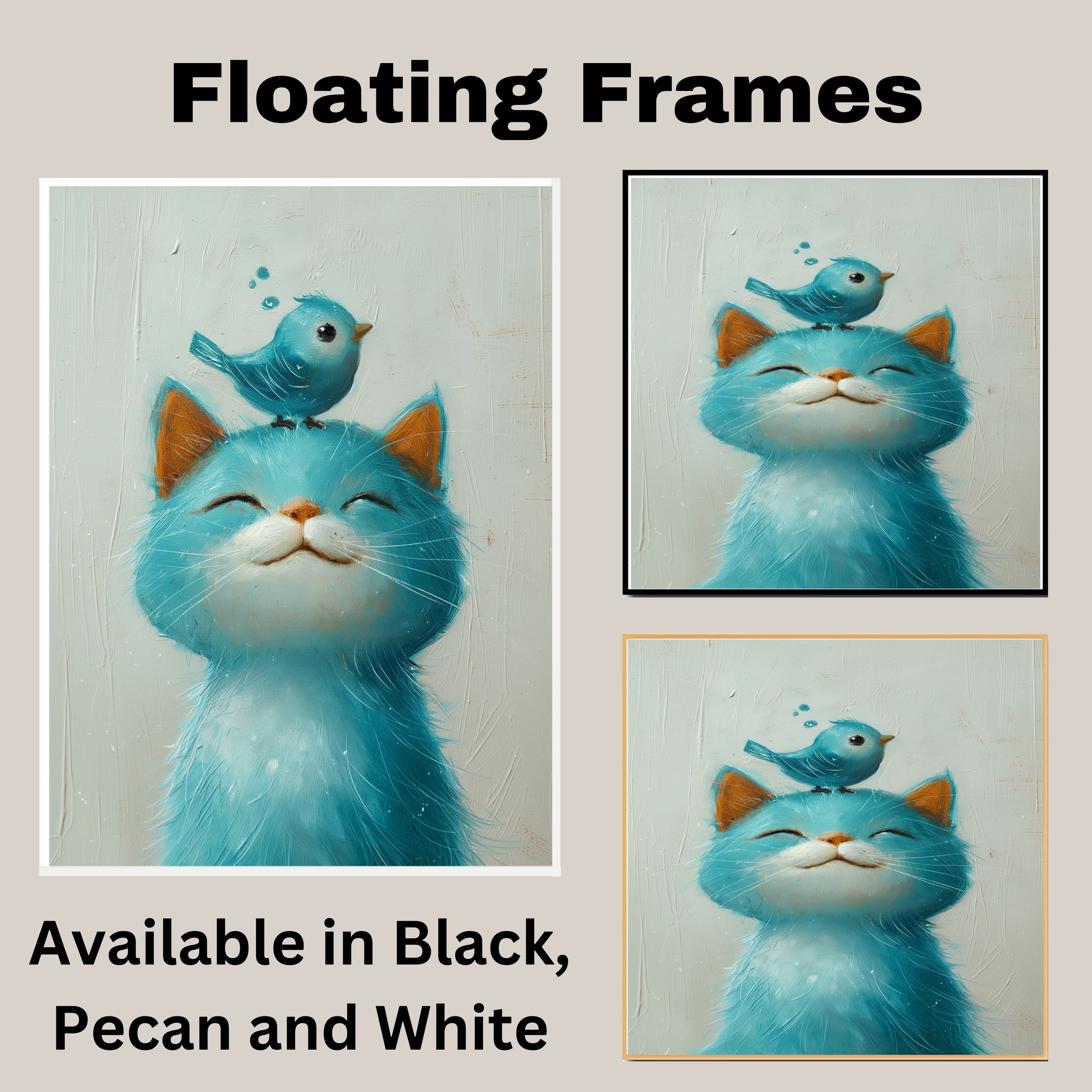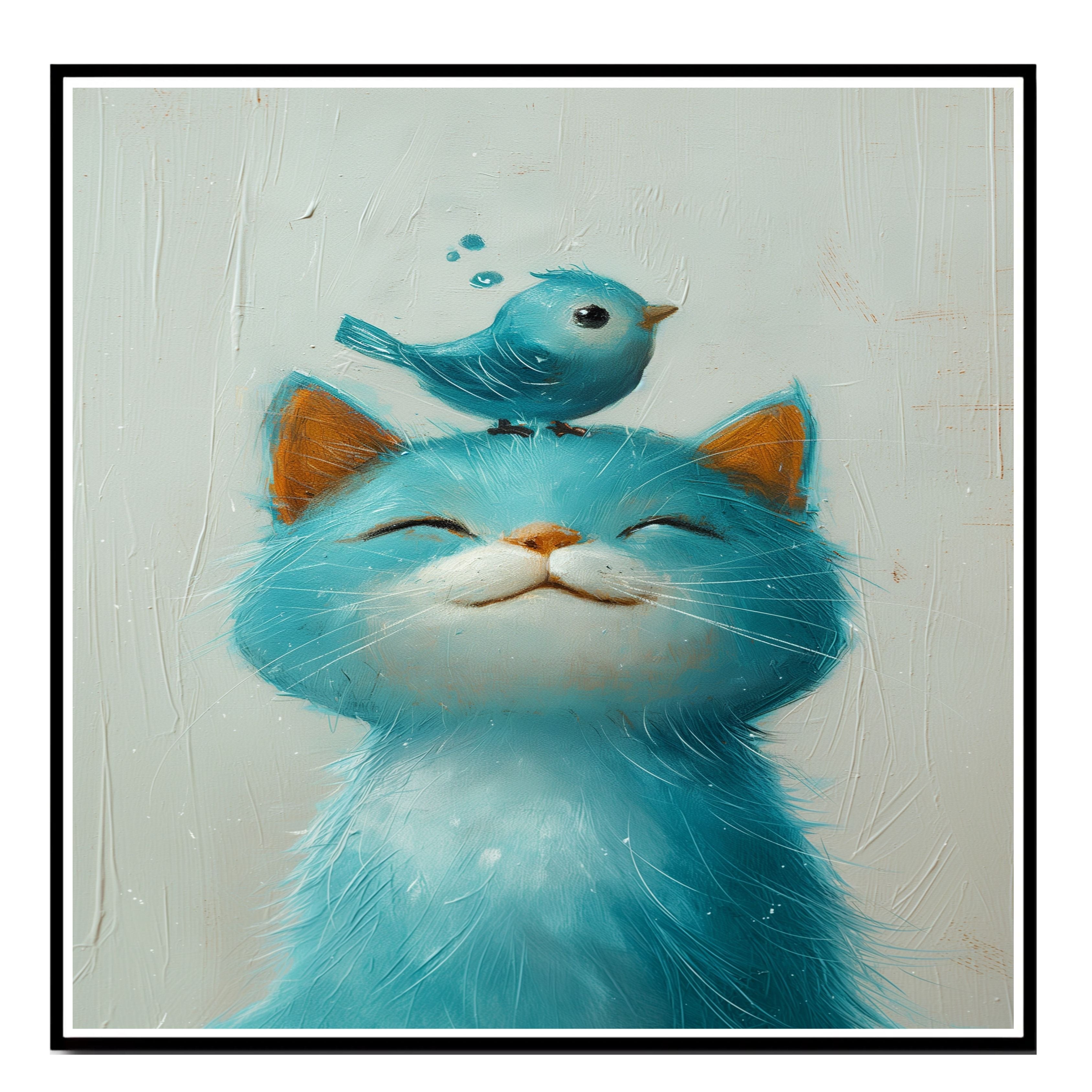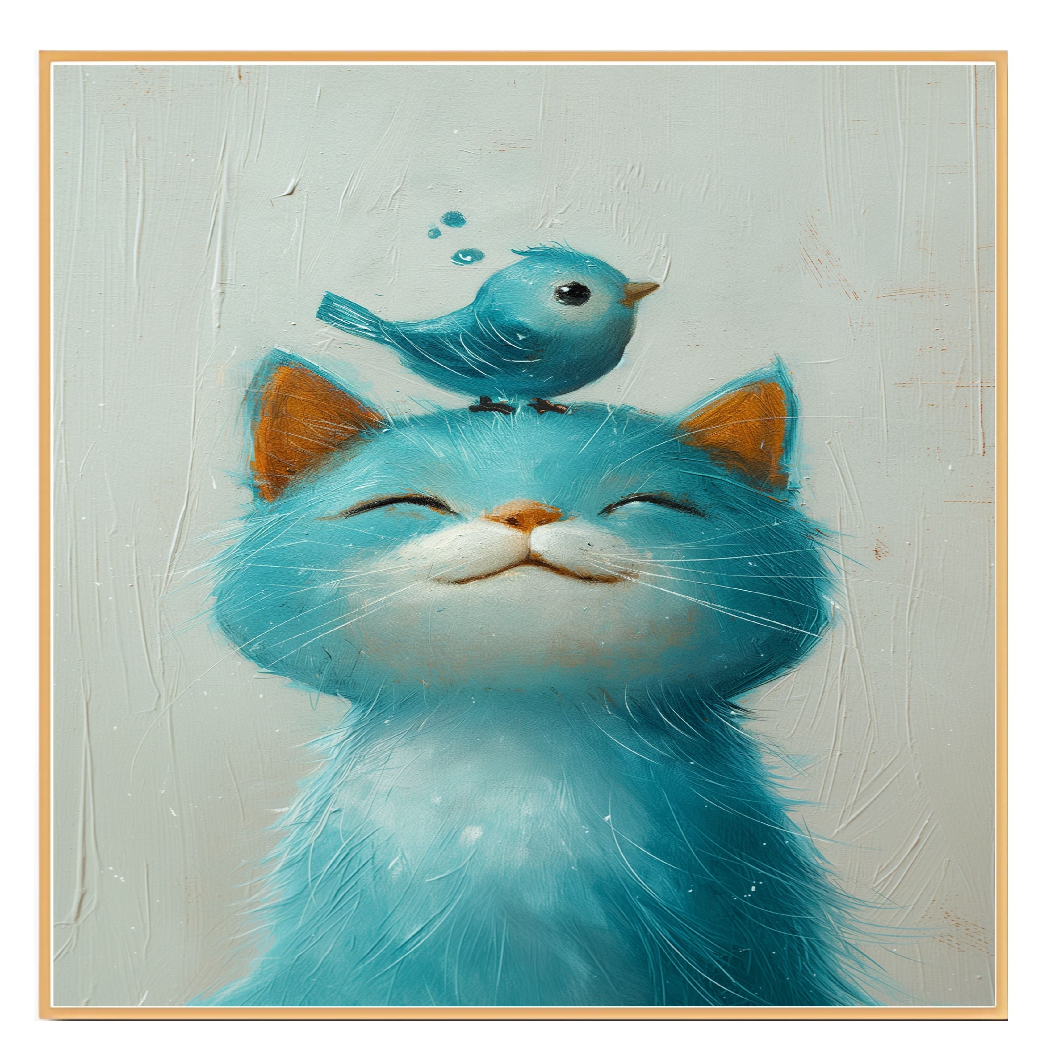This charming artwork features a soft blue kitten with a peaceful smile and a tiny blue bird perched playfully on its head. The gentle brushstrokes and pastel tones make it ideal for nurseries, kids' rooms, or anyone who loves sweet, whimsical animal scenes. A perfect piece to add warmth and joy to any playful or pet-inspired space.
