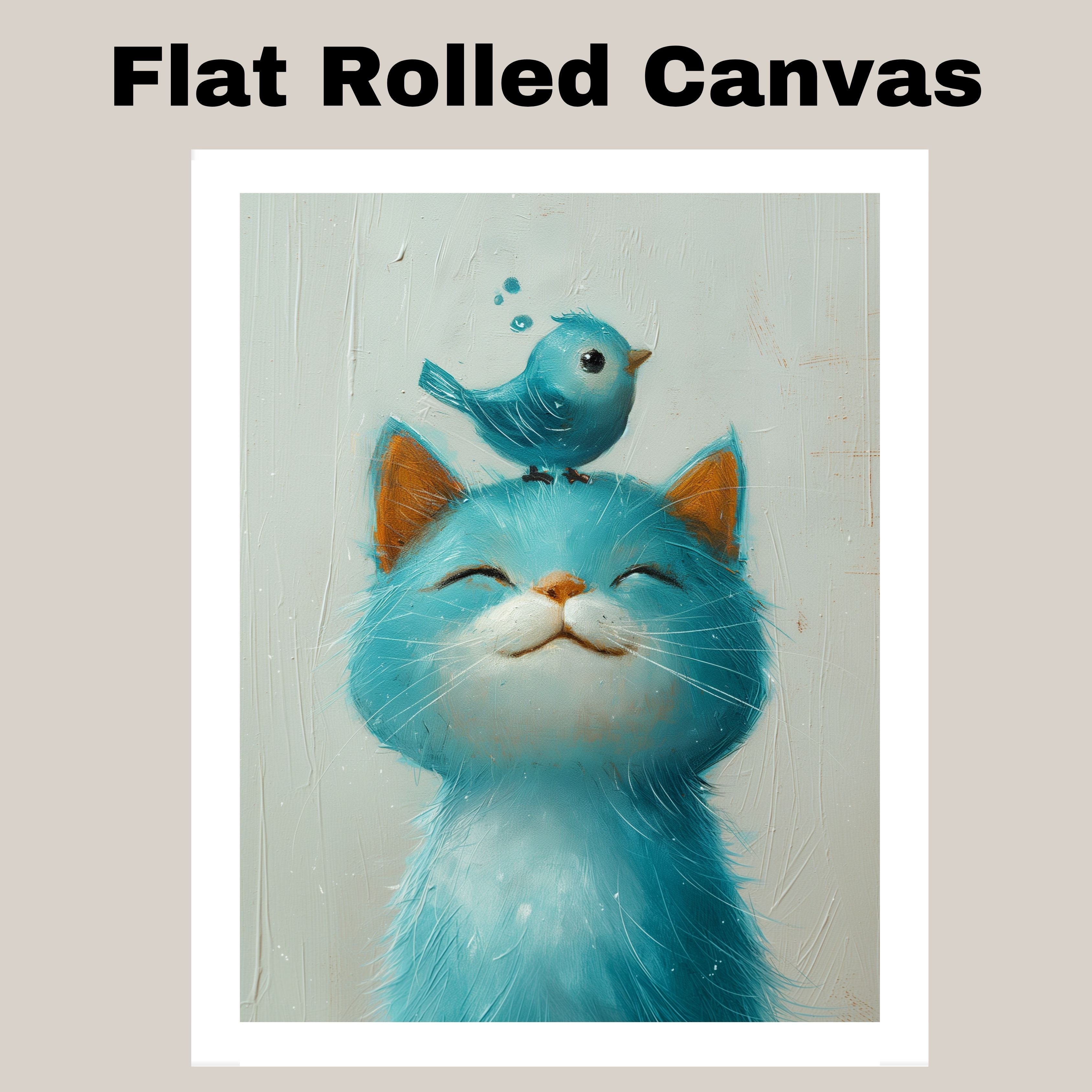 Sweet Blue Cat with Tiny Blue Bird on Head Cute and Whimsical Animal Illustration for Nursery or Kids Room Art Print Perfect for Cat and Bird Lovers on Ready to Hang 1.5" Thick Canvas Wrap, Floating Framed Canvas, Flat Rolled Canvas