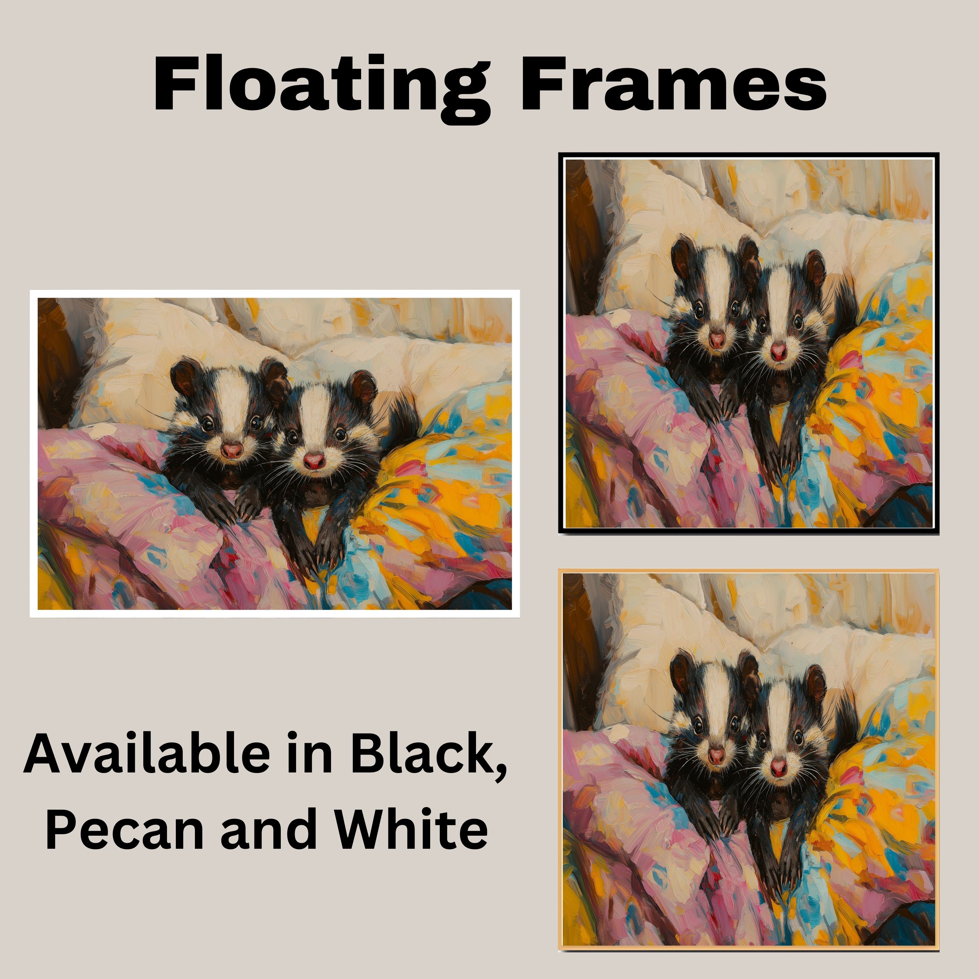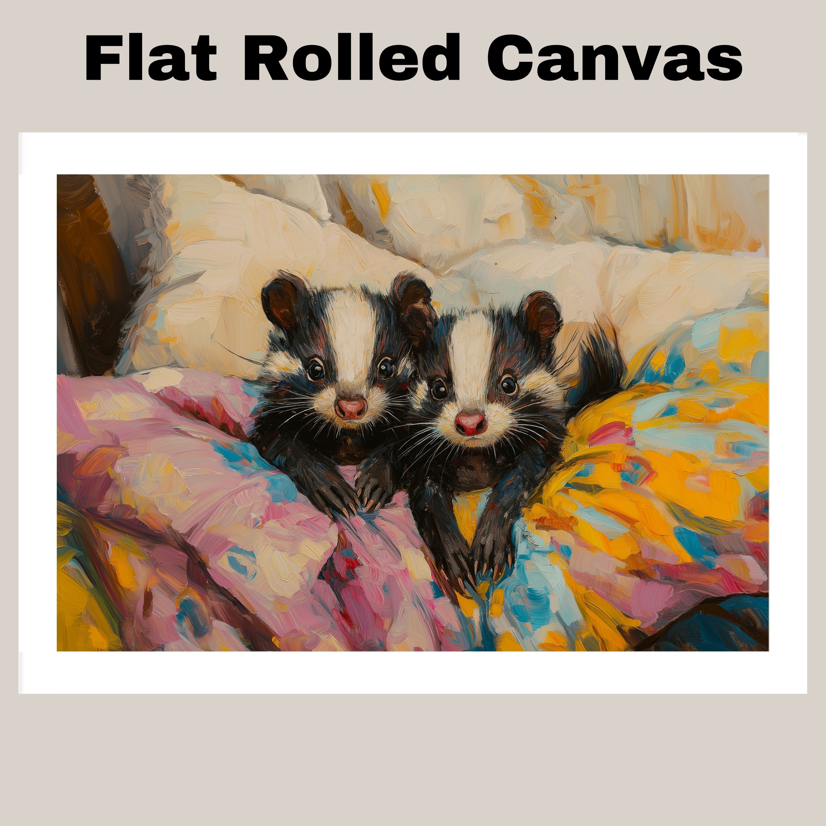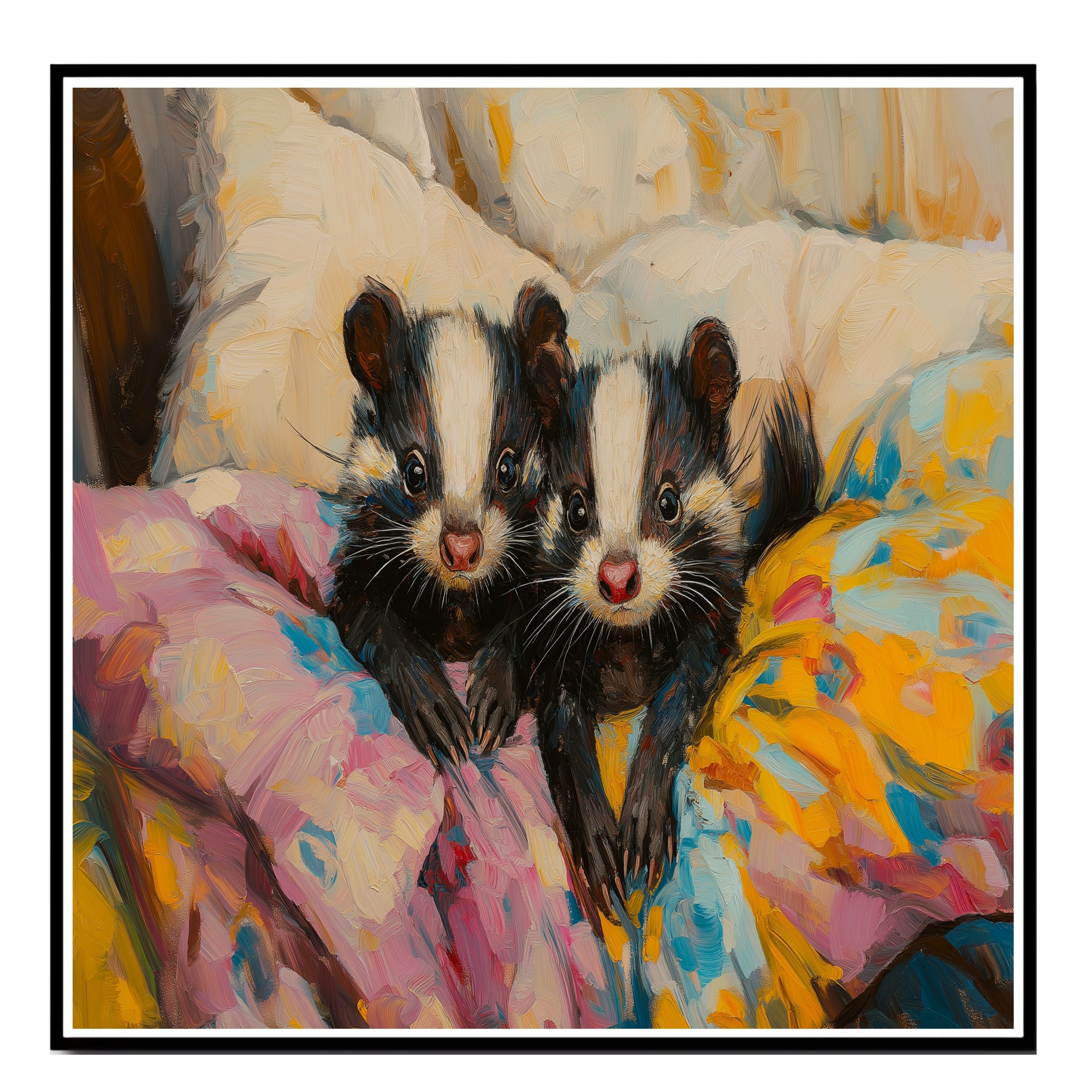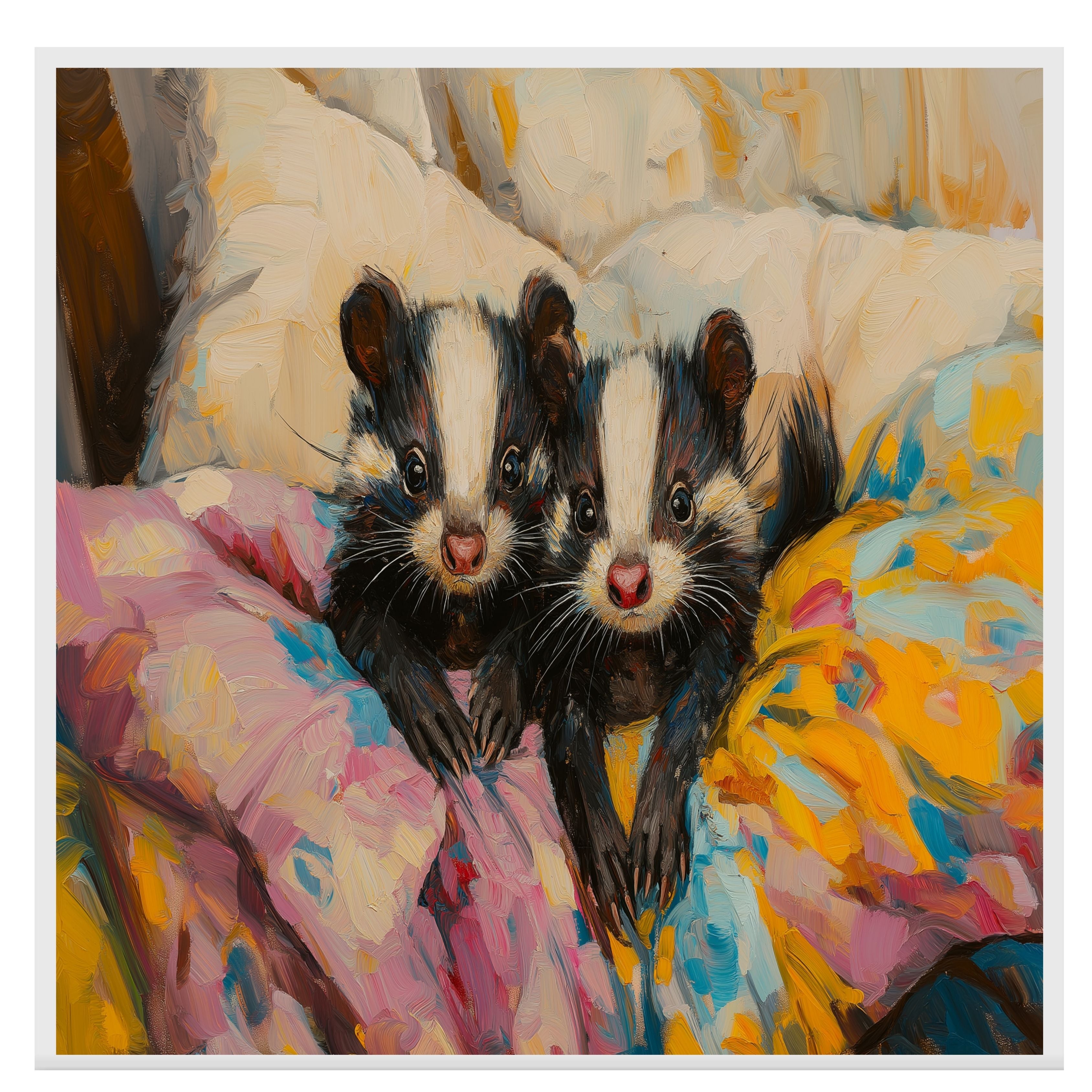 This charming artwork features two baby skunks cozily tucked into vibrant, multicolored bedding with soft pillows behind them. Their wide-eyed expressions and gentle brushwork create a heartwarming scene, ideal for woodland-themed nurseries, animal lovers, or whimsical home décor.
