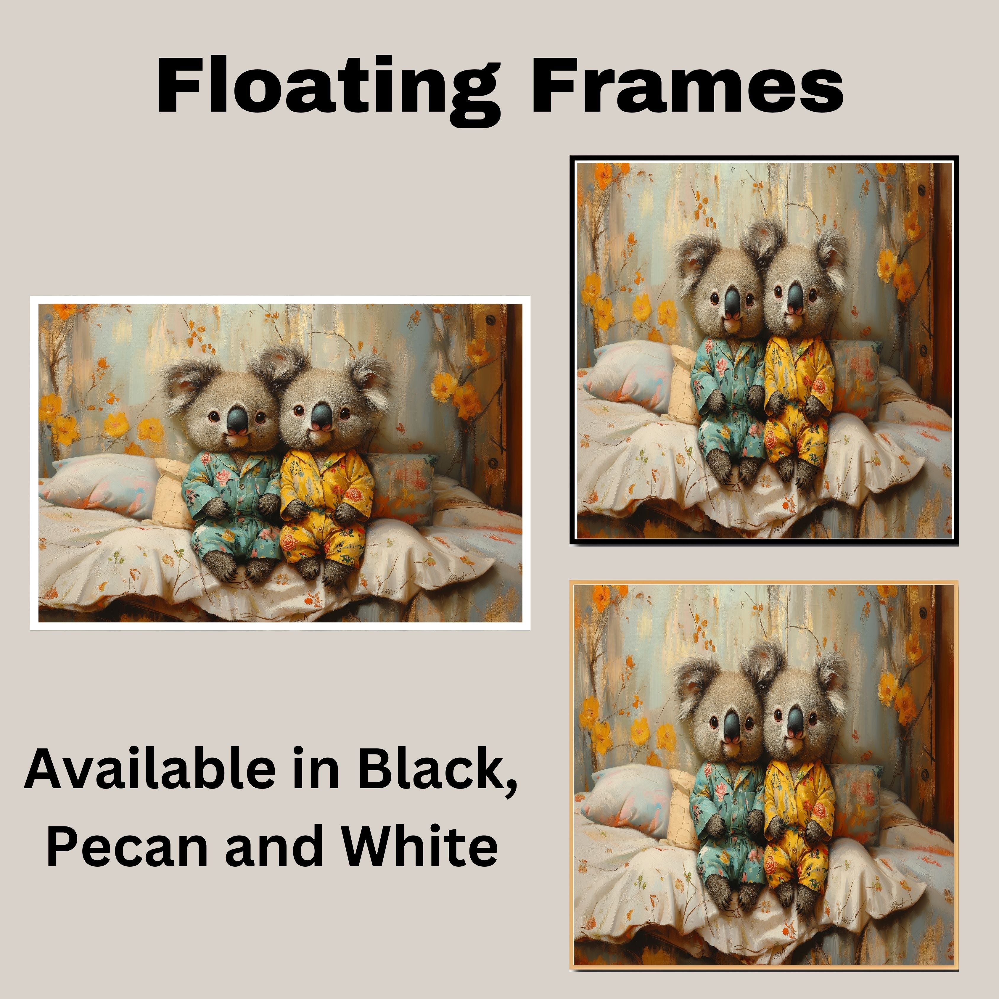 1.5" Thick Floating Framed Canvas: Available in Black, Pecan, and White Grain. Durable shrink-resistant frame. Comes with easy-to-install hanging kits, ready for immediate display.