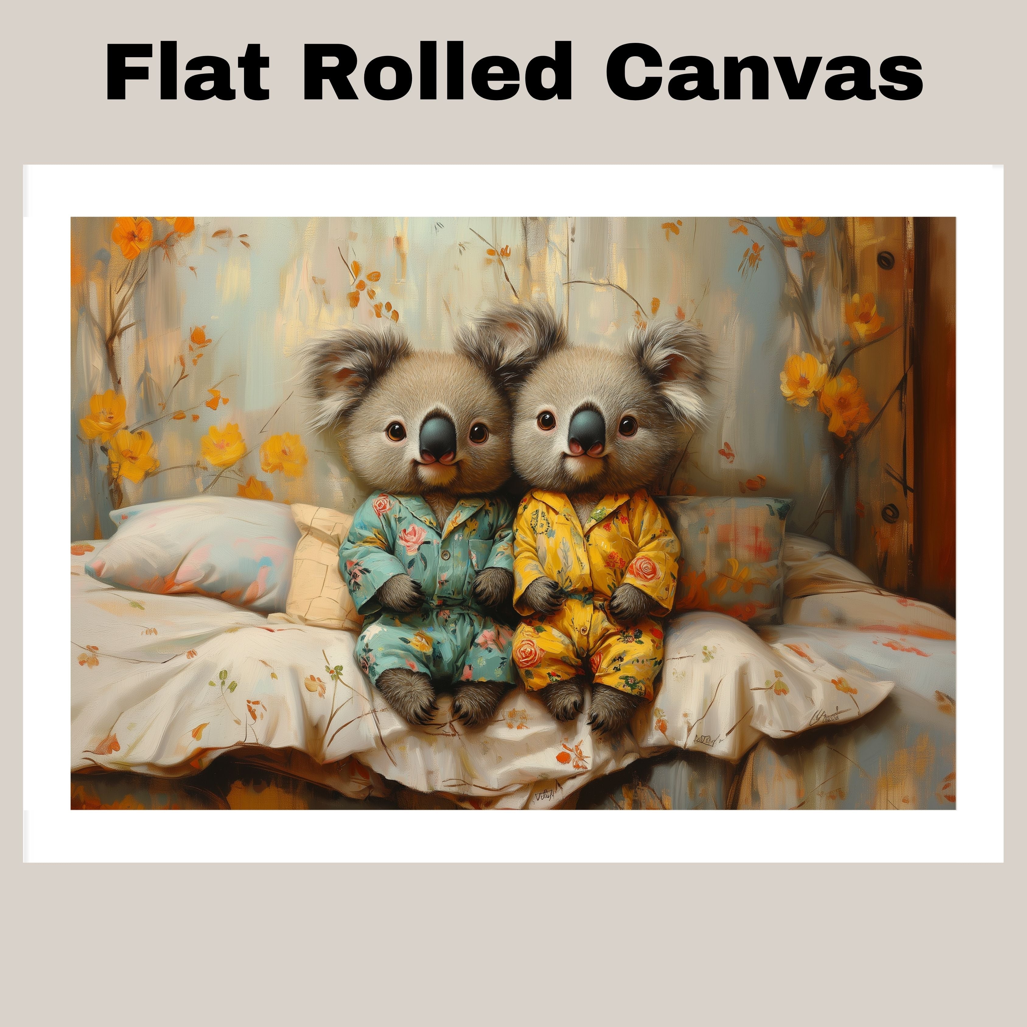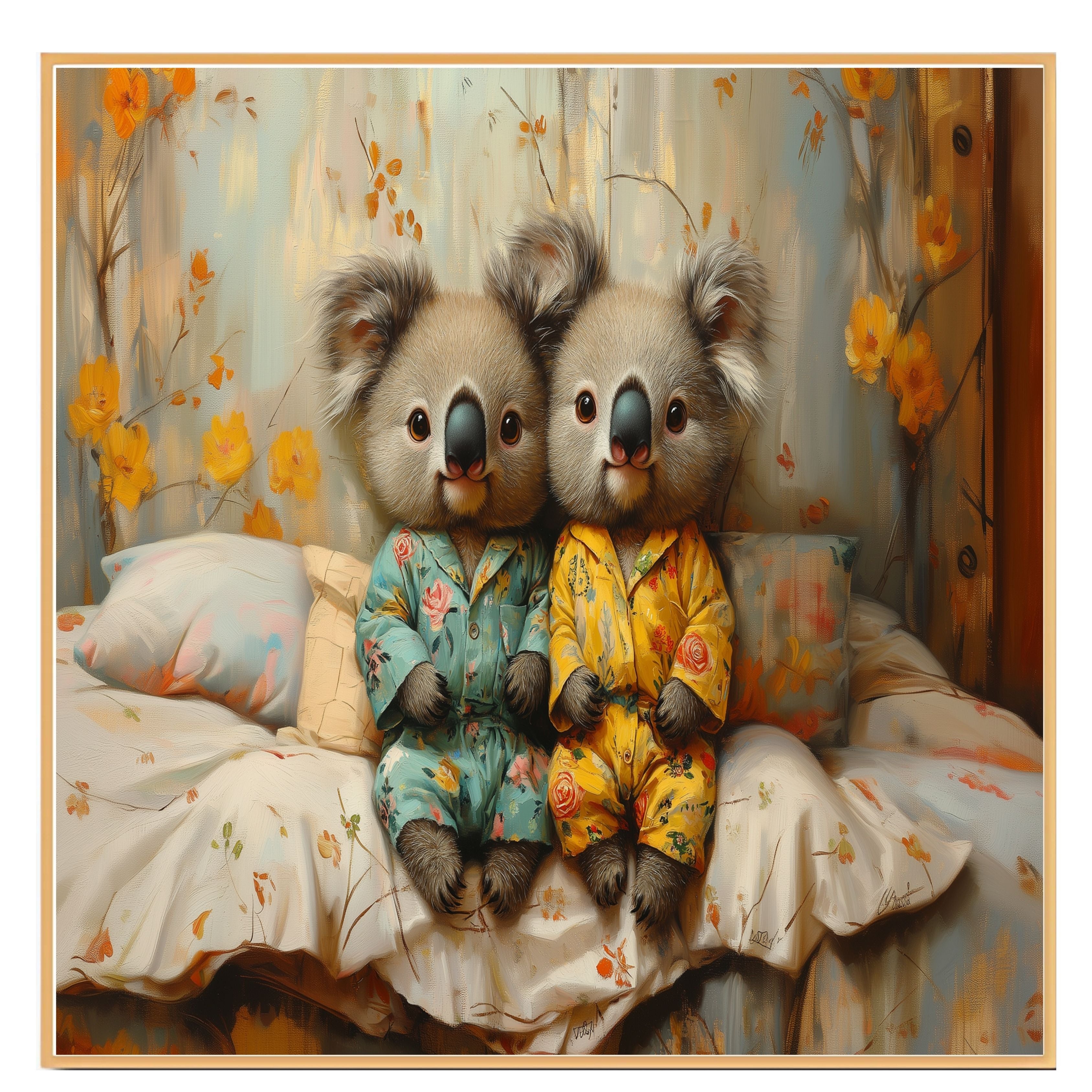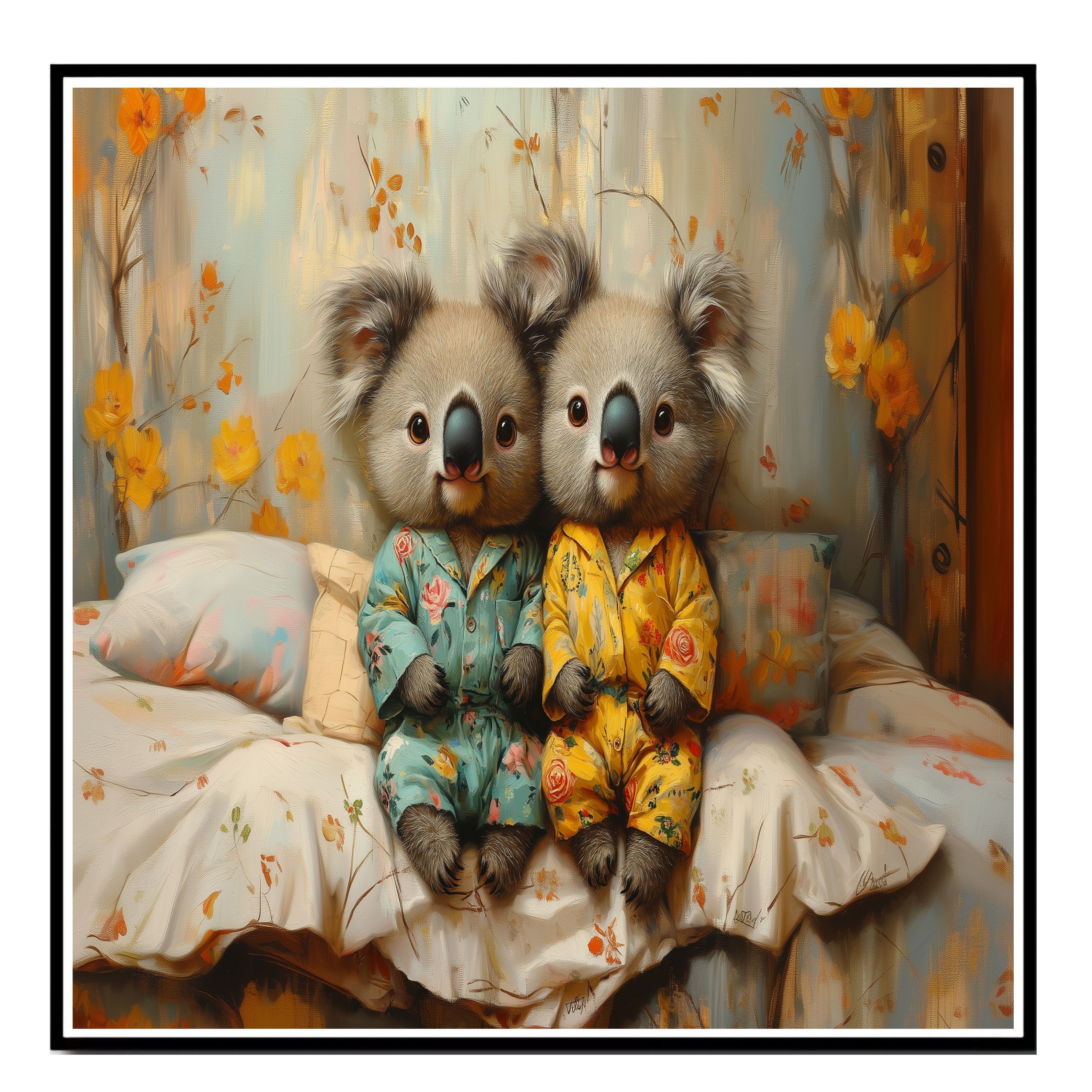 This tender painting features two fluffy koalas in matching floral pajamas, seated side by side on a cozy bed with floral pillows and soft yellow blossoms surrounding them. Their gentle gaze and snug setting create a heartwarming visual perfect for nurseries, children's rooms, or animal-themed spaces.