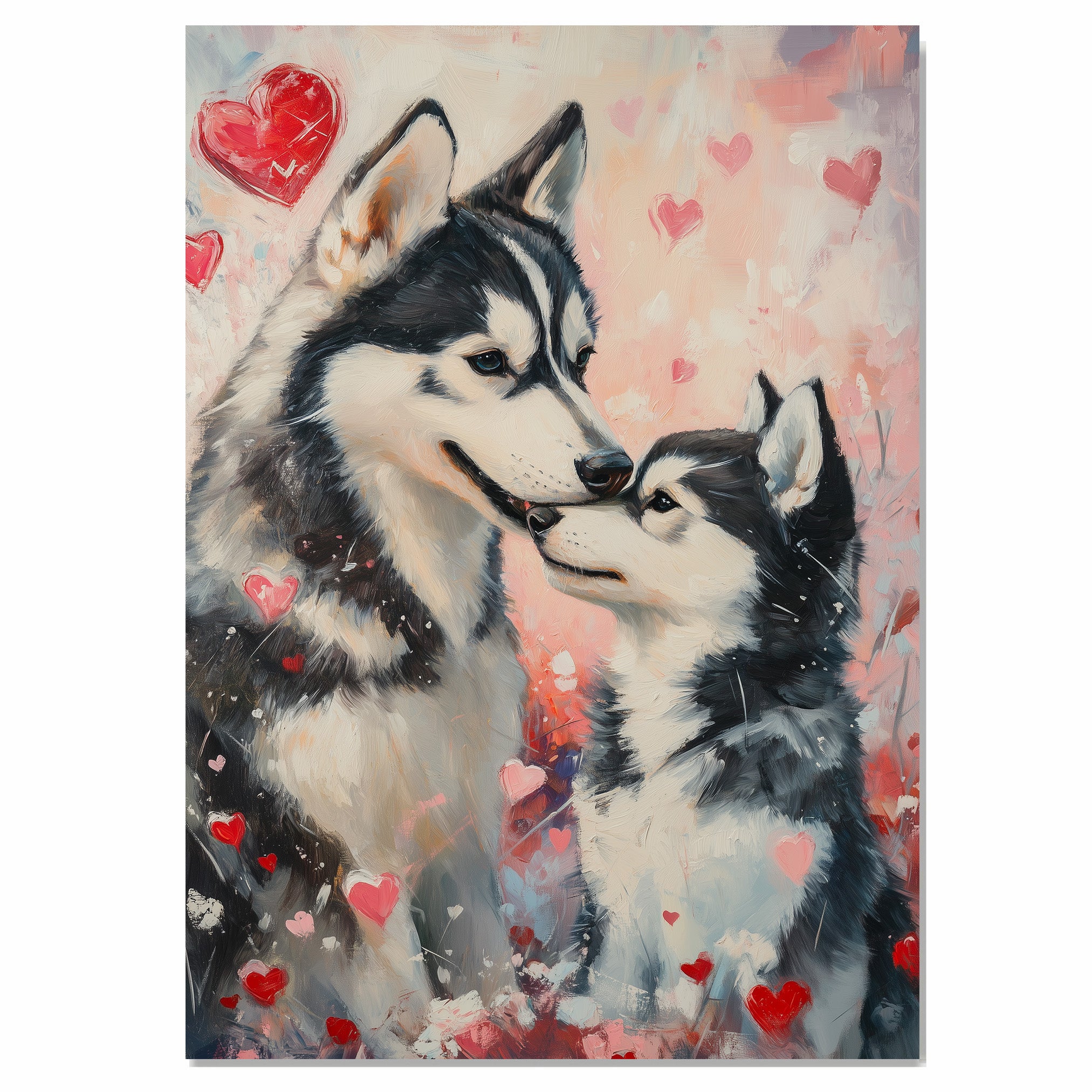 Celebrate the tenderness of companionship with this sweet Siberian Husky couple painting surrounded by pink hearts. Featuring soft pastel tones and heartfelt expressions, this artwork brings a sense of warmth and love, making it a perfect addition to cozy rustic homes, pet lover spaces, and thoughtful gifts.
