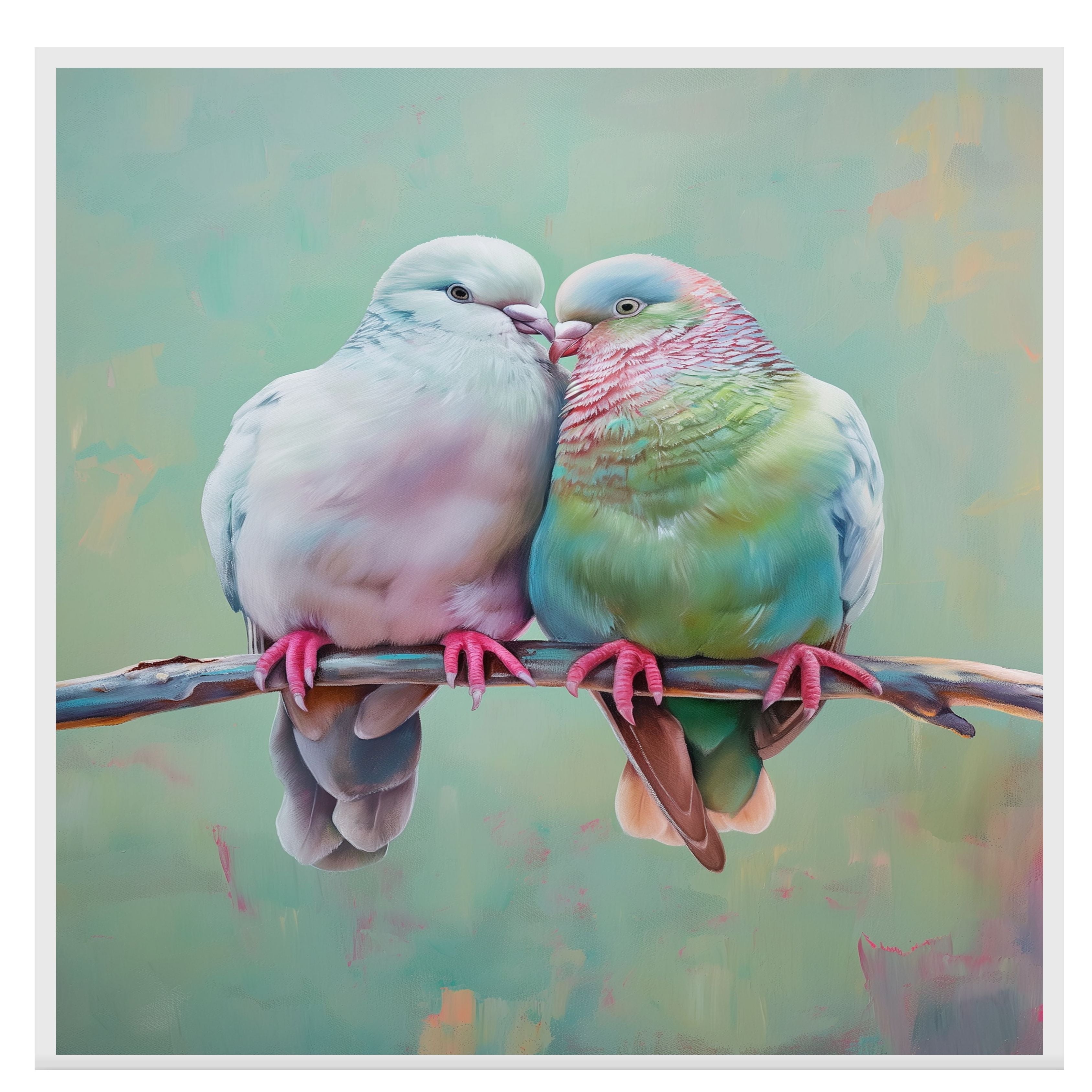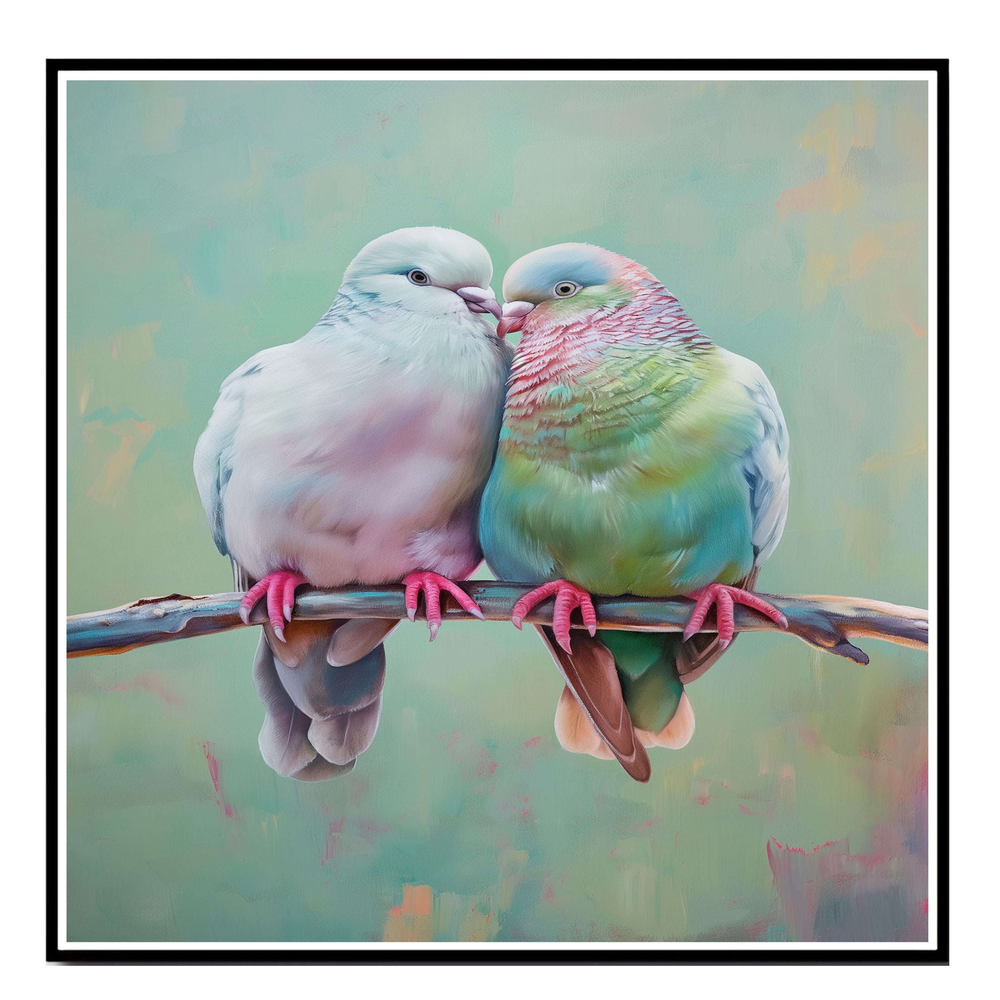 This pastel art piece captures the serene bond between two loving doves nestled closely on a branch. With soft mint and blush tones, it brings a peaceful, affectionate energy to any space. Perfect for bedrooms, nurseries, or as a meaningful wedding or anniversary gift, this artwork symbolizes harmony and emotional connection through delicate colors and composition.