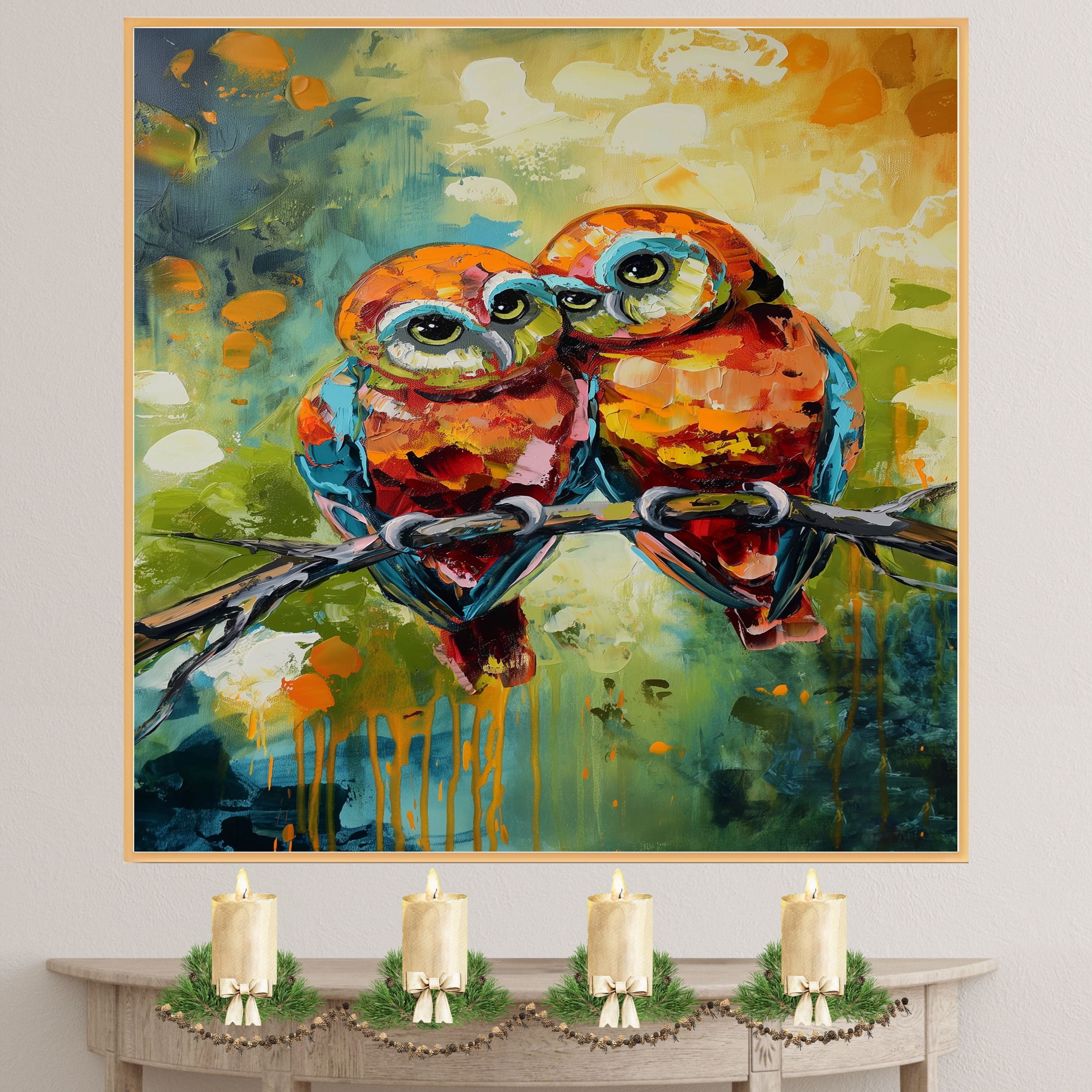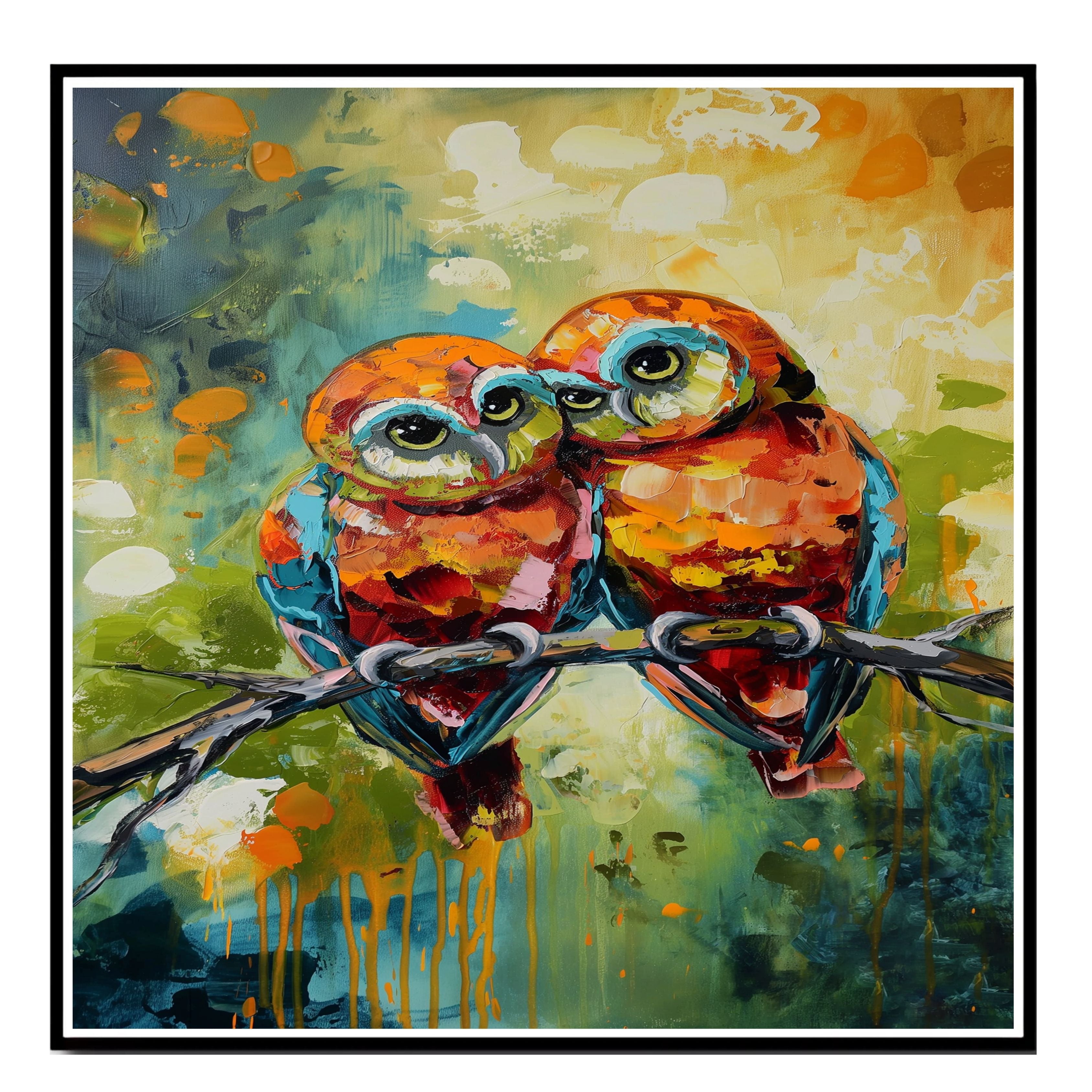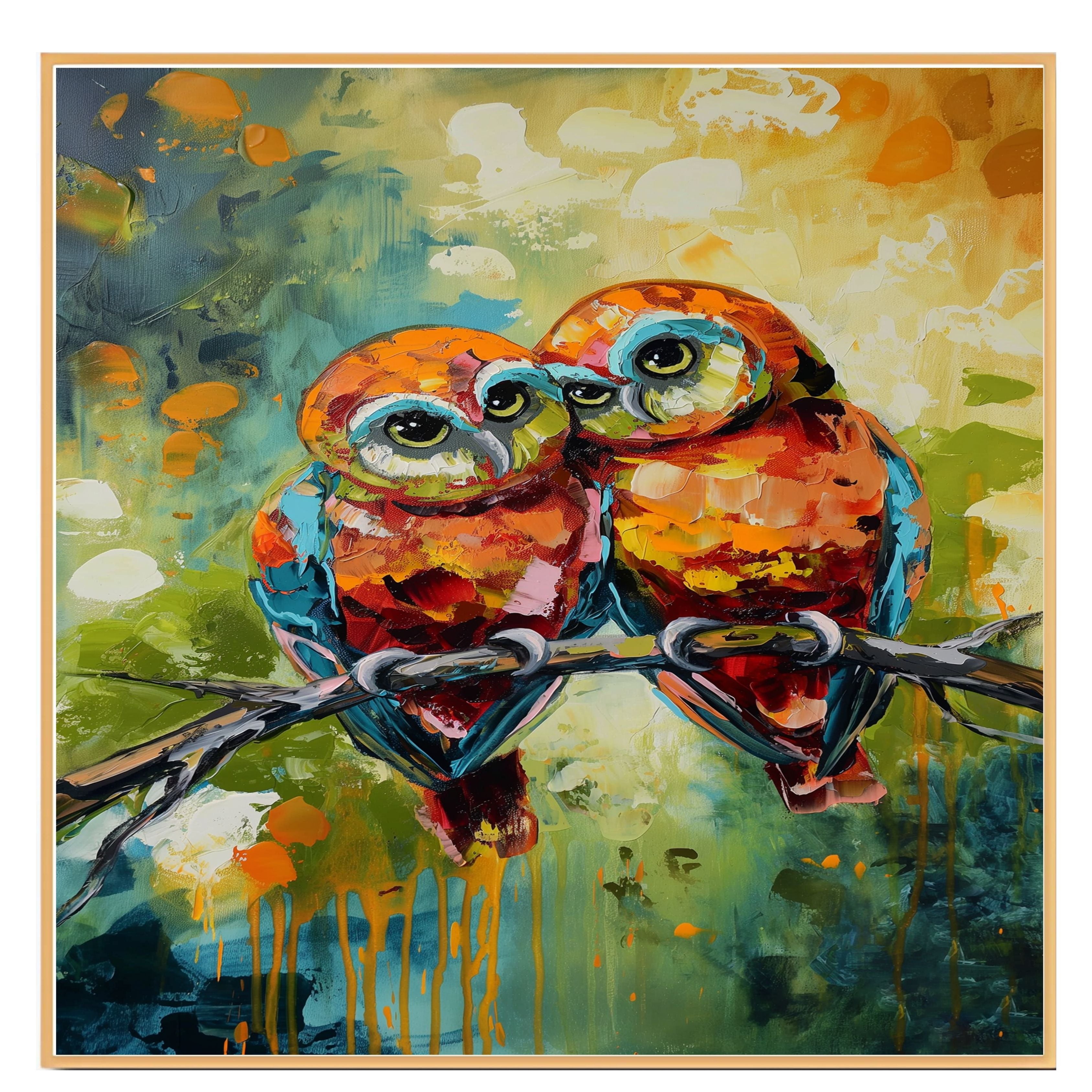 This textured and expressive artwork showcases a pair of owls painted in bold orange, red, and blue tones. With their wide, curious eyes and painterly palette-knife strokes, they perch sweetly on a branch against a vivid background of greens, yellows, and abstract drips. A standout piece for modern spaces and bird lovers alike.