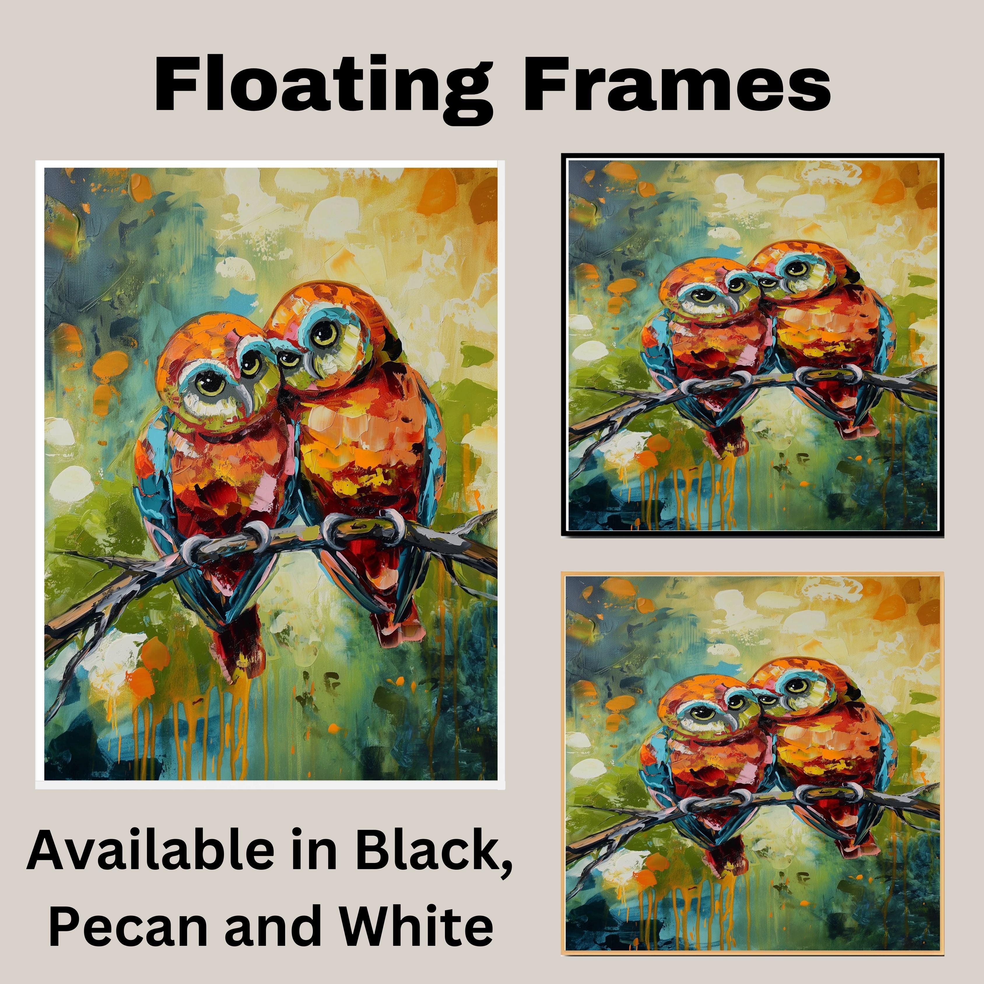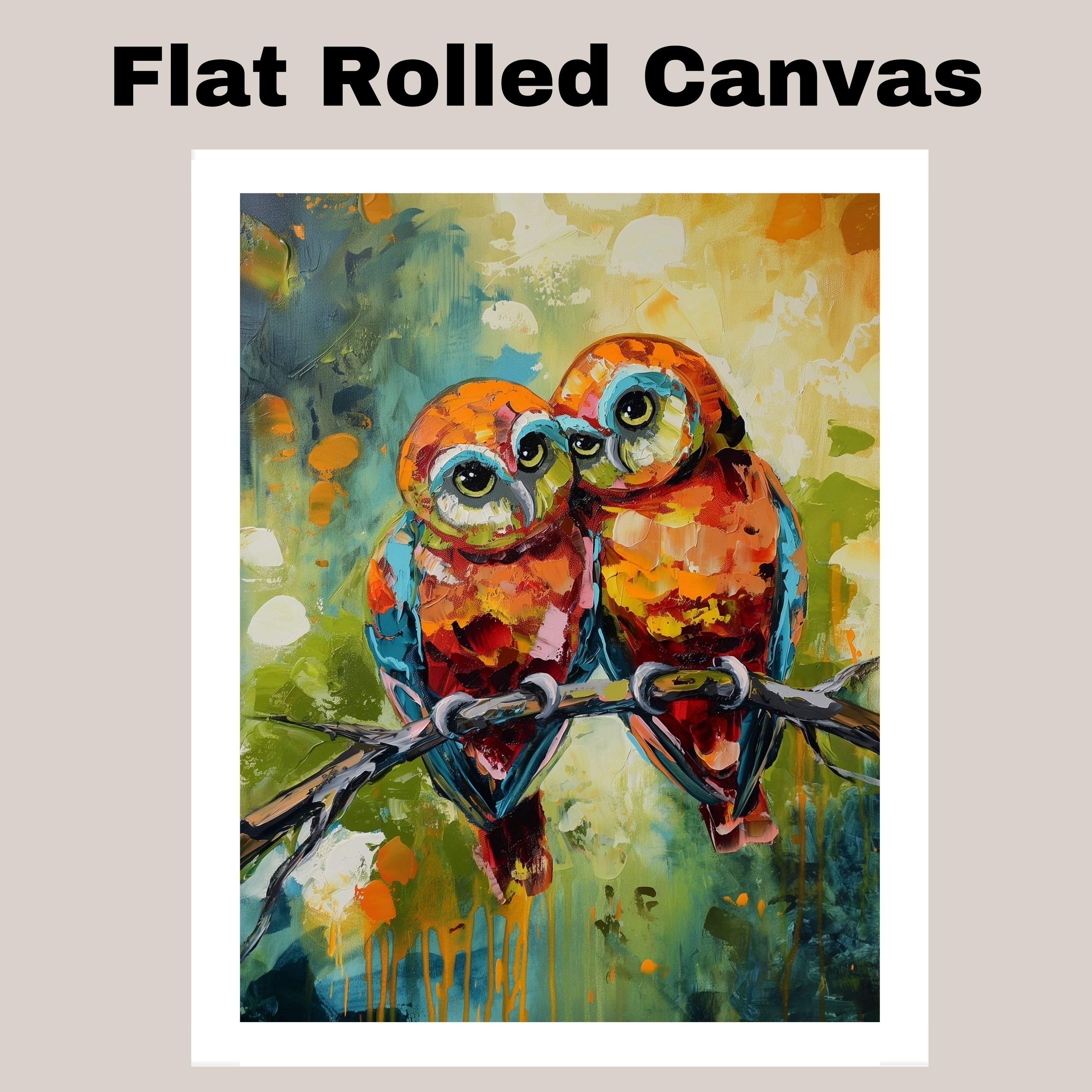 Textured Owl Pair Artwork Featuring Bright Orange Red and Blue Tones with Expressive Eyes on a Branch Against a Bold Green Yellow and Teal Abstract Background on Ready to Hang 1.5" Thick Canvas Wrap, Floating Framed Canvas, Flat Rolled Canvas