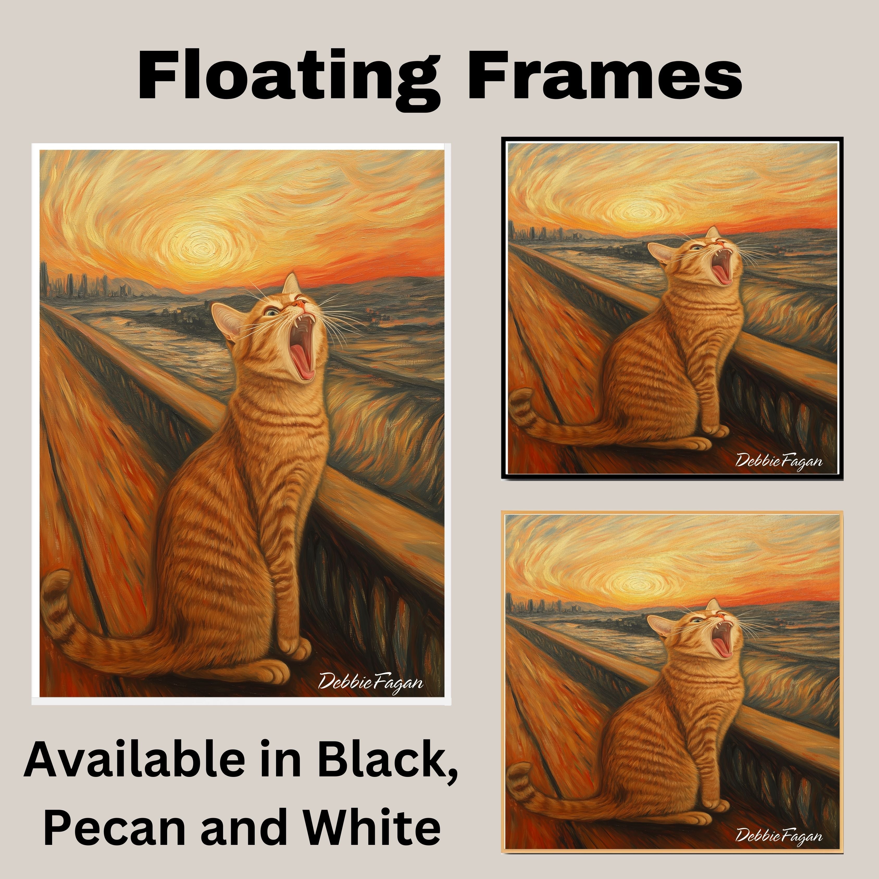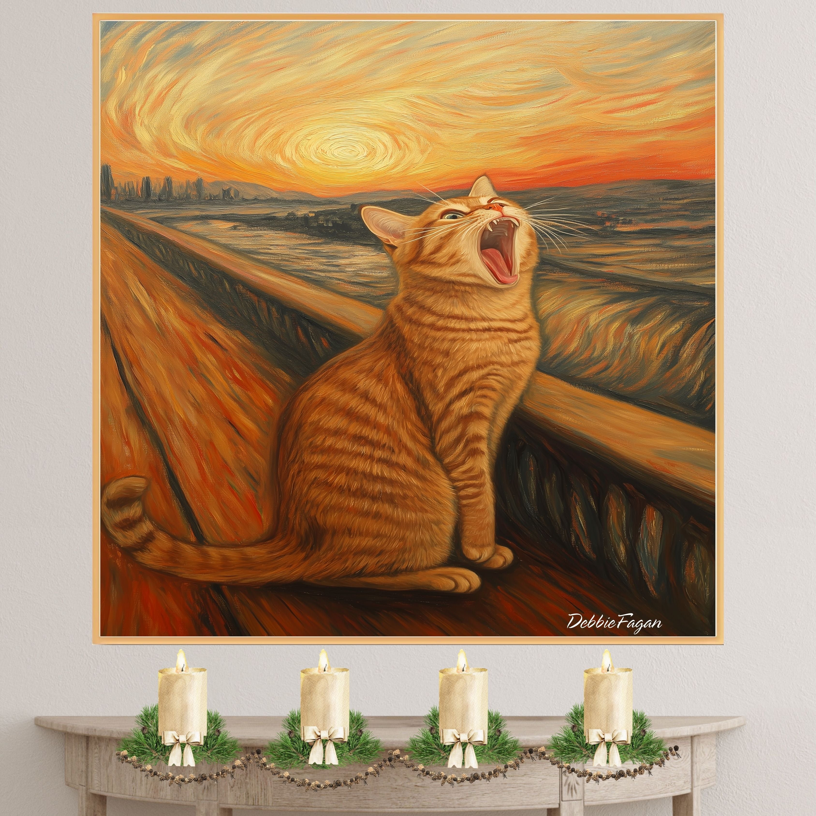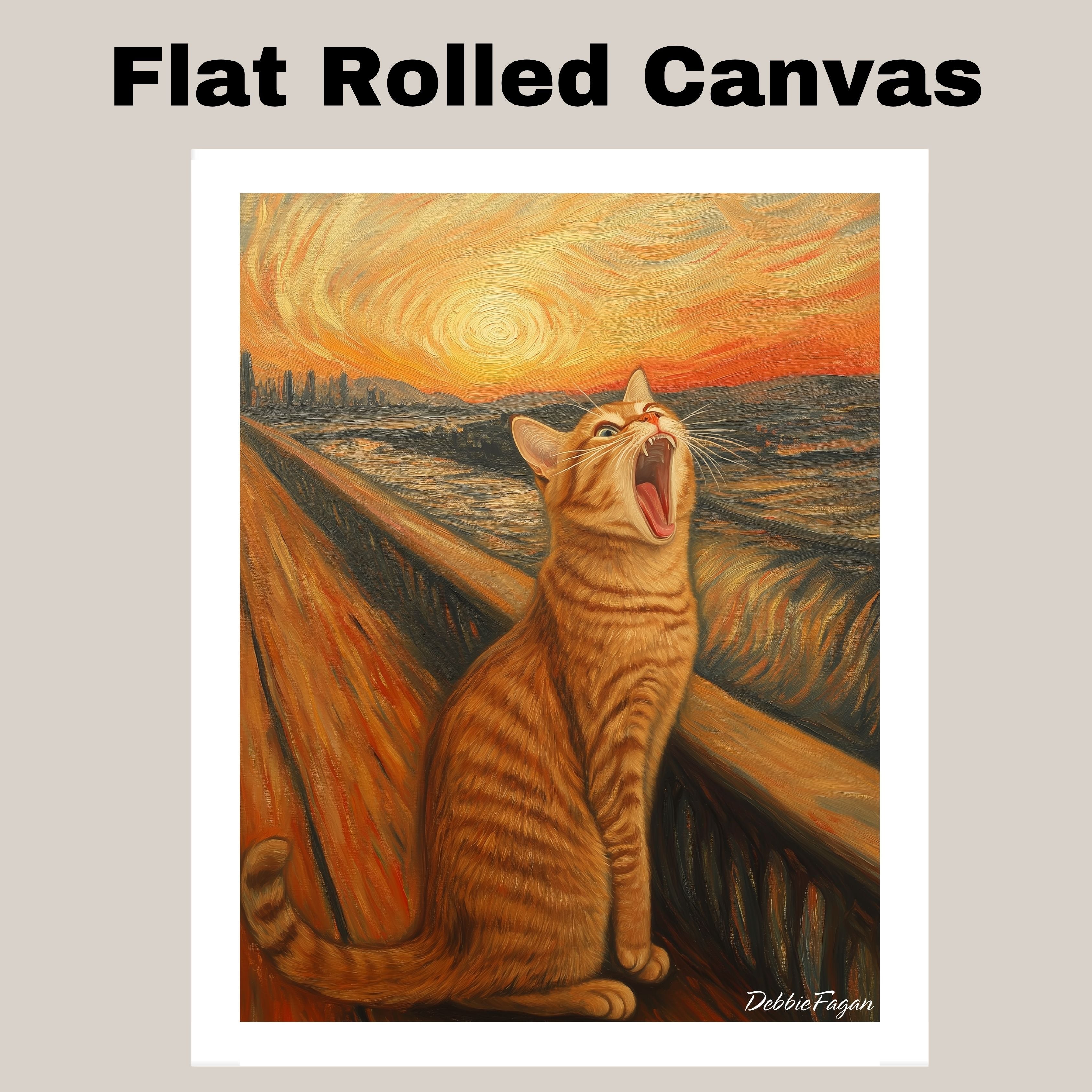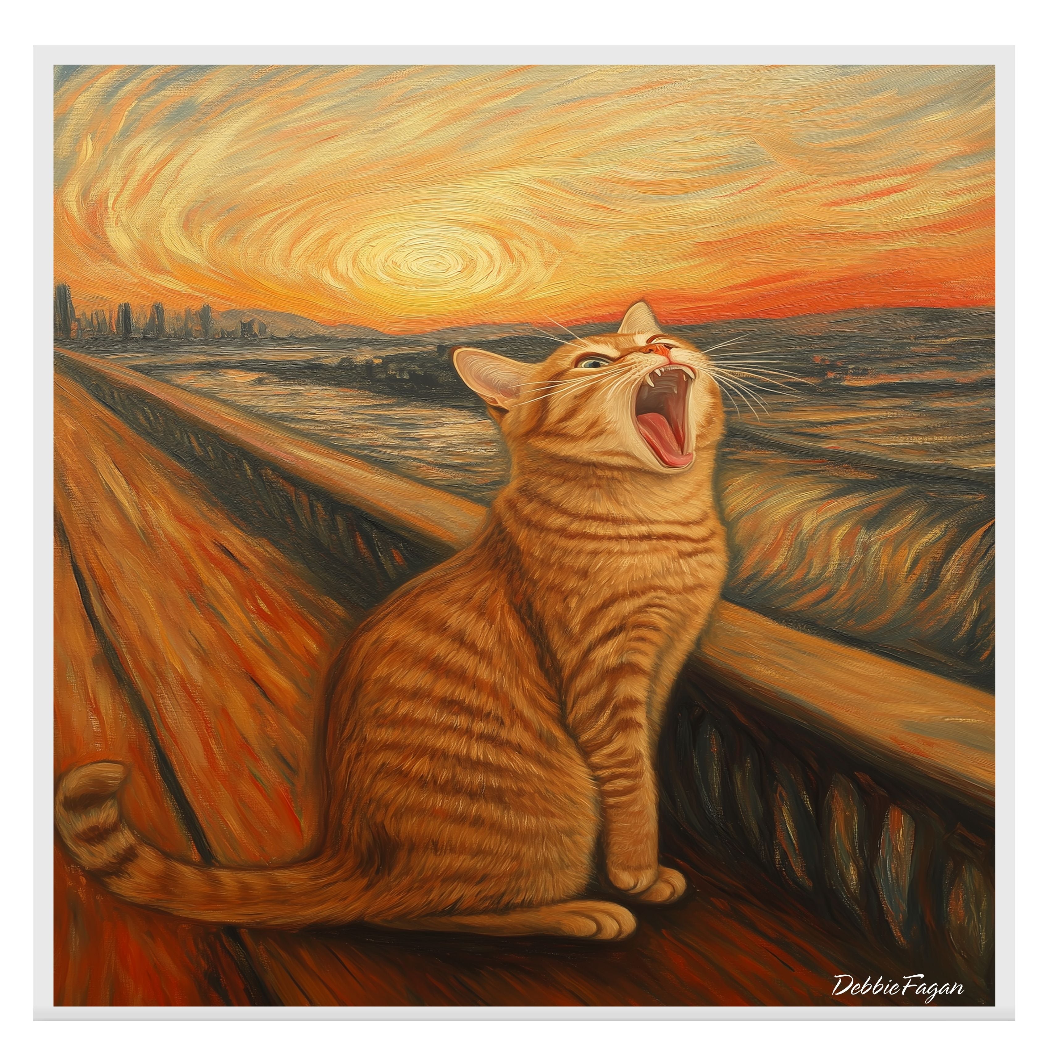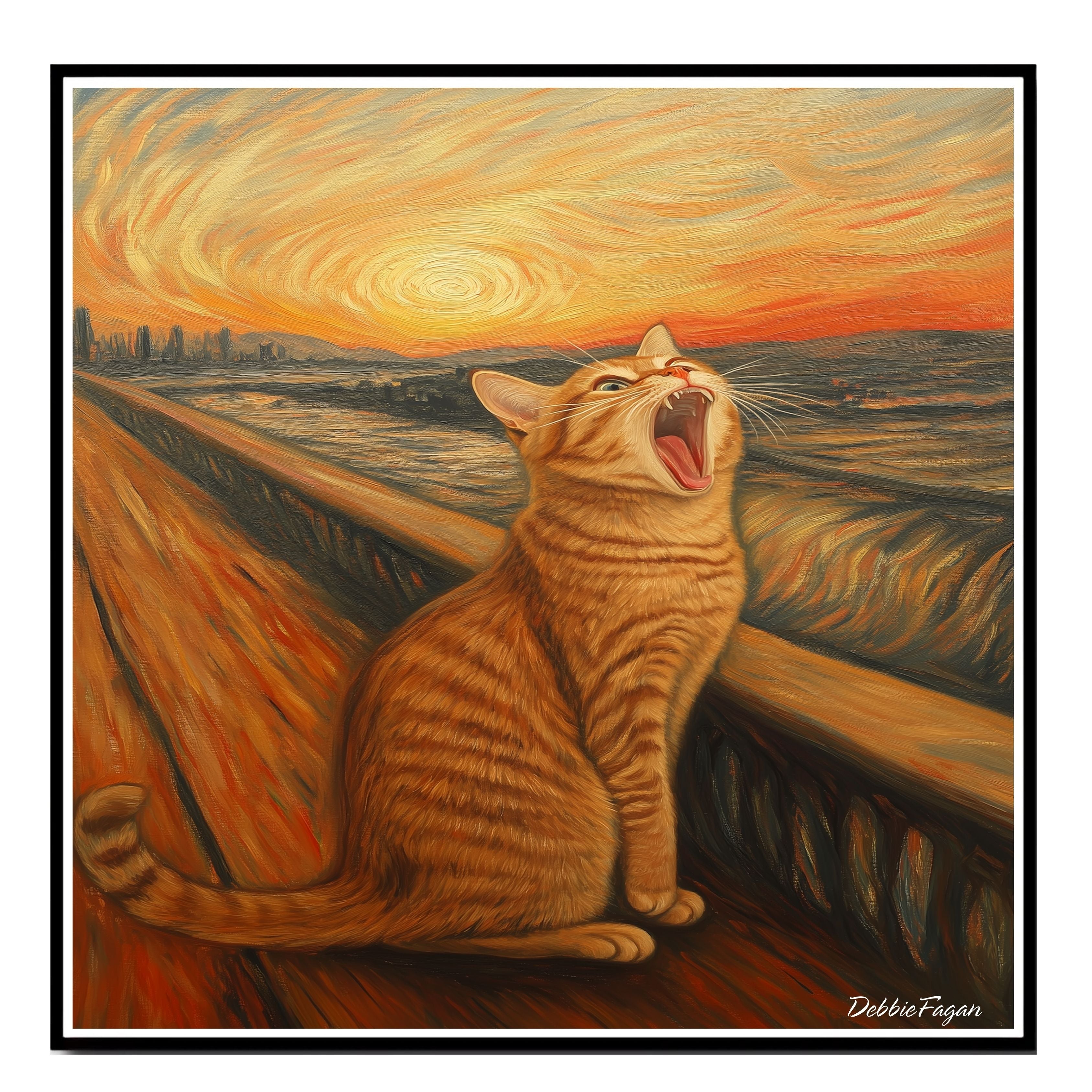 A playful parody of Edvard Munch’s “The Scream,” this whimsical artwork replaces the figure with a dramatic, wide-yawning orange tabby cat. With bold, swirling brushstrokes and a fiery sunset, this feline twist on a classic brings humor and charm to any wall. Perfect for cat lovers and art fans alike!