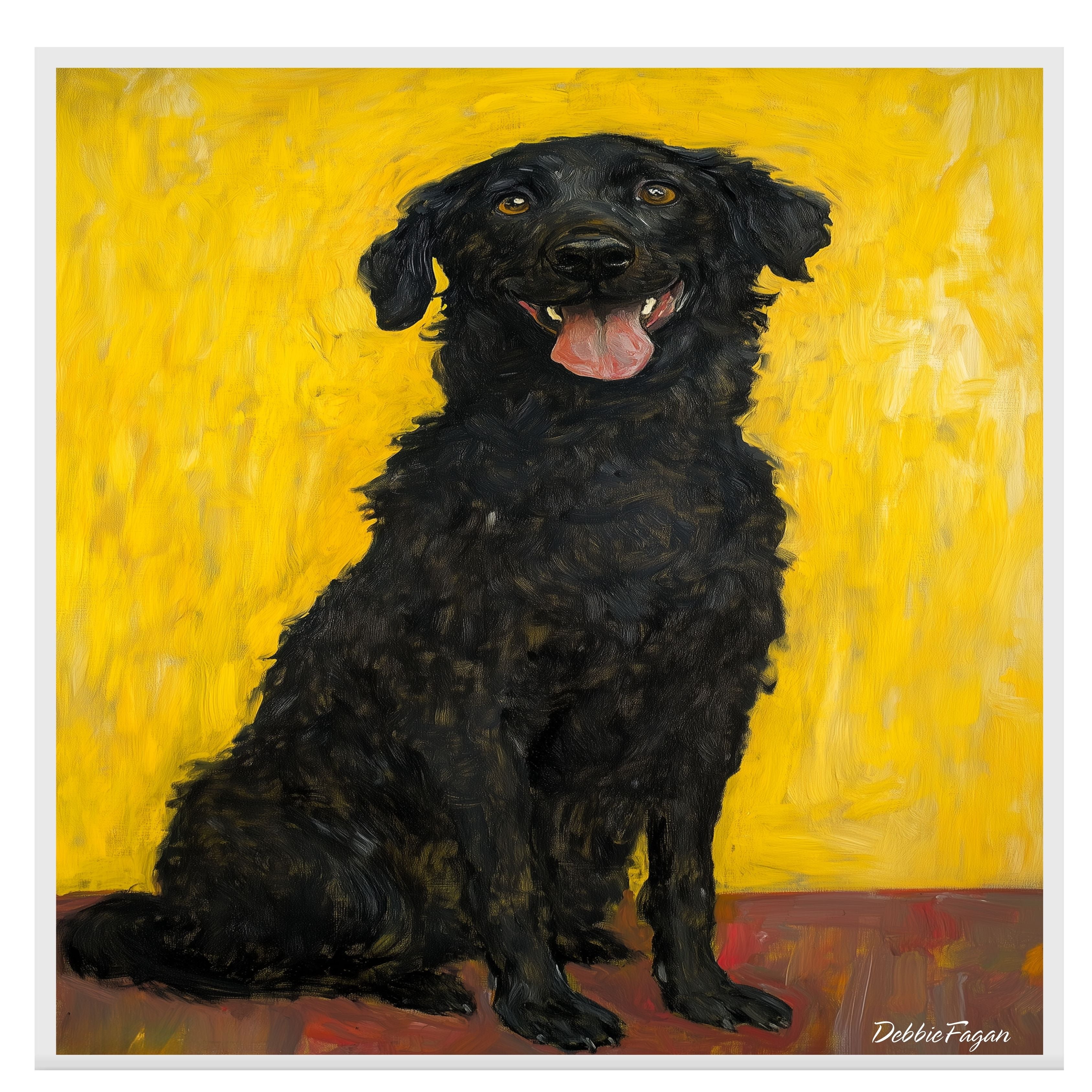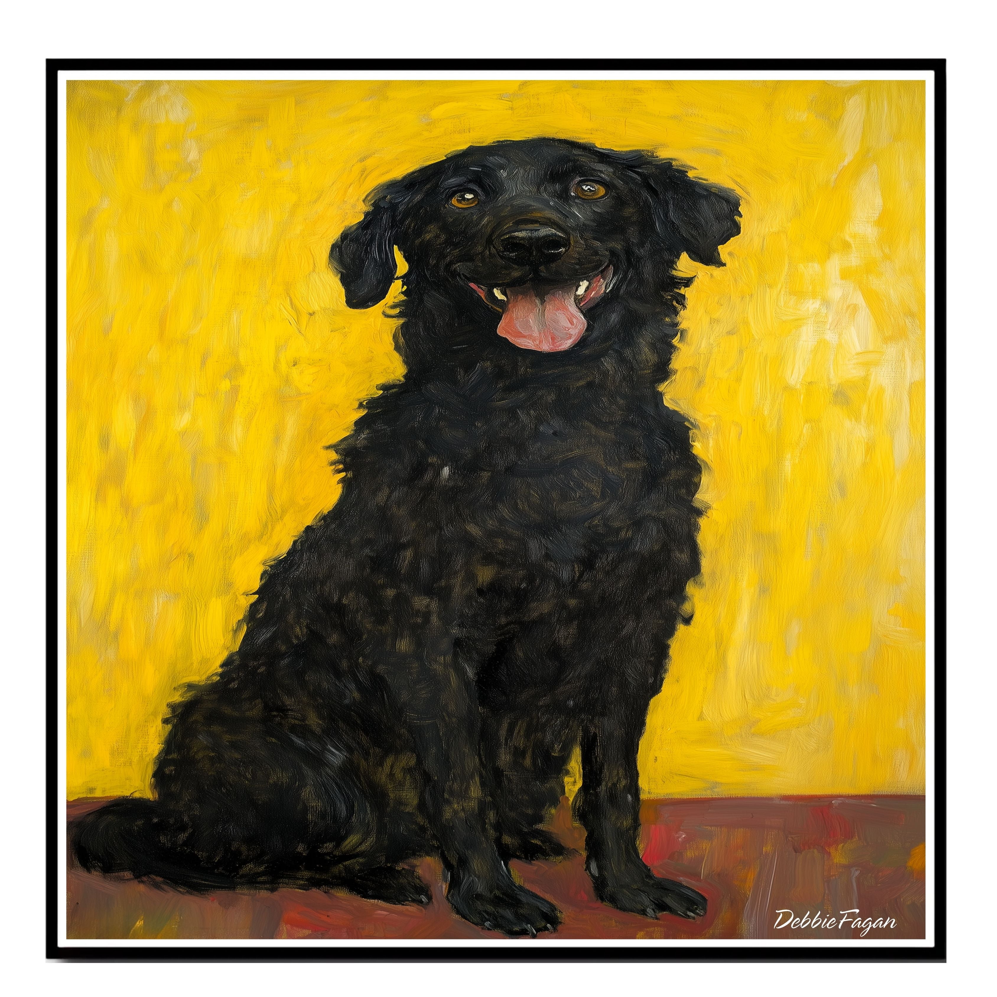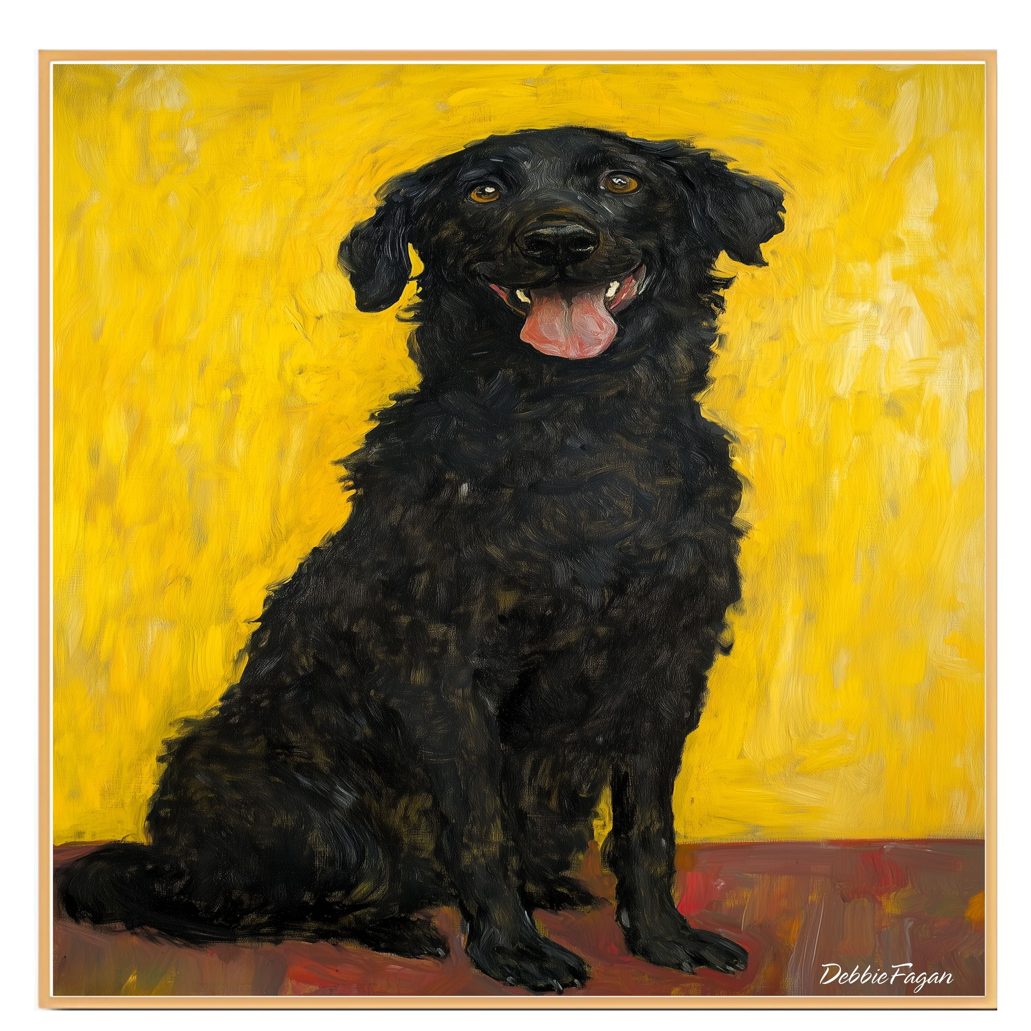 This soulful oil-style painting features a thoughtful black dog sitting gracefully against a warm yellow-orange background. With textured brushstrokes and a vintage Gustav Klimt influence, this piece radiates quiet charm and emotional depth—ideal for animal lovers and art collectors alike.