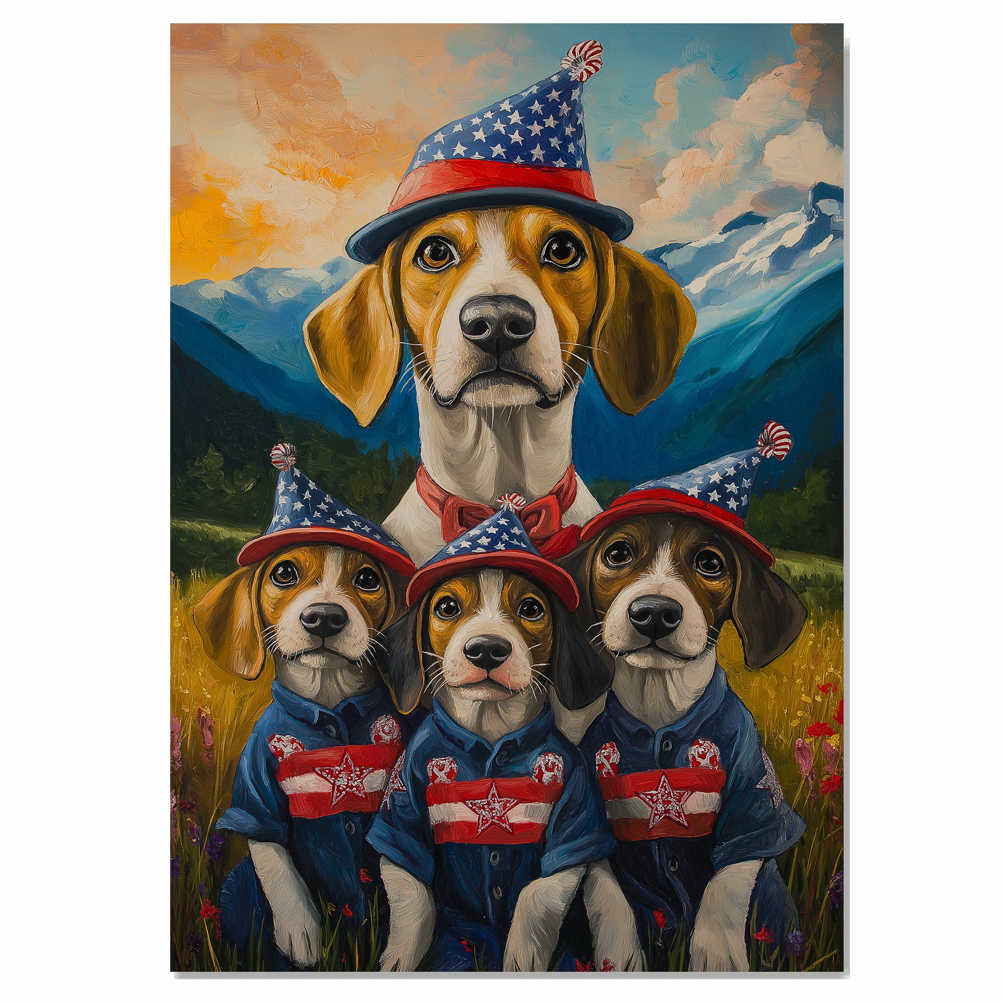 Celebrate American pride with this charming oil-style painting of a Treeing Walker Coonhound mother and her three pups. Dressed in red, white, and blue party hats and star-spangled shirts, this festive dog family stands against a glowing mountain sunset—perfect for Fourth of July decor or rustic dog lover home accents.