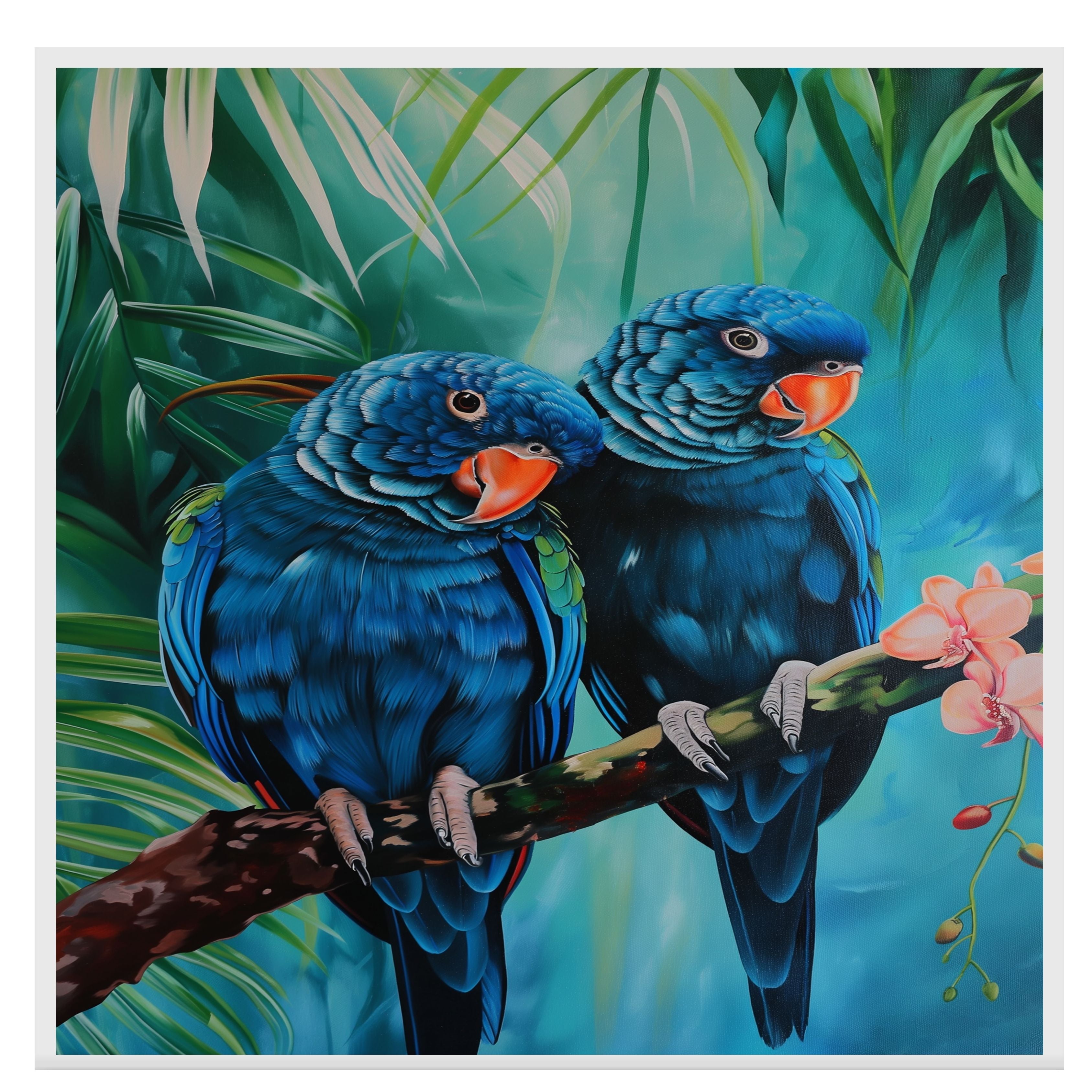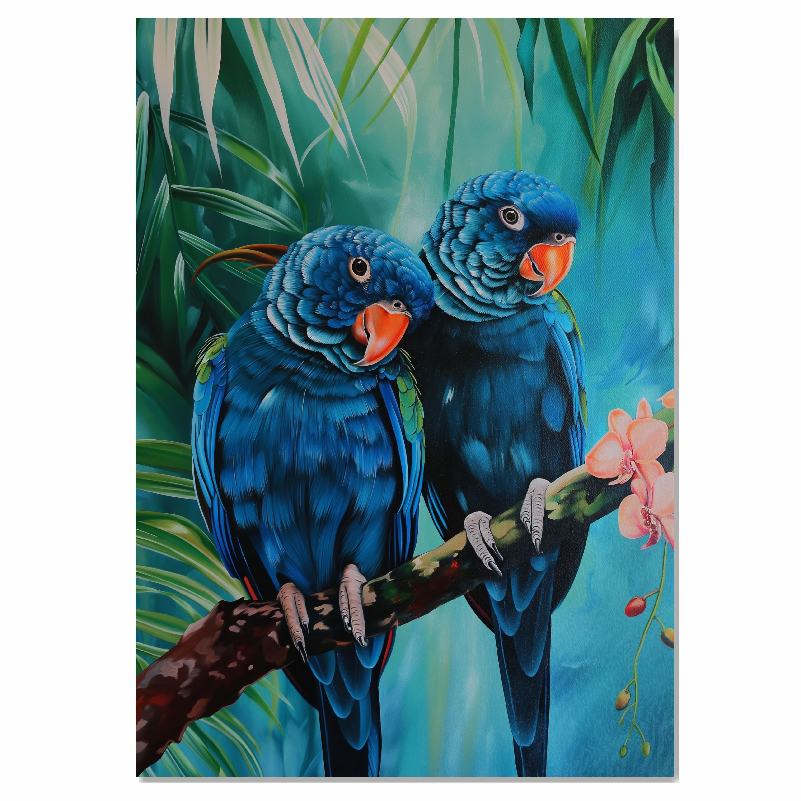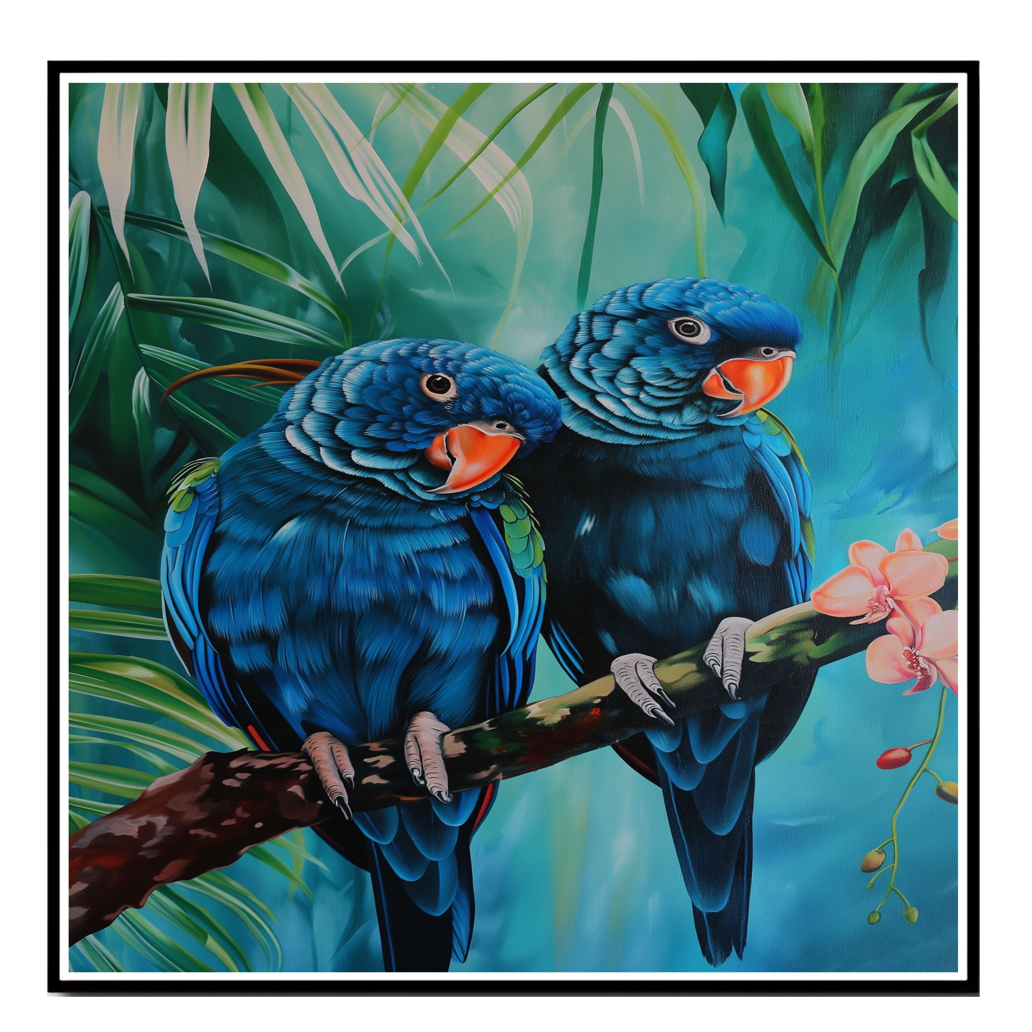 This captivating artwork features a pair of bright blue parrots with vivid plumage and orange beaks, resting closely together on a branch. Surrounded by lush tropical greenery and soft pink blossoms, this scene radiates warmth, harmony, and exotic beauty—perfect for modern spaces or nature-themed decor.