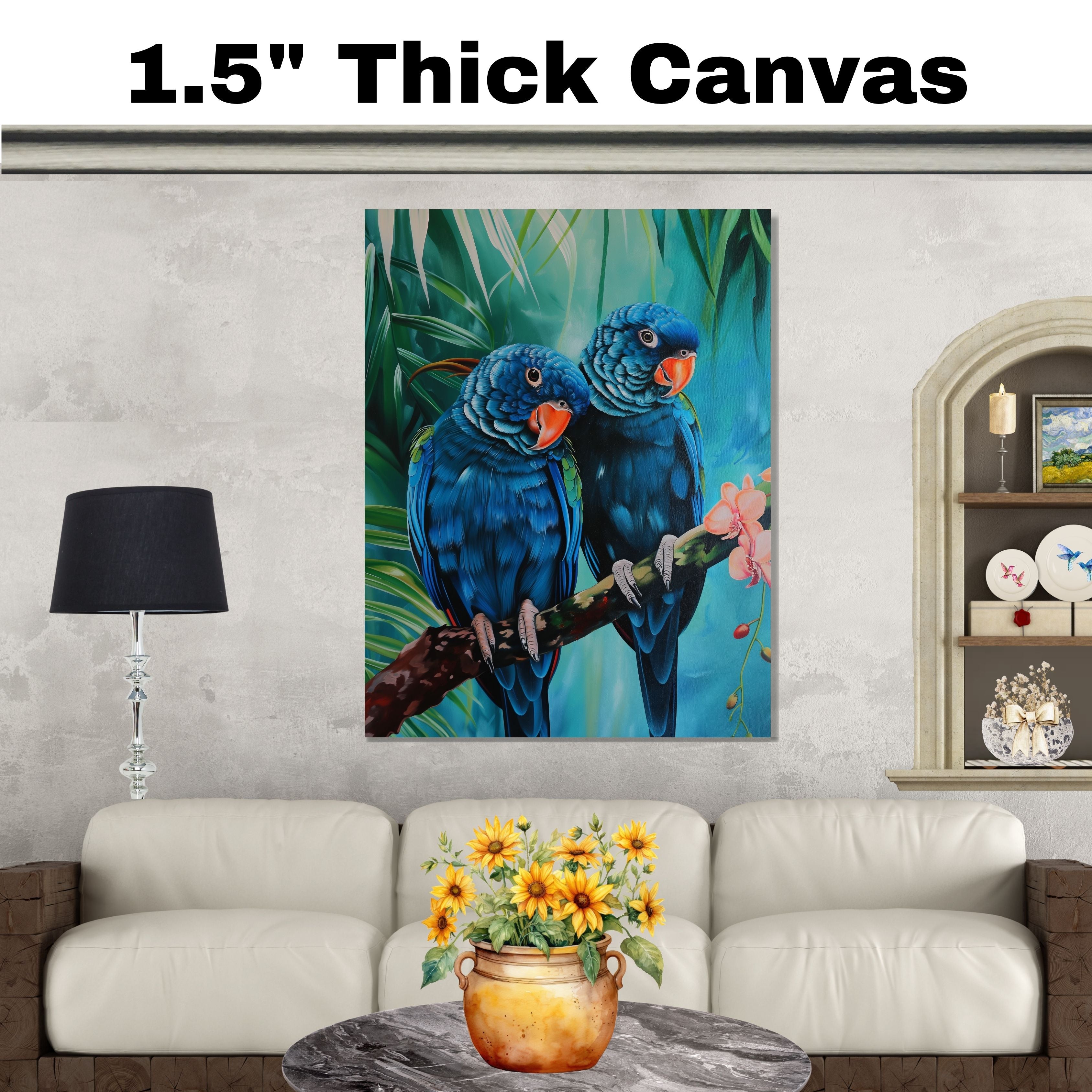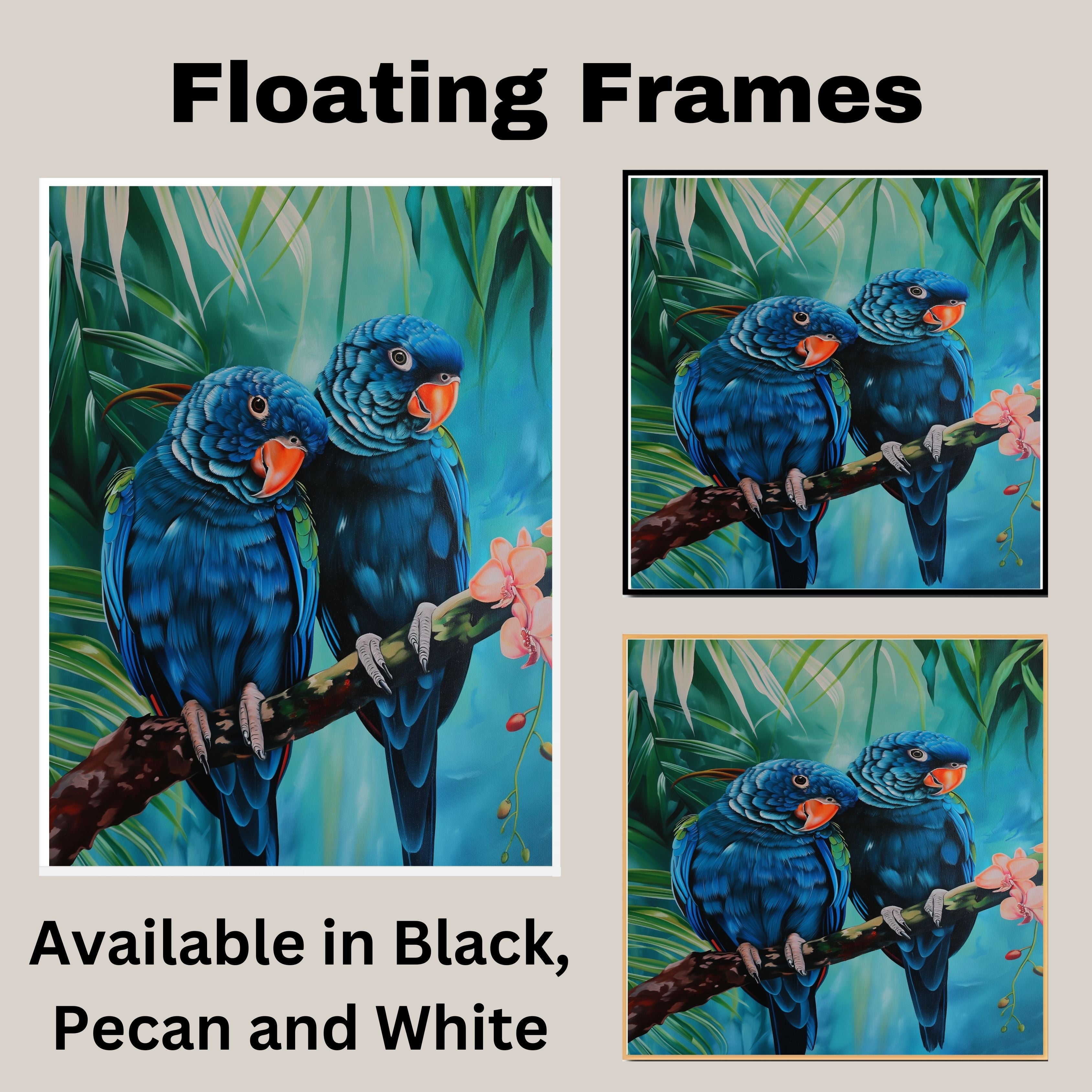 Tropical Blue Parrot Pair Artwork Featuring Vibrant Feathers and Orange Beaks Perched on a Branch with Lush Green Foliage and Delicate Pink Flowers on Ready to Hang 1.5" Thick Canvas Wrap, Floating Framed Canvas, Flat Rolled Canvas