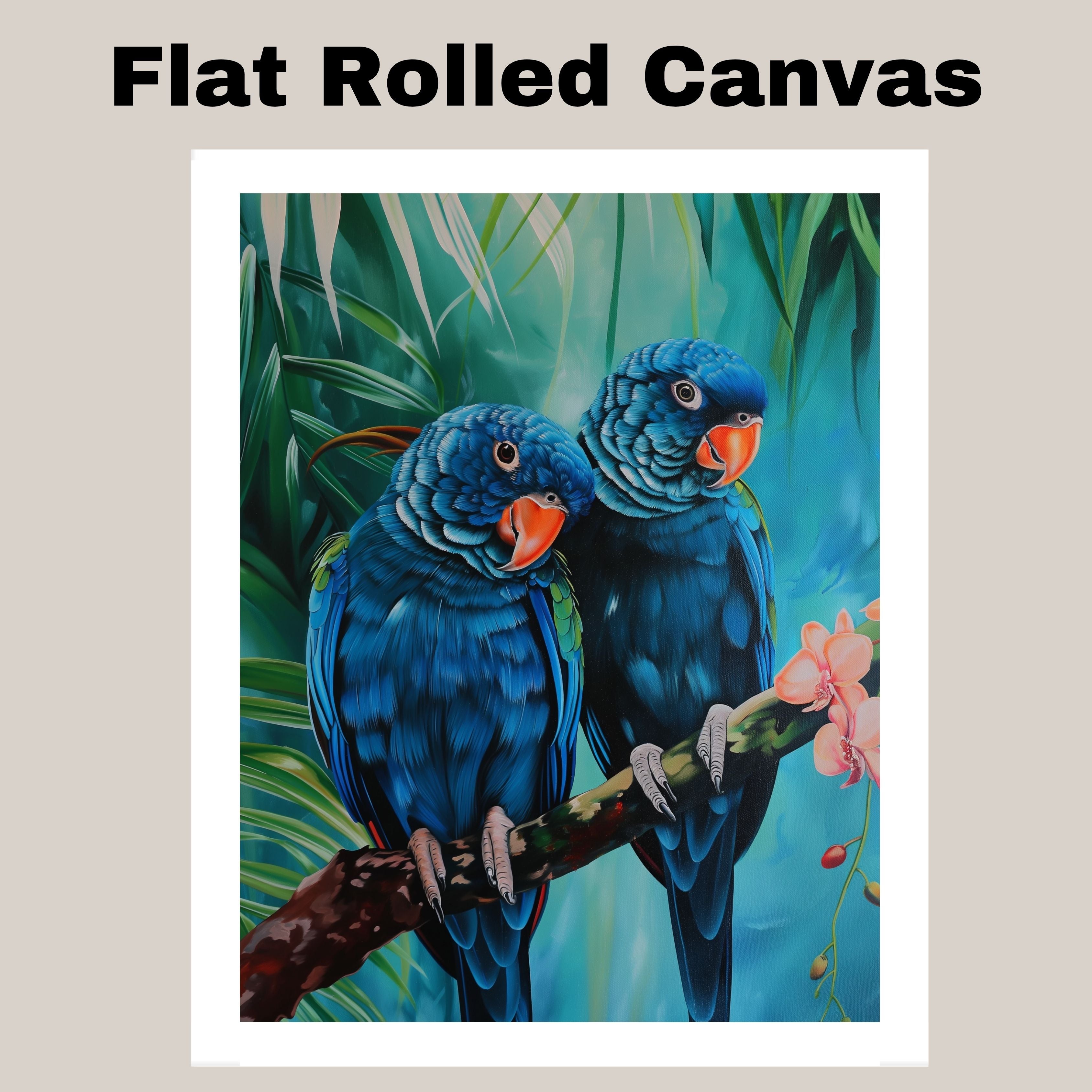 This captivating artwork features a pair of bright blue parrots with vivid plumage and orange beaks, resting...